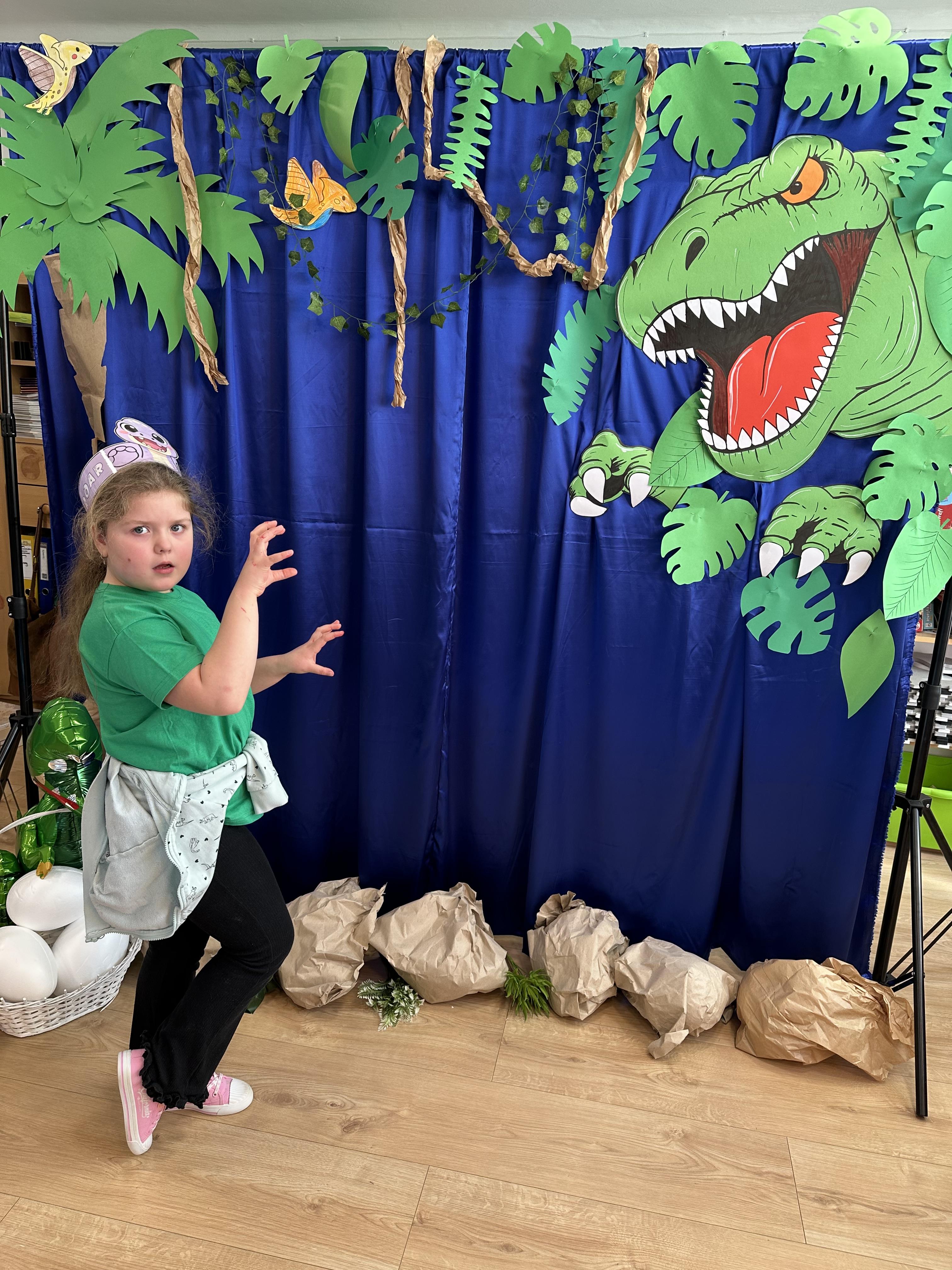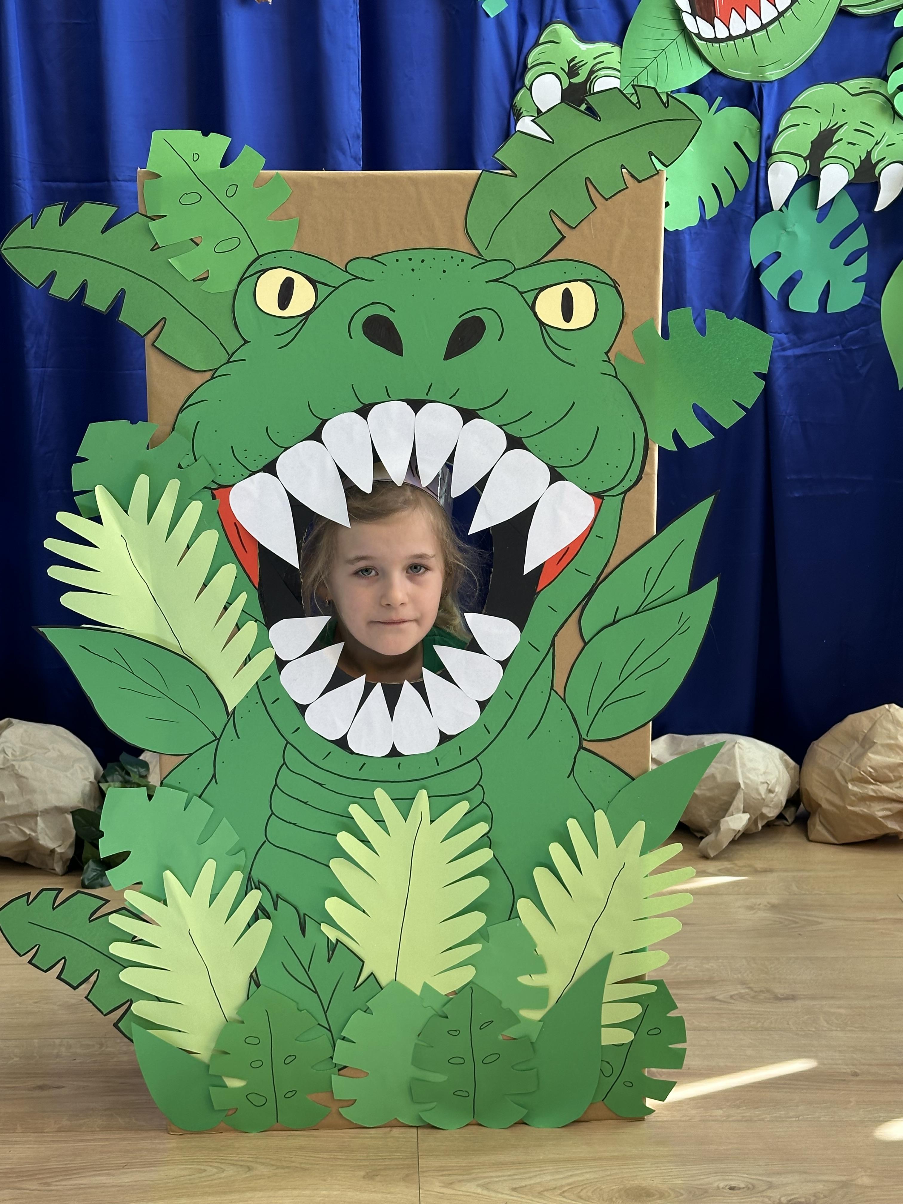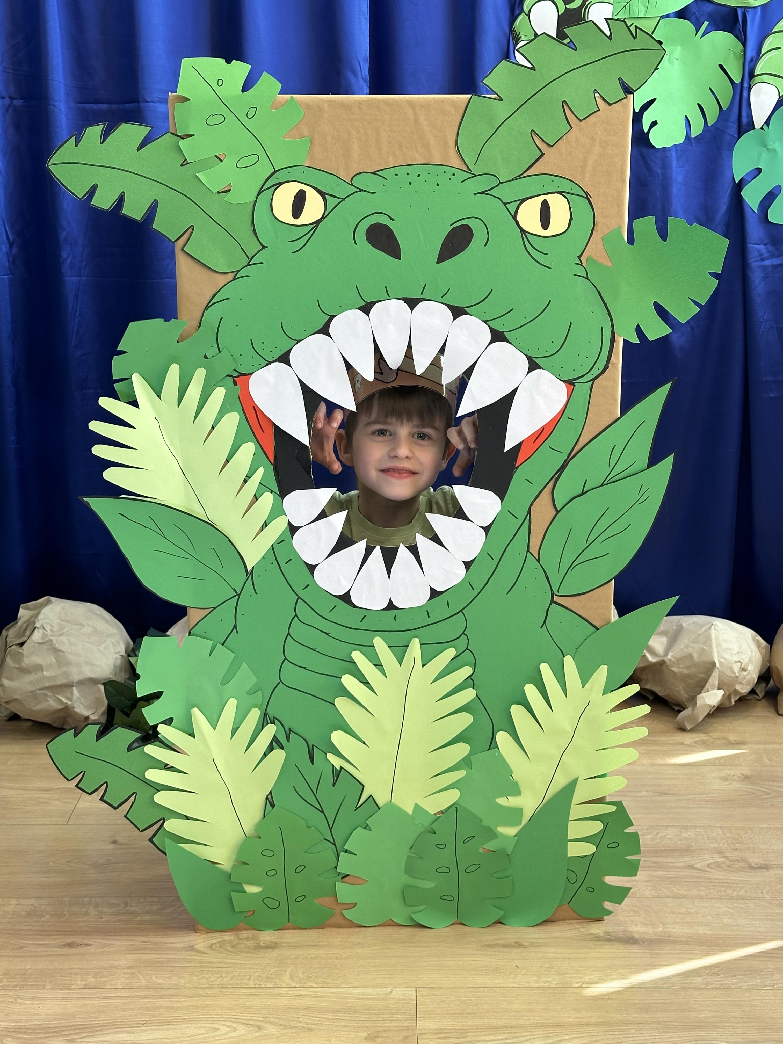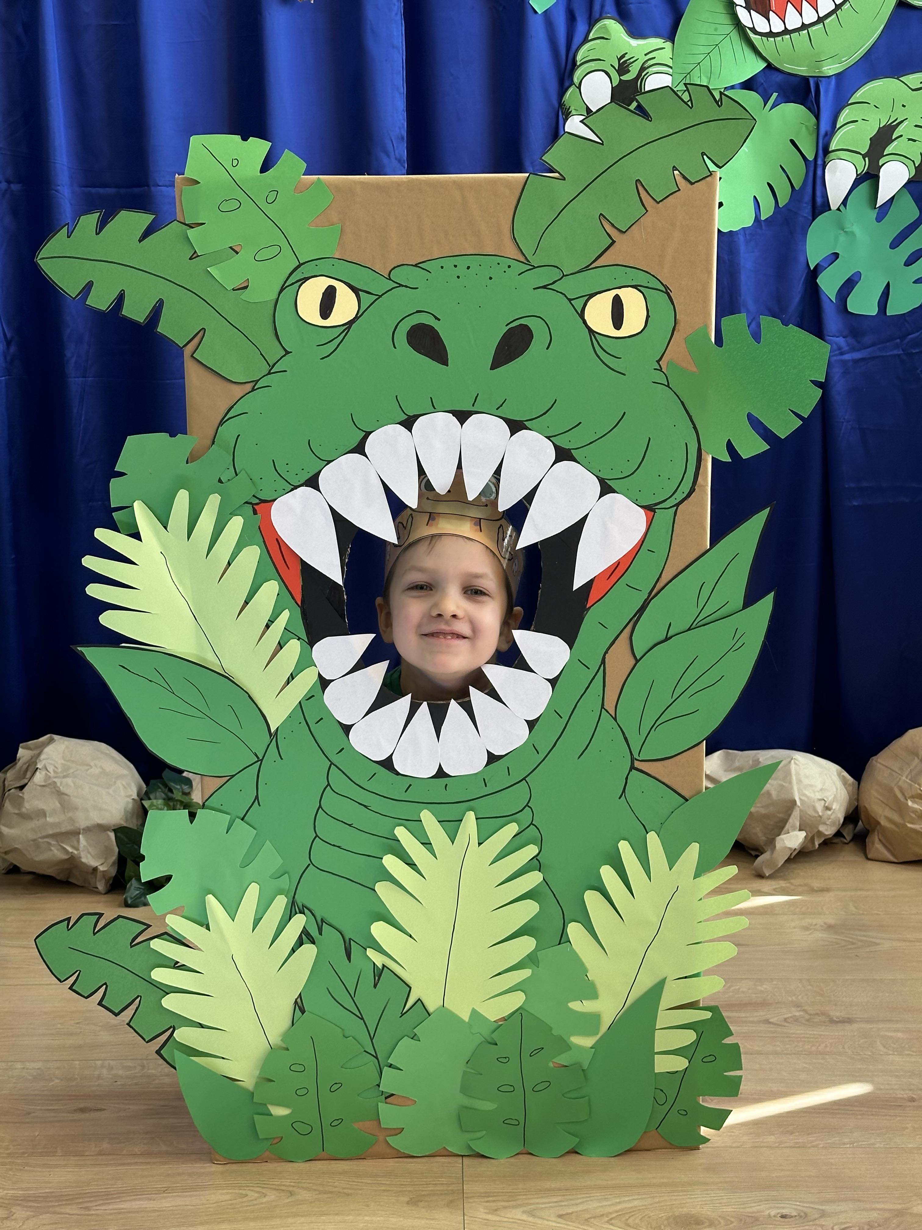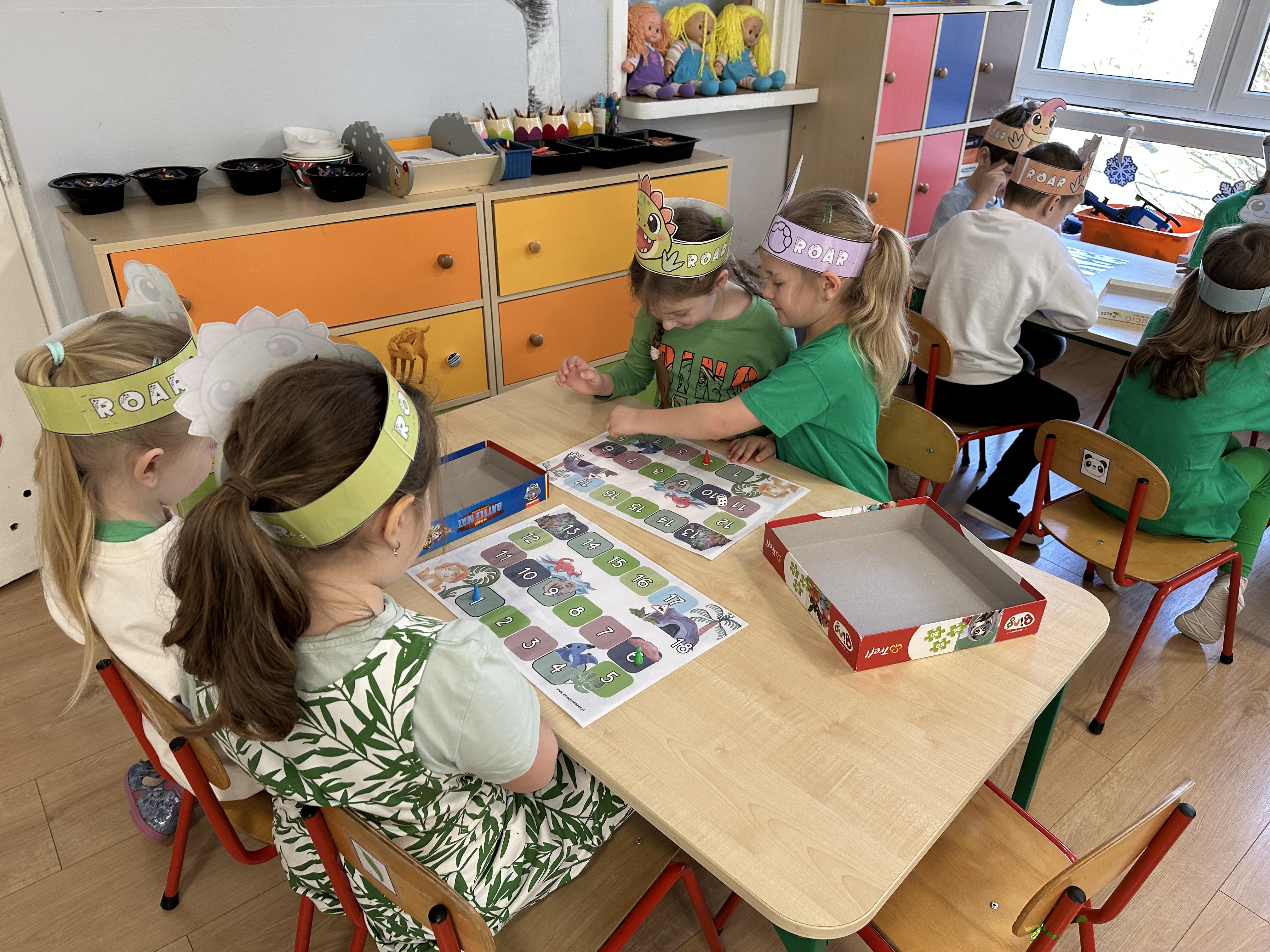 W naszej grupie odbył się Dzień Dinozaura, który dostarczył dzieciom wielu radosnych chwil oraz wzbogacił ich wiedzę o prehistorycznym świecie. Już od samego rana w sali został przygotowany kącik dinozaurów, w którym znalazły się figurki, książki oraz ilustracje przedstawiające różne gatunki tych niezwykłych stworzeń. Jedną z pierwszych aktywności była zabawa w paleontologów. Dzieci z ogromnym zaangażowaniem poszukiwały ukrytych „skamieniałości” i figurek dinozaurów, ucząc się przy tym, na czym polega praca naukowca badającego przeszłość Ziemi. Następnie wspólnie segregowały dinozaury na roślinożerne i mięsożerne, poznając ich charakterystyczne cechy oraz sposób odżywiania. Kolejnym punktem programu były „Dino-malowanki” – przestrzenna praca plastyczna, podczas której dzieci rozwijały swoją wyobraźnię i zdolności manualne. Duże zainteresowanie wzbudził również eksperyment „Wulkan”. Wykorzystując sodę i ocet, dzieci mogły zaobserwować efektowną „erupcję”, co było nie tylko świetną zabawą, ale także ciekawą lekcją przyrody. Nie zabrakło również aktywności ruchowych i gier. W „Wyścigach dinozaurów” dzieci sprawdzały, który dinozaur najszybciej dotrze do mety. Dużo emocji dostarczyła także gra „Dino droga”, w której zadaniem było bezpieczne przeprowadzenie dinozaurów przez prehistoryczny krajobraz pełen przygód i niespodzianek. Na zakończenie odbył się quiz sprawdzający wiadomości o dinozaurach. Dzieci wykazały się dużą wiedzą i zaangażowaniem. Dzień zakończył się wykonaniem pamiątkowej fotografii, która będzie miłym wspomnieniem wspólnie spędzonego czasu. Obchody Dnia Dinozaura były nie tylko okazją do świetnej zabawy, ale również do zdobywania nowych informacji i rozwijania zainteresowań przyrodniczych.