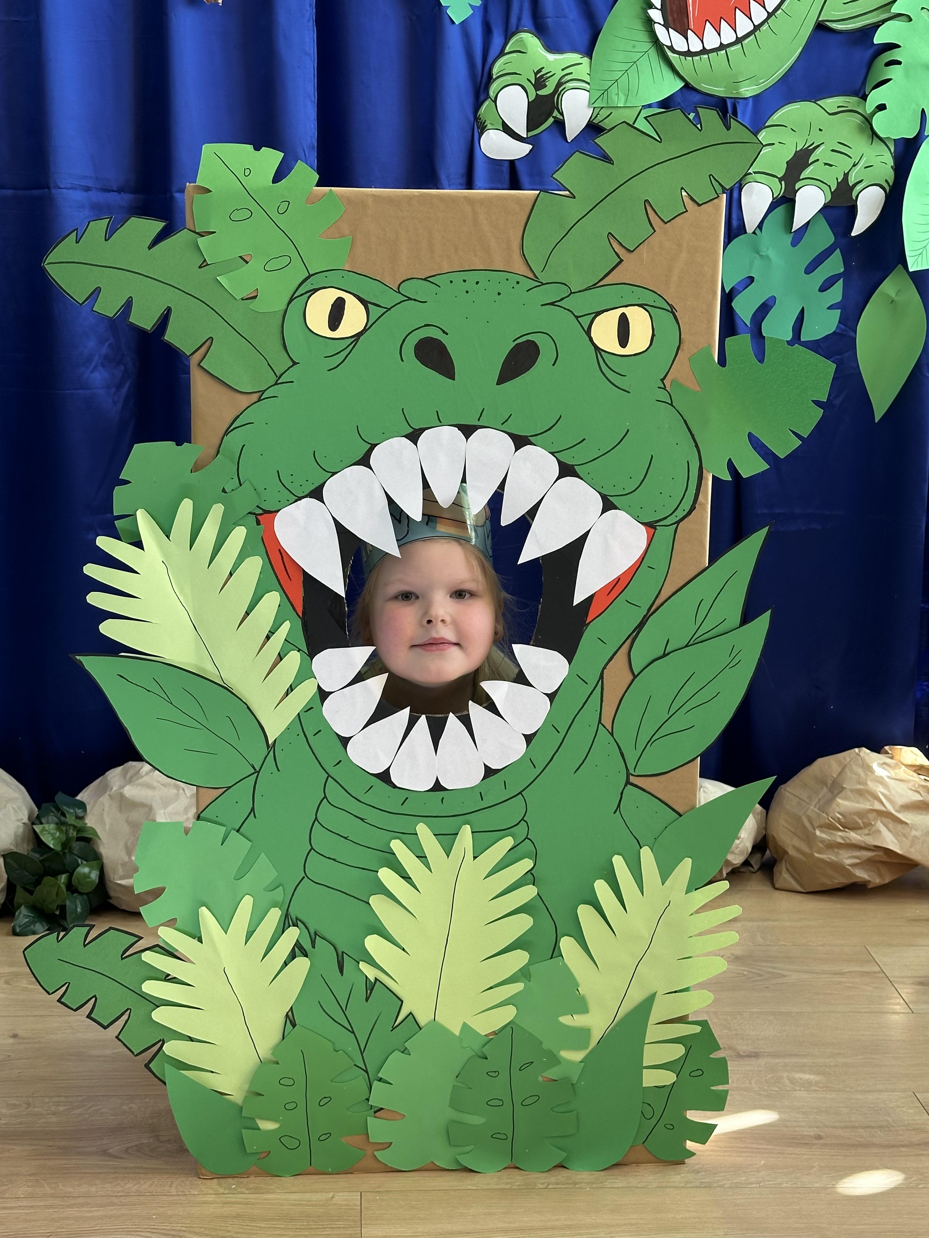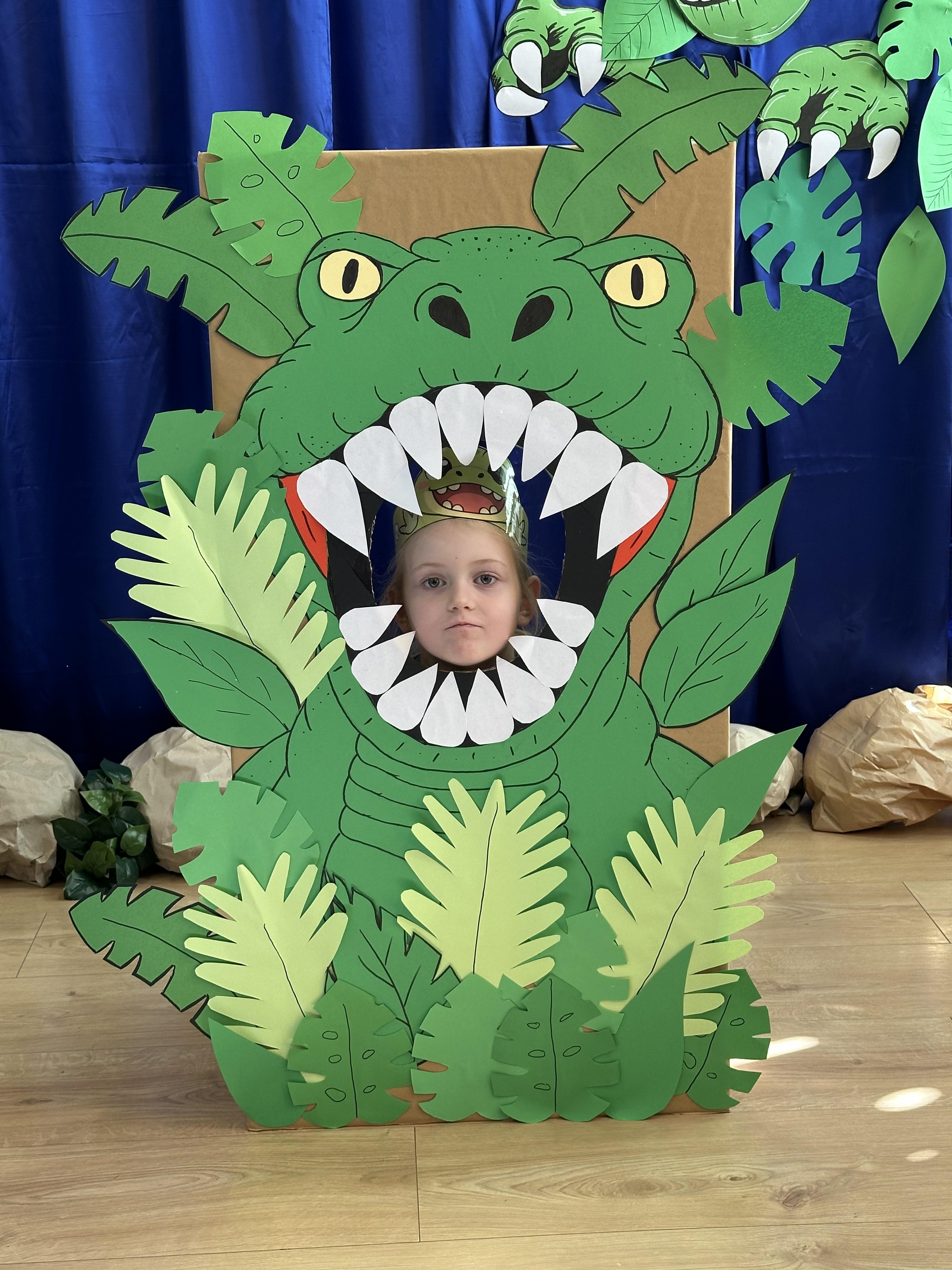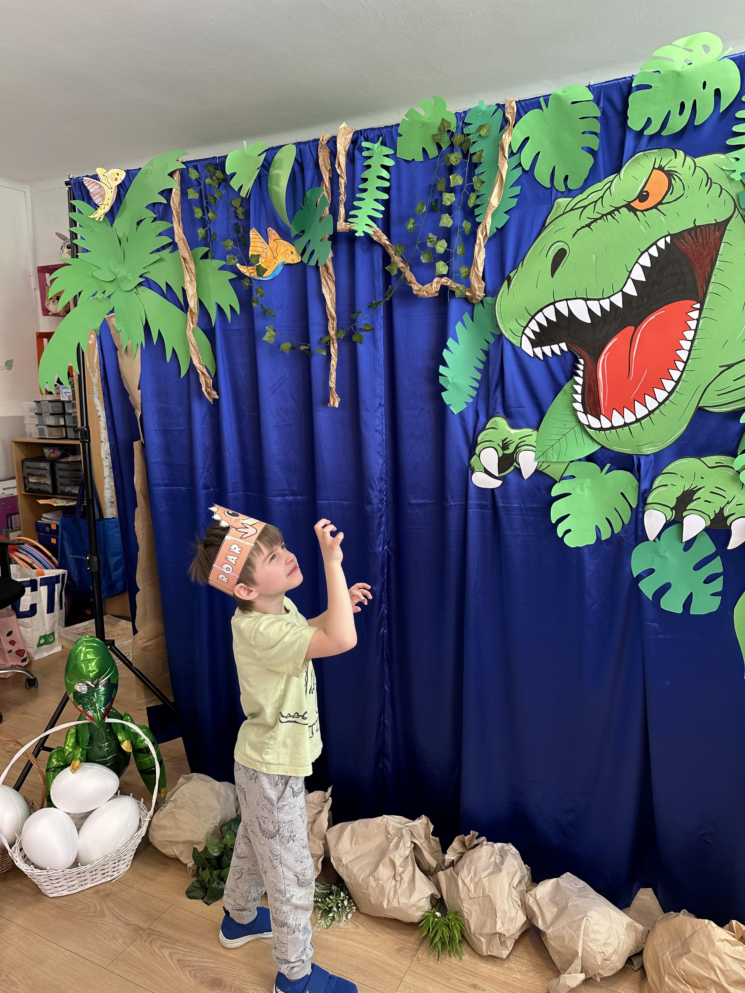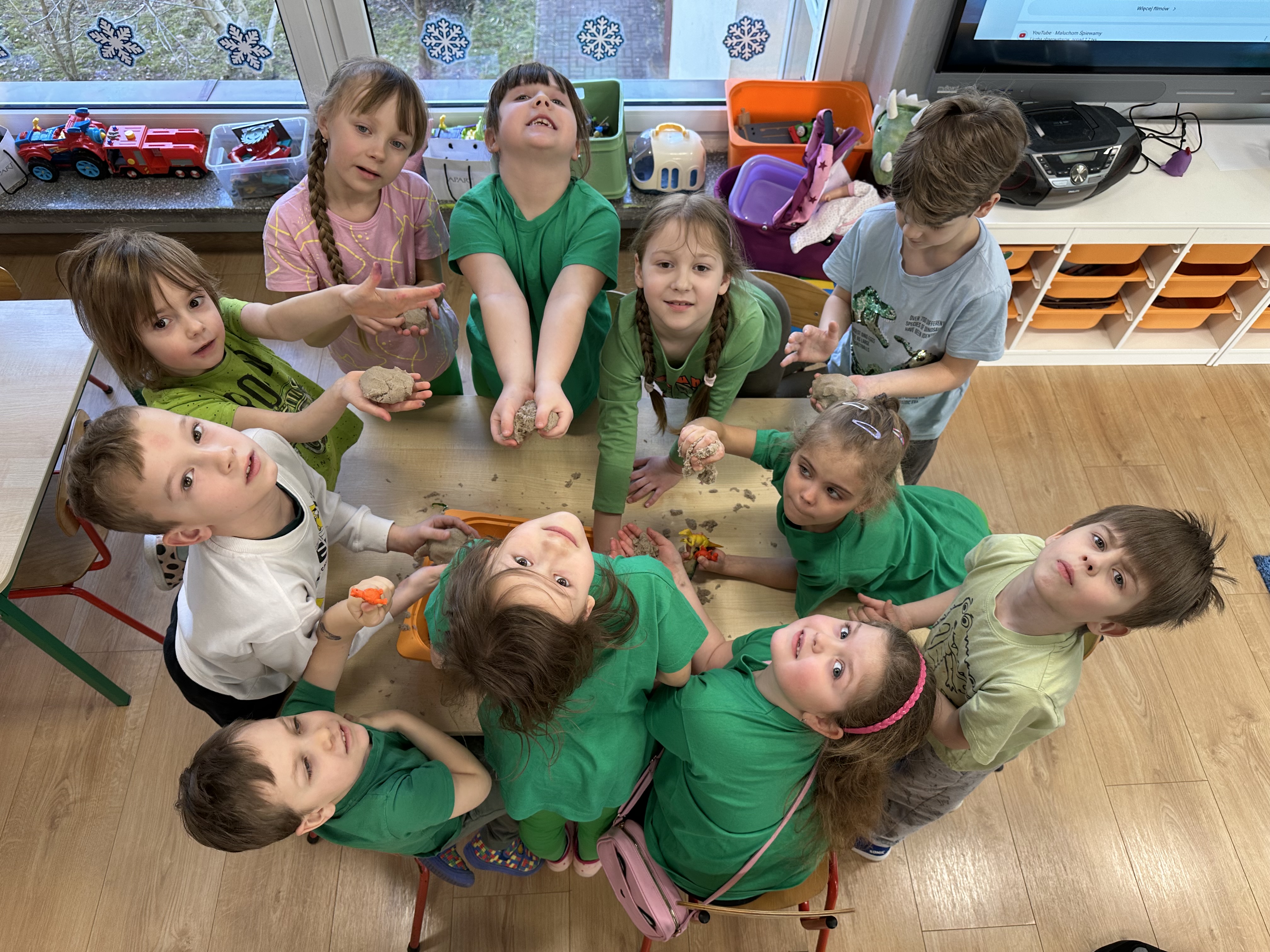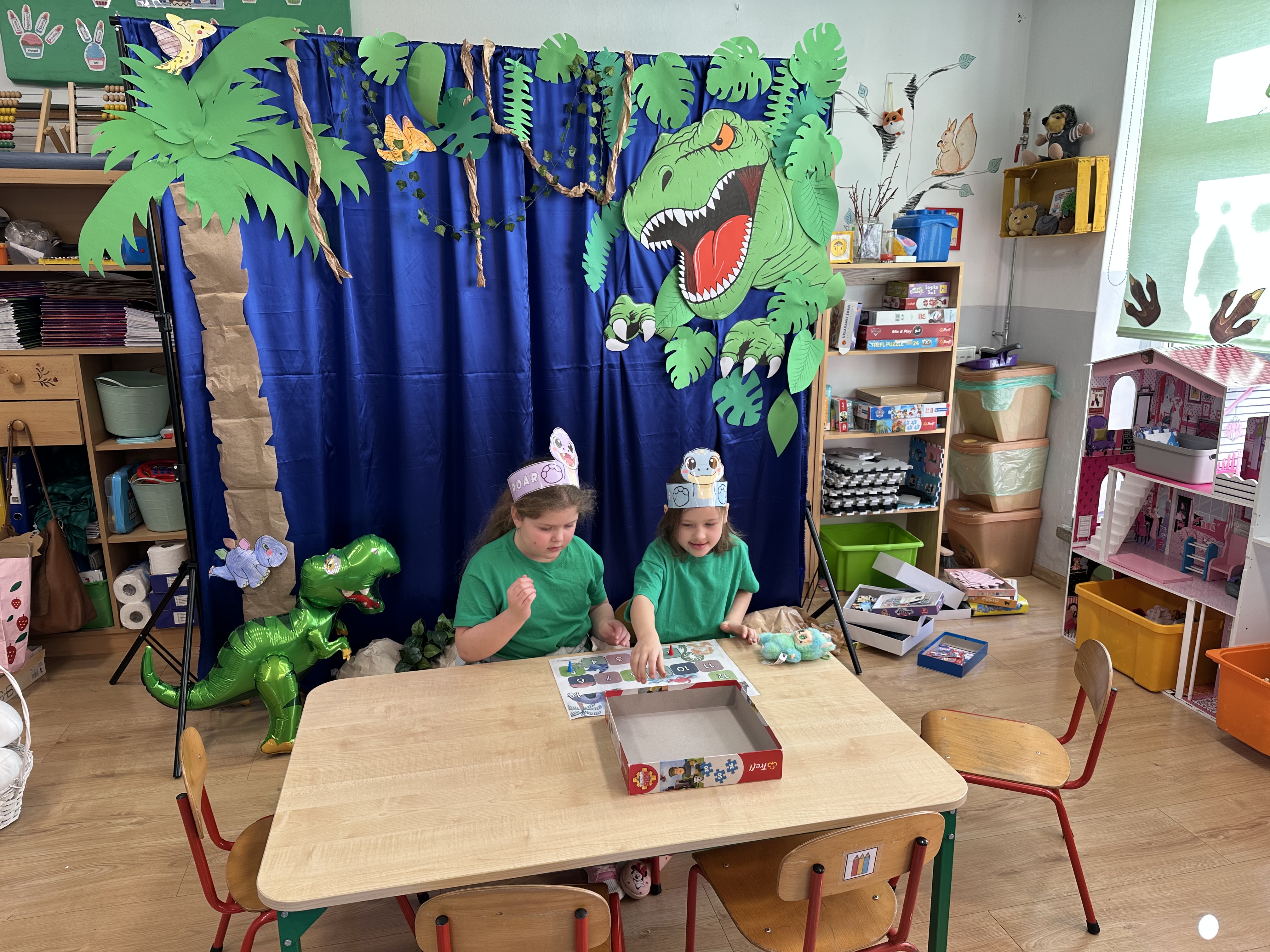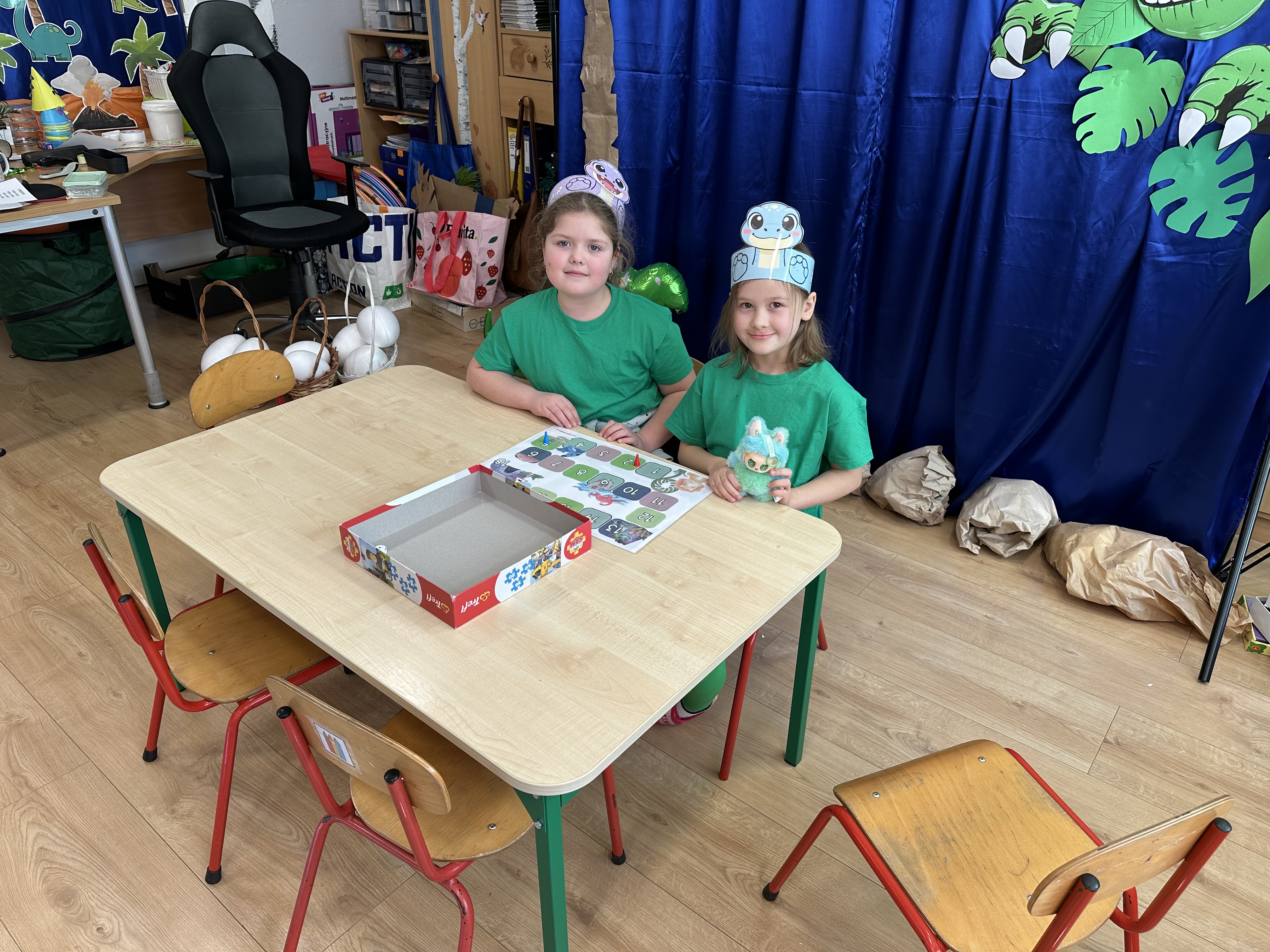 W naszej grupie odbył się Dzień Dinozaura, który dostarczył dzieciom wielu radosnych chwil oraz wzbogacił ich wiedzę o prehistorycznym świecie. Już od samego rana w sali został przygotowany kącik dinozaurów, w którym znalazły się figurki, książki oraz ilustracje przedstawiające różne gatunki tych niezwykłych stworzeń. Jedną z pierwszych aktywności była zabawa w paleontologów. Dzieci z ogromnym zaangażowaniem poszukiwały ukrytych „skamieniałości” i figurek dinozaurów, ucząc się przy tym, na czym polega praca naukowca badającego przeszłość Ziemi. Następnie wspólnie segregowały dinozaury na roślinożerne i mięsożerne, poznając ich charakterystyczne cechy oraz sposób odżywiania. Kolejnym punktem programu były „Dino-malowanki” – przestrzenna praca plastyczna, podczas której dzieci rozwijały swoją wyobraźnię i zdolności manualne. Duże zainteresowanie wzbudził również eksperyment „Wulkan”. Wykorzystując sodę i ocet, dzieci mogły zaobserwować efektowną „erupcję”, co było nie tylko świetną zabawą, ale także ciekawą lekcją przyrody. Nie zabrakło również aktywności ruchowych i gier. W „Wyścigach dinozaurów” dzieci sprawdzały, który dinozaur najszybciej dotrze do mety. Dużo emocji dostarczyła także gra „Dino droga”, w której zadaniem było bezpieczne przeprowadzenie dinozaurów przez prehistoryczny krajobraz pełen przygód i niespodzianek. Na zakończenie odbył się quiz sprawdzający wiadomości o dinozaurach. Dzieci wykazały się dużą wiedzą i zaangażowaniem. Dzień zakończył się wykonaniem pamiątkowej fotografii, która będzie miłym wspomnieniem wspólnie spędzonego czasu. Obchody Dnia Dinozaura były nie tylko okazją do świetnej zabawy, ale również do zdobywania nowych informacji i rozwijania zainteresowań przyrodniczych.