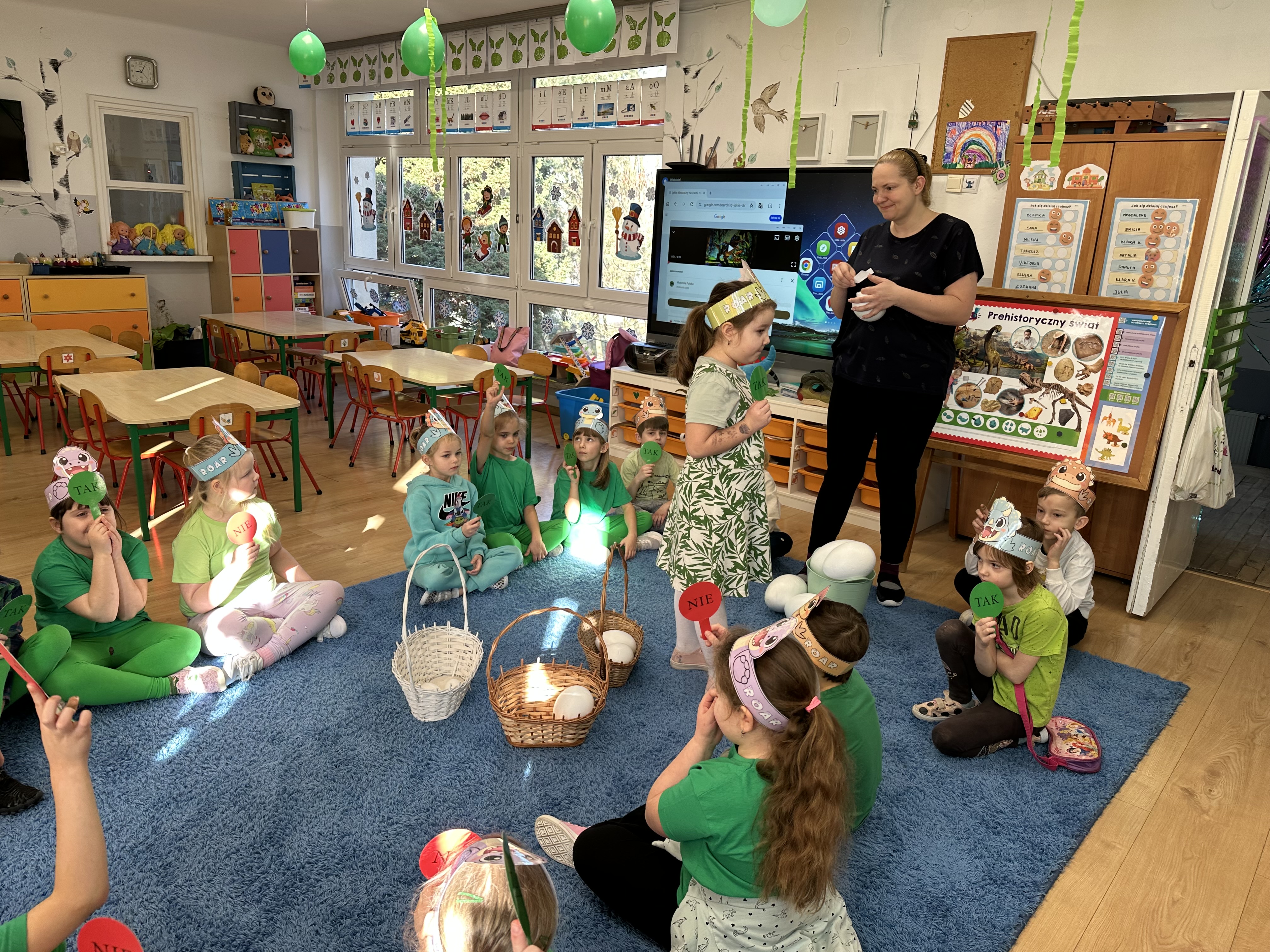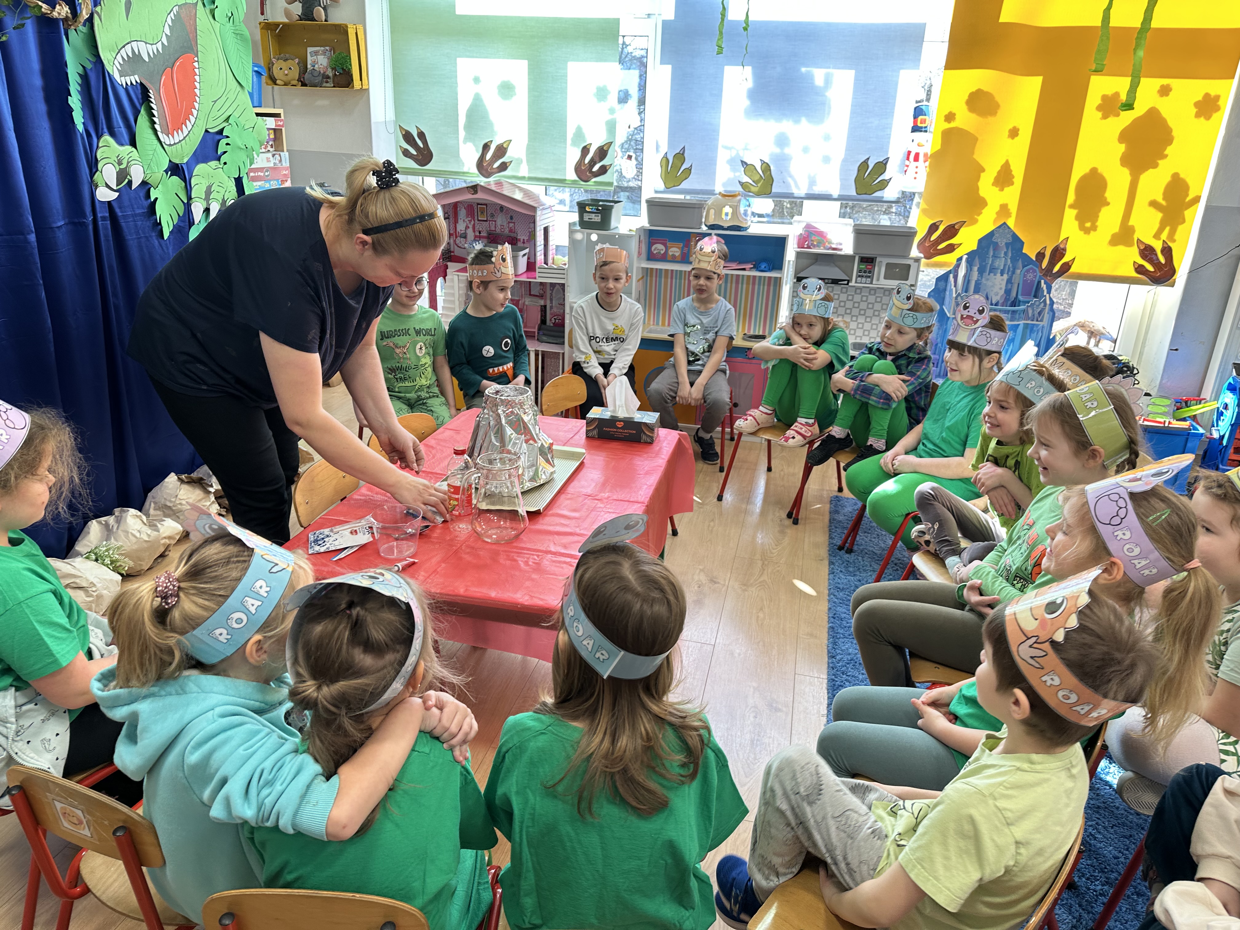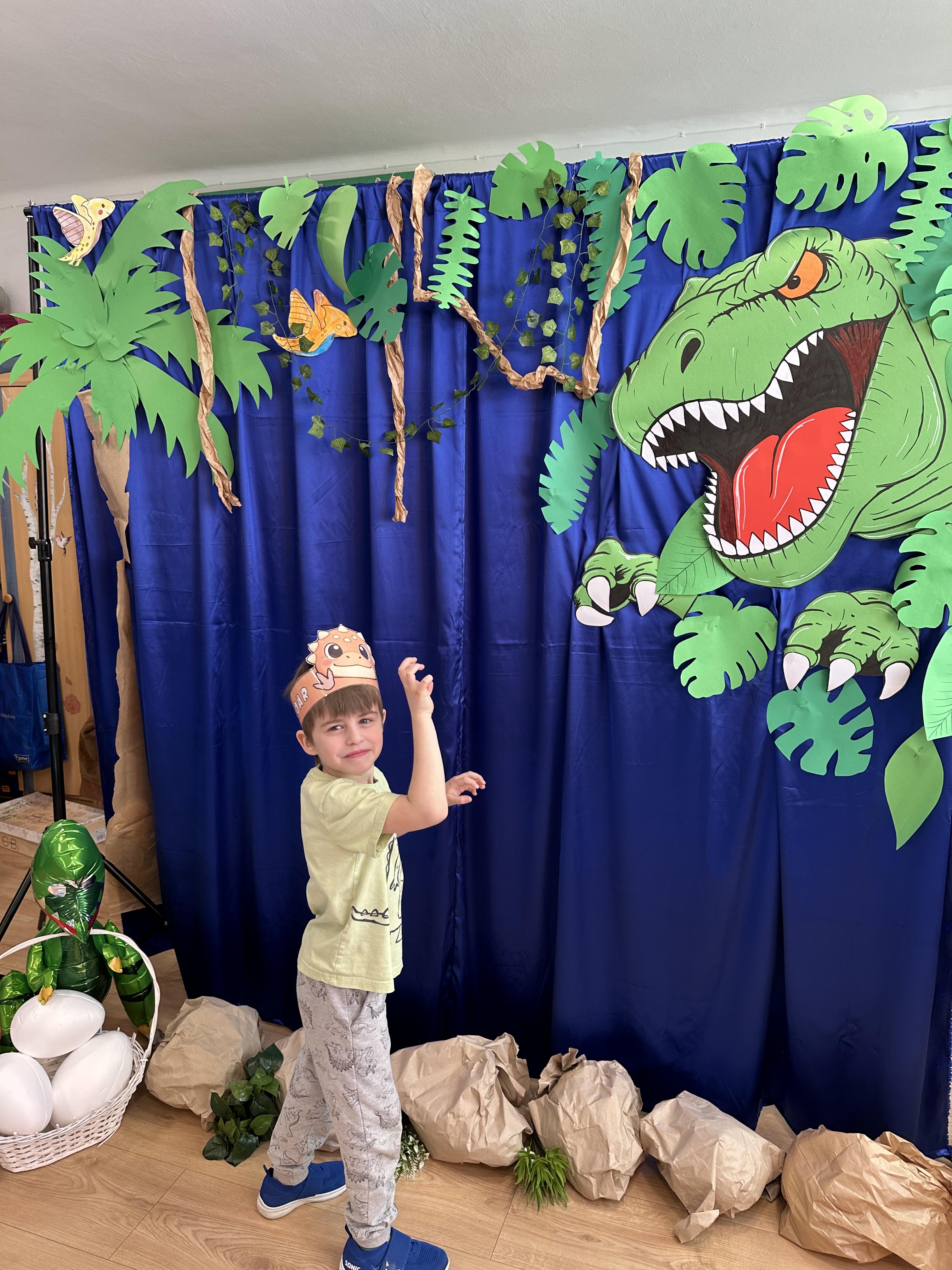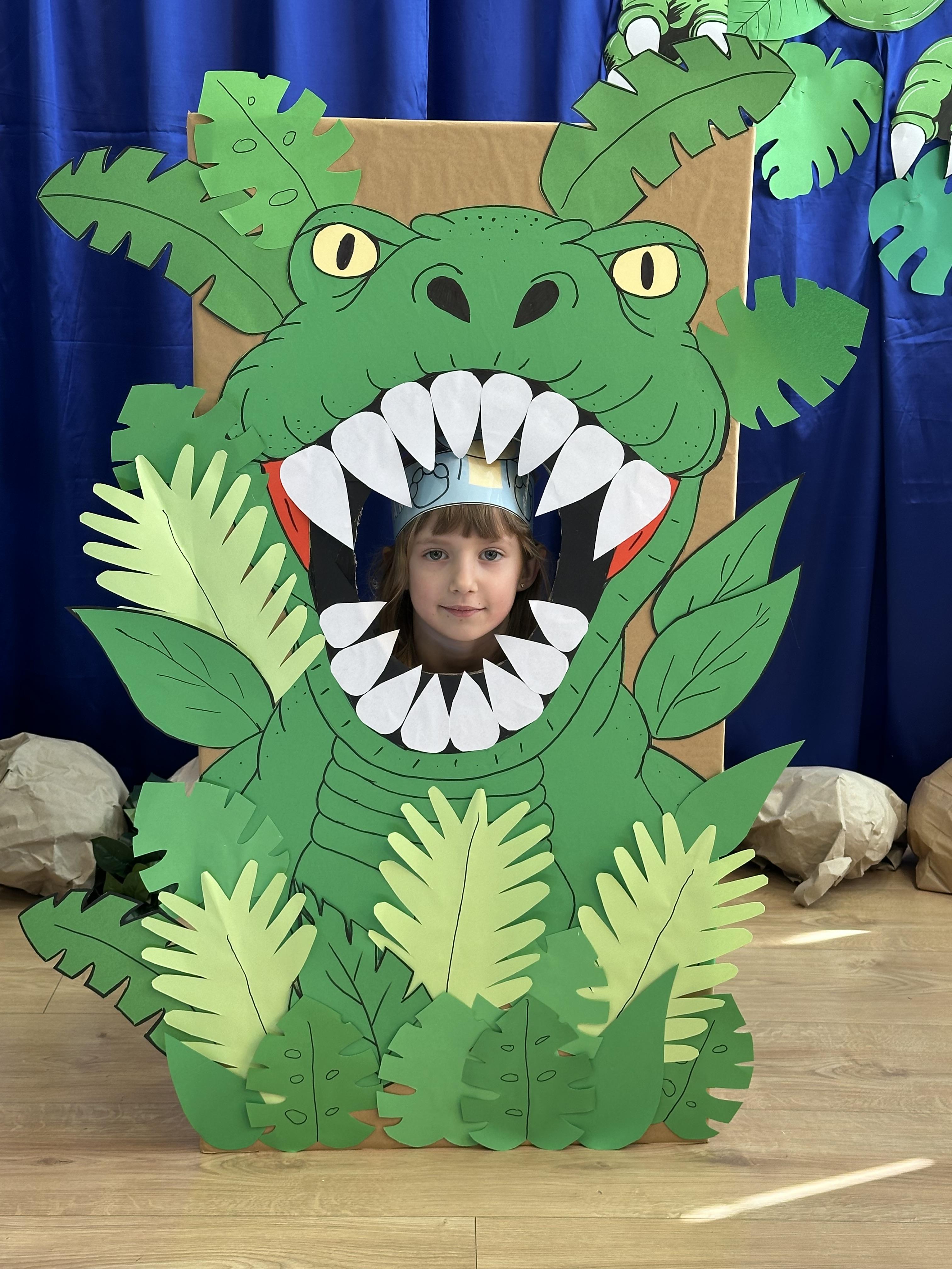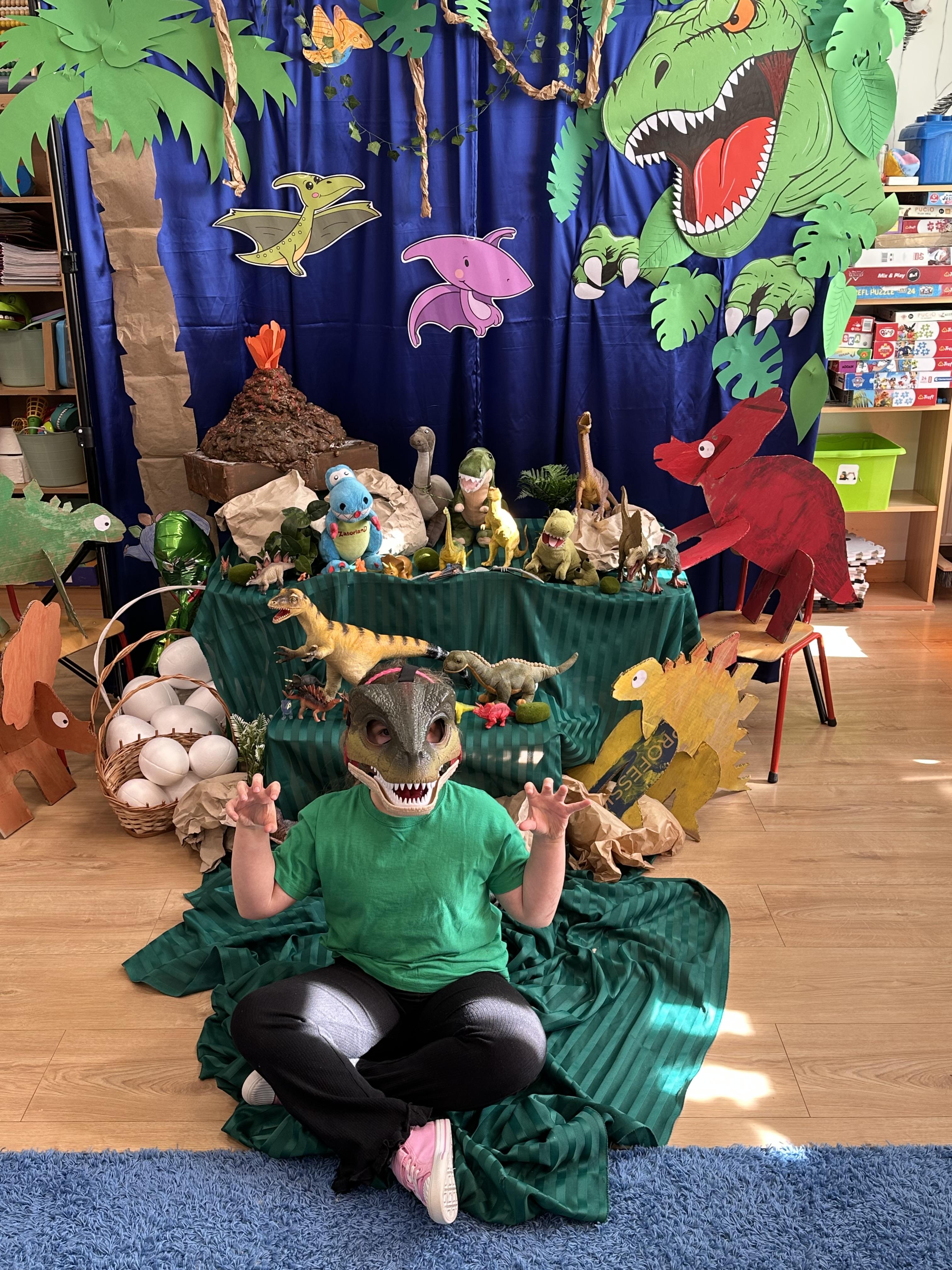 W naszej grupie odbył się Dzień Dinozaura, który dostarczył dzieciom wielu radosnych chwil oraz wzbogacił ich wiedzę o prehistorycznym świecie. Już od samego rana w sali został przygotowany kącik dinozaurów, w którym znalazły się figurki, książki oraz ilustracje przedstawiające różne gatunki tych niezwykłych stworzeń. Jedną z pierwszych aktywności była zabawa w paleontologów. Dzieci z ogromnym zaangażowaniem poszukiwały ukrytych „skamieniałości” i figurek dinozaurów, ucząc się przy tym, na czym polega praca naukowca badającego przeszłość Ziemi. Następnie wspólnie segregowały dinozaury na roślinożerne i mięsożerne, poznając ich charakterystyczne cechy oraz sposób odżywiania. Kolejnym punktem programu były „Dino-malowanki” – przestrzenna praca plastyczna, podczas której dzieci rozwijały swoją wyobraźnię i zdolności manualne. Duże zainteresowanie wzbudził również eksperyment „Wulkan”. Wykorzystując sodę i ocet, dzieci mogły zaobserwować efektowną „erupcję”, co było nie tylko świetną zabawą, ale także ciekawą lekcją przyrody. Nie zabrakło również aktywności ruchowych i gier. W „Wyścigach dinozaurów” dzieci sprawdzały, który dinozaur najszybciej dotrze do mety. Dużo emocji dostarczyła także gra „Dino droga”, w której zadaniem było bezpieczne przeprowadzenie dinozaurów przez prehistoryczny krajobraz pełen przygód i niespodzianek. Na zakończenie odbył się quiz sprawdzający wiadomości o dinozaurach. Dzieci wykazały się dużą wiedzą i zaangażowaniem. Dzień zakończył się wykonaniem pamiątkowej fotografii, która będzie miłym wspomnieniem wspólnie spędzonego czasu. Obchody Dnia Dinozaura były nie tylko okazją do świetnej zabawy, ale również do zdobywania nowych informacji i rozwijania zainteresowań przyrodniczych.