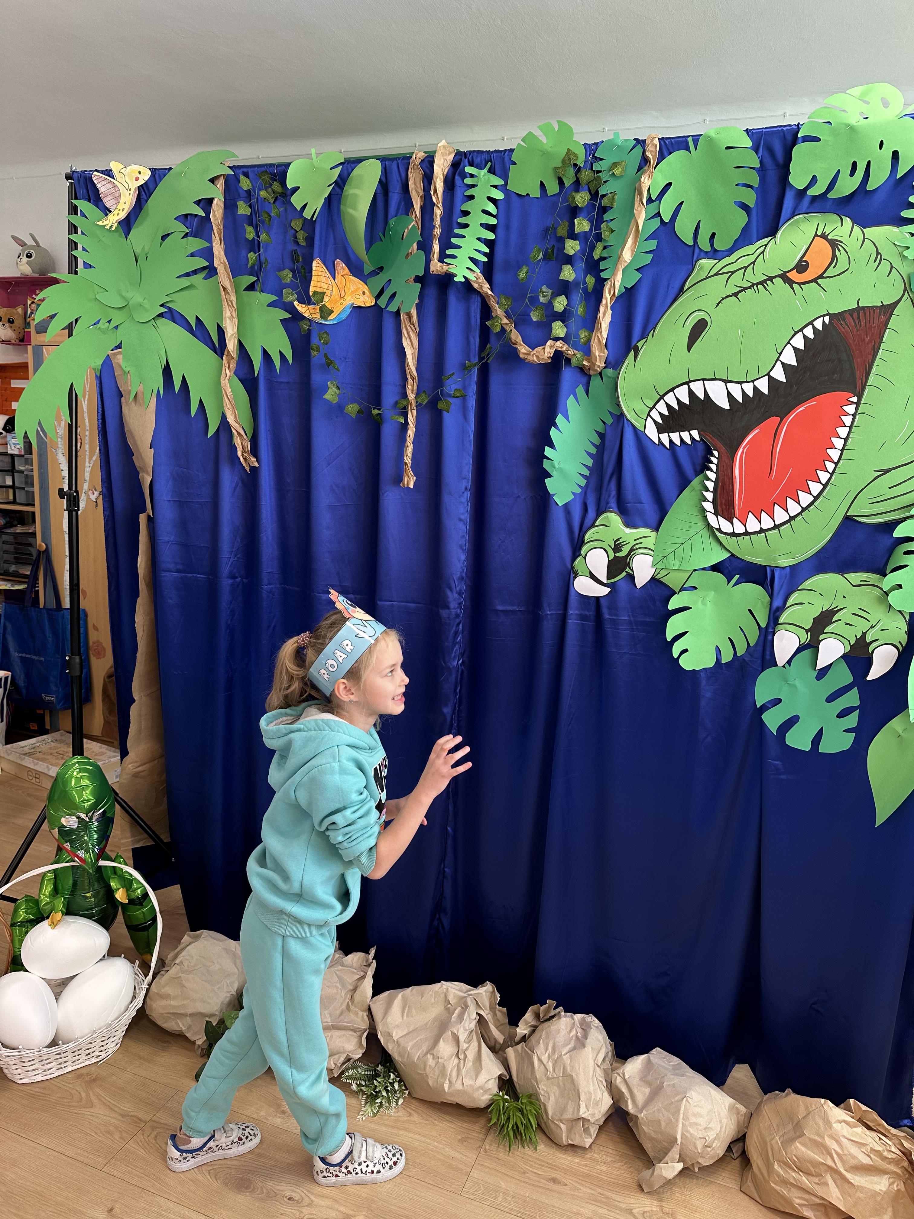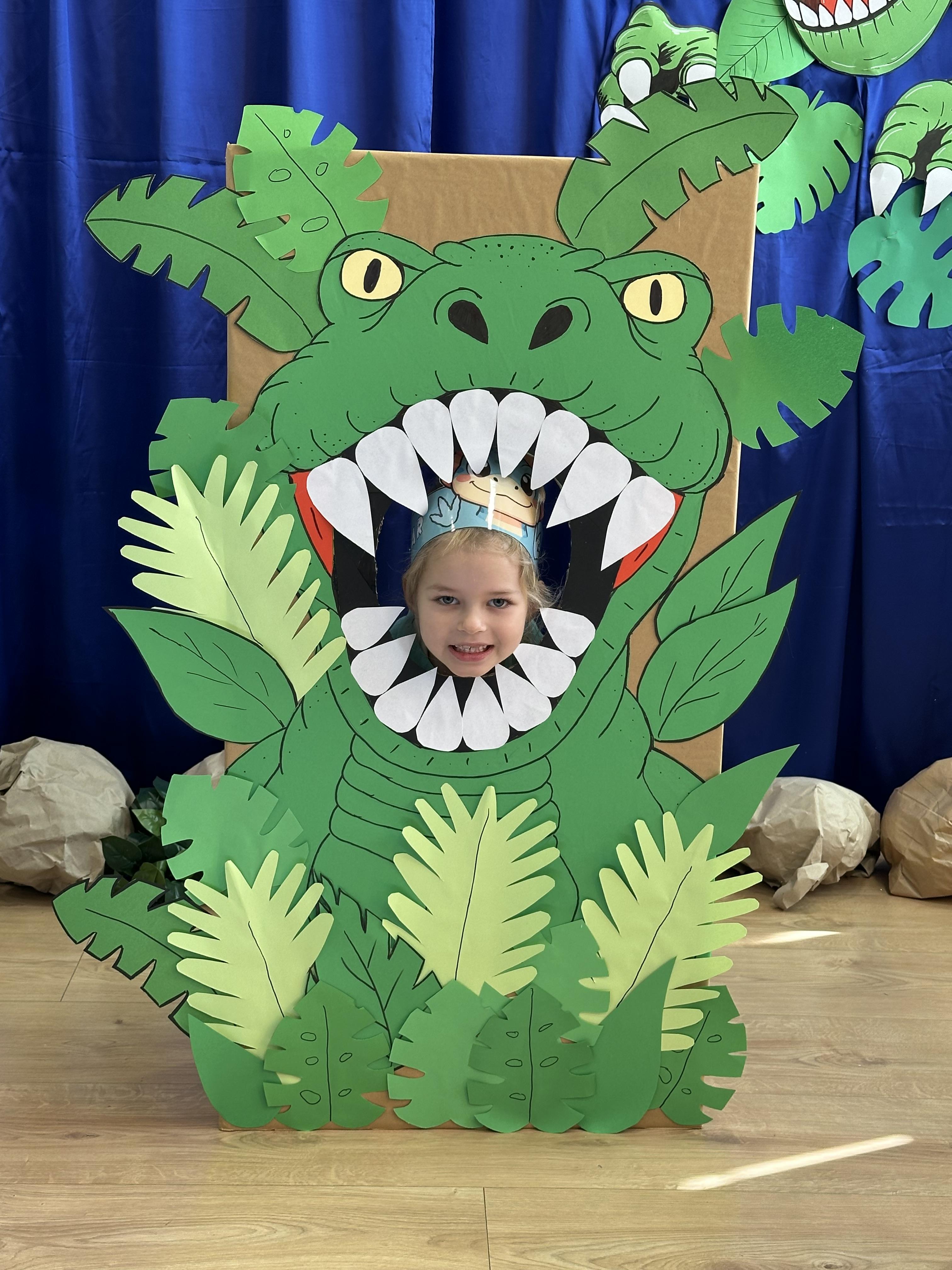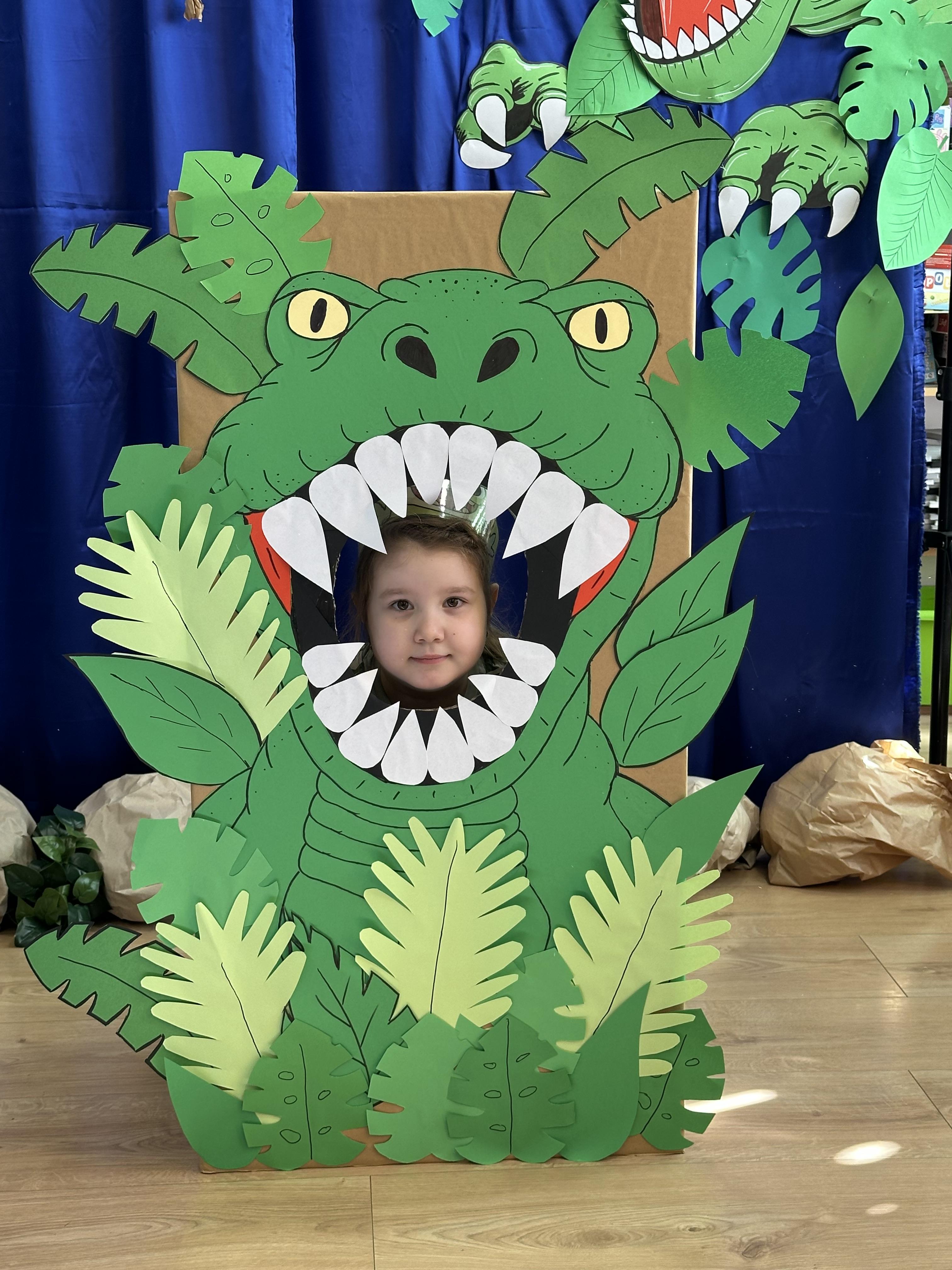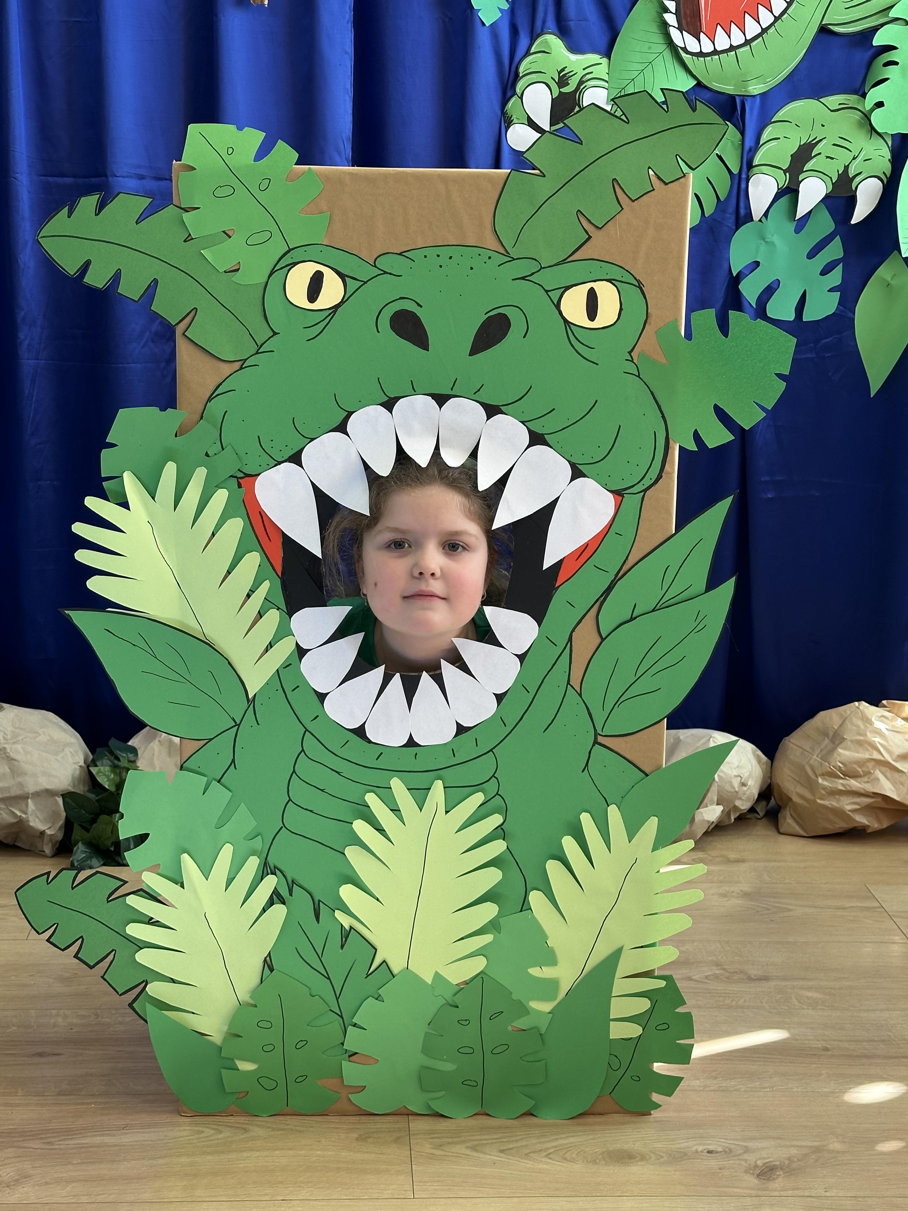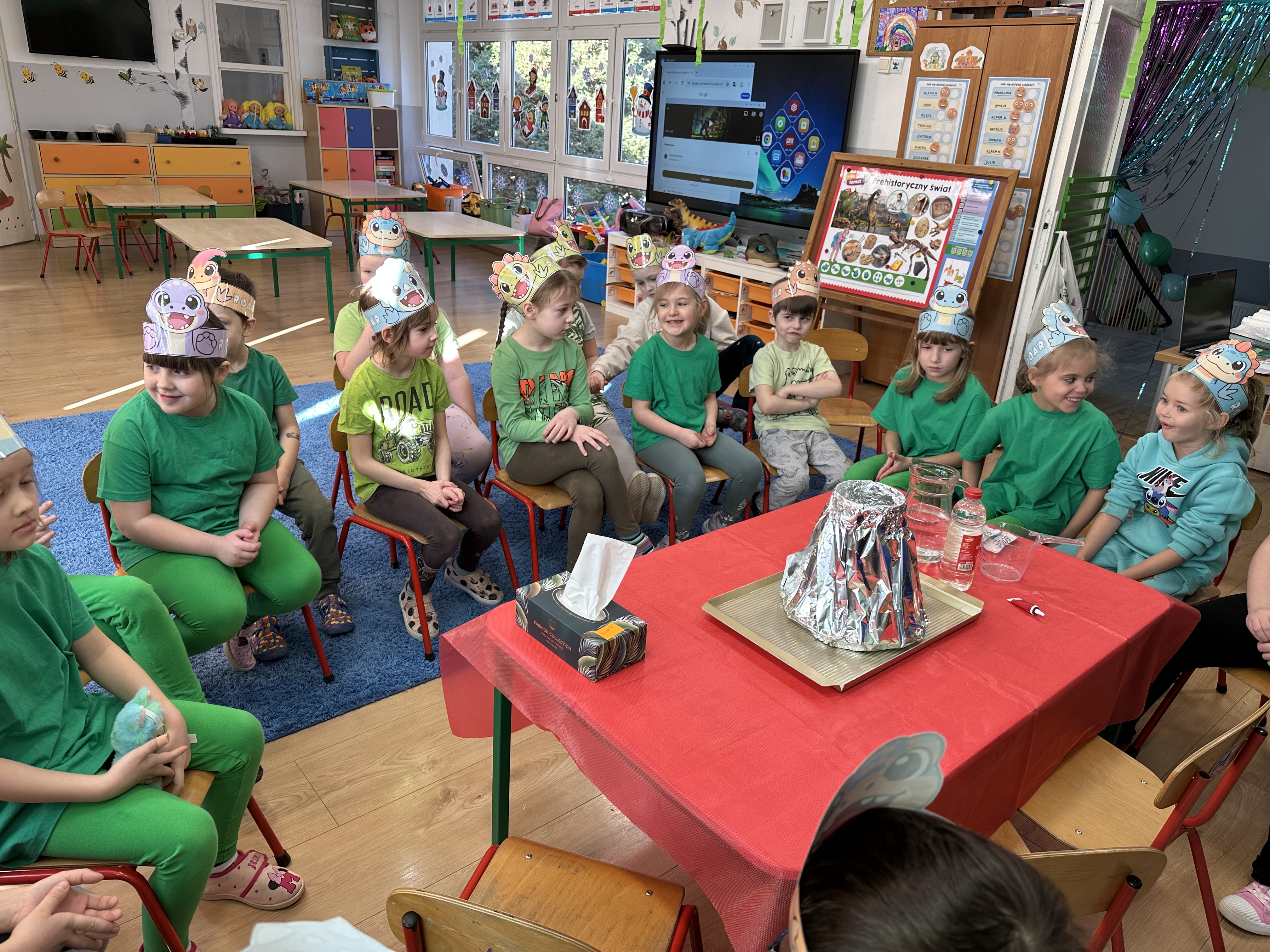 W naszej grupie odbył się Dzień Dinozaura, który dostarczył dzieciom wielu radosnych chwil oraz wzbogacił ich wiedzę o prehistorycznym świecie. Już od samego rana w sali został przygotowany kącik dinozaurów, w którym znalazły się figurki, książki oraz ilustracje przedstawiające różne gatunki tych niezwykłych stworzeń. Jedną z pierwszych aktywności była zabawa w paleontologów. Dzieci z ogromnym zaangażowaniem poszukiwały ukrytych „skamieniałości” i figurek dinozaurów, ucząc się przy tym, na czym polega praca naukowca badającego przeszłość Ziemi. Następnie wspólnie segregowały dinozaury na roślinożerne i mięsożerne, poznając ich charakterystyczne cechy oraz sposób odżywiania. Kolejnym punktem programu były „Dino-malowanki” – przestrzenna praca plastyczna, podczas której dzieci rozwijały swoją wyobraźnię i zdolności manualne. Duże zainteresowanie wzbudził również eksperyment „Wulkan”. Wykorzystując sodę i ocet, dzieci mogły zaobserwować efektowną „erupcję”, co było nie tylko świetną zabawą, ale także ciekawą lekcją przyrody. Nie zabrakło również aktywności ruchowych i gier. W „Wyścigach dinozaurów” dzieci sprawdzały, który dinozaur najszybciej dotrze do mety. Dużo emocji dostarczyła także gra „Dino droga”, w której zadaniem było bezpieczne przeprowadzenie dinozaurów przez prehistoryczny krajobraz pełen przygód i niespodzianek. Na zakończenie odbył się quiz sprawdzający wiadomości o dinozaurach. Dzieci wykazały się dużą wiedzą i zaangażowaniem. Dzień zakończył się wykonaniem pamiątkowej fotografii, która będzie miłym wspomnieniem wspólnie spędzonego czasu. Obchody Dnia Dinozaura były nie tylko okazją do świetnej zabawy, ale również do zdobywania nowych informacji i rozwijania zainteresowań przyrodniczych.