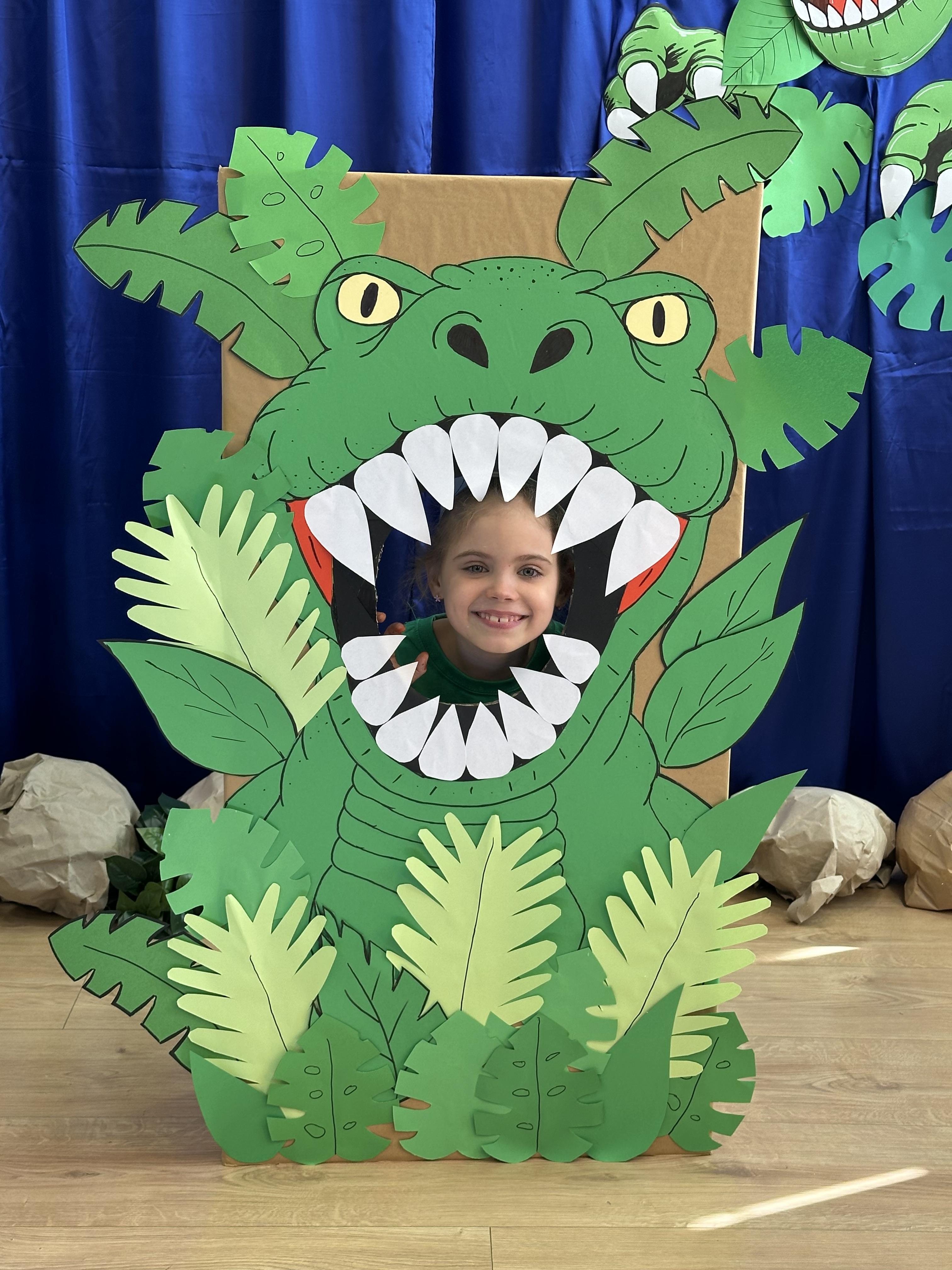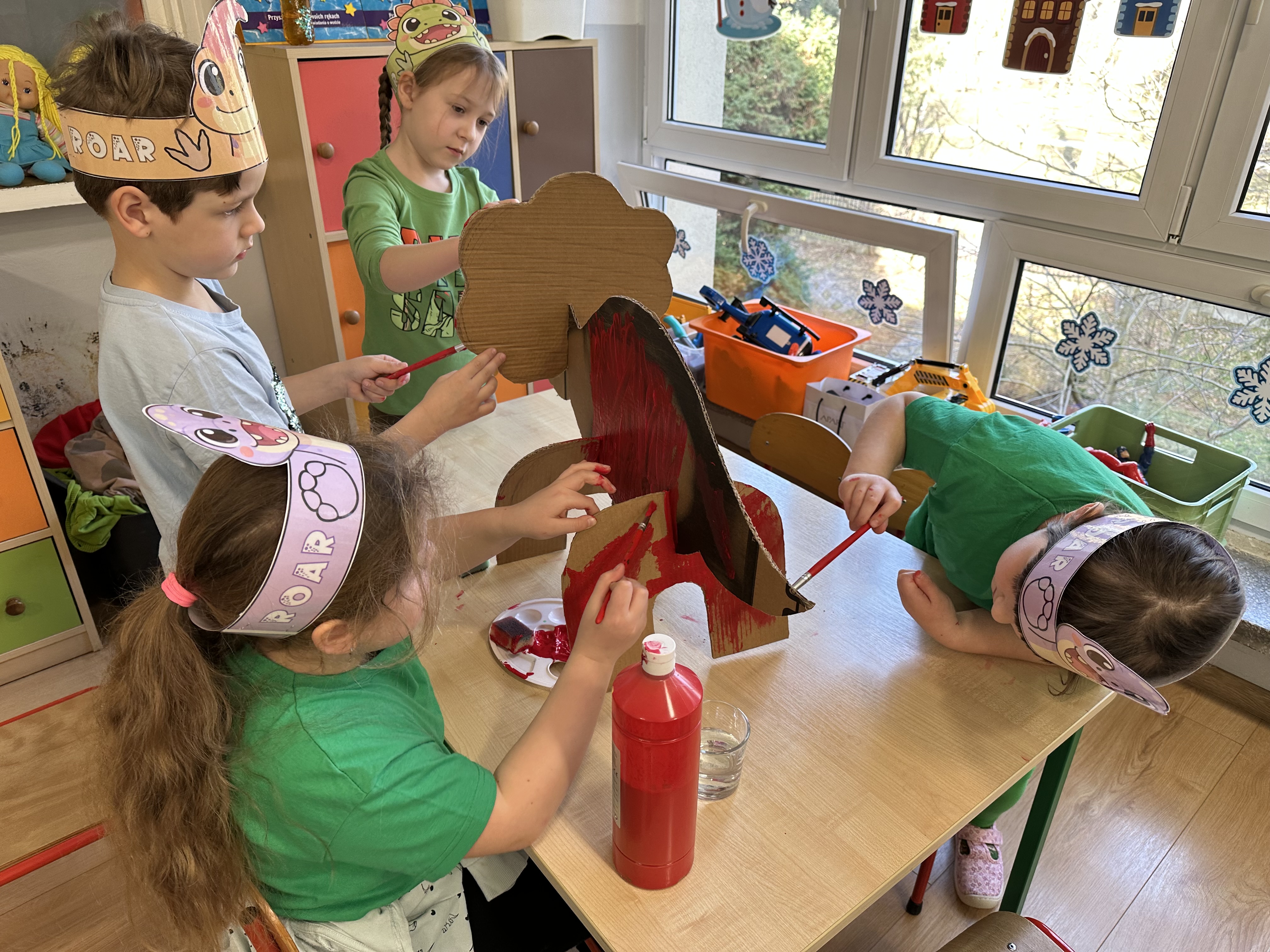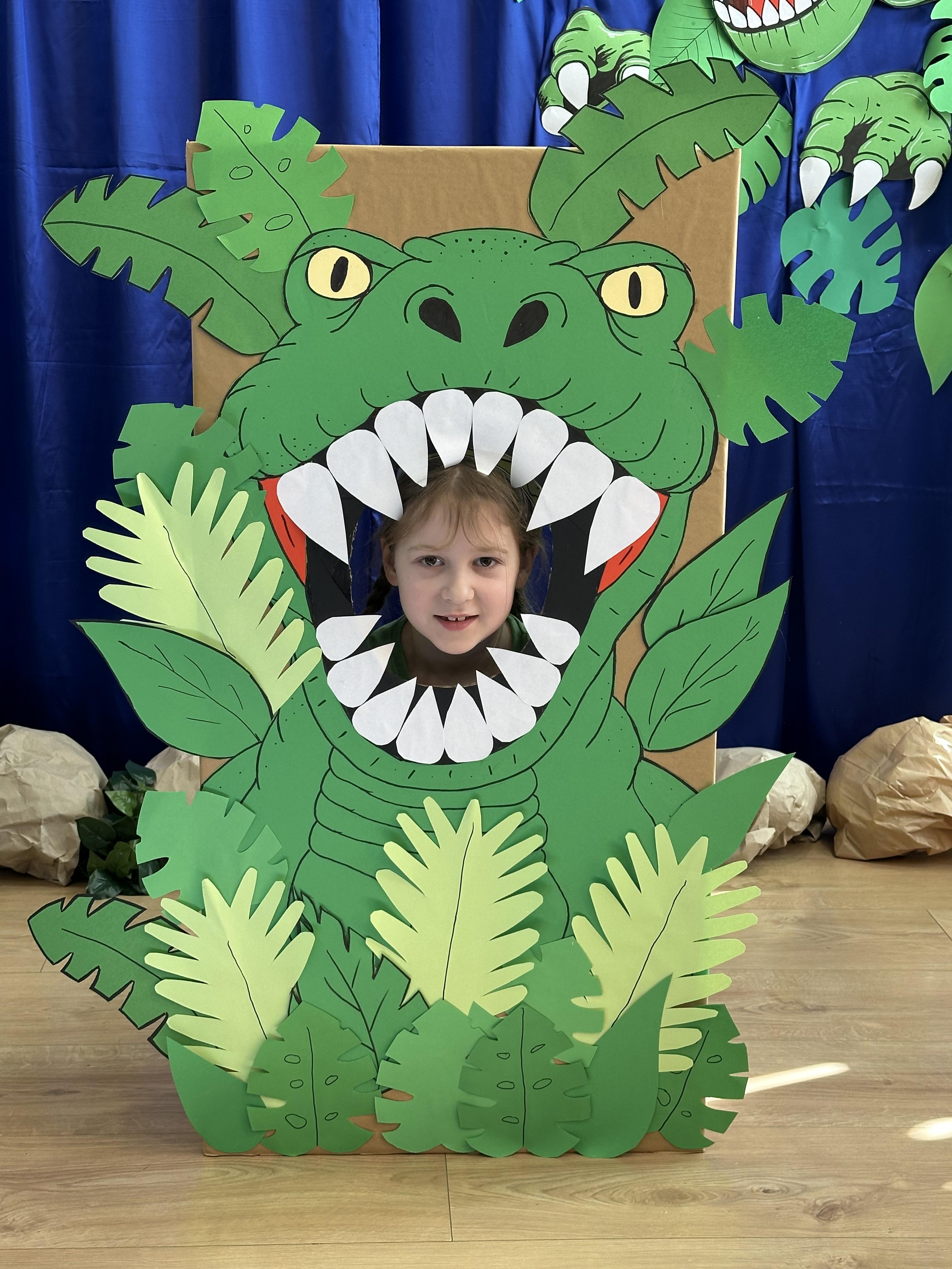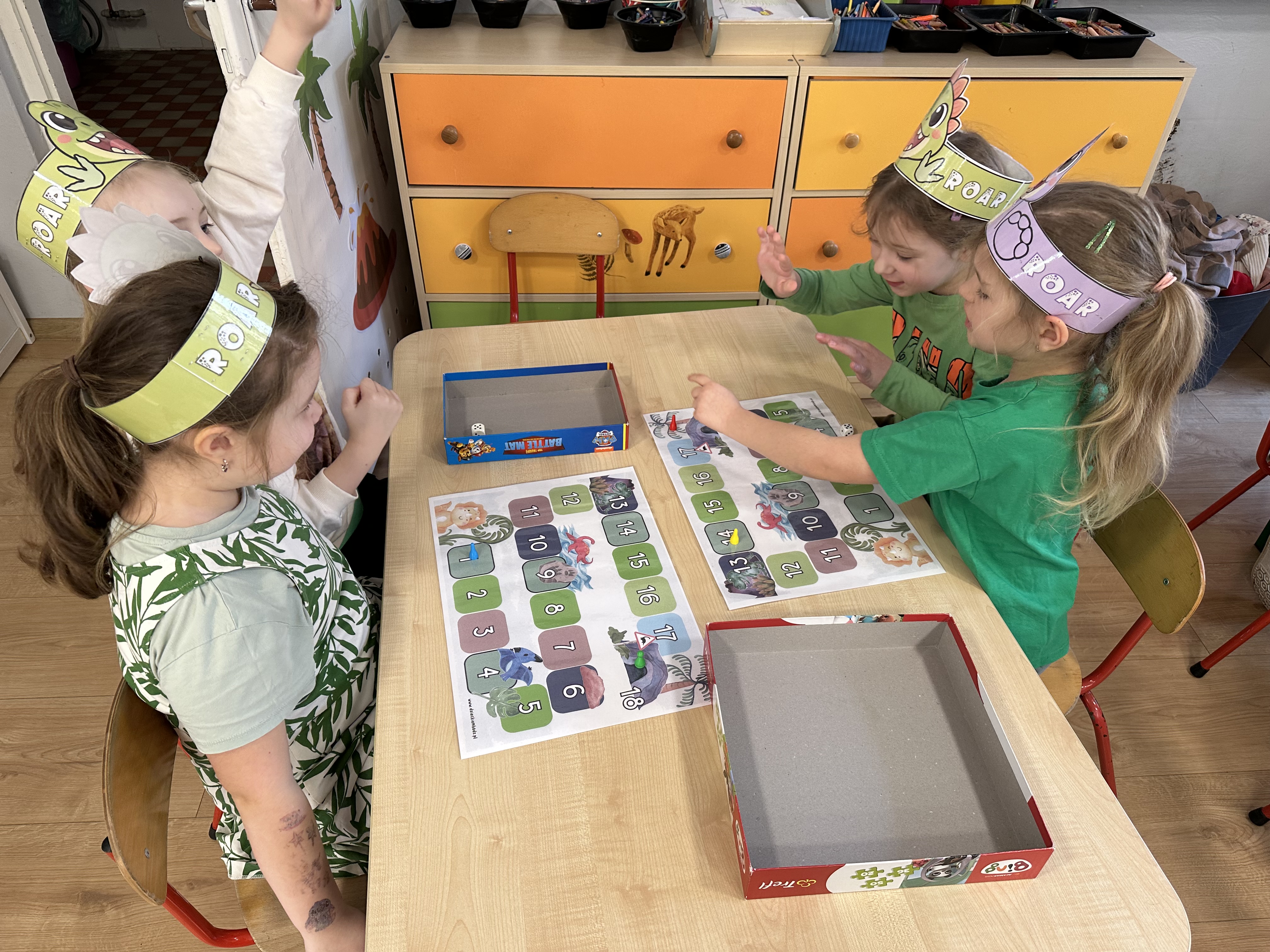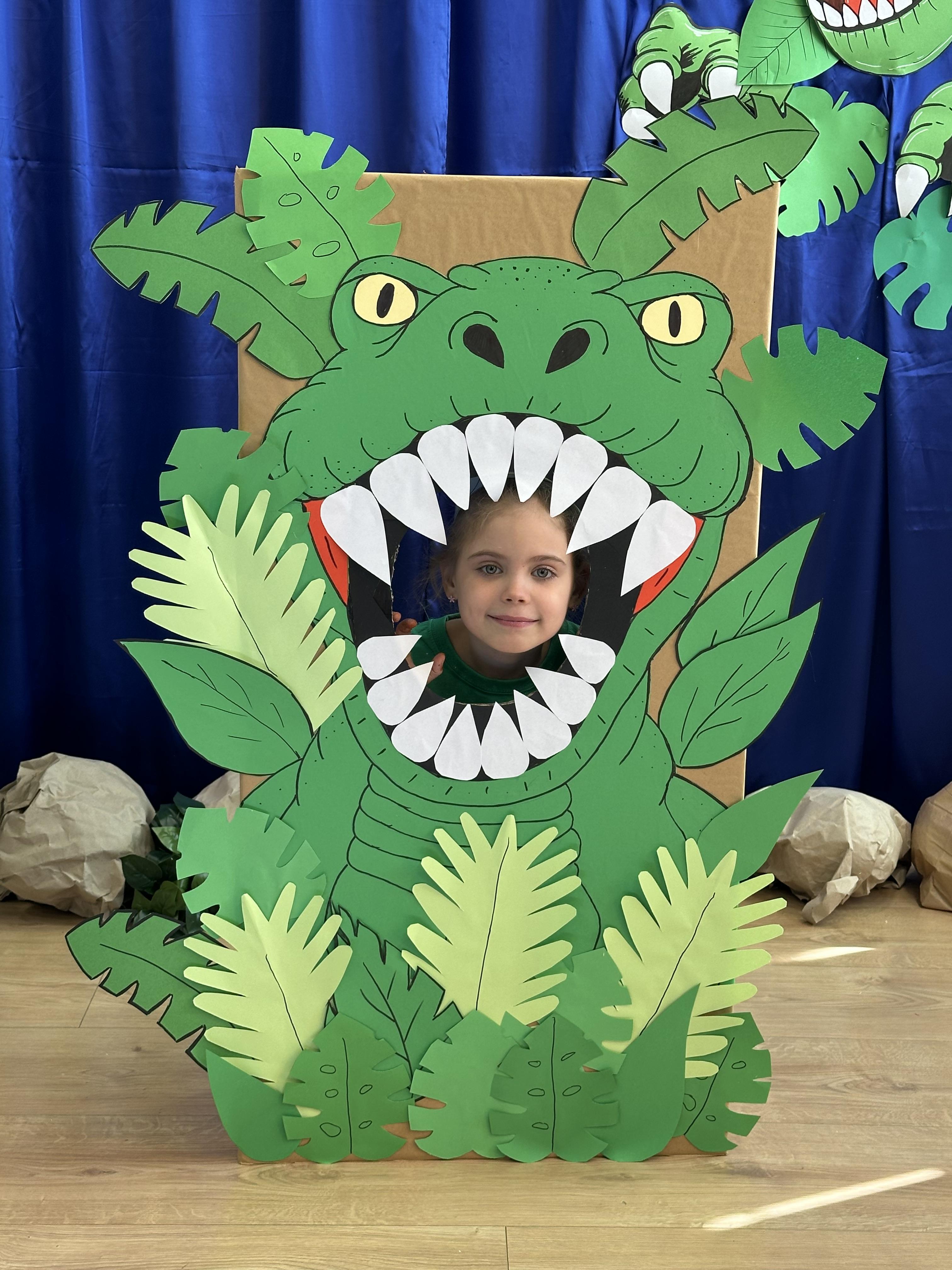 W naszej grupie odbył się Dzień Dinozaura, który dostarczył dzieciom wielu radosnych chwil oraz wzbogacił ich wiedzę o prehistorycznym świecie. Już od samego rana w sali został przygotowany kącik dinozaurów, w którym znalazły się figurki, książki oraz ilustracje przedstawiające różne gatunki tych niezwykłych stworzeń. Jedną z pierwszych aktywności była zabawa w paleontologów. Dzieci z ogromnym zaangażowaniem poszukiwały ukrytych „skamieniałości” i figurek dinozaurów, ucząc się przy tym, na czym polega praca naukowca badającego przeszłość Ziemi. Następnie wspólnie segregowały dinozaury na roślinożerne i mięsożerne, poznając ich charakterystyczne cechy oraz sposób odżywiania. Kolejnym punktem programu były „Dino-malowanki” – przestrzenna praca plastyczna, podczas której dzieci rozwijały swoją wyobraźnię i zdolności manualne. Duże zainteresowanie wzbudził również eksperyment „Wulkan”. Wykorzystując sodę i ocet, dzieci mogły zaobserwować efektowną „erupcję”, co było nie tylko świetną zabawą, ale także ciekawą lekcją przyrody. Nie zabrakło również aktywności ruchowych i gier. W „Wyścigach dinozaurów” dzieci sprawdzały, który dinozaur najszybciej dotrze do mety. Dużo emocji dostarczyła także gra „Dino droga”, w której zadaniem było bezpieczne przeprowadzenie dinozaurów przez prehistoryczny krajobraz pełen przygód i niespodzianek. Na zakończenie odbył się quiz sprawdzający wiadomości o dinozaurach. Dzieci wykazały się dużą wiedzą i zaangażowaniem. Dzień zakończył się wykonaniem pamiątkowej fotografii, która będzie miłym wspomnieniem wspólnie spędzonego czasu. Obchody Dnia Dinozaura były nie tylko okazją do świetnej zabawy, ale również do zdobywania nowych informacji i rozwijania zainteresowań przyrodniczych.