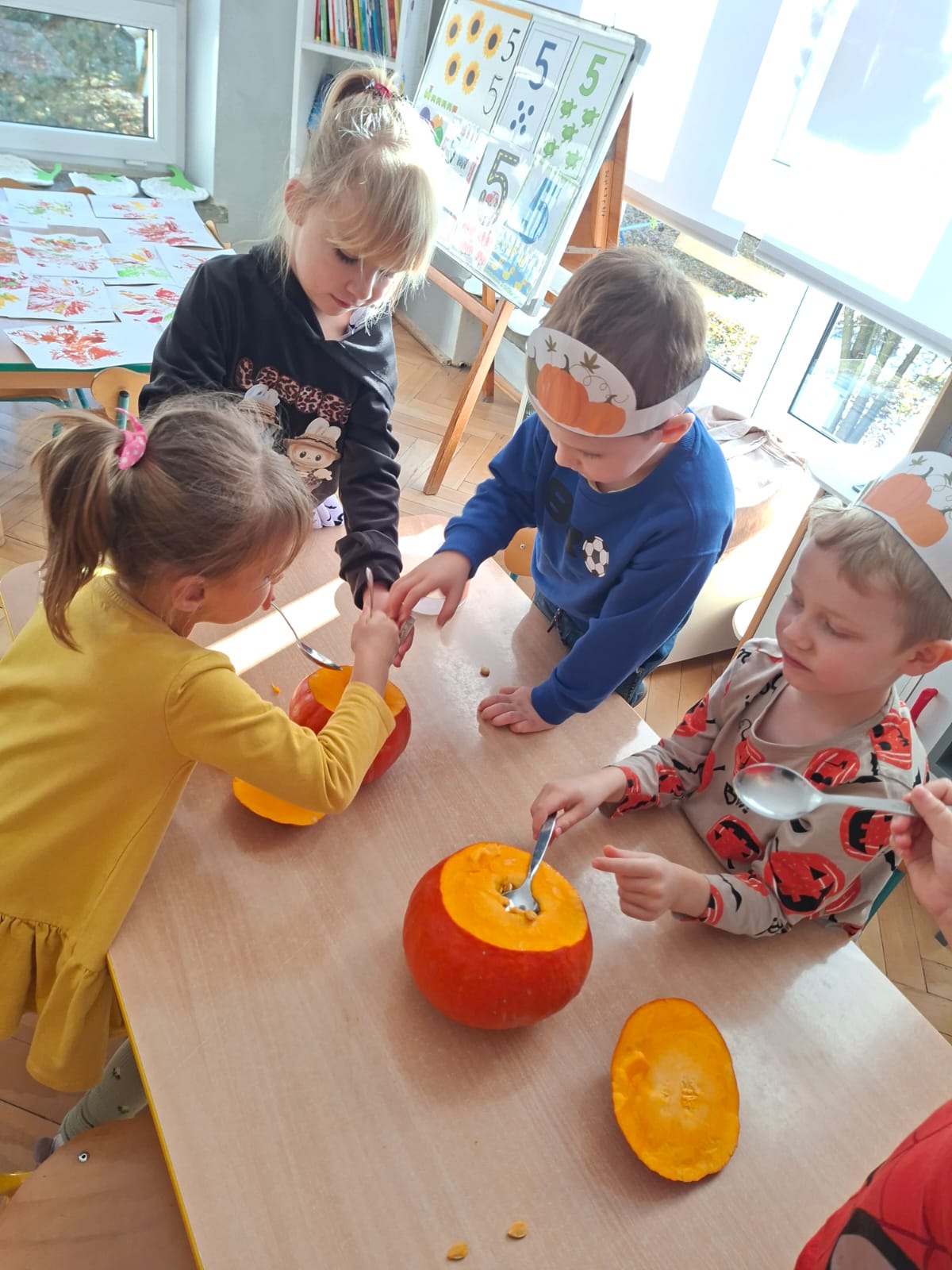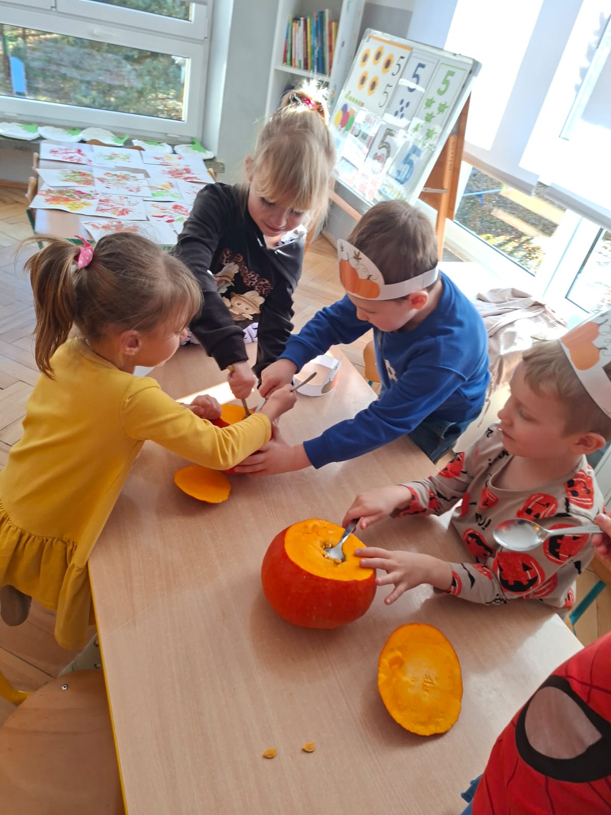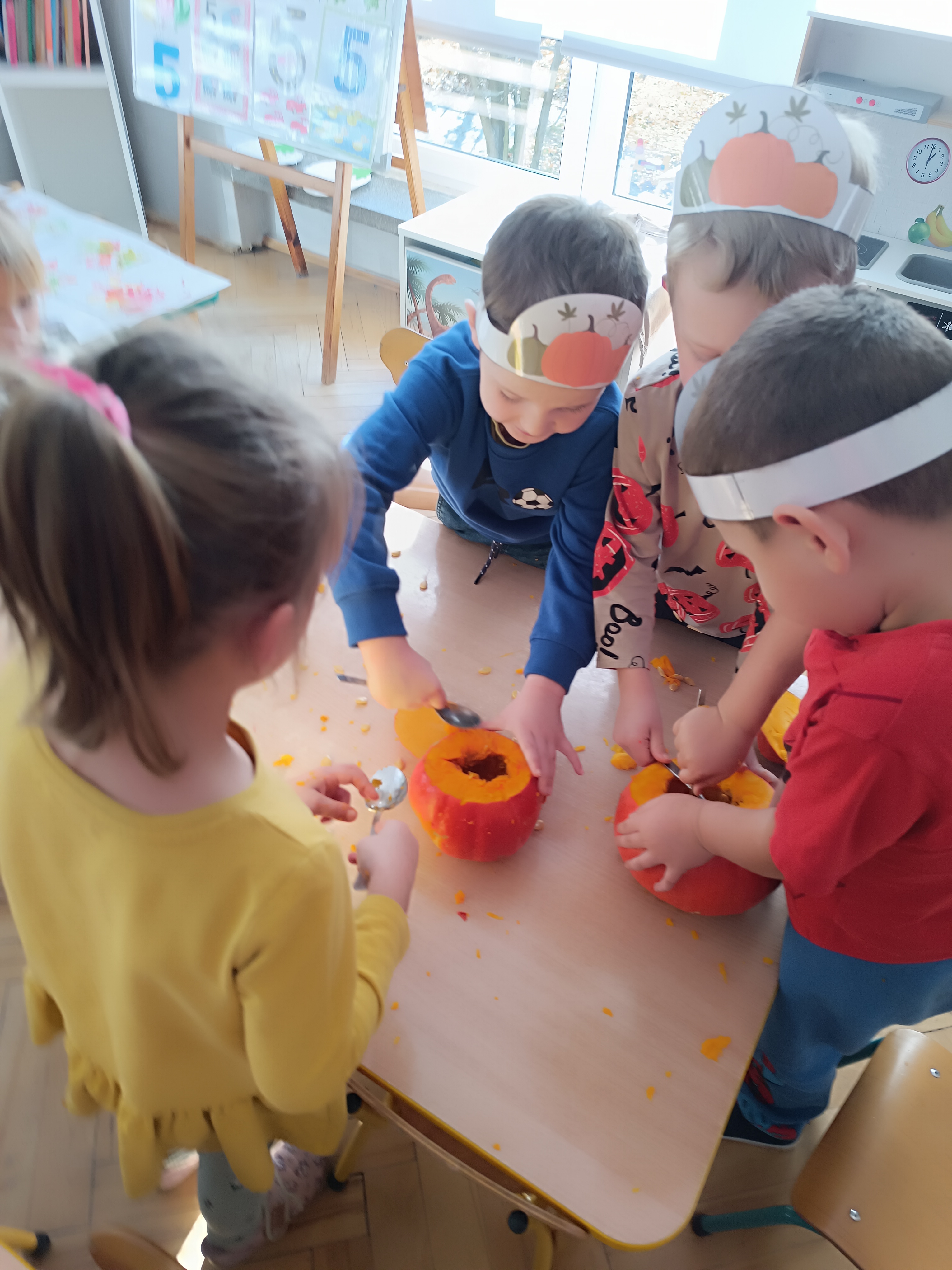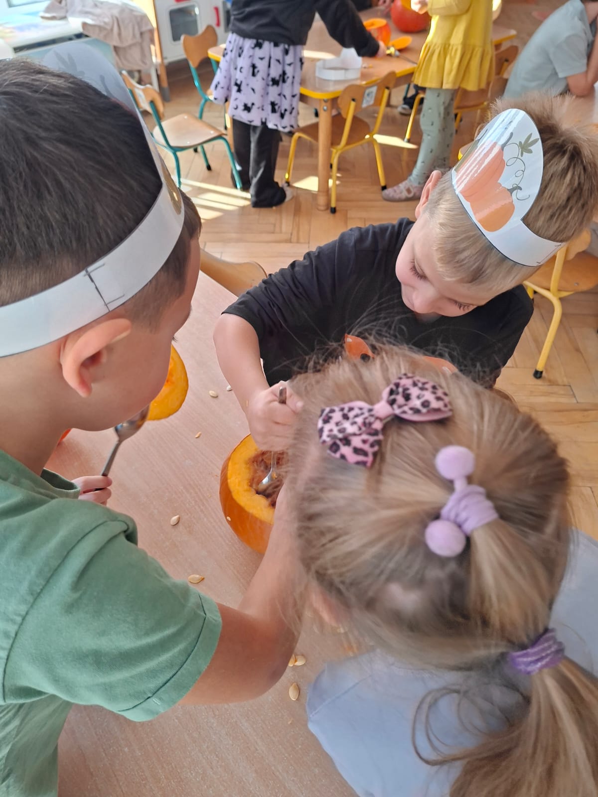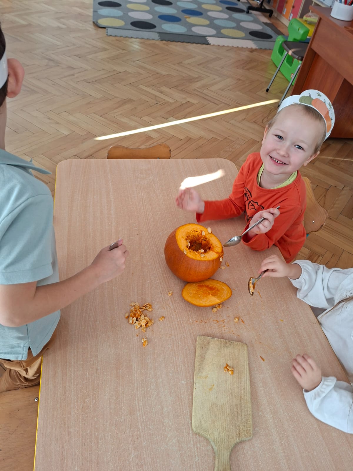 Dzieci w ten dzień przyszły ubrane w dyniowe kolory, przyniosły ze sobą dynie, z których wspólnie robiliśmy lampiony dyniowe, wytłaczając ich środek i poznając przy tym dynie od środka.