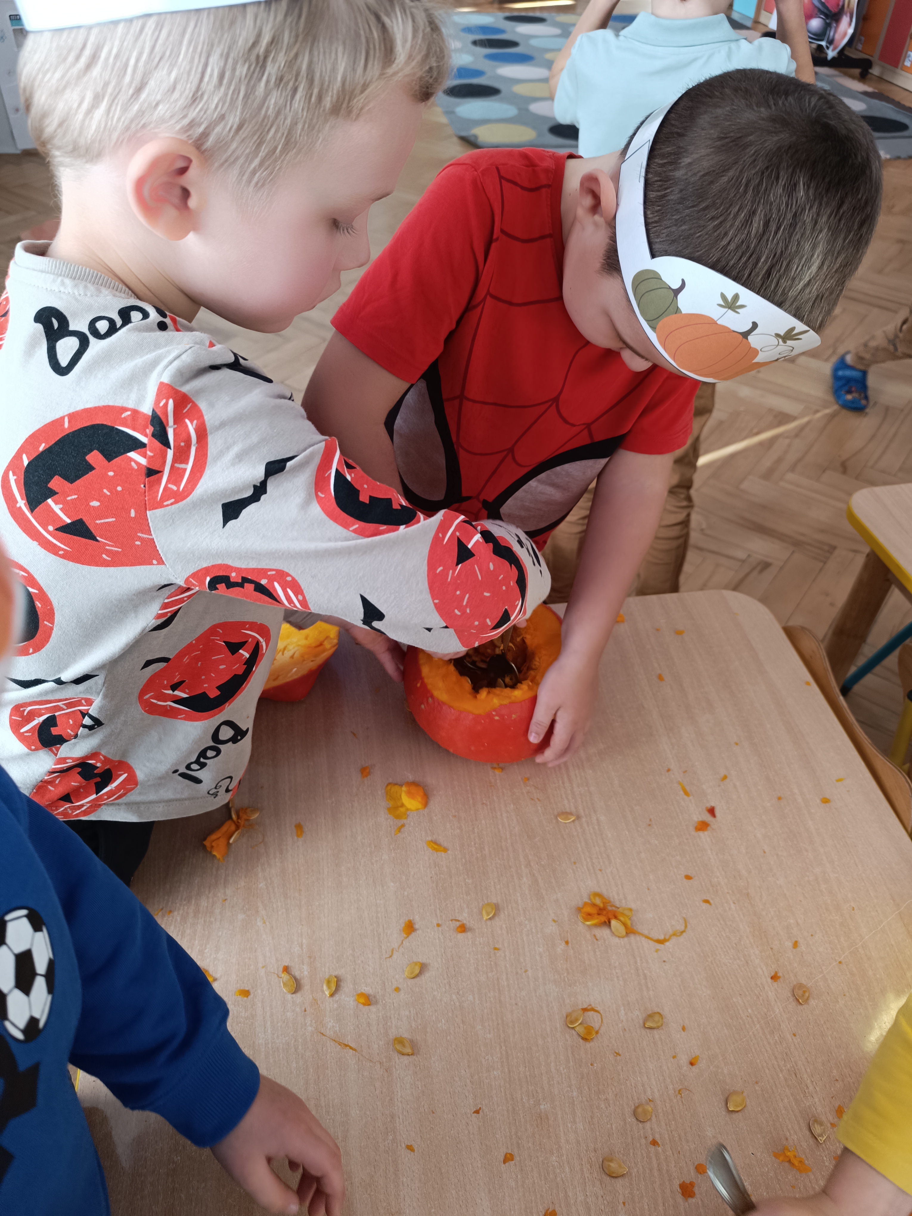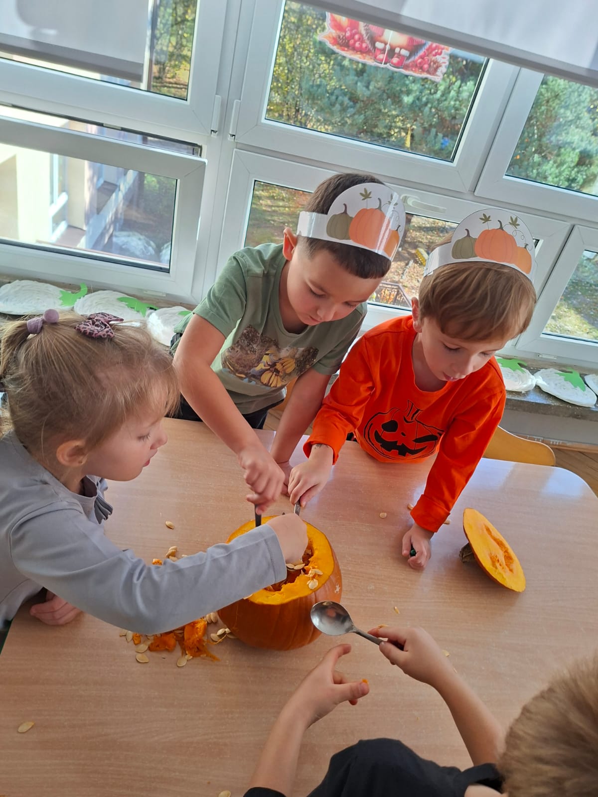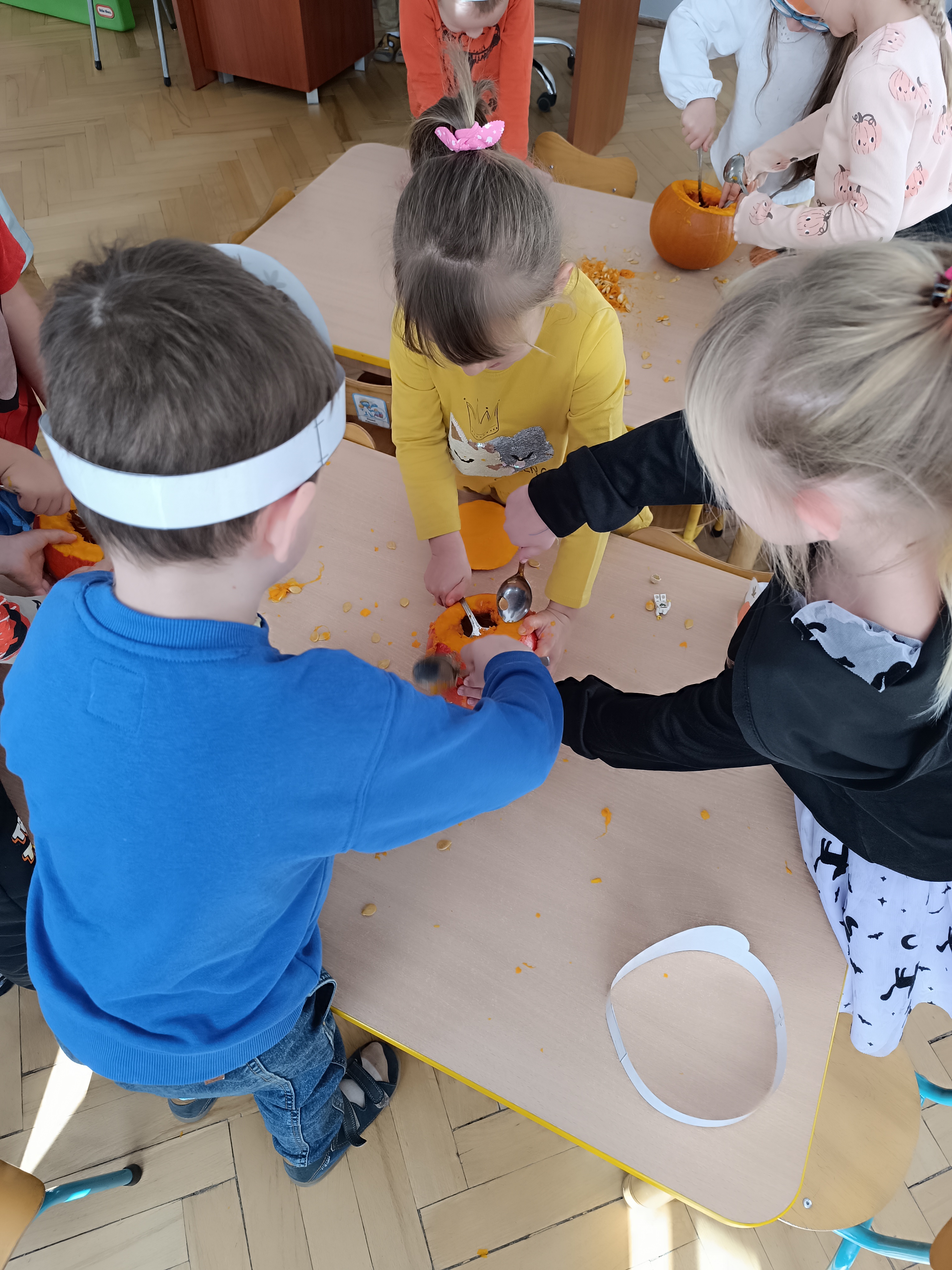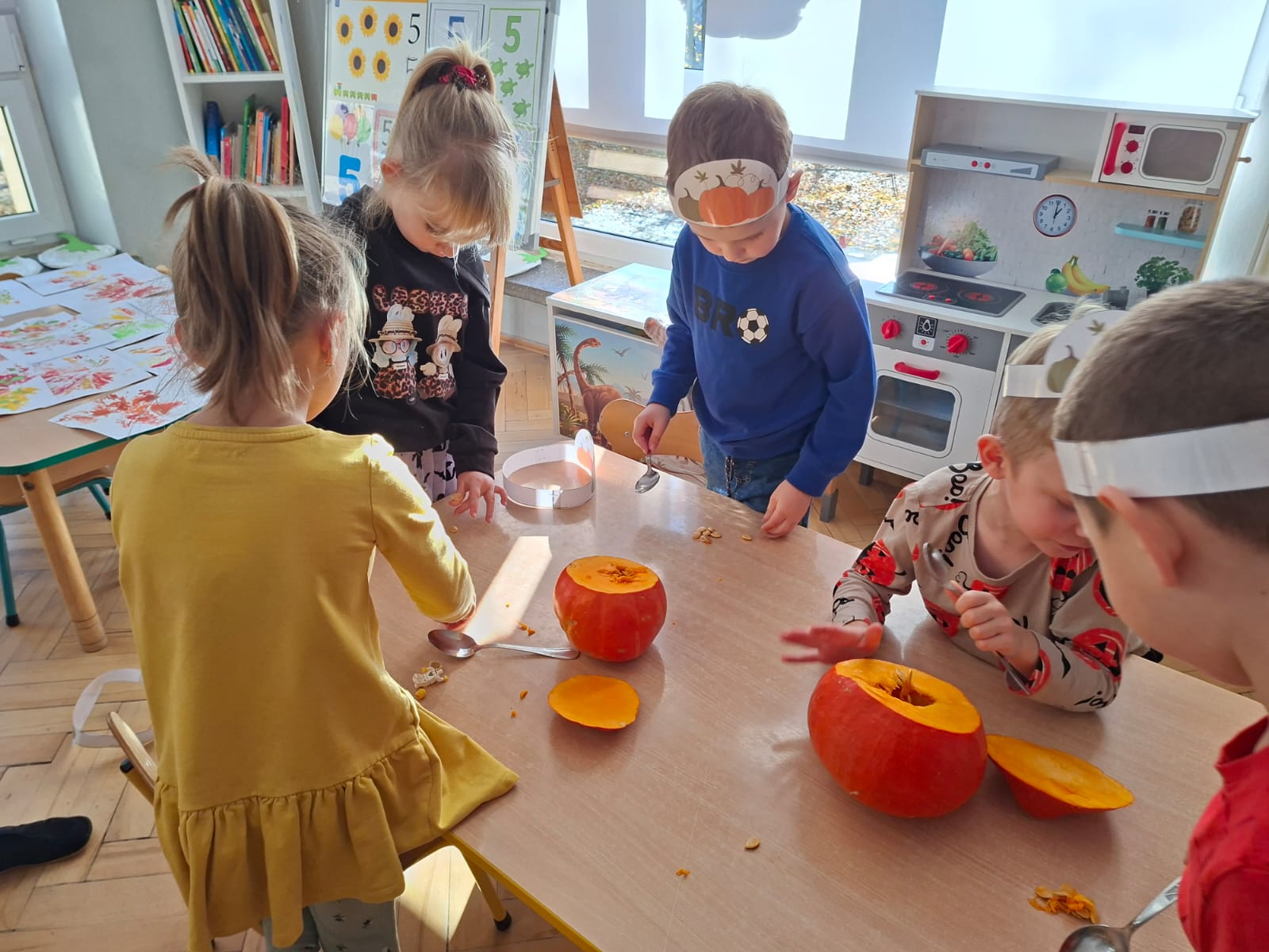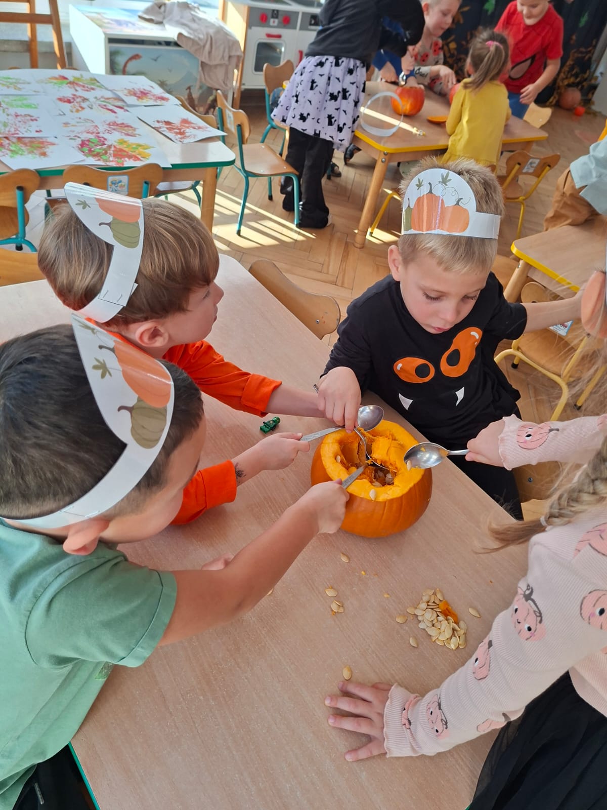 Dzieci w ten dzień przyszły ubrane w dyniowe kolory, przyniosły ze sobą dynie, z których wspólnie robiliśmy lampiony dyniowe, wytłaczając ich środek i poznając przy tym dynie od środka.