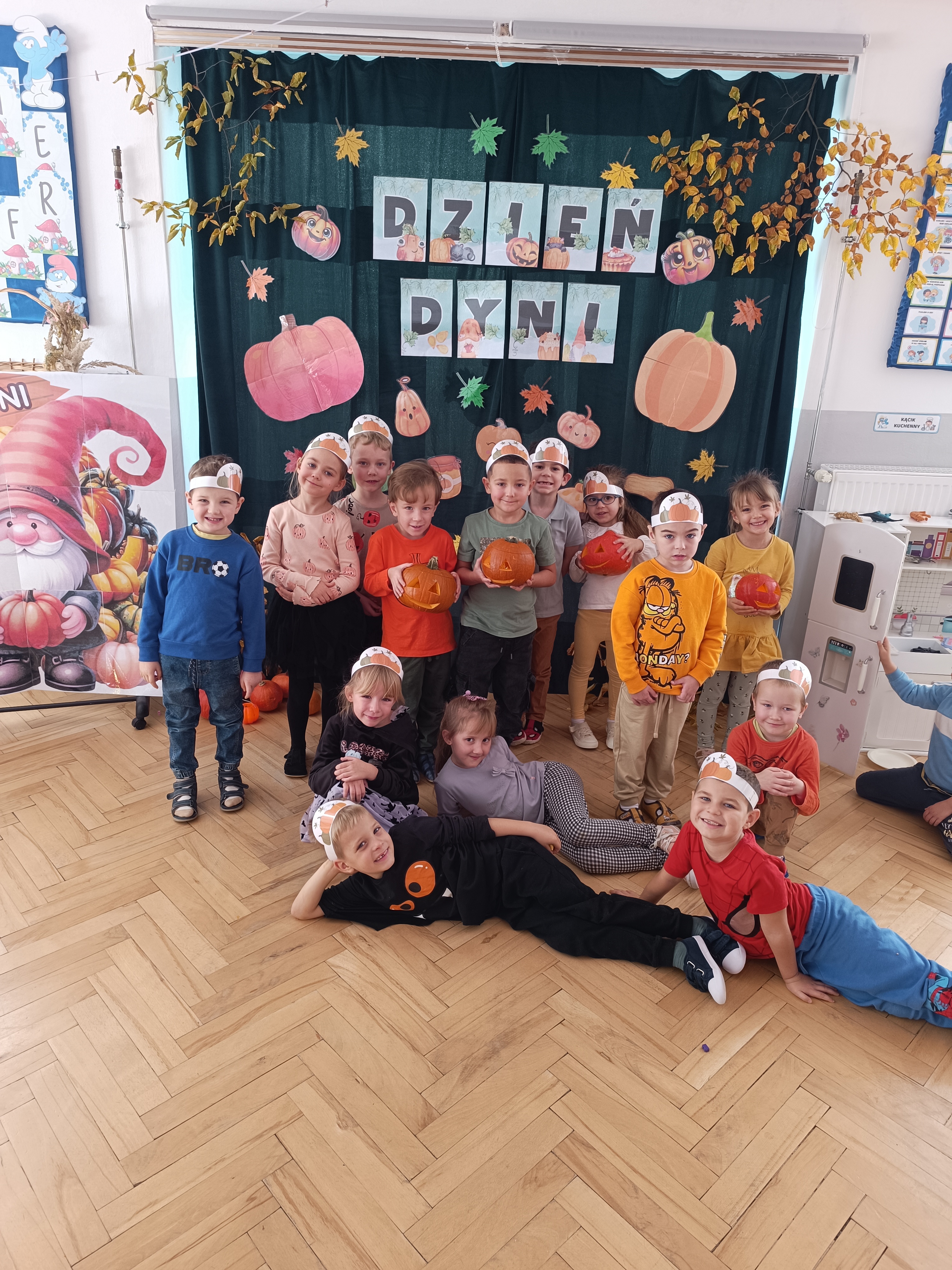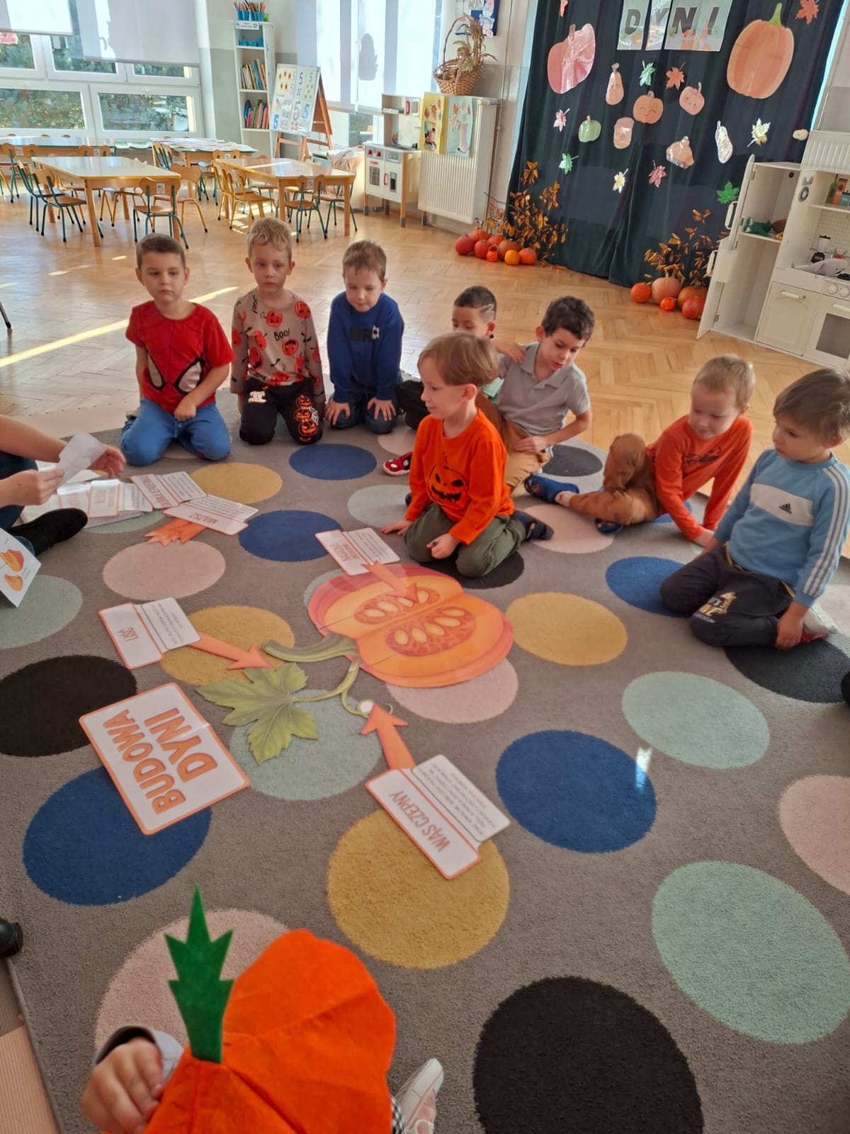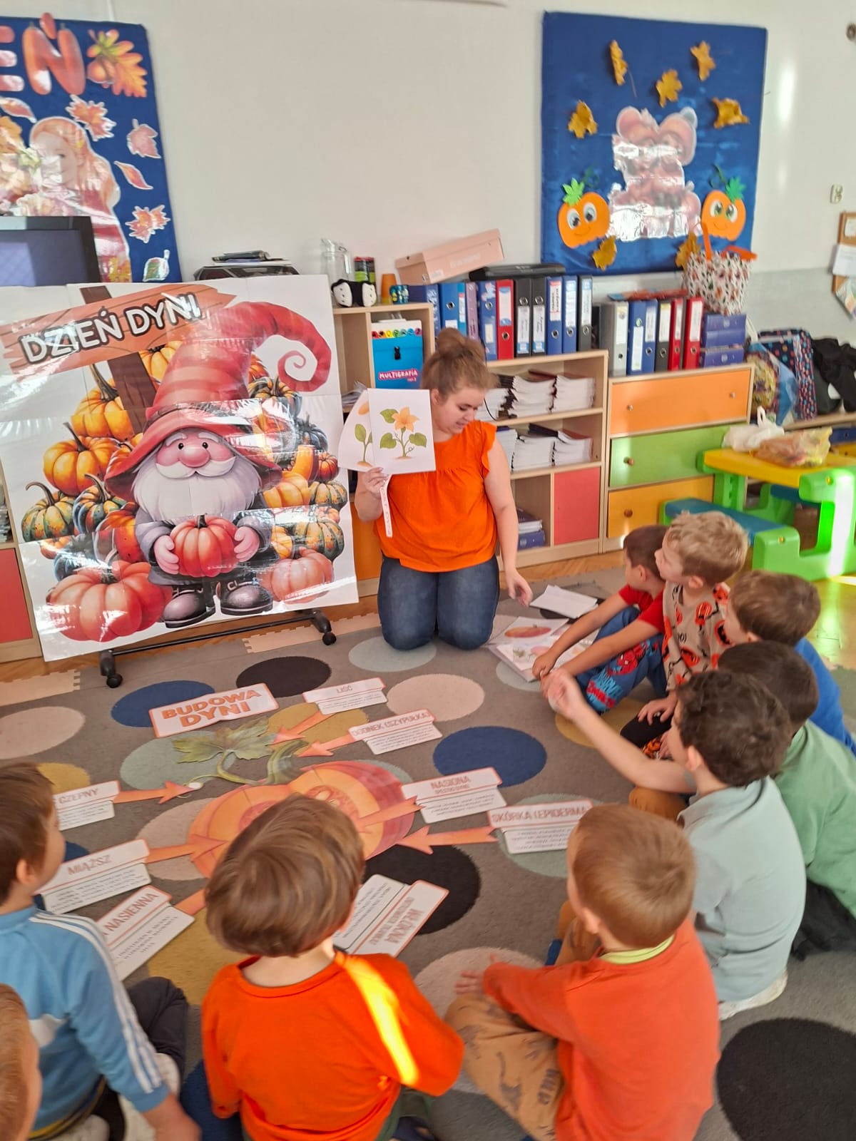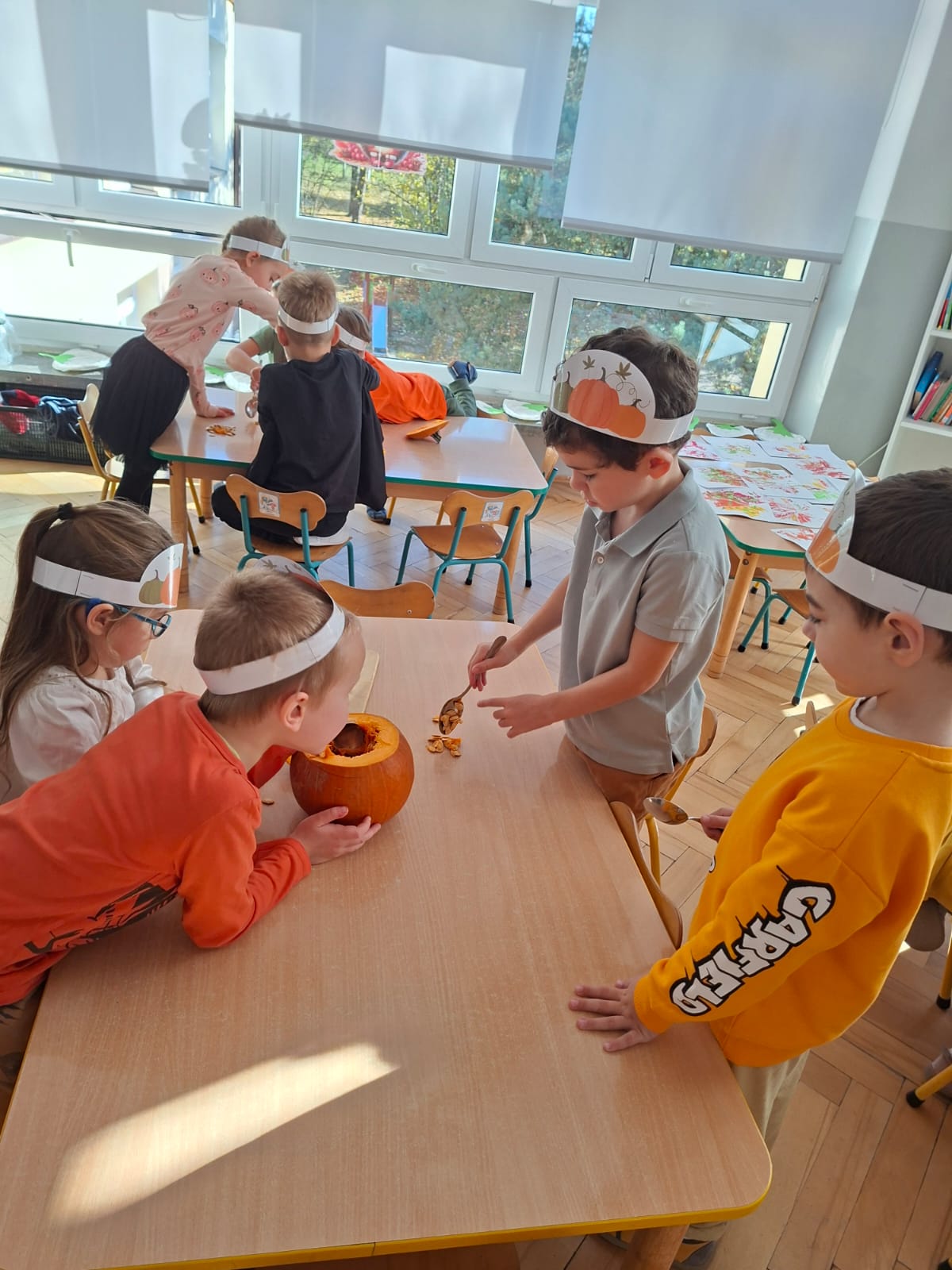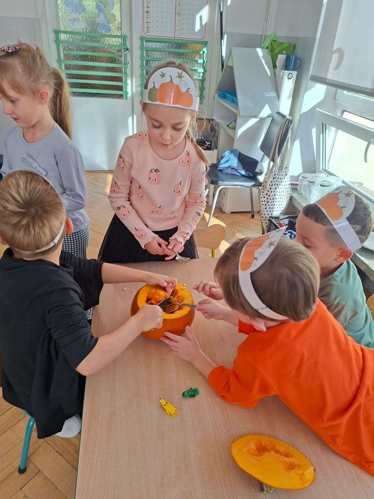Dzieci w ten dzień przyszły ubrane w dyniowe kolory, przyniosły ze sobą dynie, z których wspólnie robiliśmy lampiony dyniowe, wytłaczając ich środek i poznając przy tym dynie od środka.