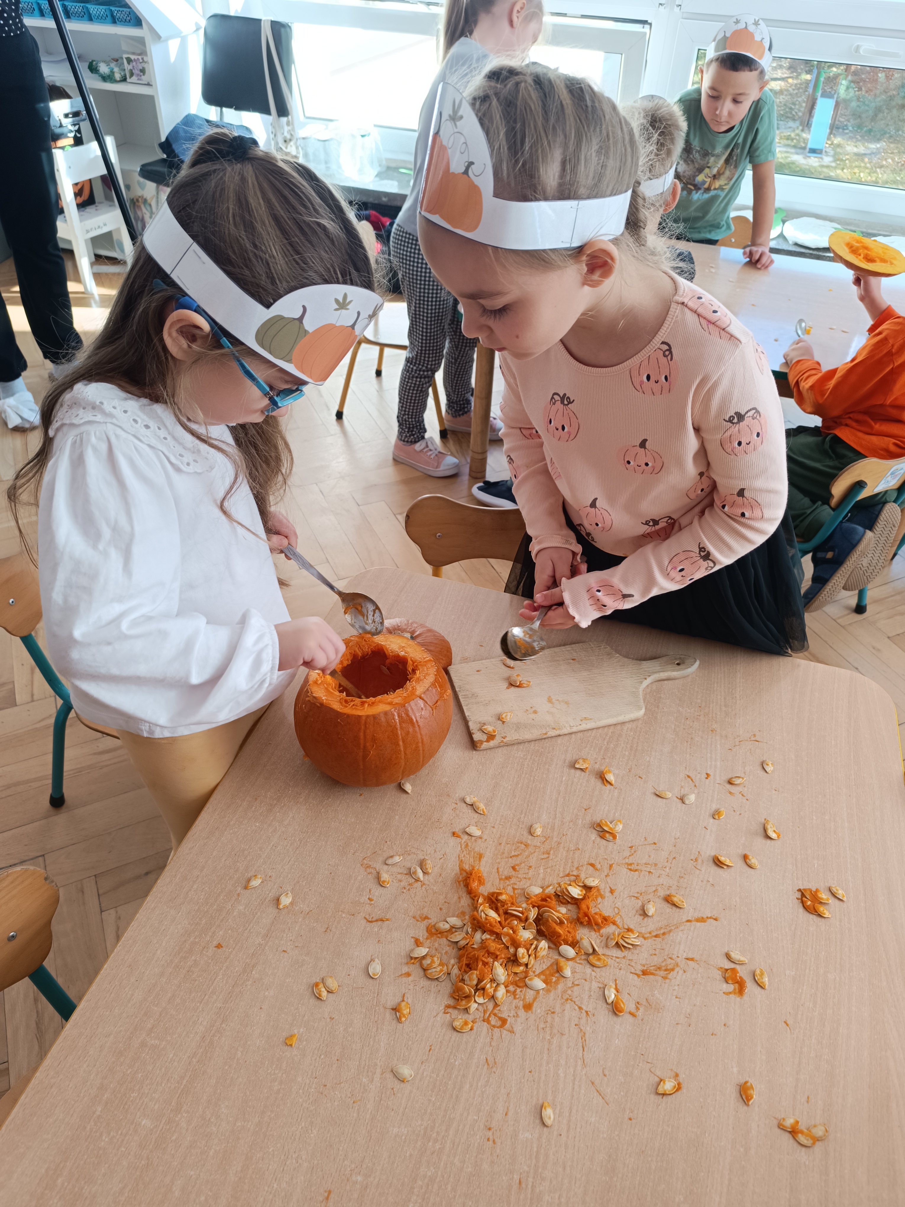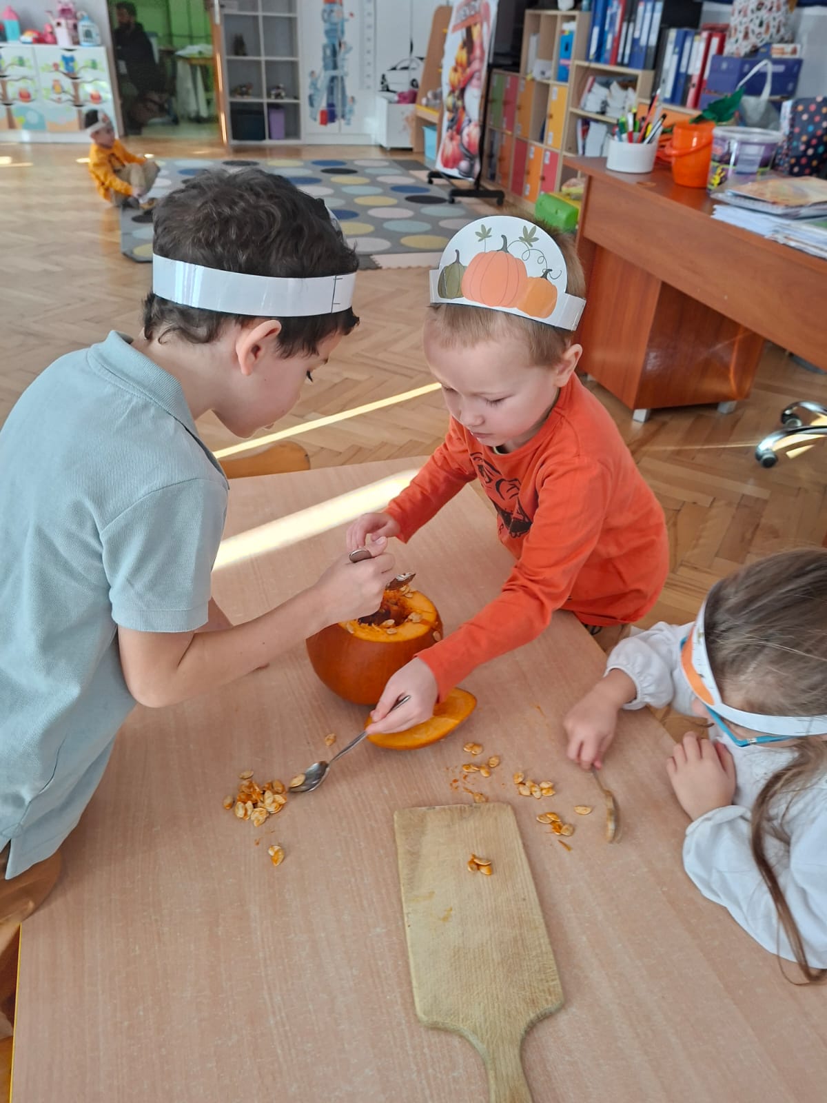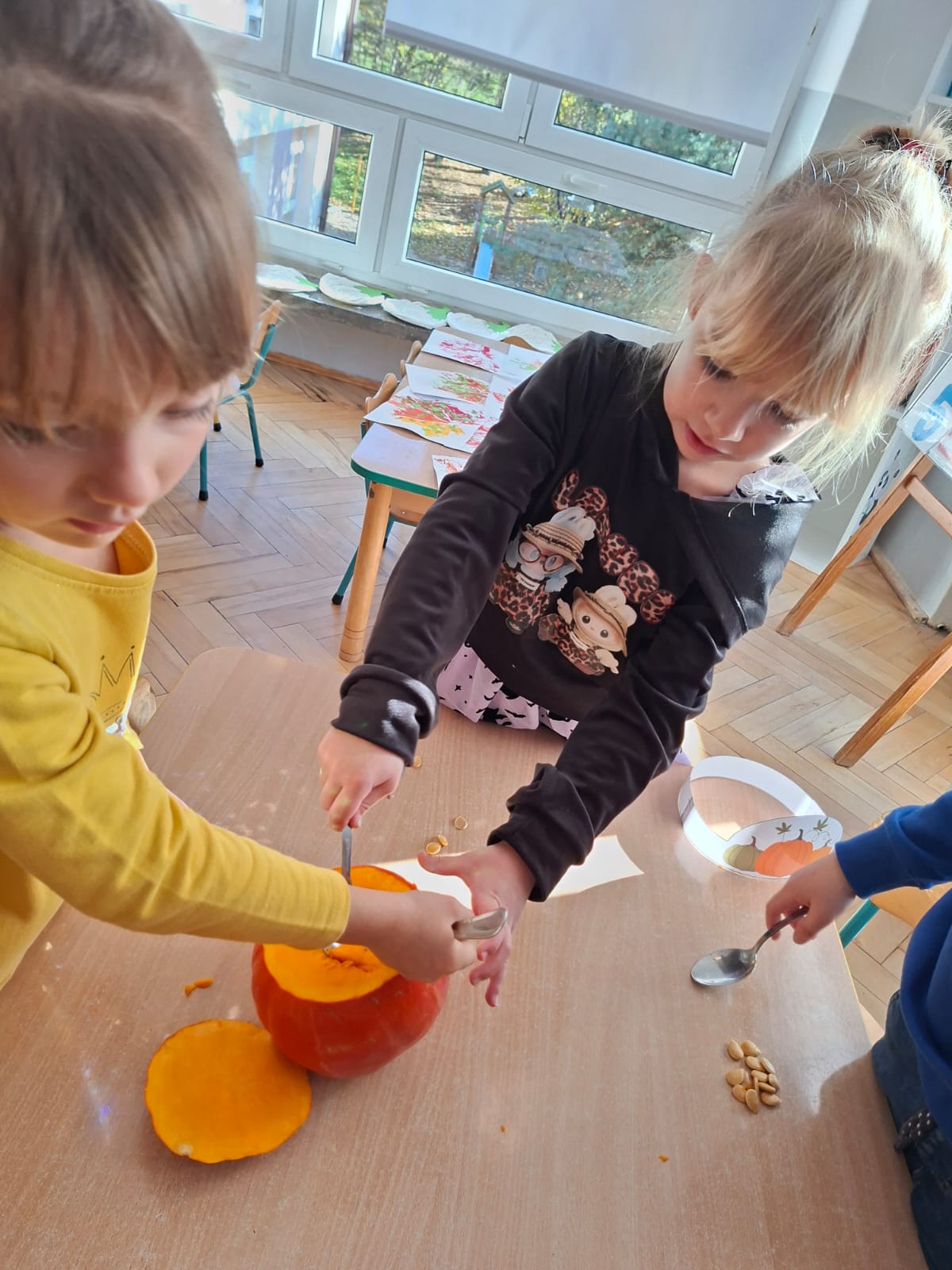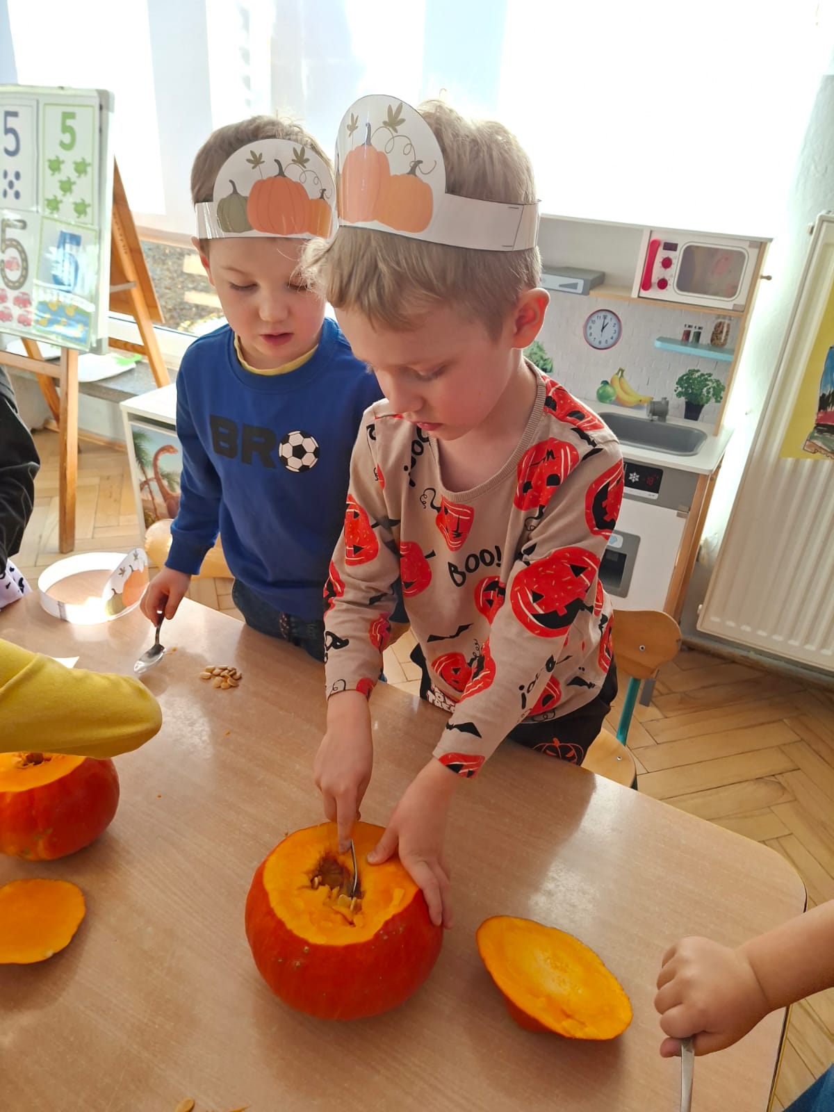 Dzieci w ten dzień przyszły ubrane w dyniowe kolory, przyniosły ze sobą dynie, z których wspólnie robiliśmy lampiony dyniowe, wytłaczając ich środek i poznając przy tym dynie od środka.