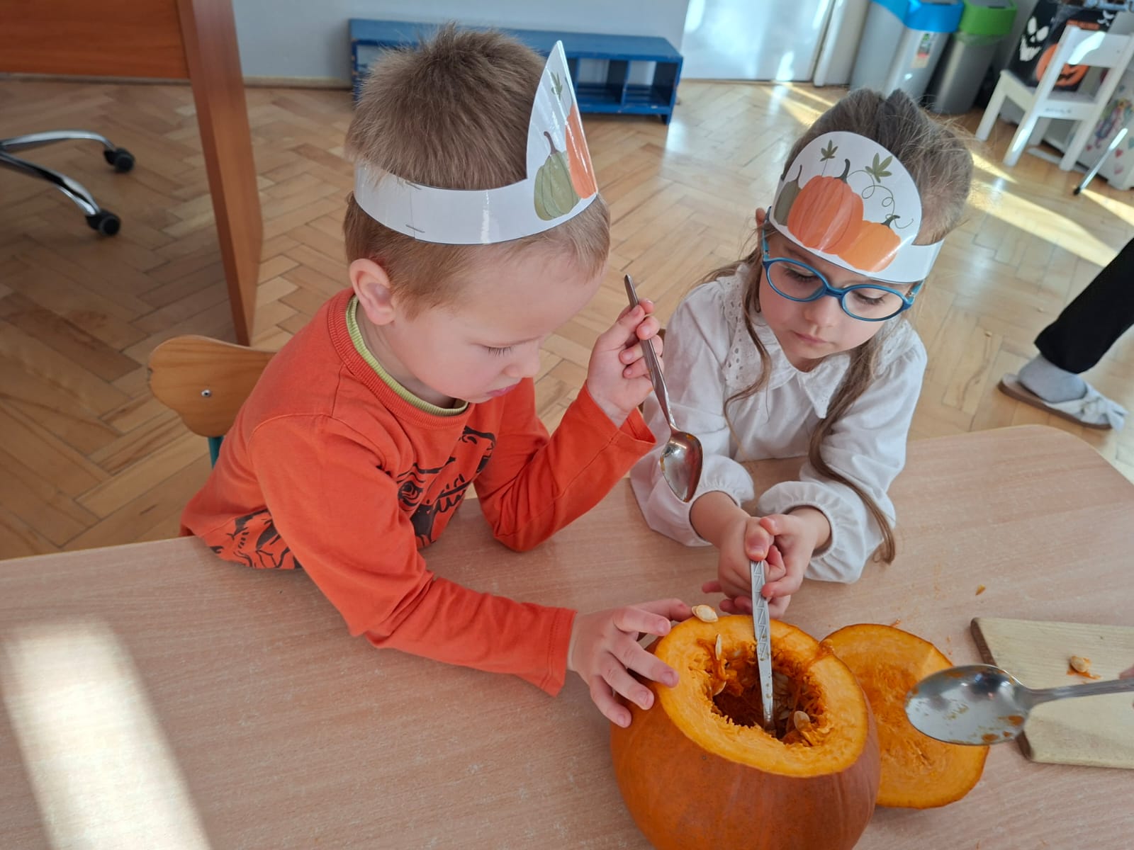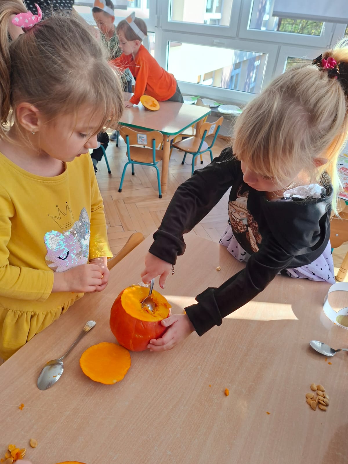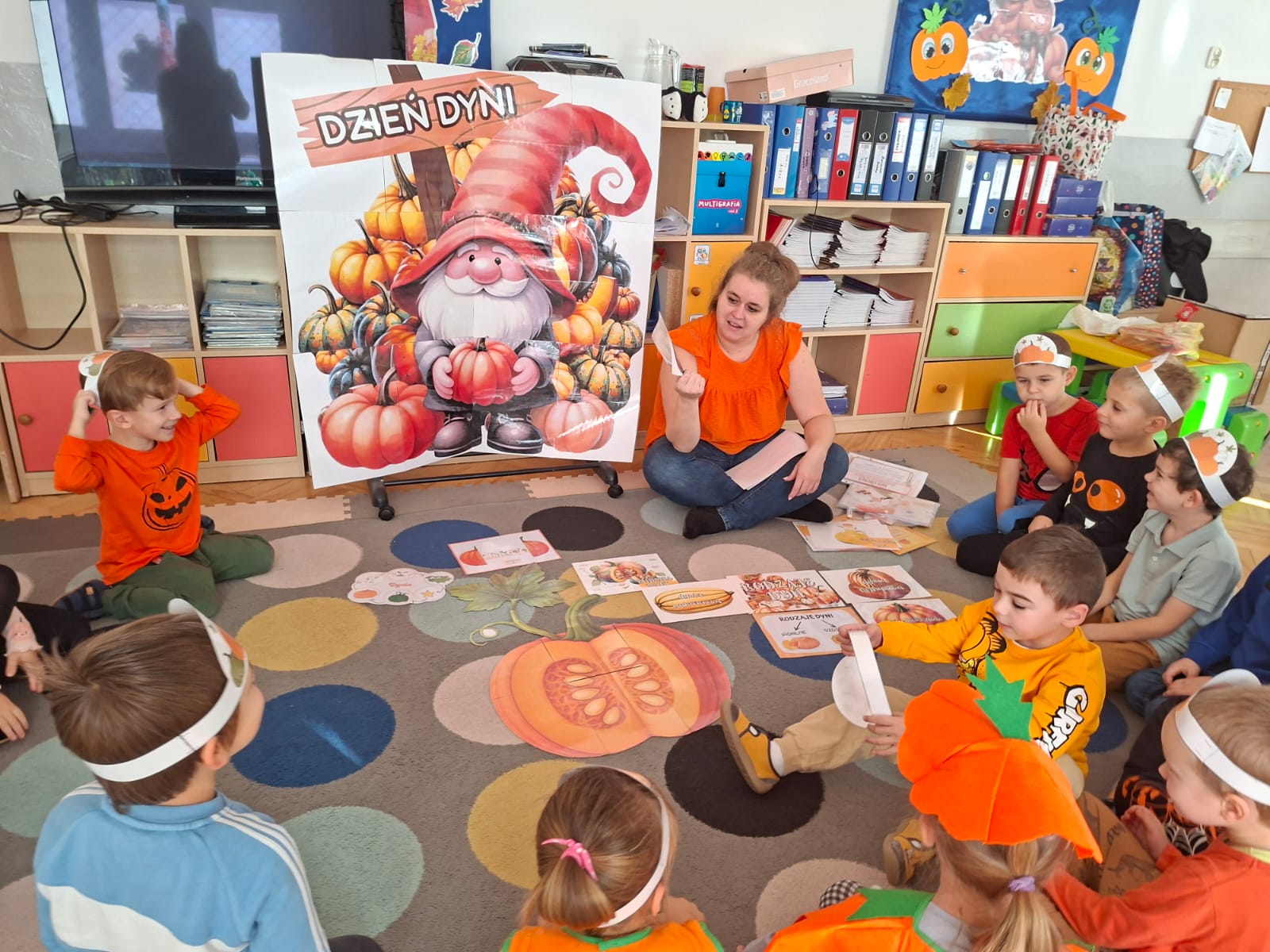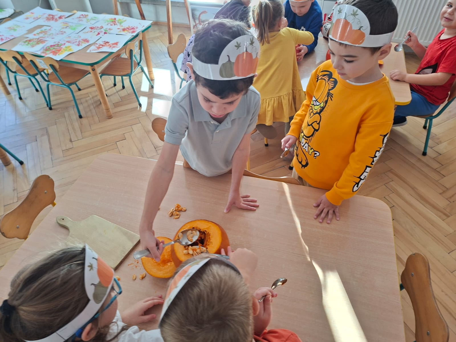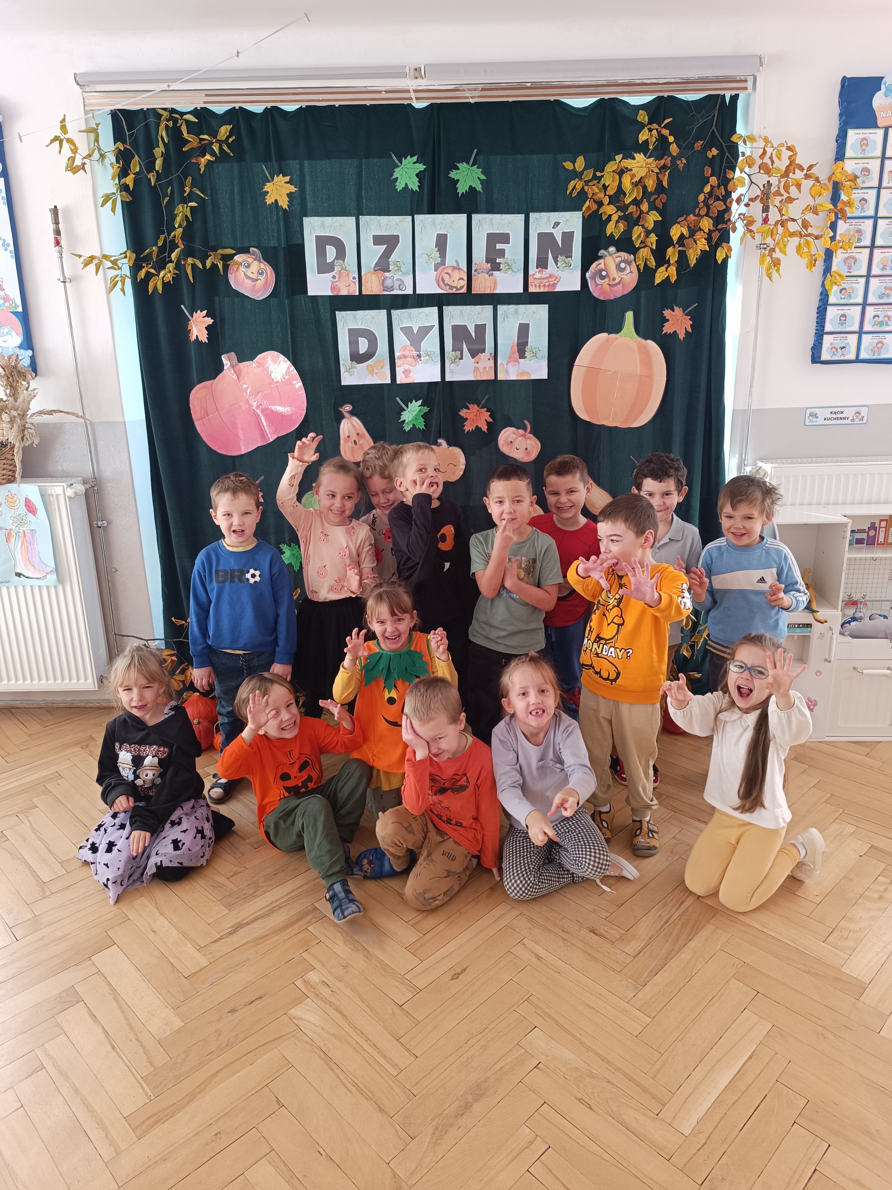 Dzieci w ten dzień przyszły ubrane w dyniowe kolory, przyniosły ze sobą dynie, z których wspólnie robiliśmy lampiony dyniowe, wytłaczając ich środek i poznając przy tym dynie od środka.
