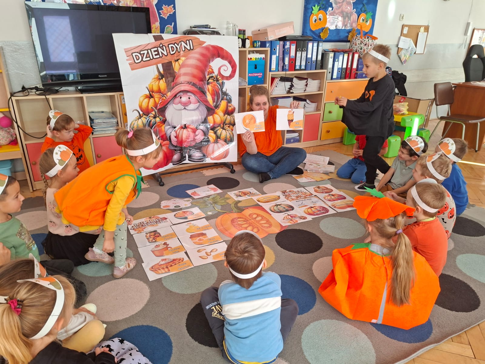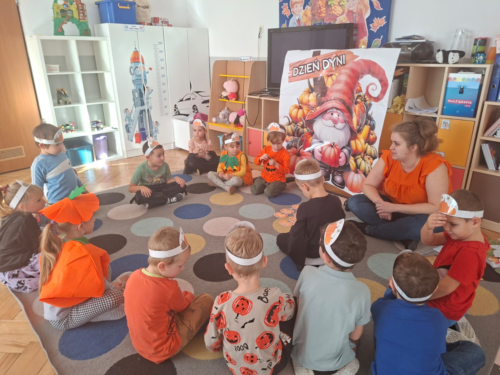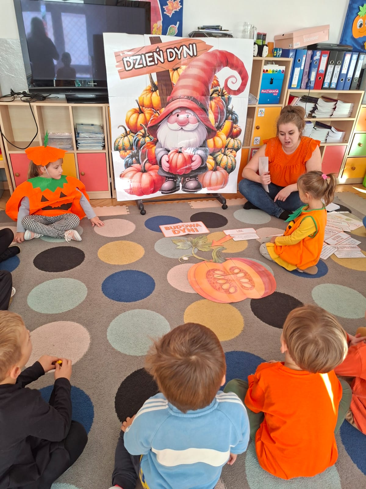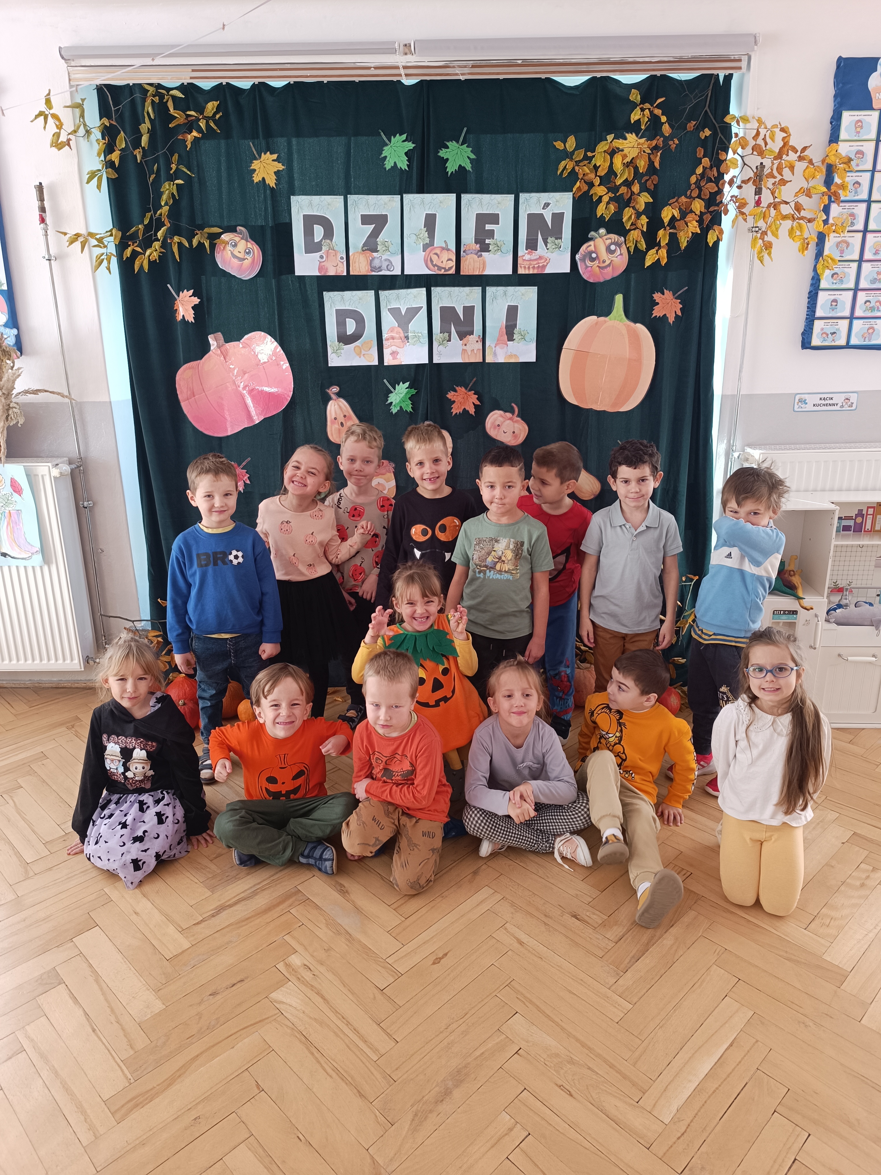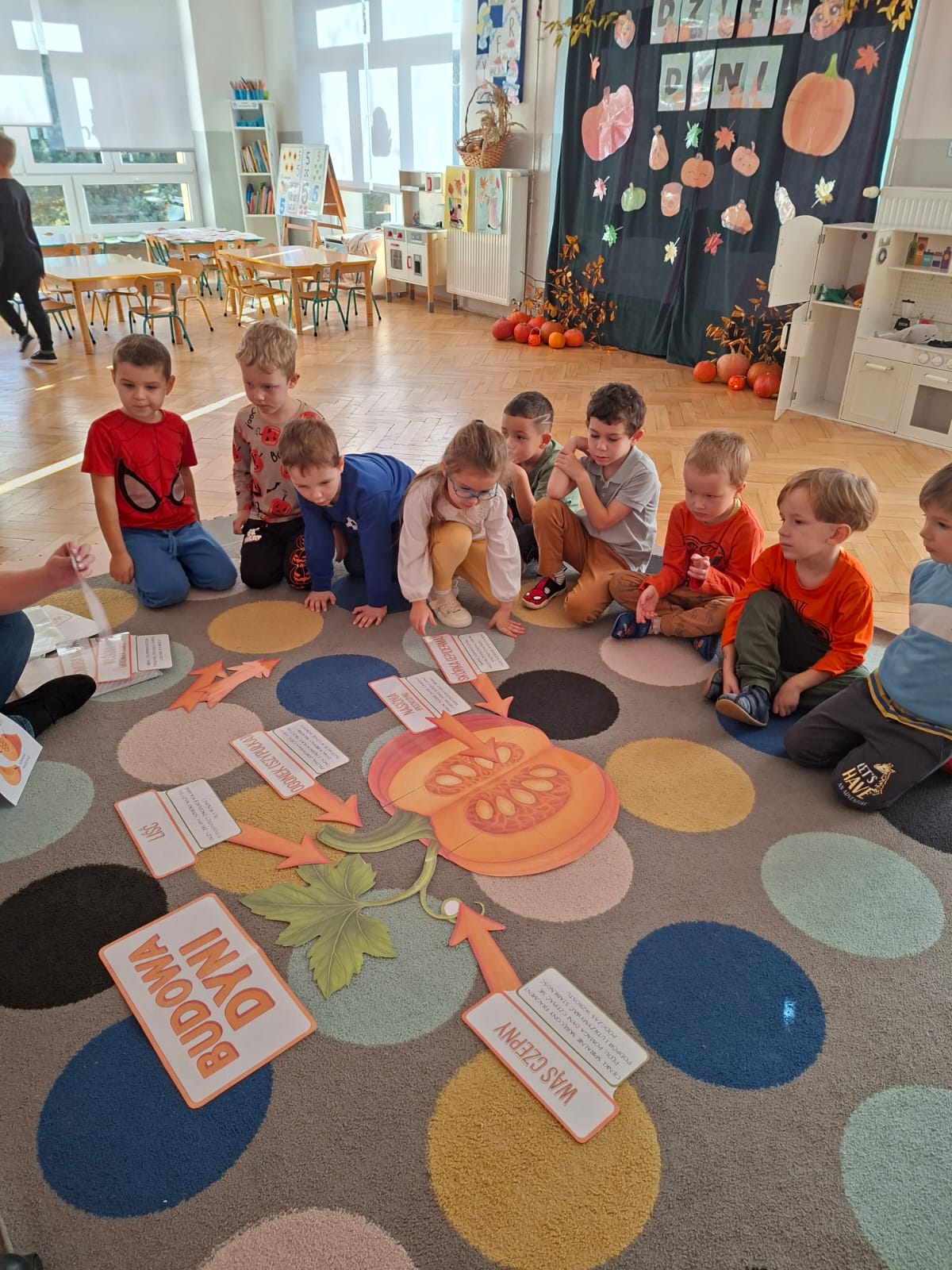 Dzieci w ten dzień przyszły ubrane w dyniowe kolory, przyniosły ze sobą dynie, z których wspólnie robiliśmy lampiony dyniowe, wytłaczając ich środek i poznając przy tym dynie od środka.