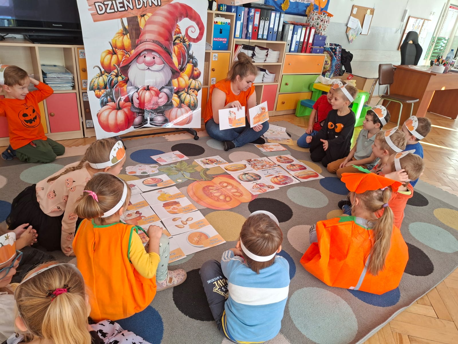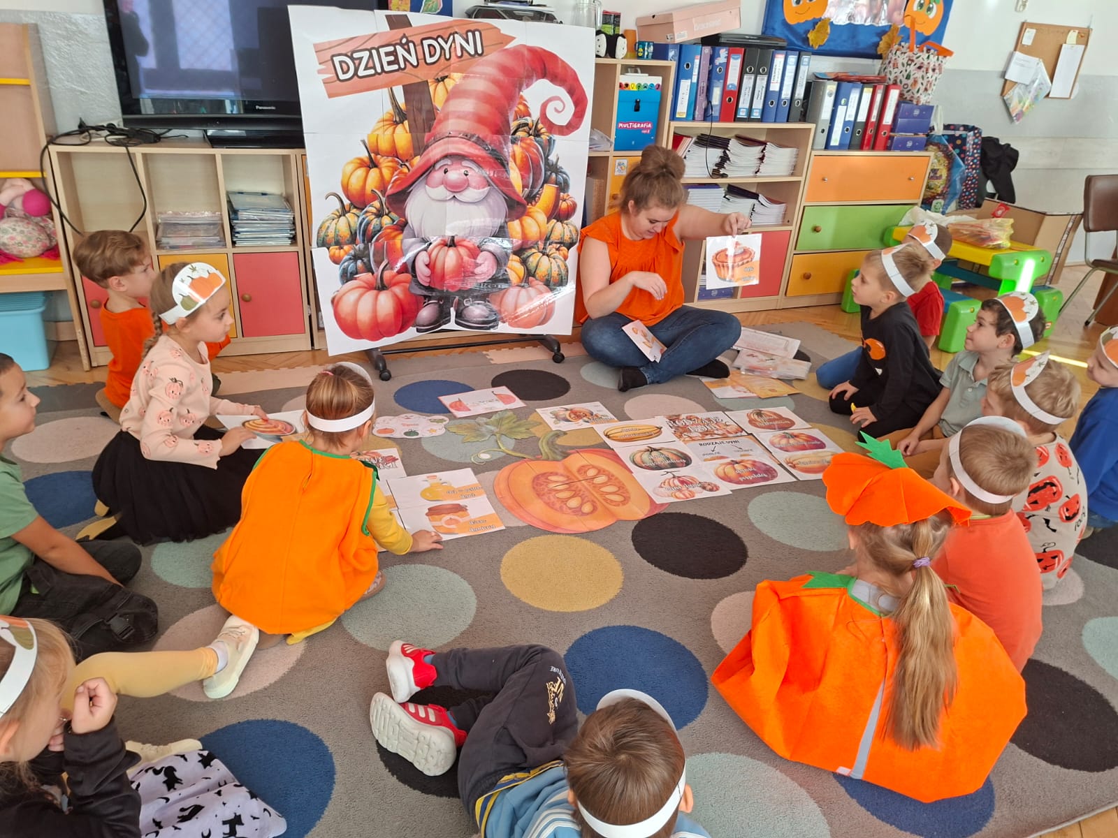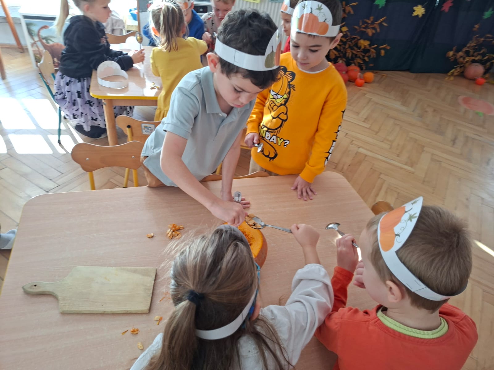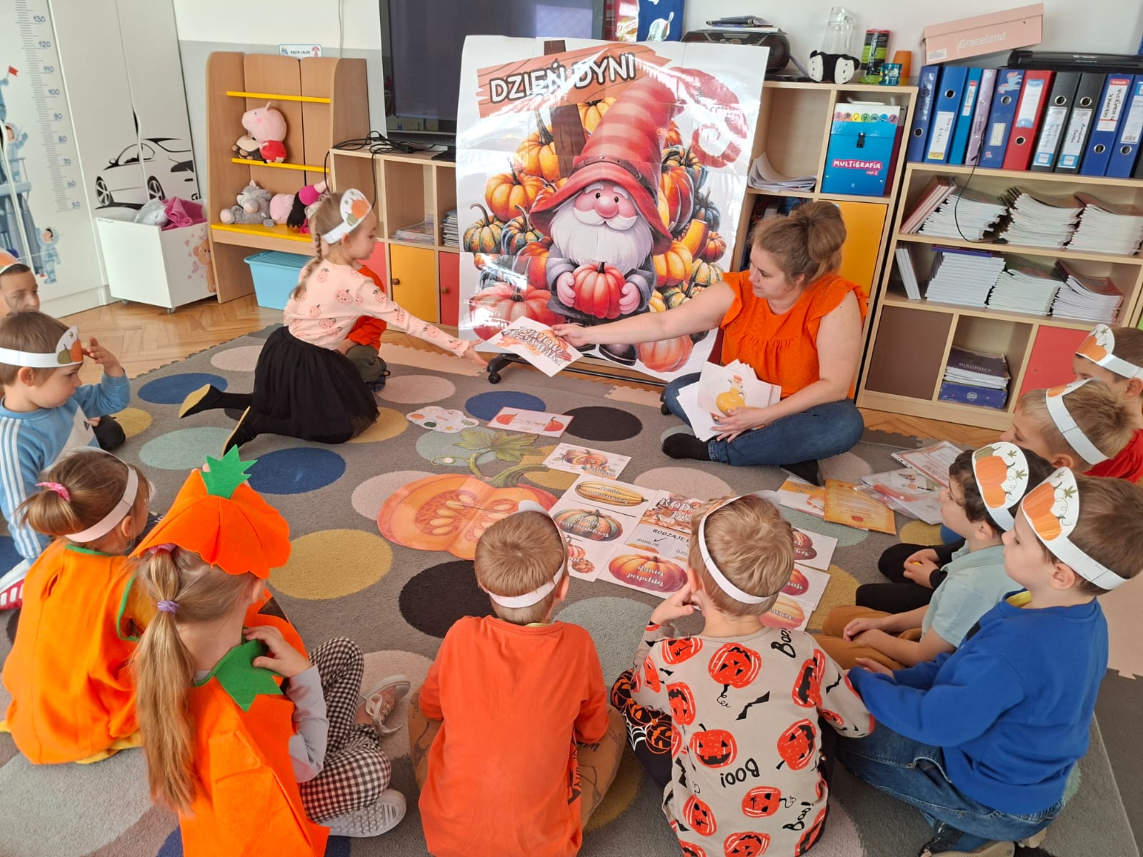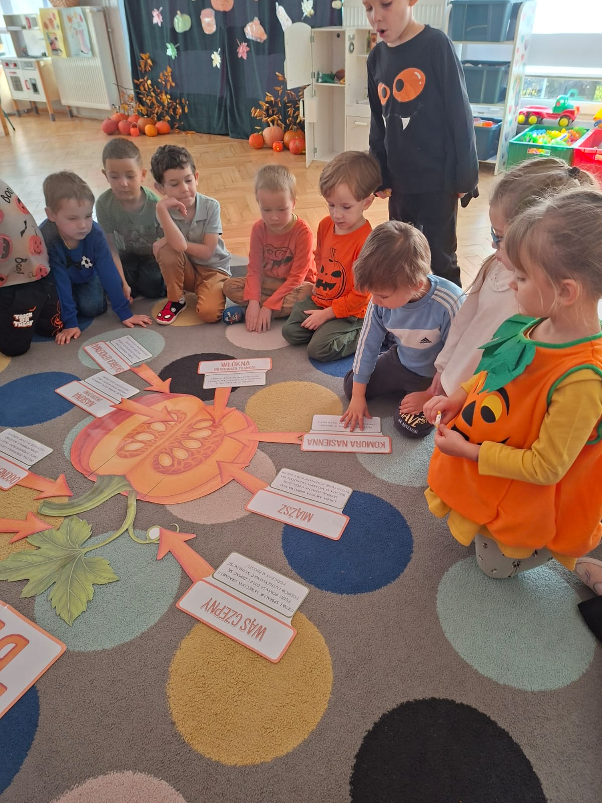 Dzieci w ten dzień przyszły ubrane w dyniowe kolory, przyniosły ze sobą dynie, z których wspólnie robiliśmy lampiony dyniowe, wytłaczając ich środek i poznając przy tym dynie od środka.
