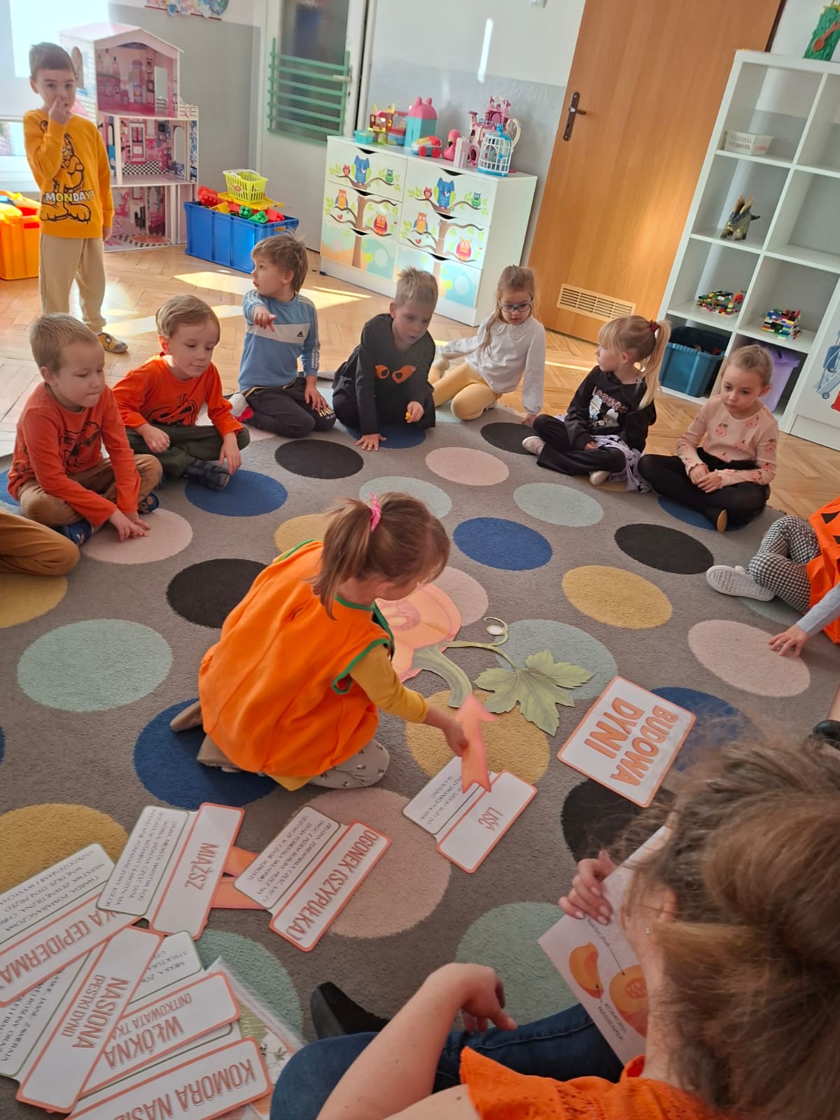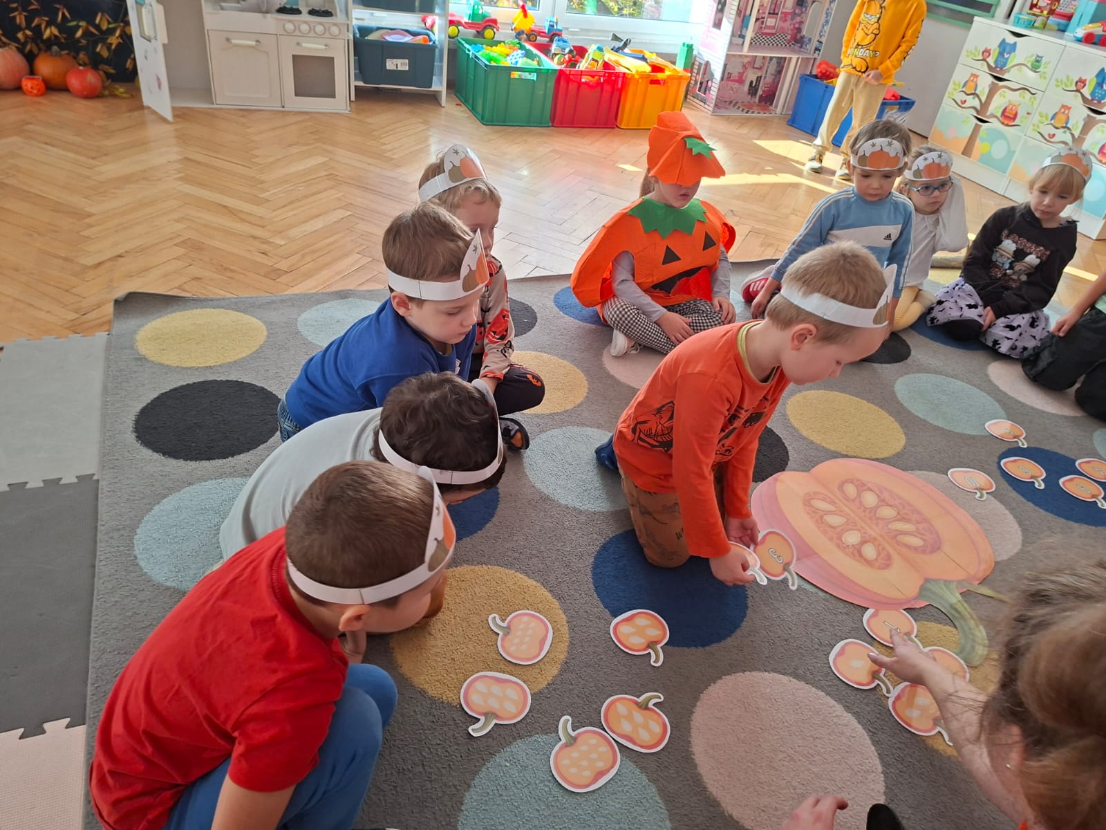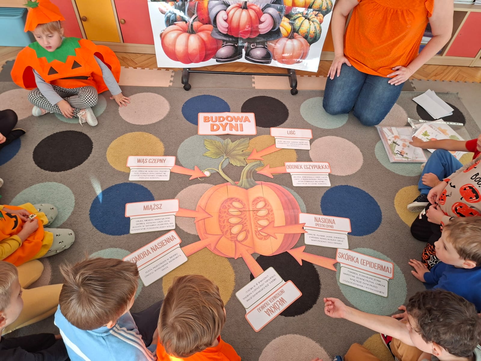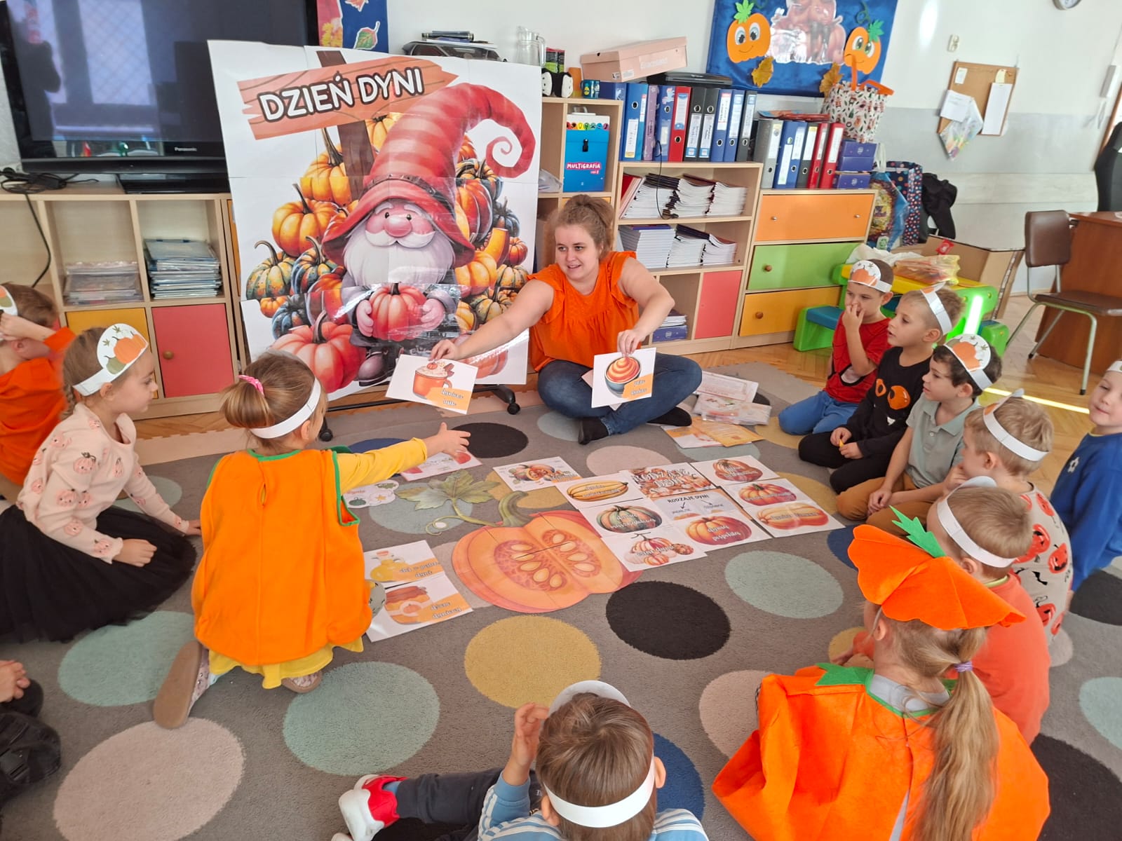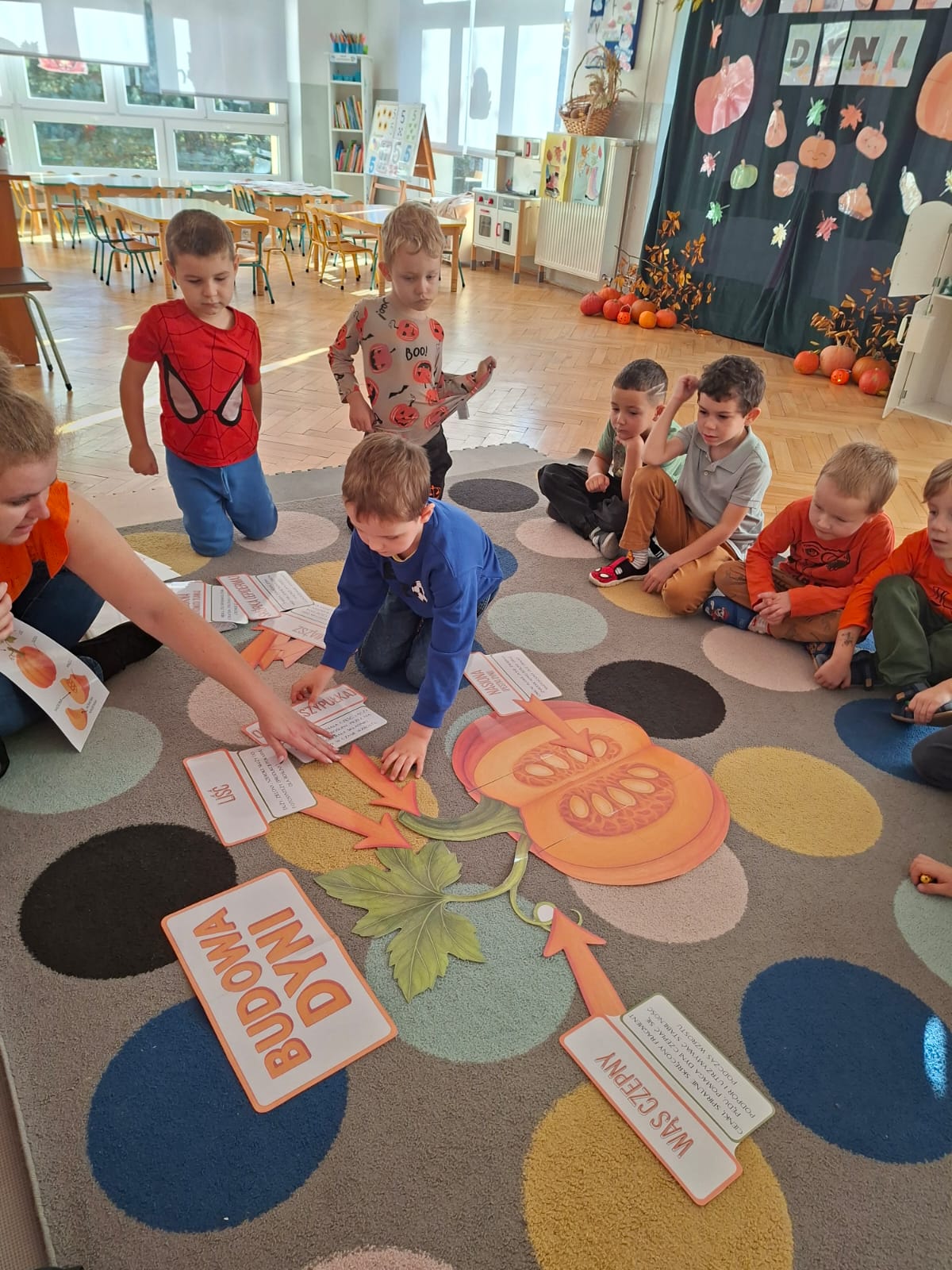 Dzieci w ten dzień przyszły ubrane w dyniowe kolory, przyniosły ze sobą dynie, z których wspólnie robiliśmy lampiony dyniowe, wytłaczając ich środek i poznając przy tym dynie od środka.