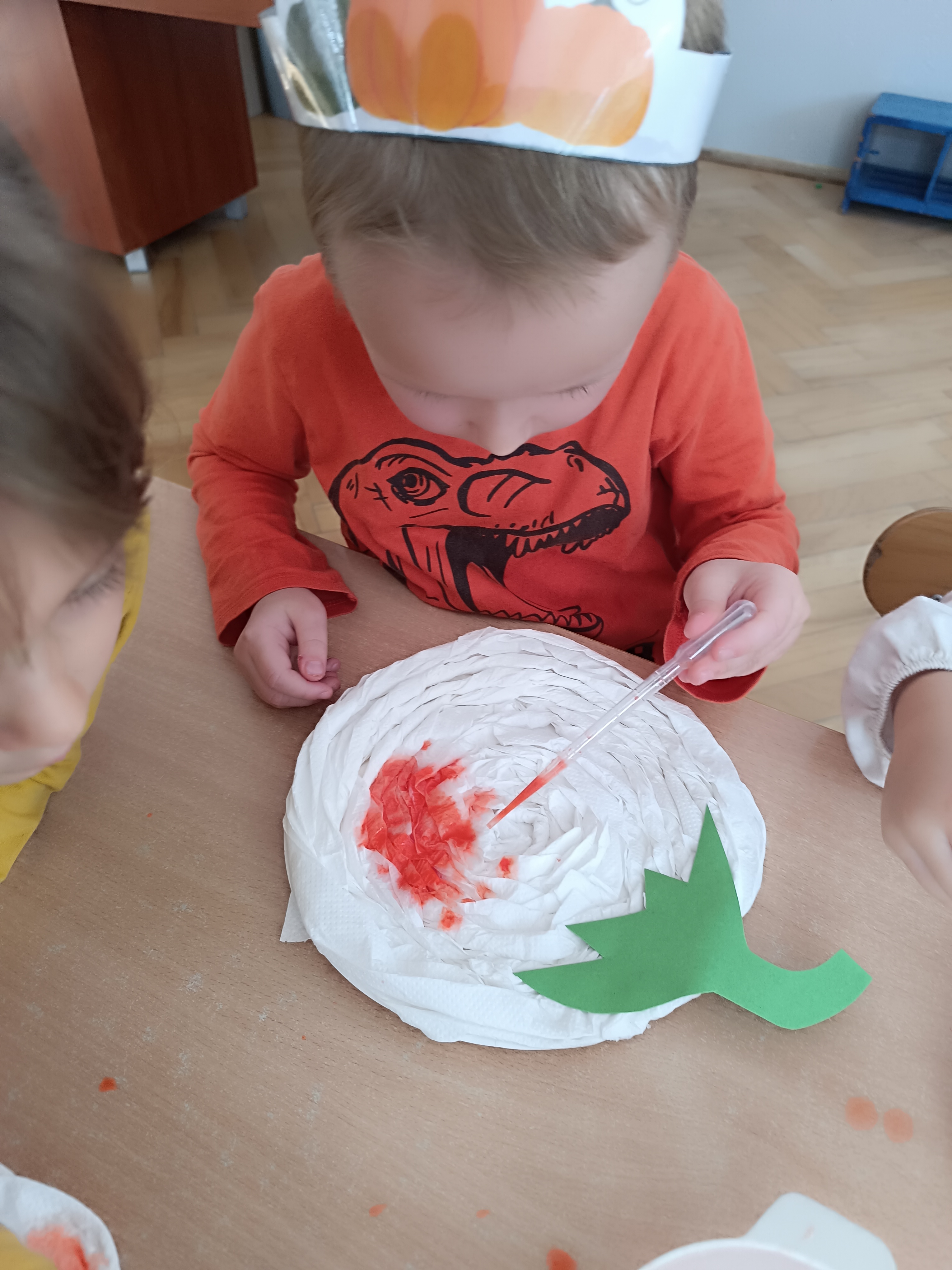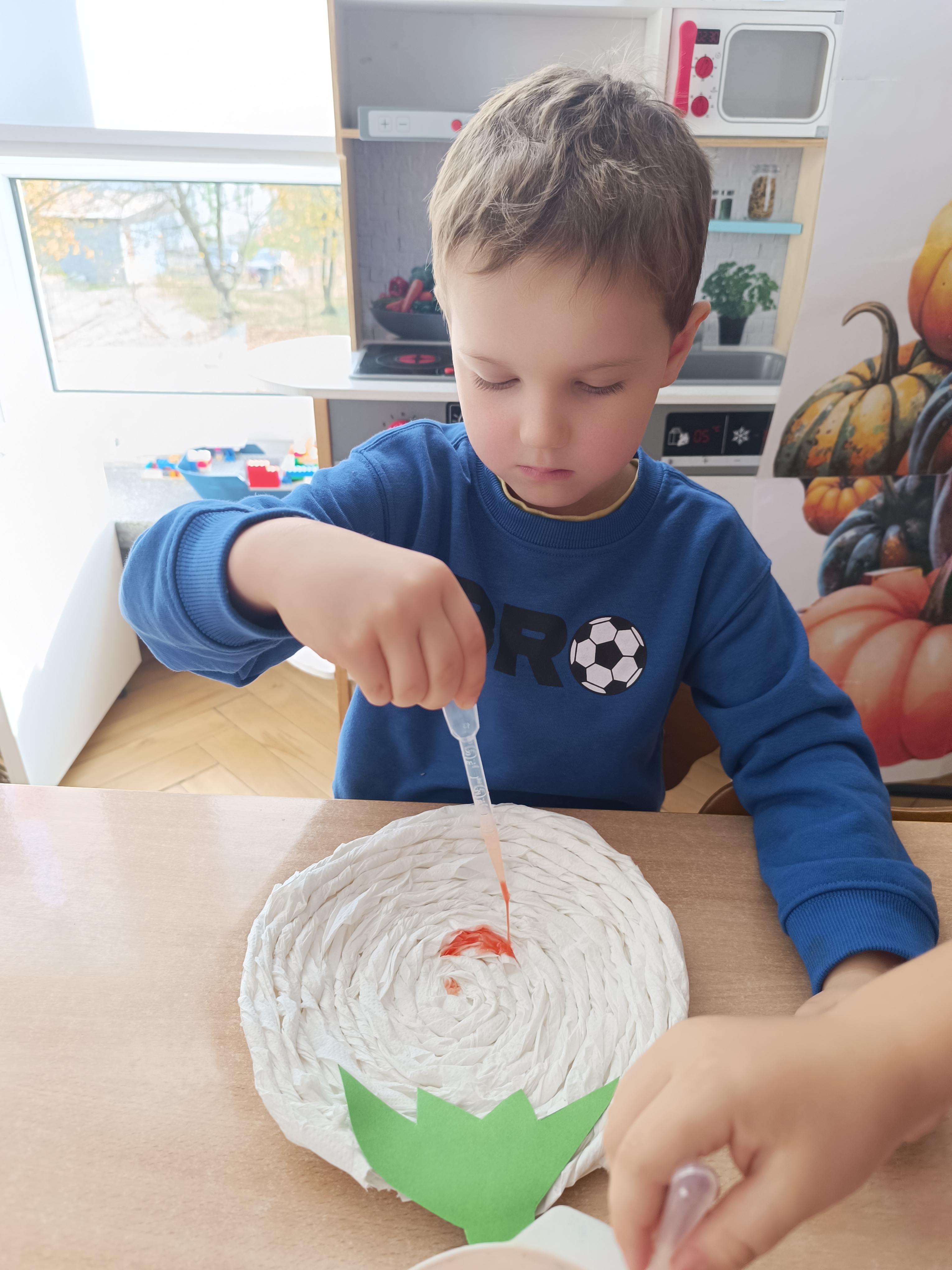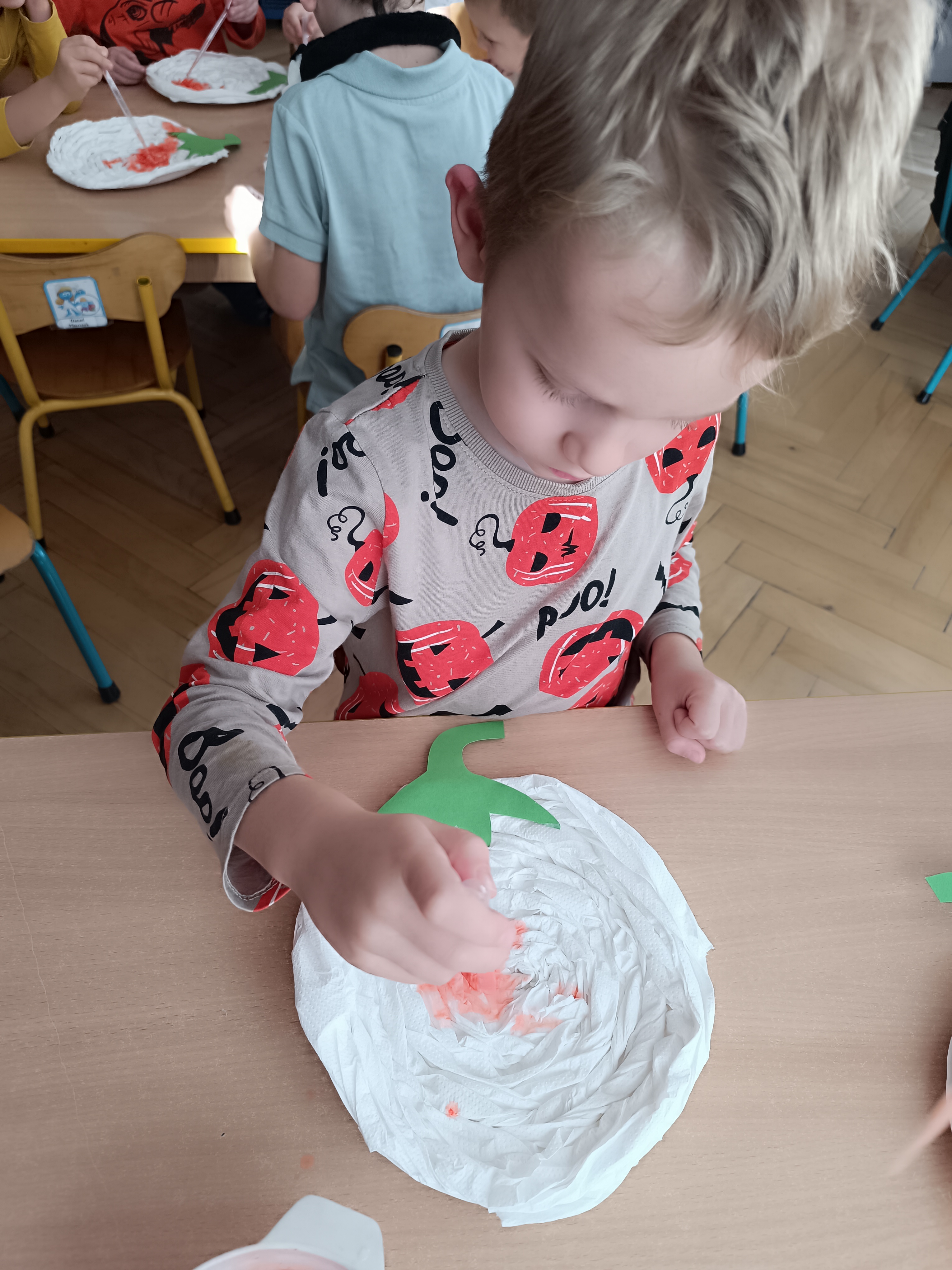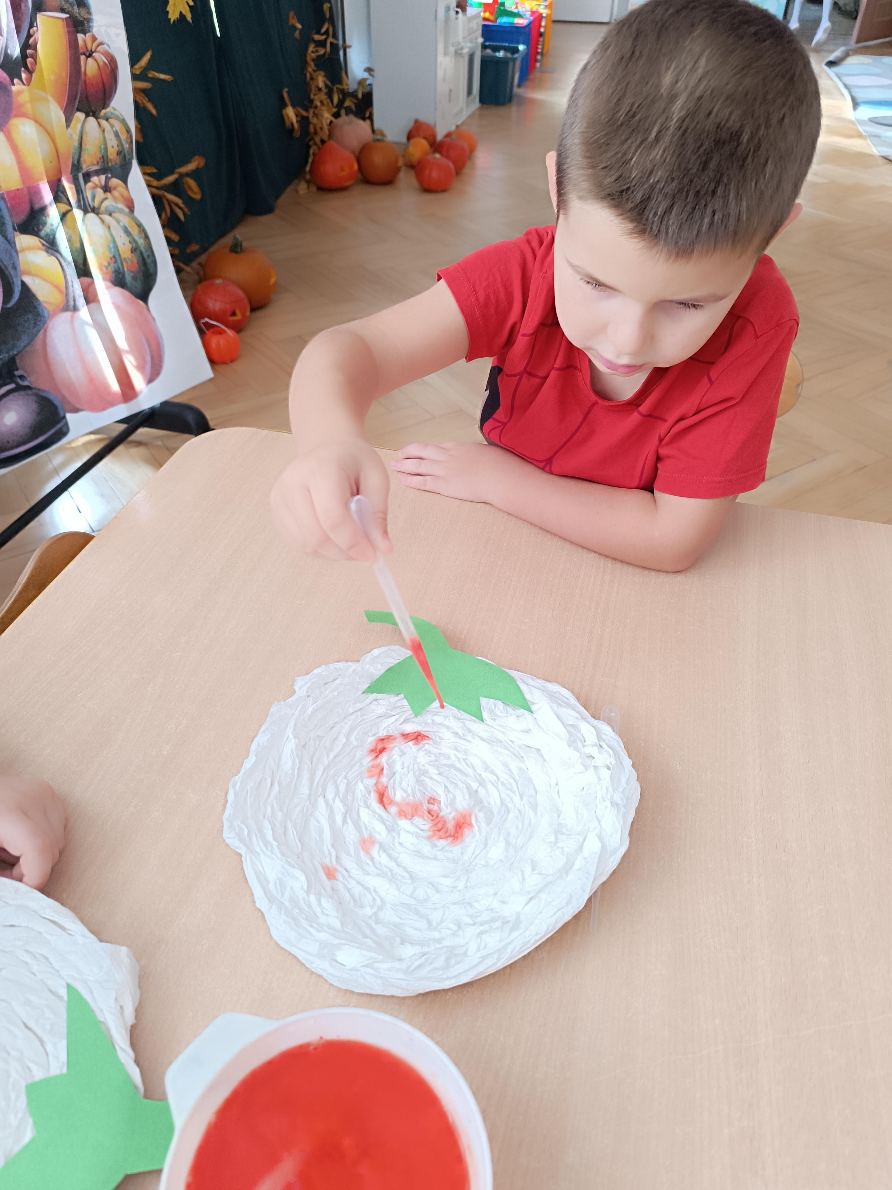 Na sam koniec zajęć zrobiliśmy piękna pracę plastyczną, dynię malowaną pipetami.