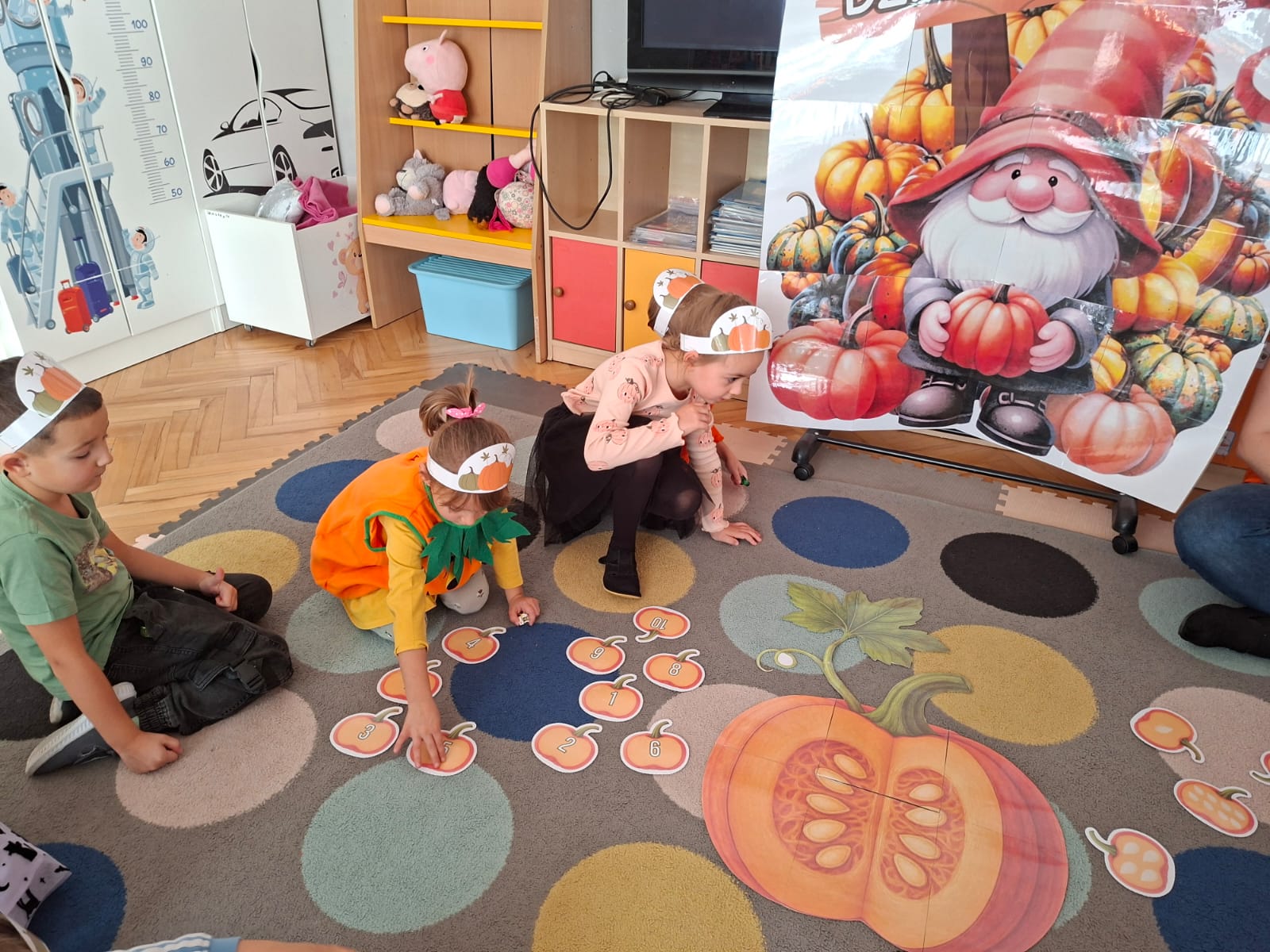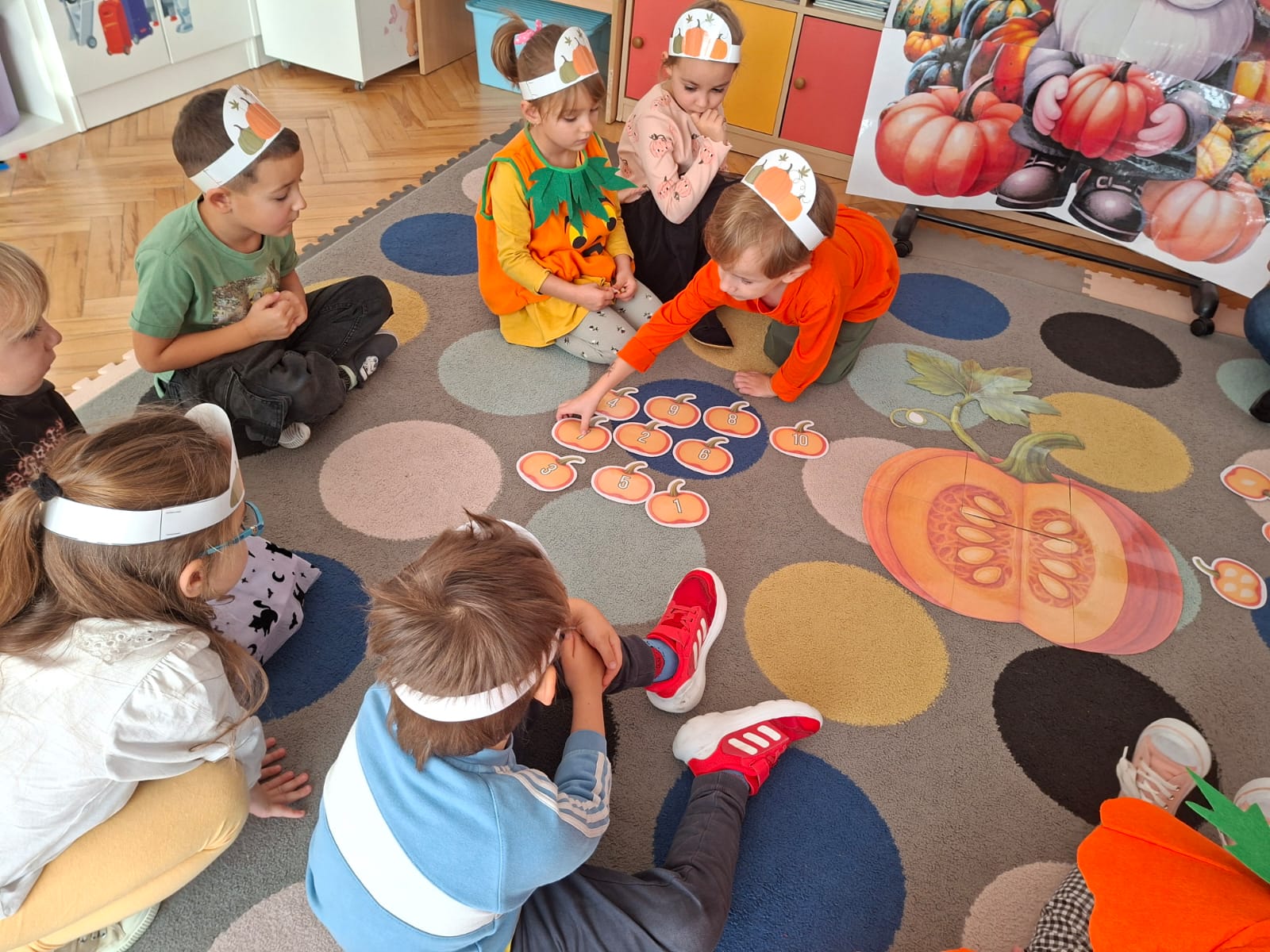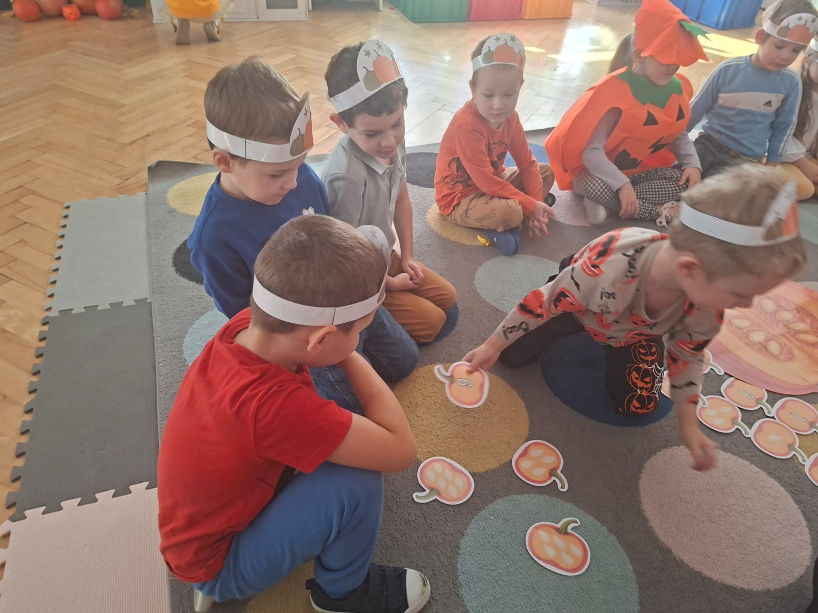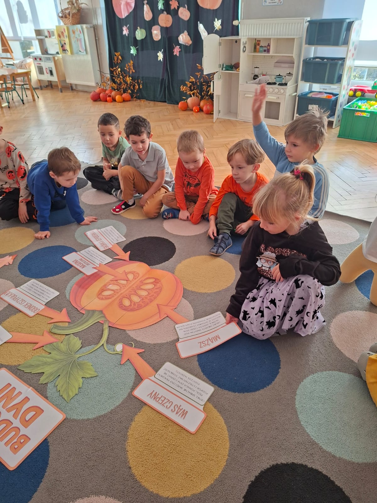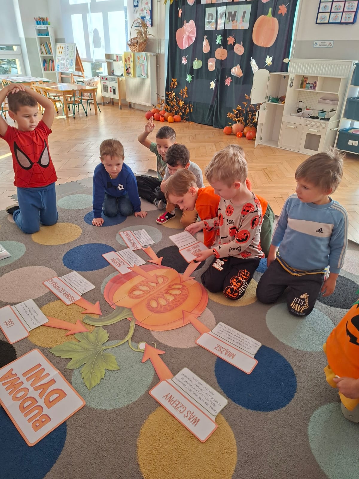 Rozmawialiśmy na temat budowy dyni, rodzajach dyni, co możemy z dyni pysznego zrobić, a przy tym bardzo zdrowego. Przeliczaliśmy pestki dyni dobierając odpowiednią cyfrę. Układaliśmy puzzle dyniowe i graliśmy w memory dyniowe.