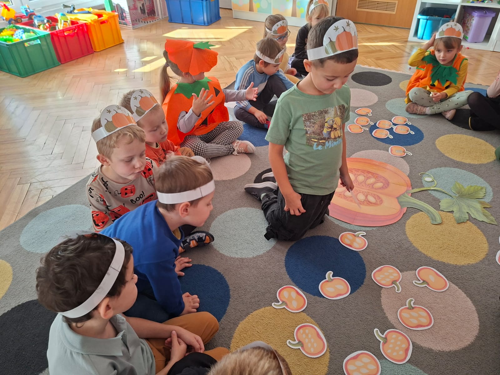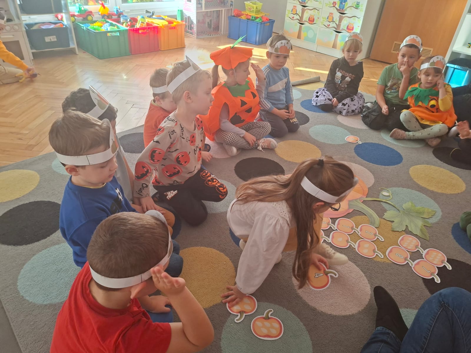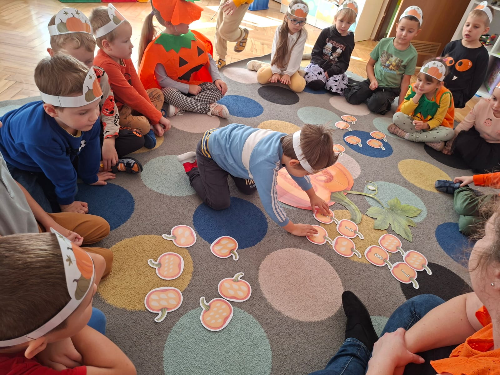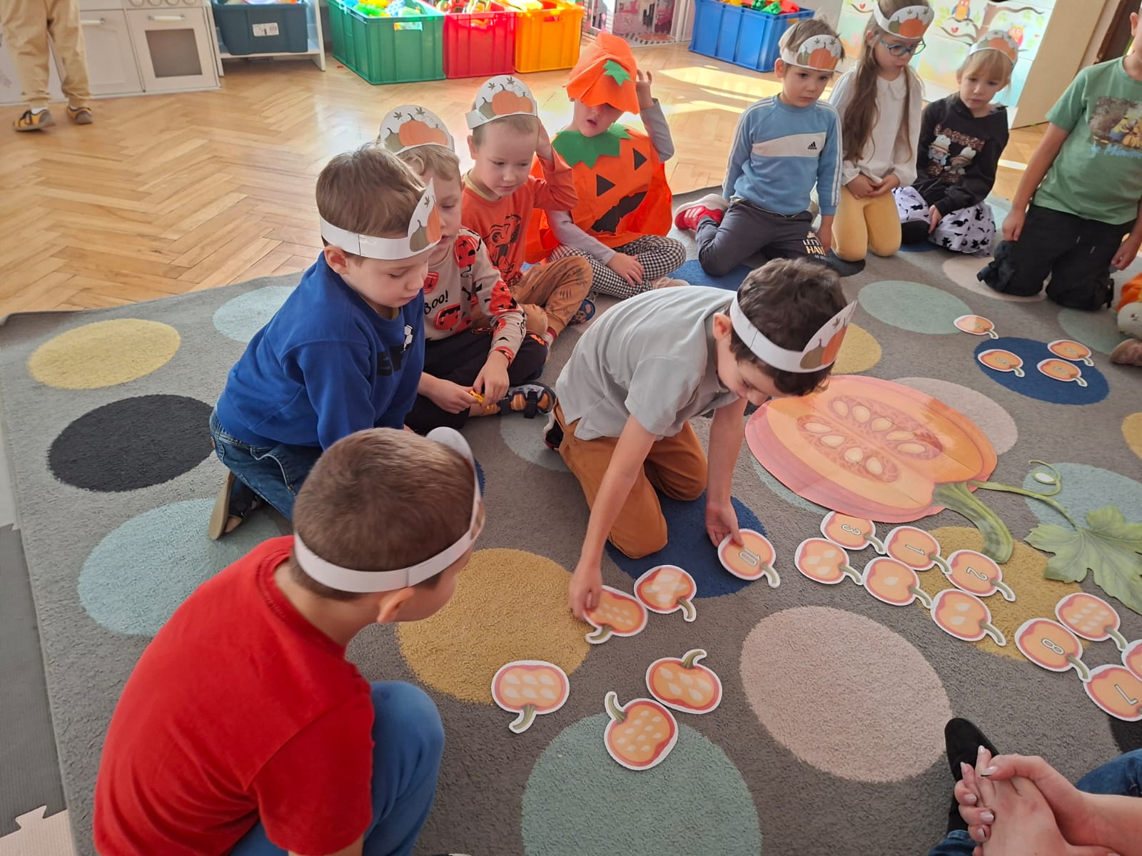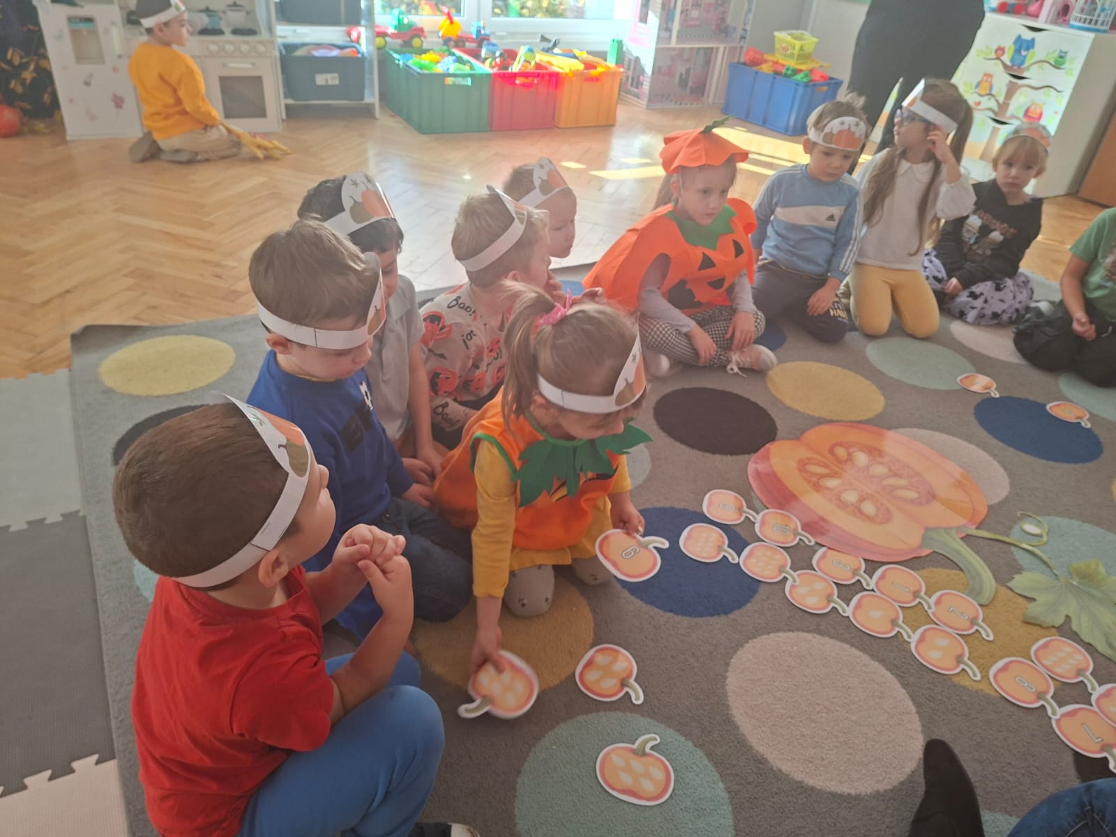 Rozmawialiśmy na temat budowy dyni, rodzajach dyni, co możemy z dyni pysznego zrobić, a przy tym bardzo zdrowego. Przeliczaliśmy pestki dyni dobierając odpowiednią cyfrę. Układaliśmy puzzle dyniowe i graliśmy w memory dyniowe.