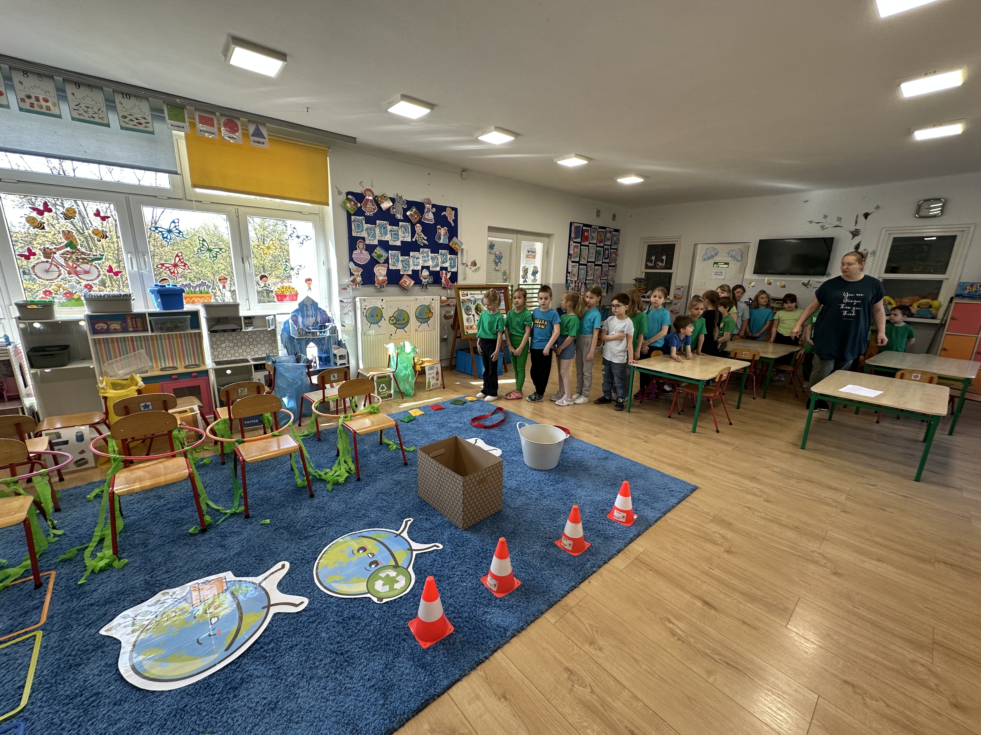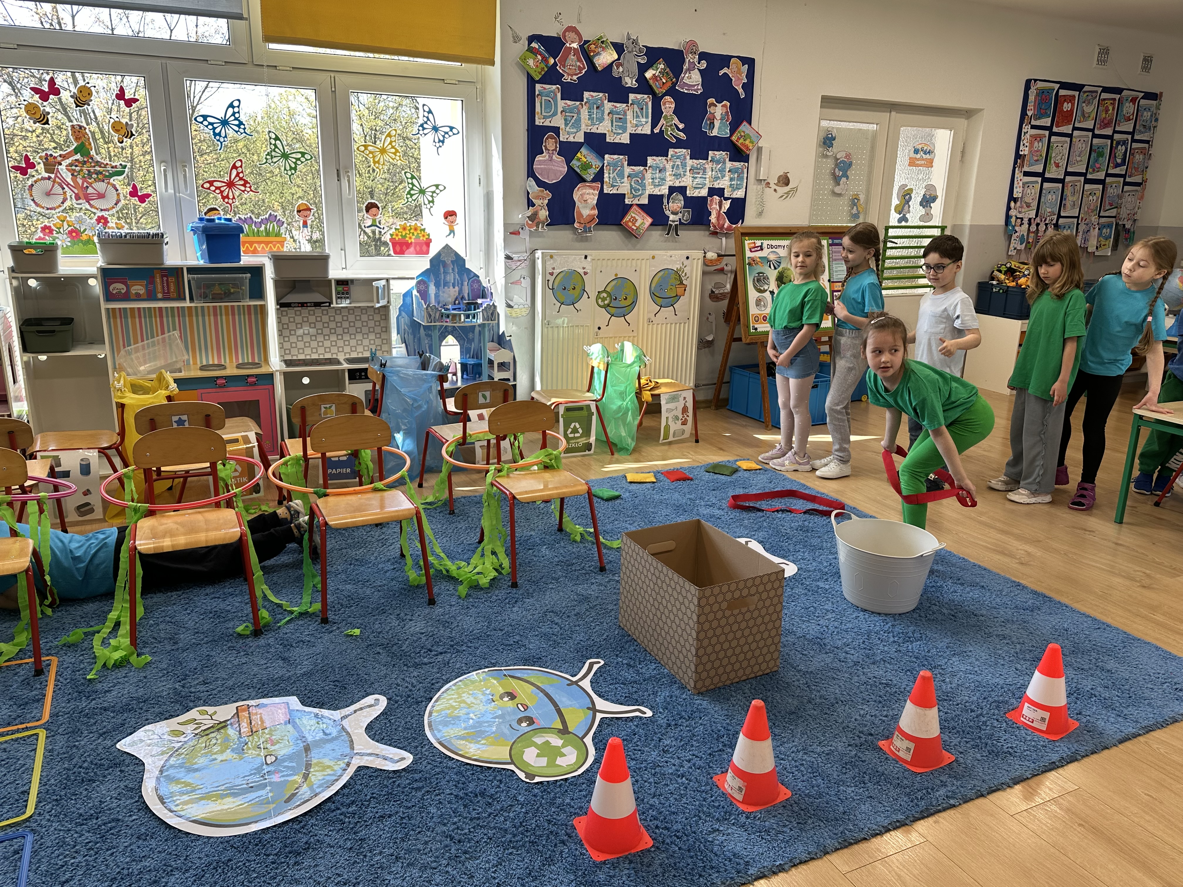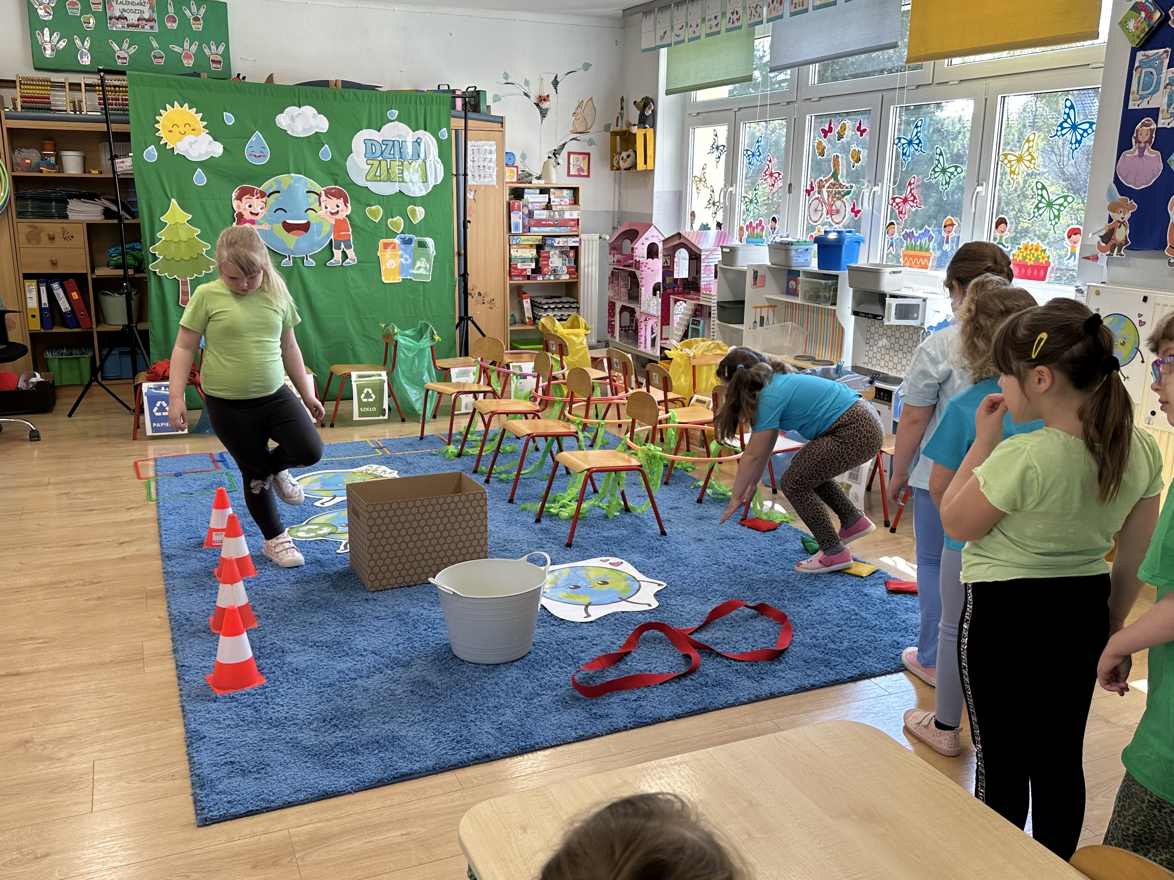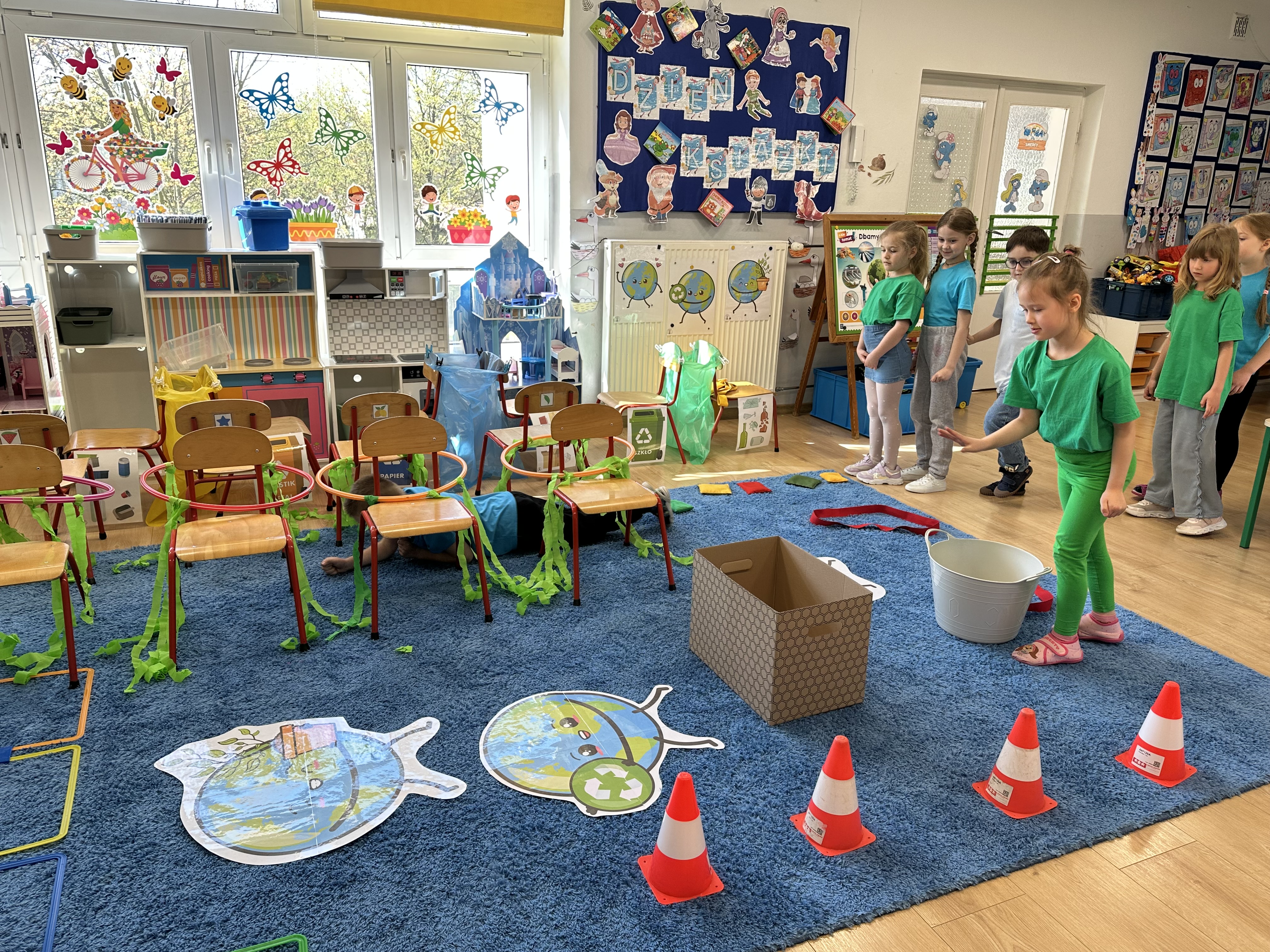 Zajęcia rozpoczęły się od wysłuchania wiersza „ Strażnik Ziemi”, który wprowadził dzieci w tematykę dbania o naszą planetę oraz stał się inspiracją do pokonania przygotowanego toru przeszkód. Dzieci z ogromnym zaangażowaniem wykonywały kolejne zadania - skakały po „kamieniach”, przechodziły przez ,,zarośnięty las”, pokonywały „korzenie”, slalomem omijały „góry” , celowały szyszkami do wyznaczonych miejsc oraz przechodziły przez ,,pnącza” i ,,liany”. Każdy uczestnik miał okazję wykazać się sprawnością, odwagą i sprytem.