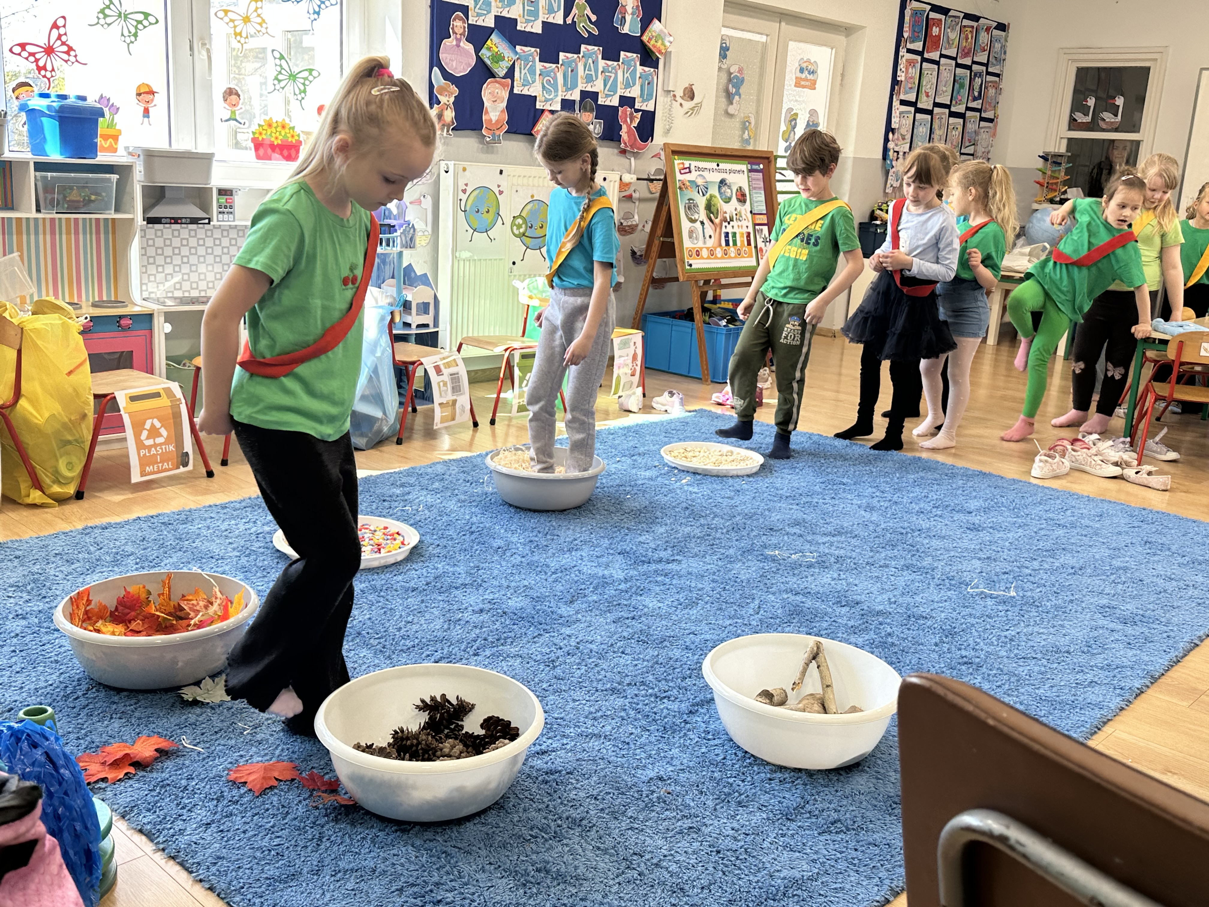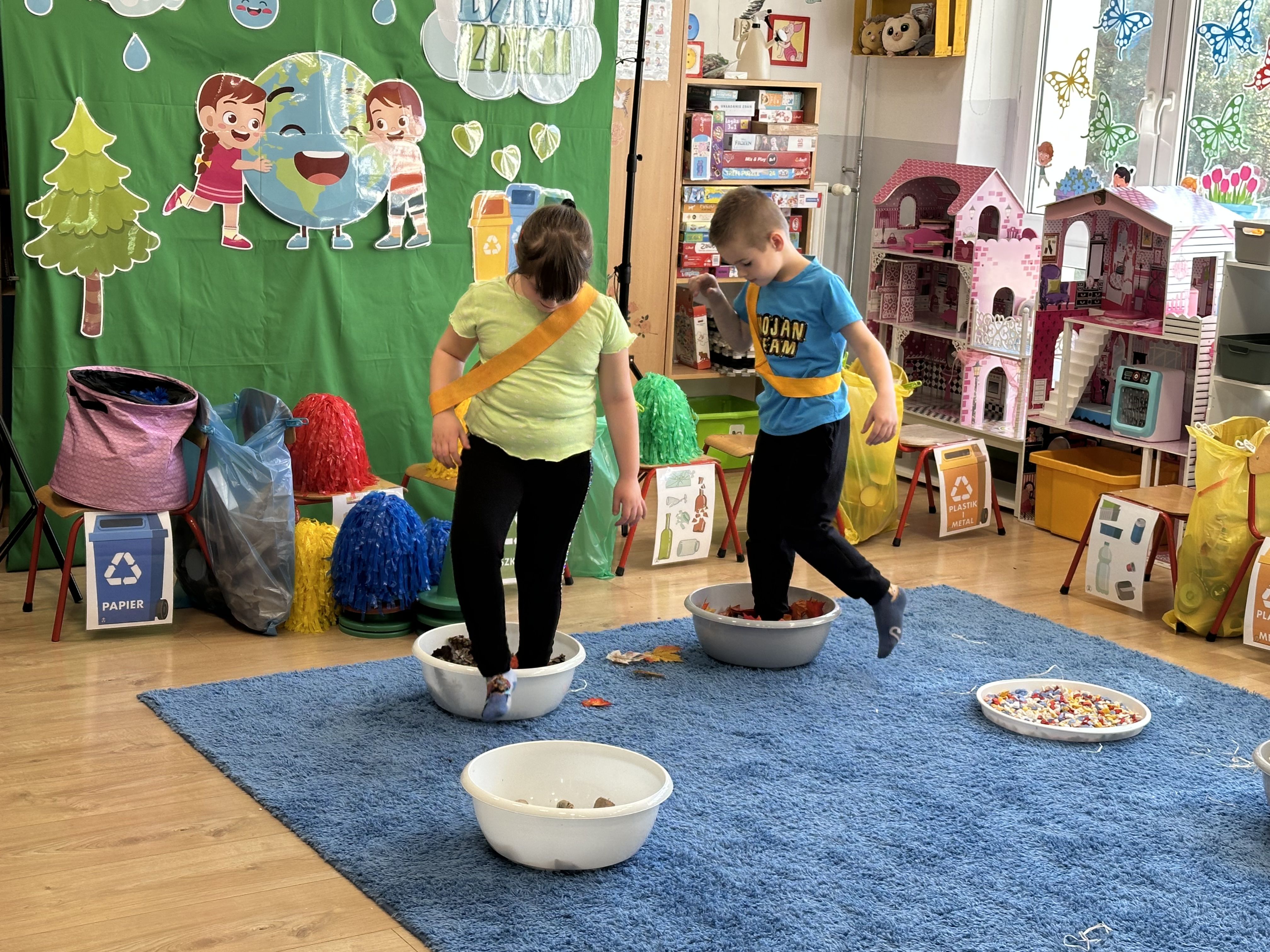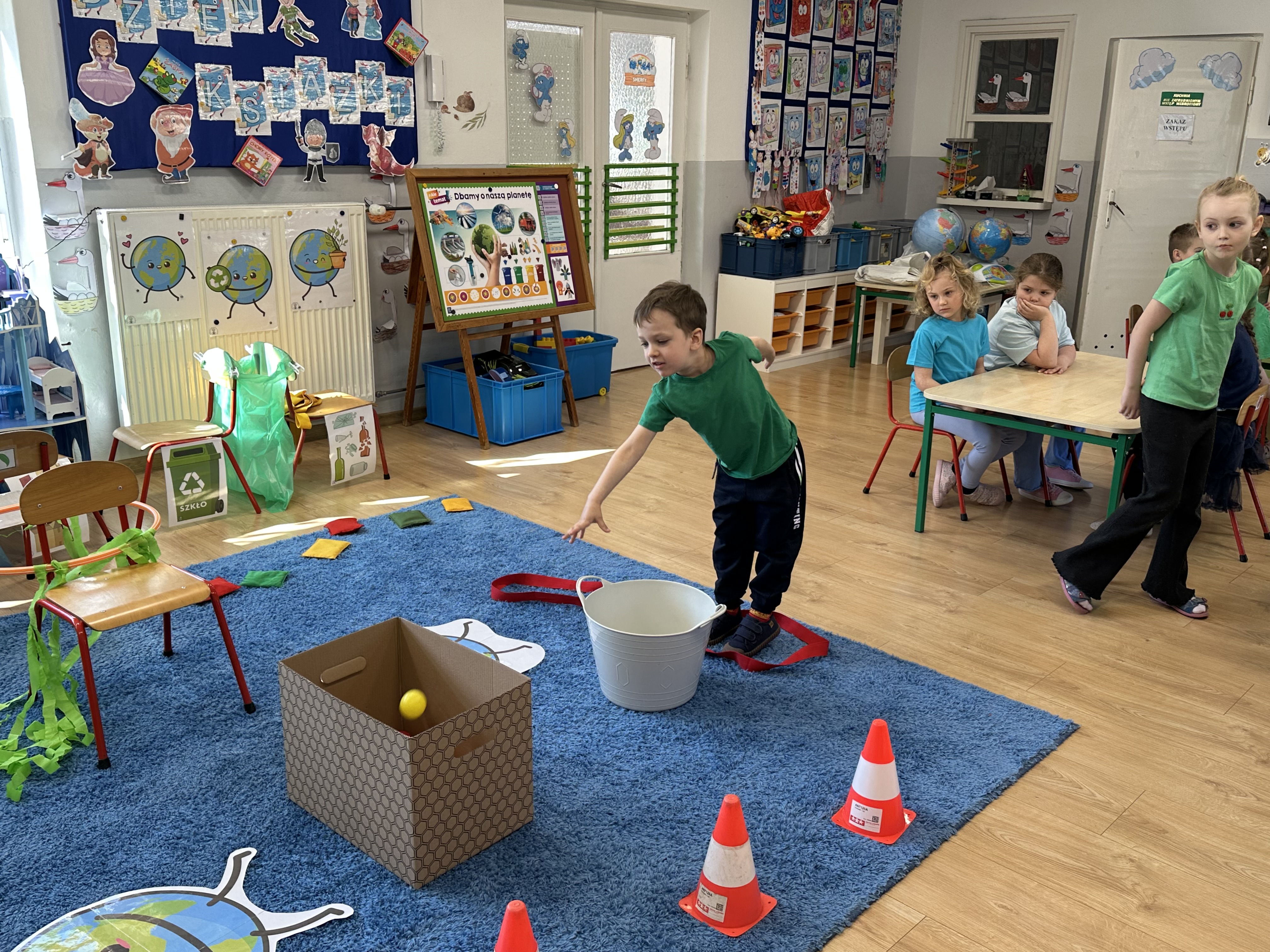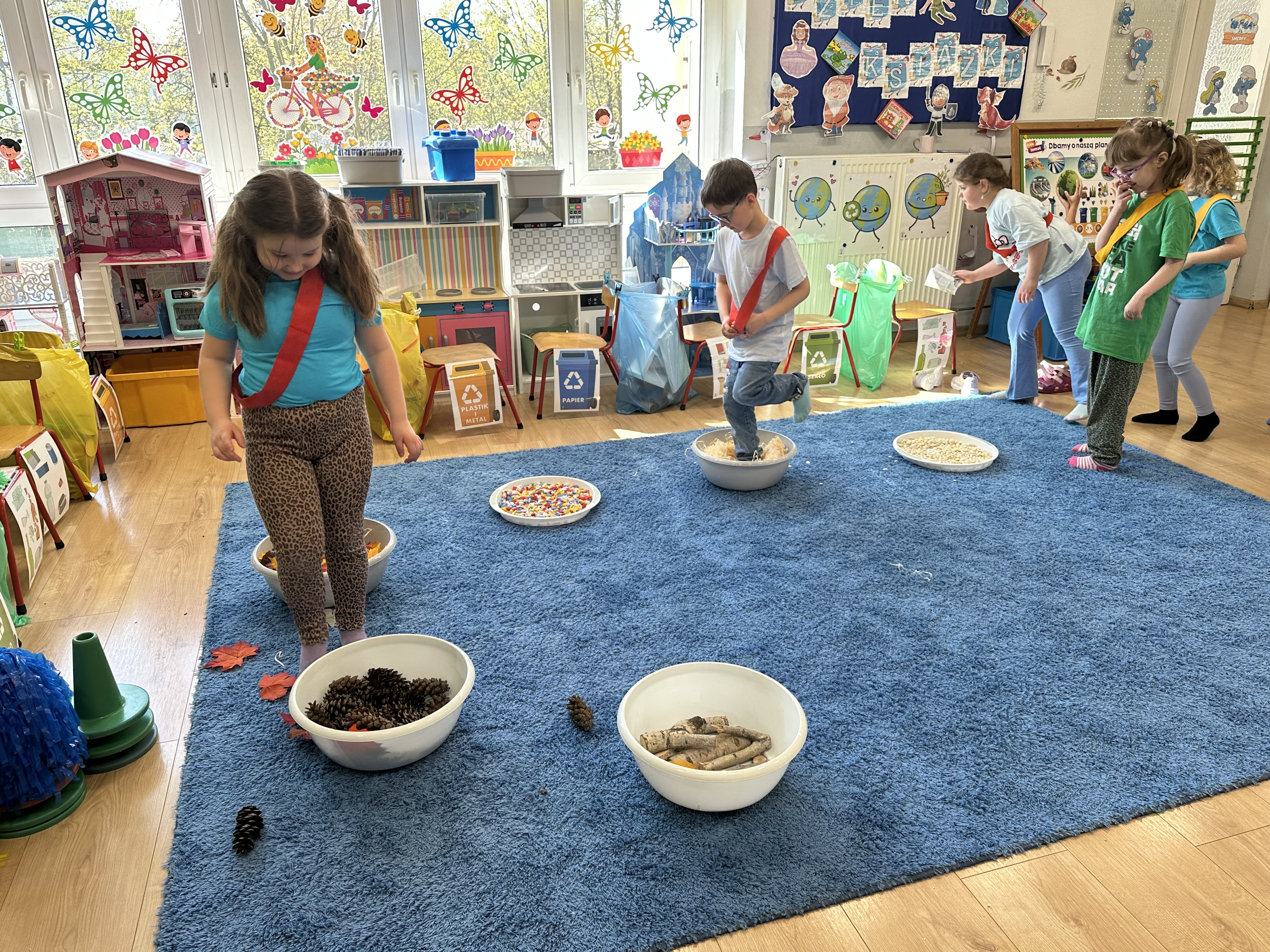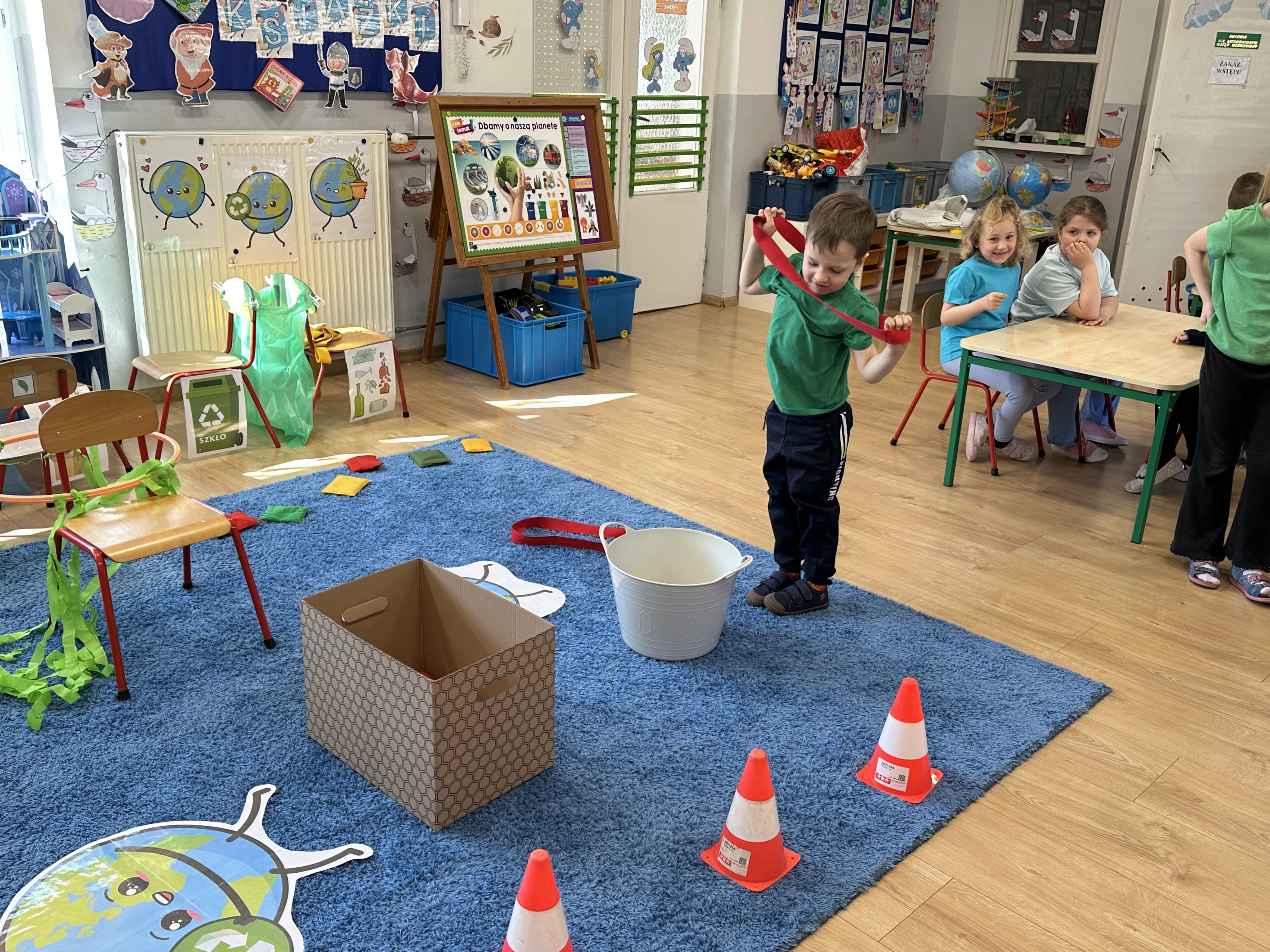 Kolejnym etapem było zadanie związane z ochroną mórz i oceanów. Dzieci „ratowały morze”, wyławiając z niebieskiego dywanu (symbolizującego wodę) różnego rodzaju odpady. Następnie uczyły się ich prawidłowej segregacji, co było doskonałą okazją do utrwalenia zasad dbania o środowisko.
