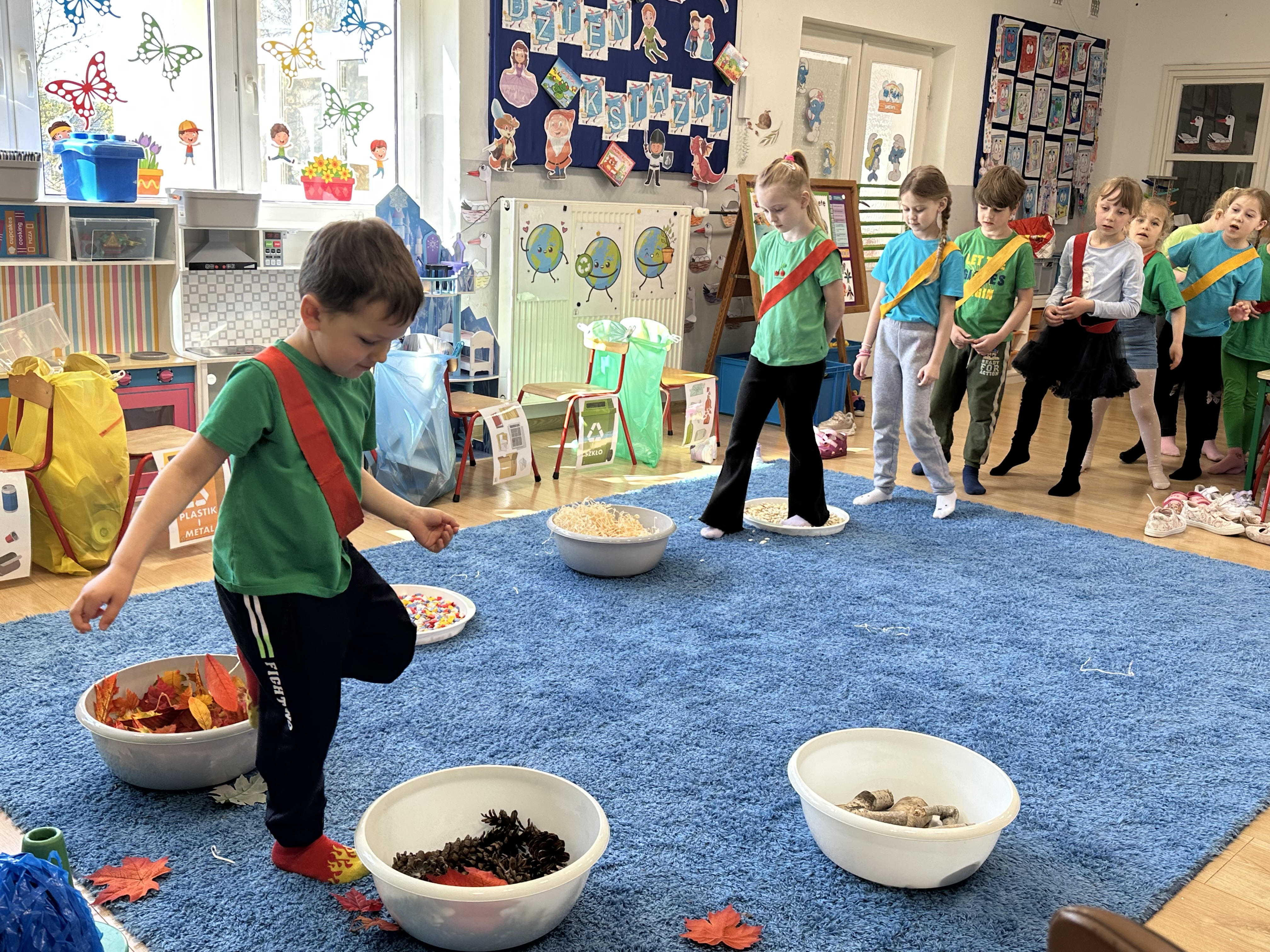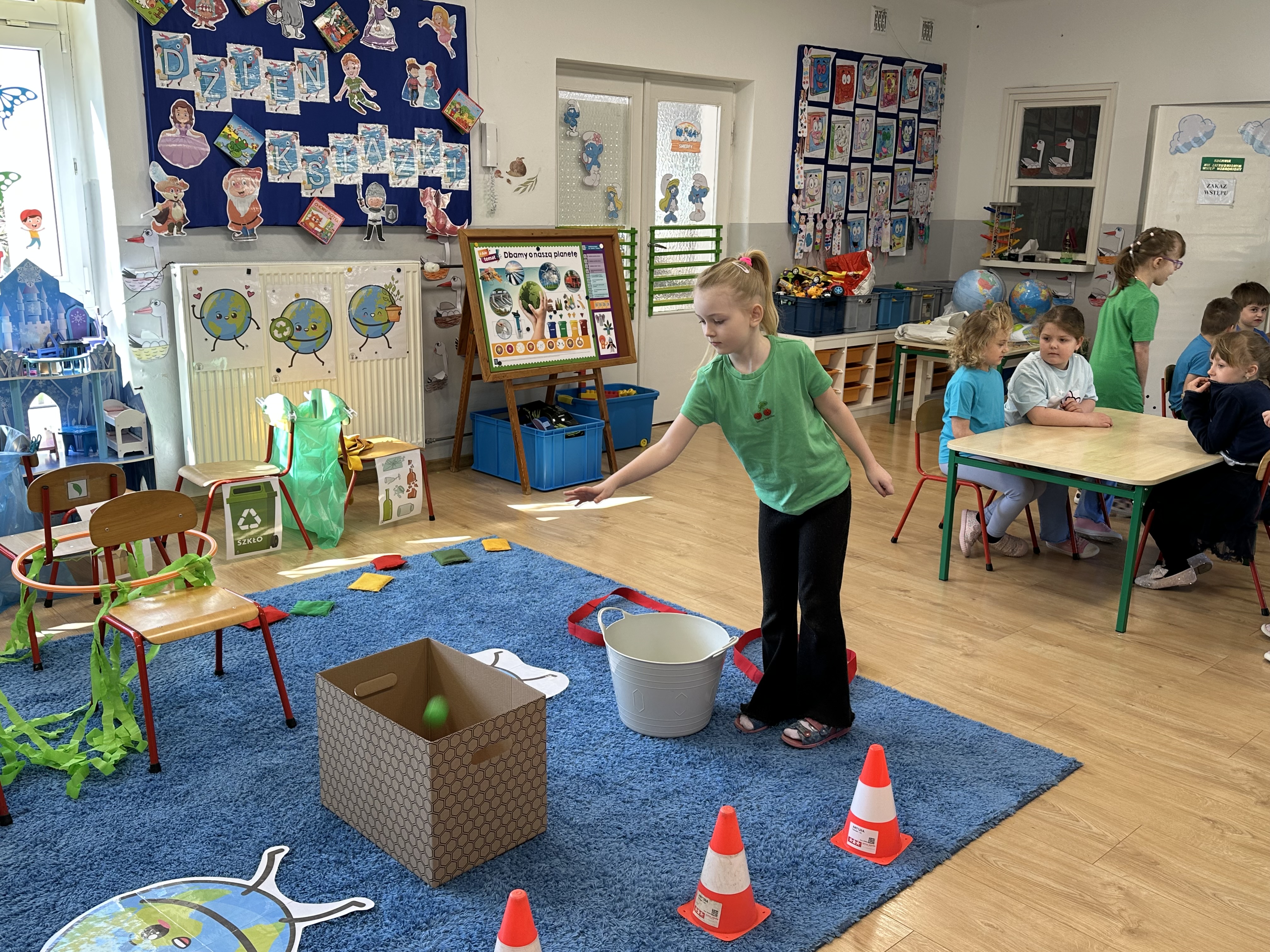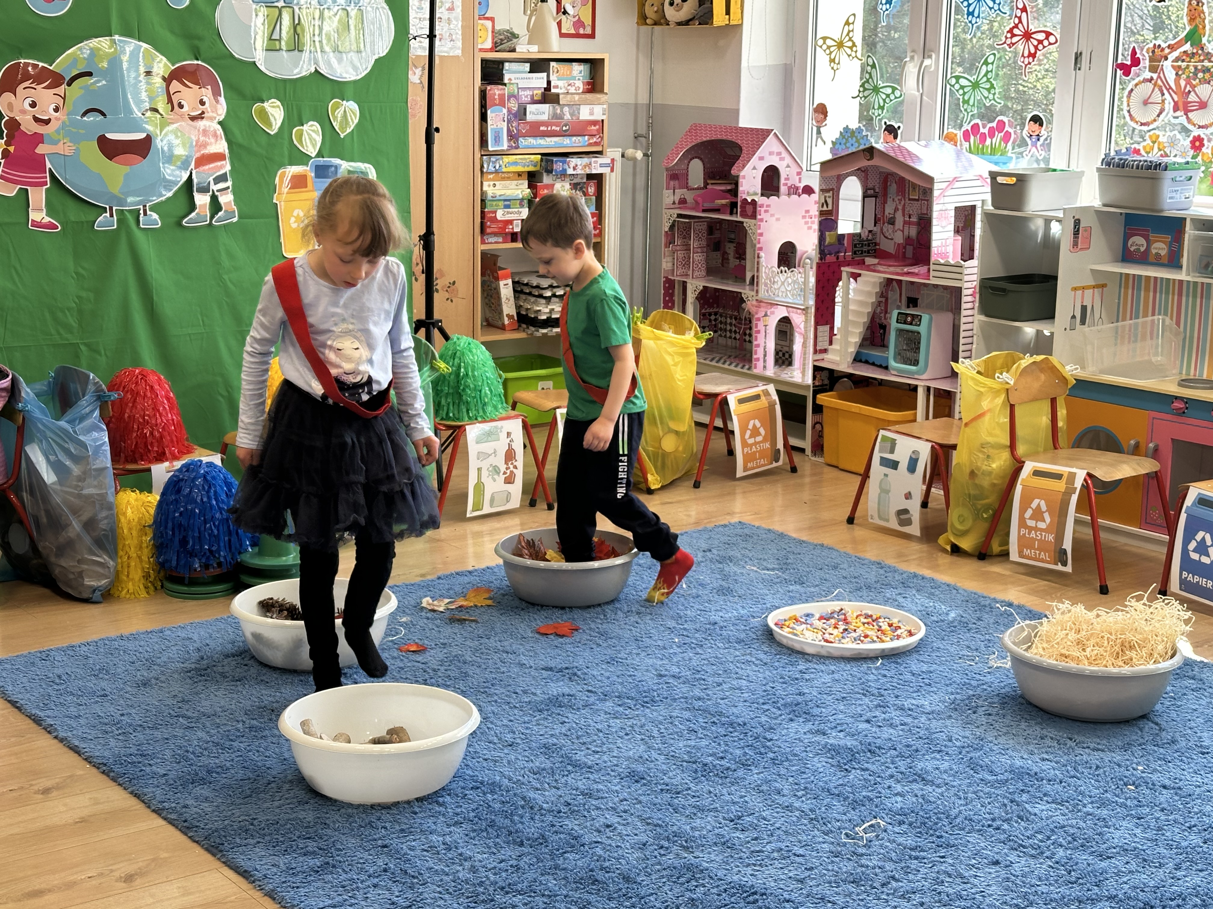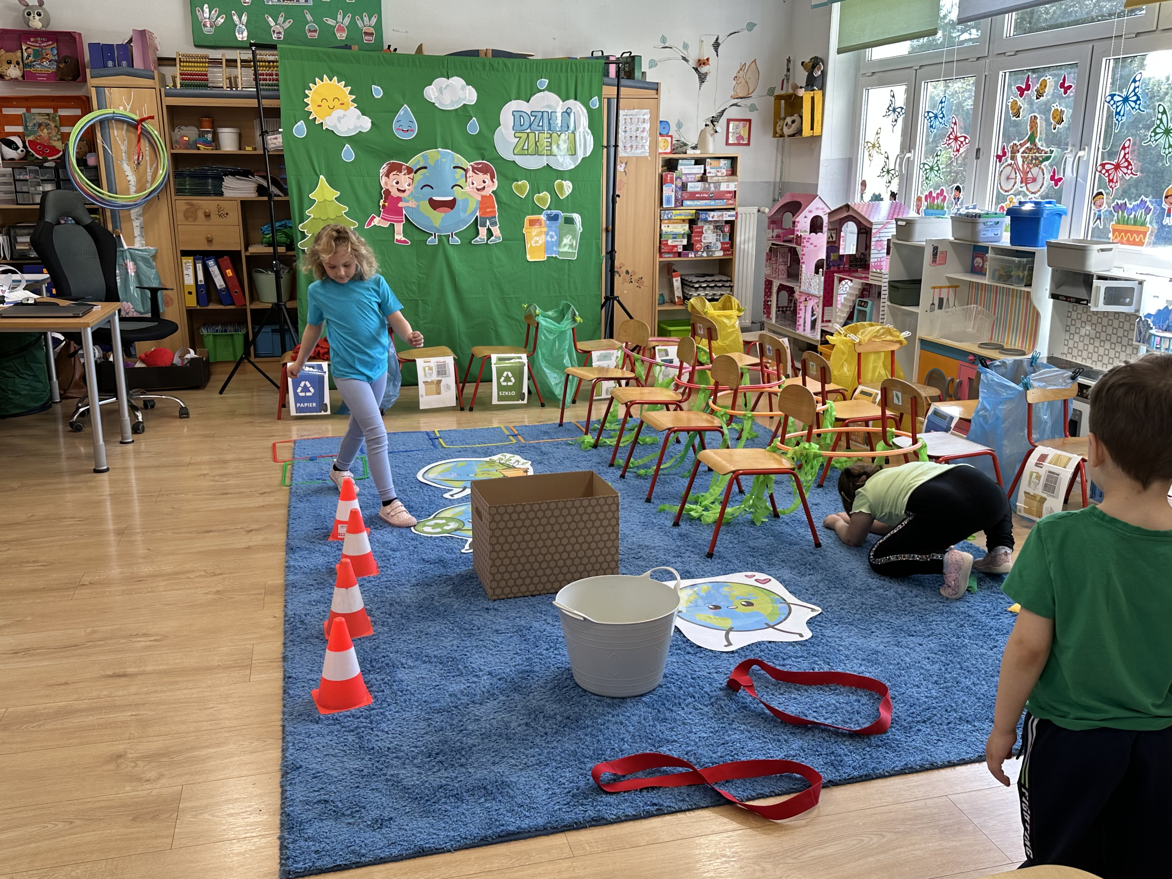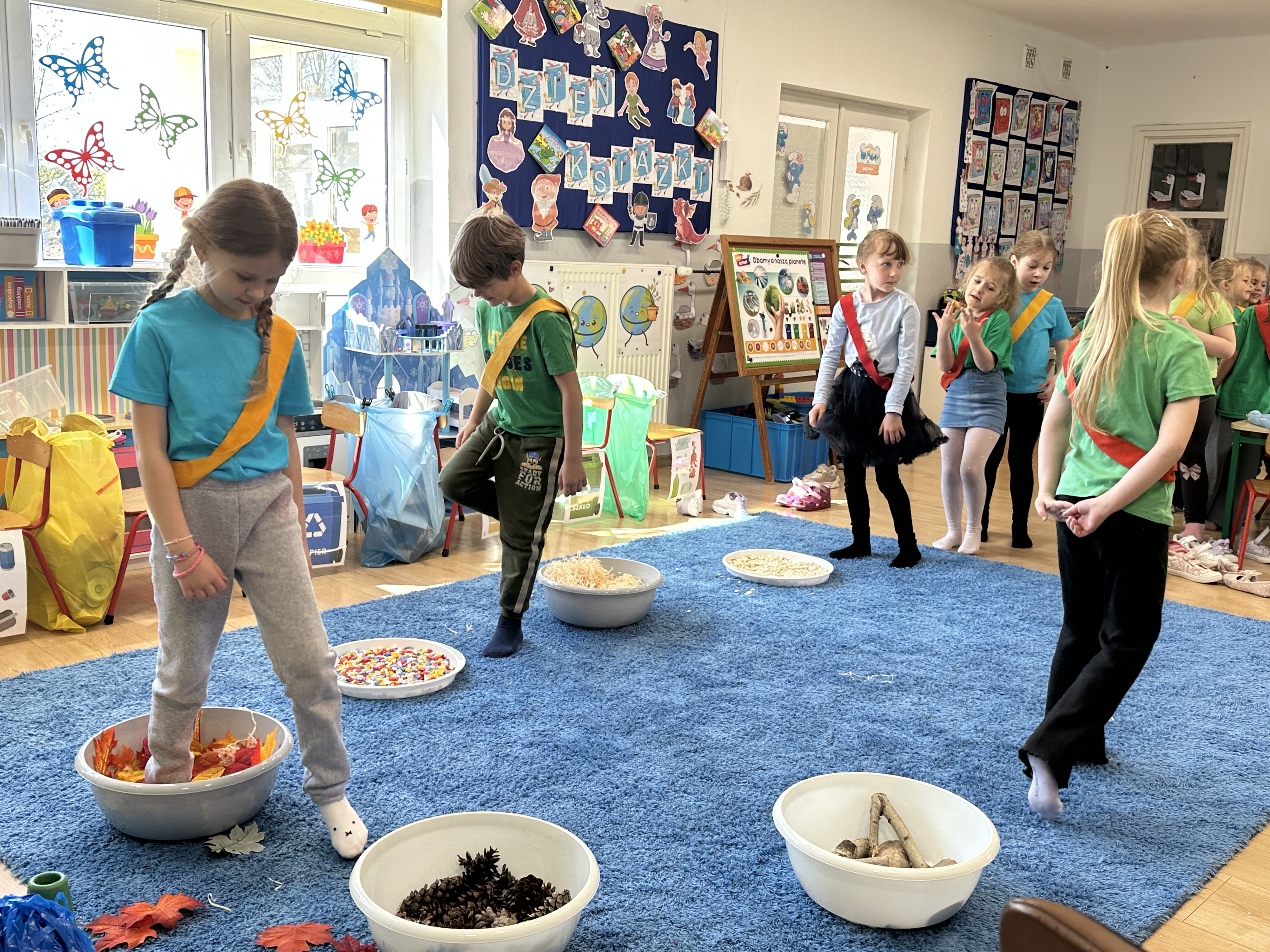 Kolejnym etapem było zadanie związane z ochroną mórz i oceanów. Dzieci „ratowały morze”, wyławiając z niebieskiego dywanu (symbolizującego wodę) różnego rodzaju odpady. Następnie uczyły się ich prawidłowej segregacji, co było doskonałą okazją do utrwalenia zasad dbania o środowisko.
