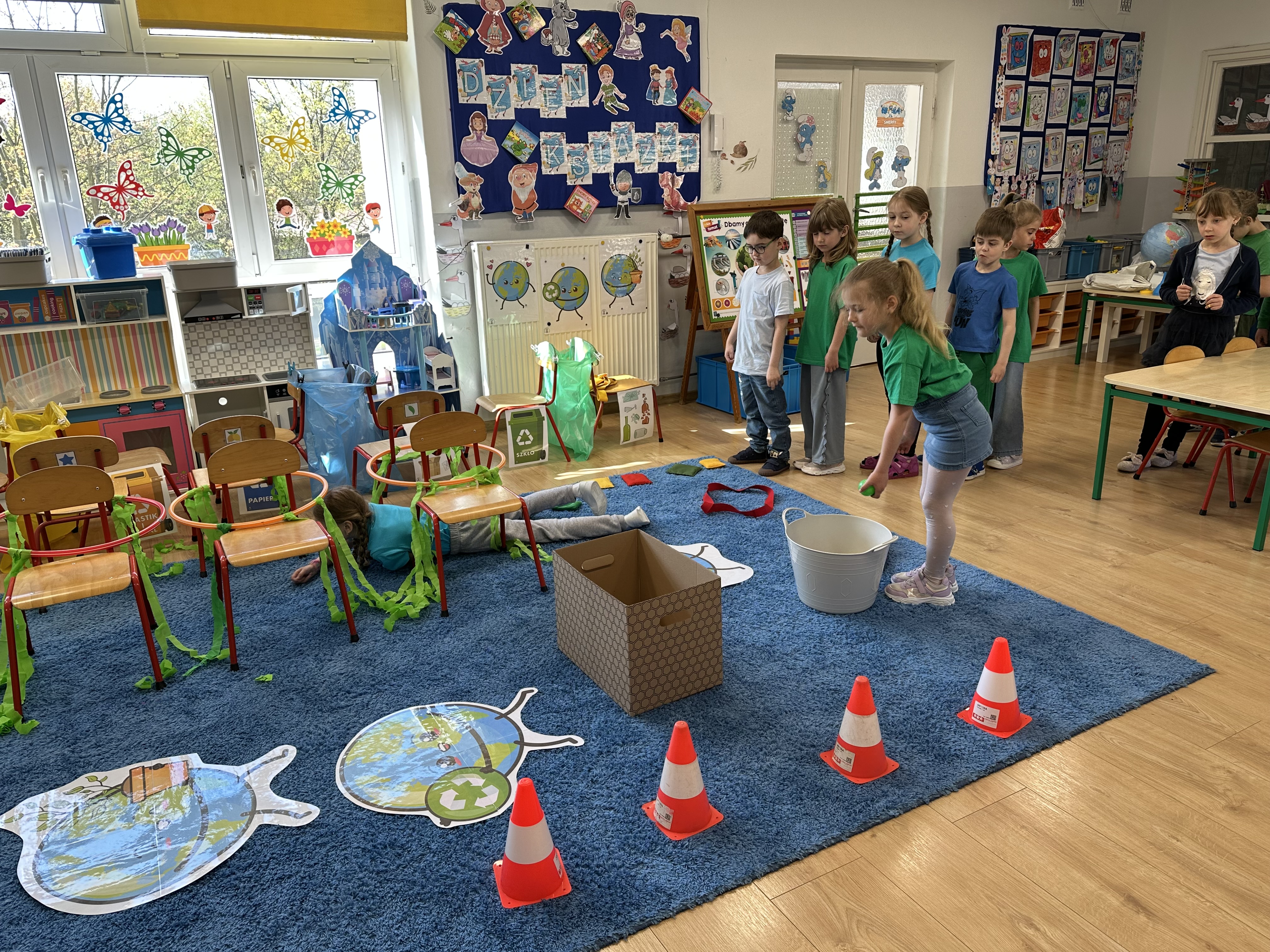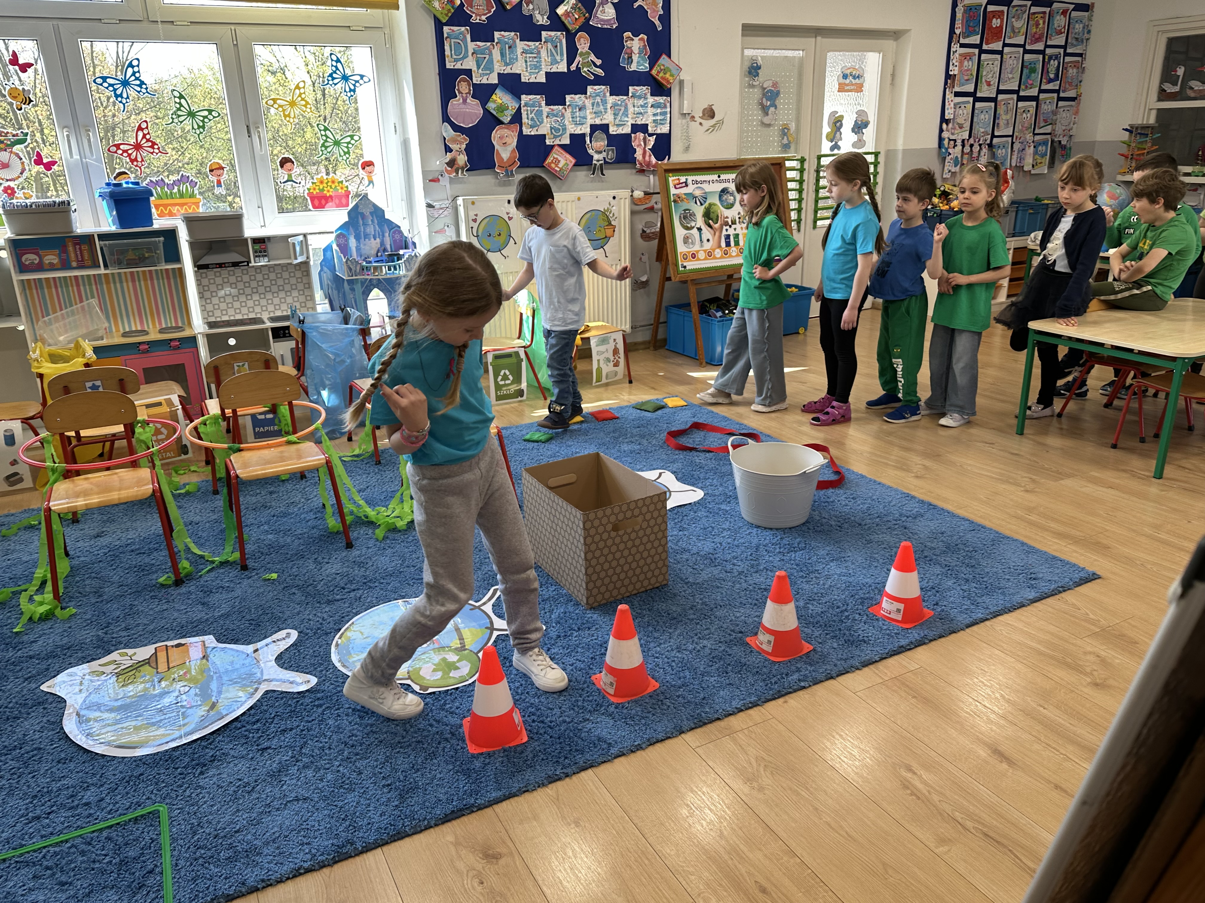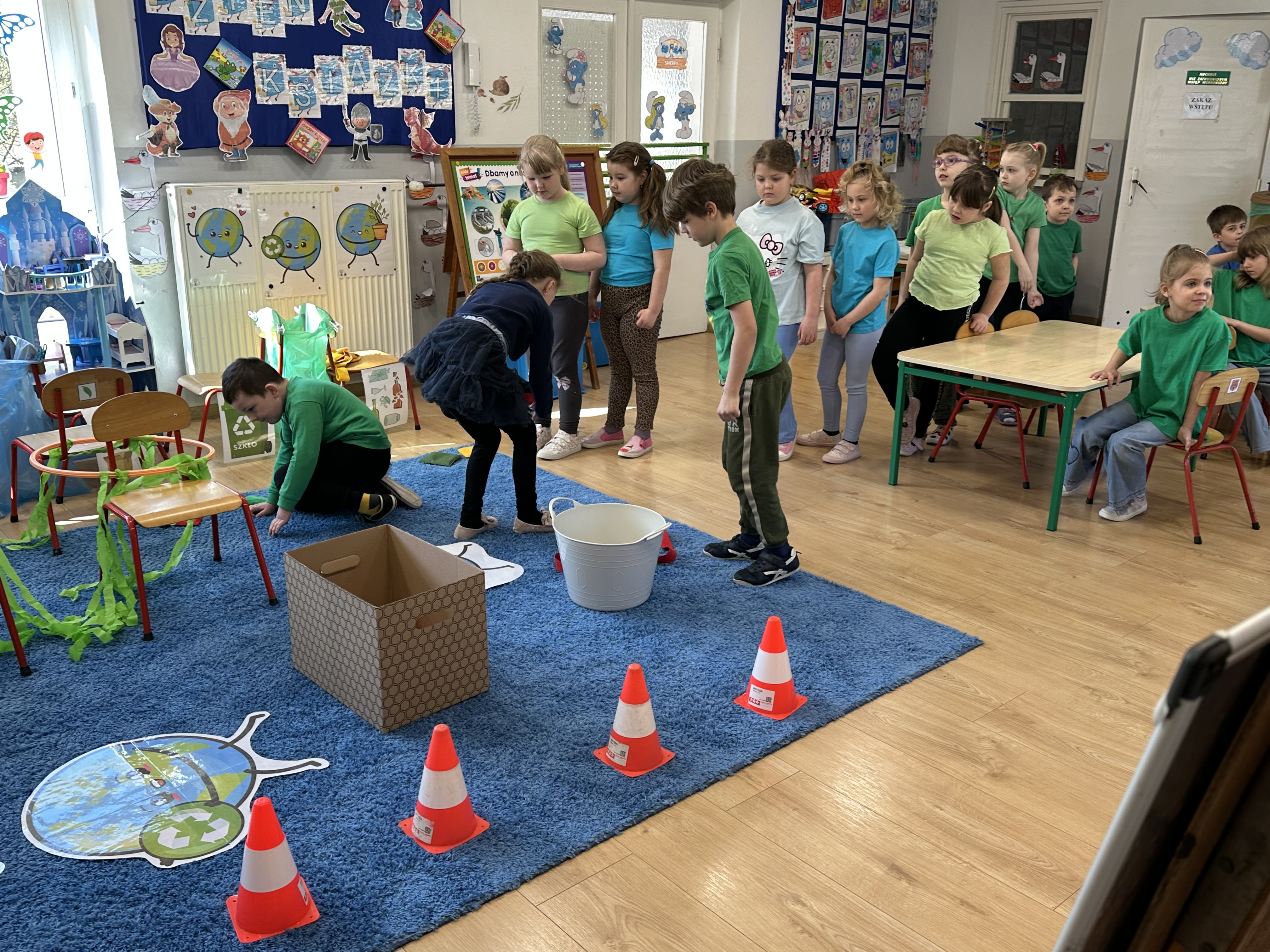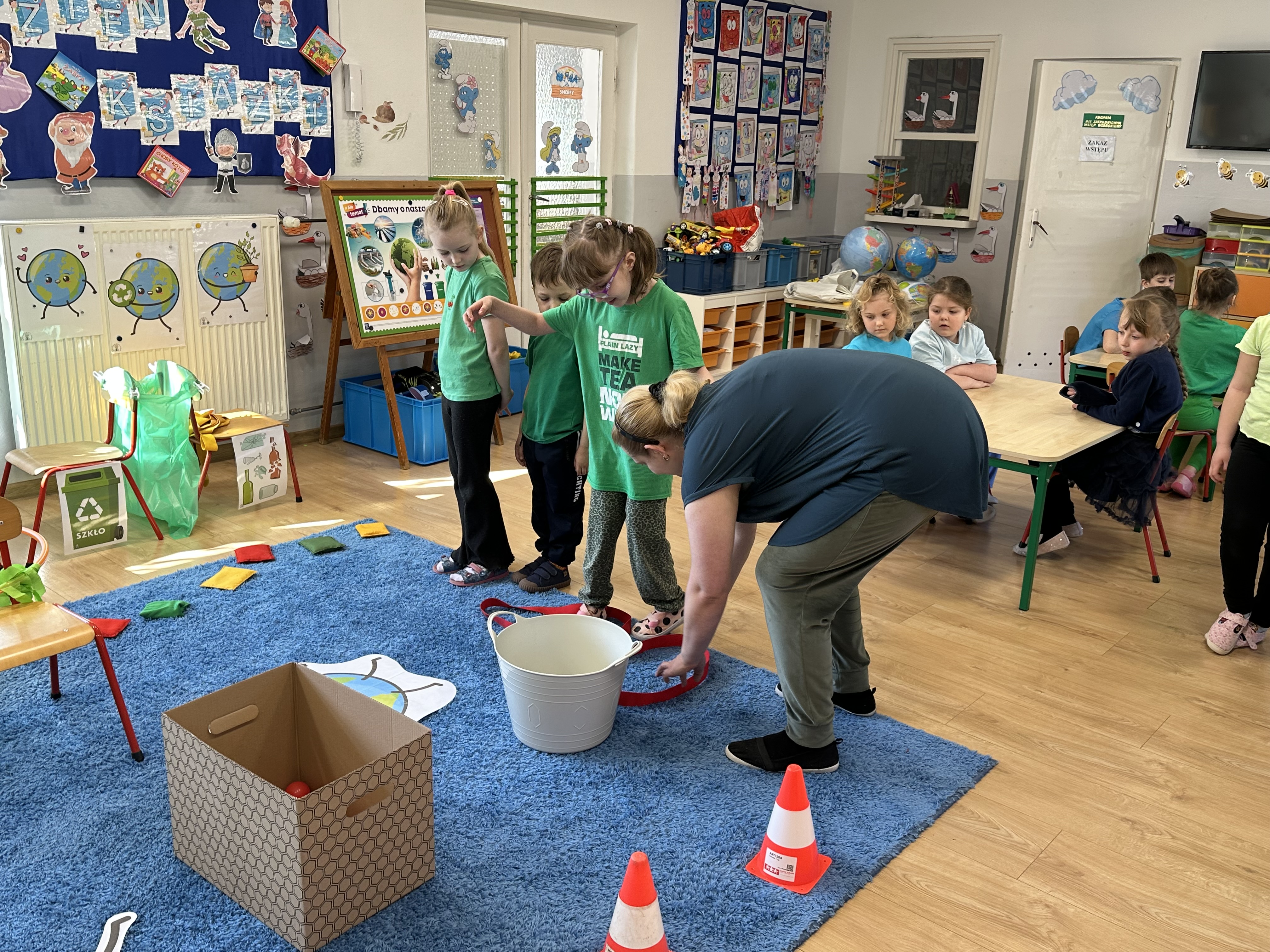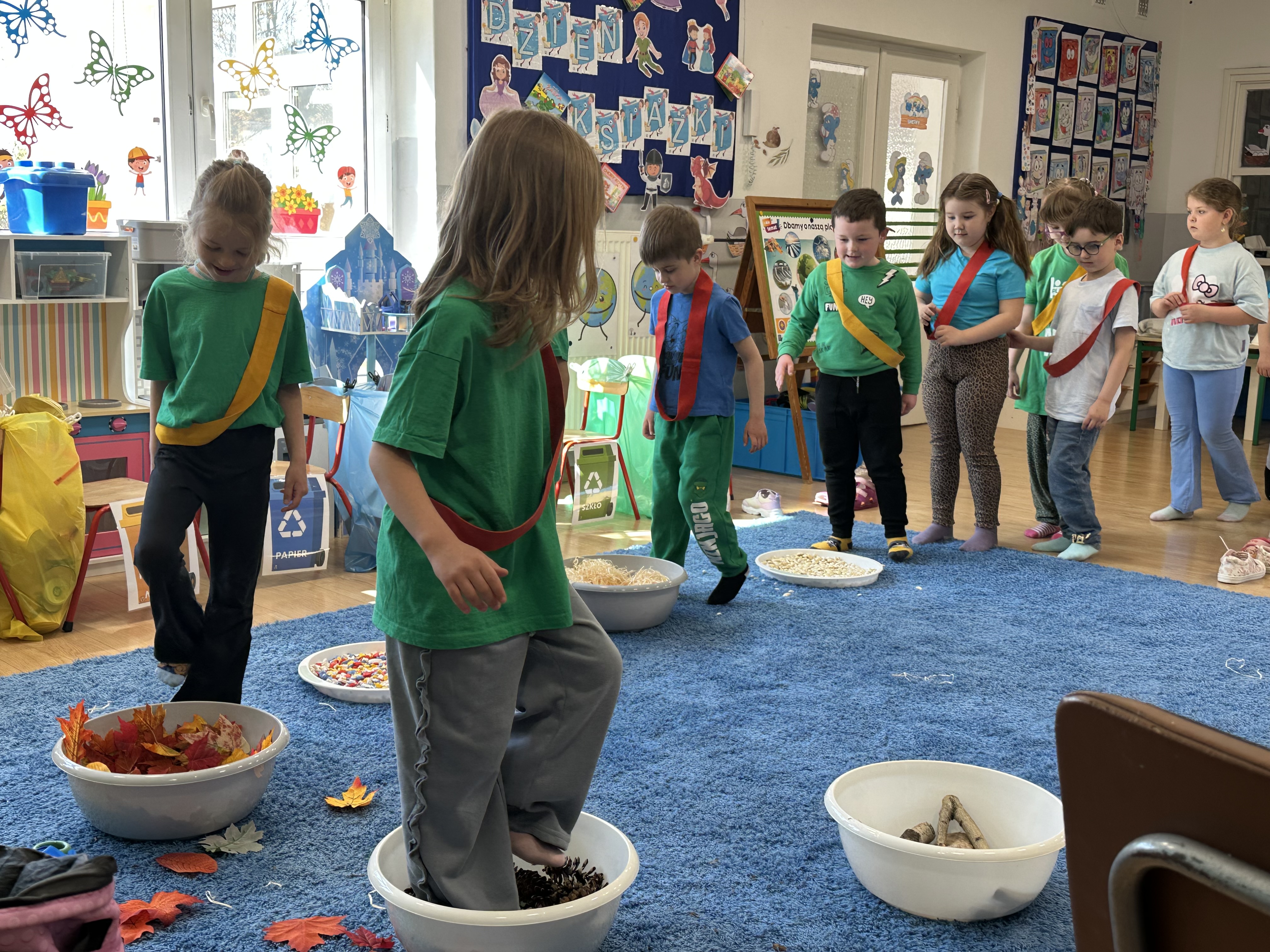 Kolejnym etapem było zadanie związane z ochroną mórz i oceanów. Dzieci „ratowały morze”, wyławiając z niebieskiego dywanu (symbolizującego wodę) różnego rodzaju odpady. Następnie uczyły się ich prawidłowej segregacji, co było doskonałą okazją do utrwalenia zasad dbania o środowisko.