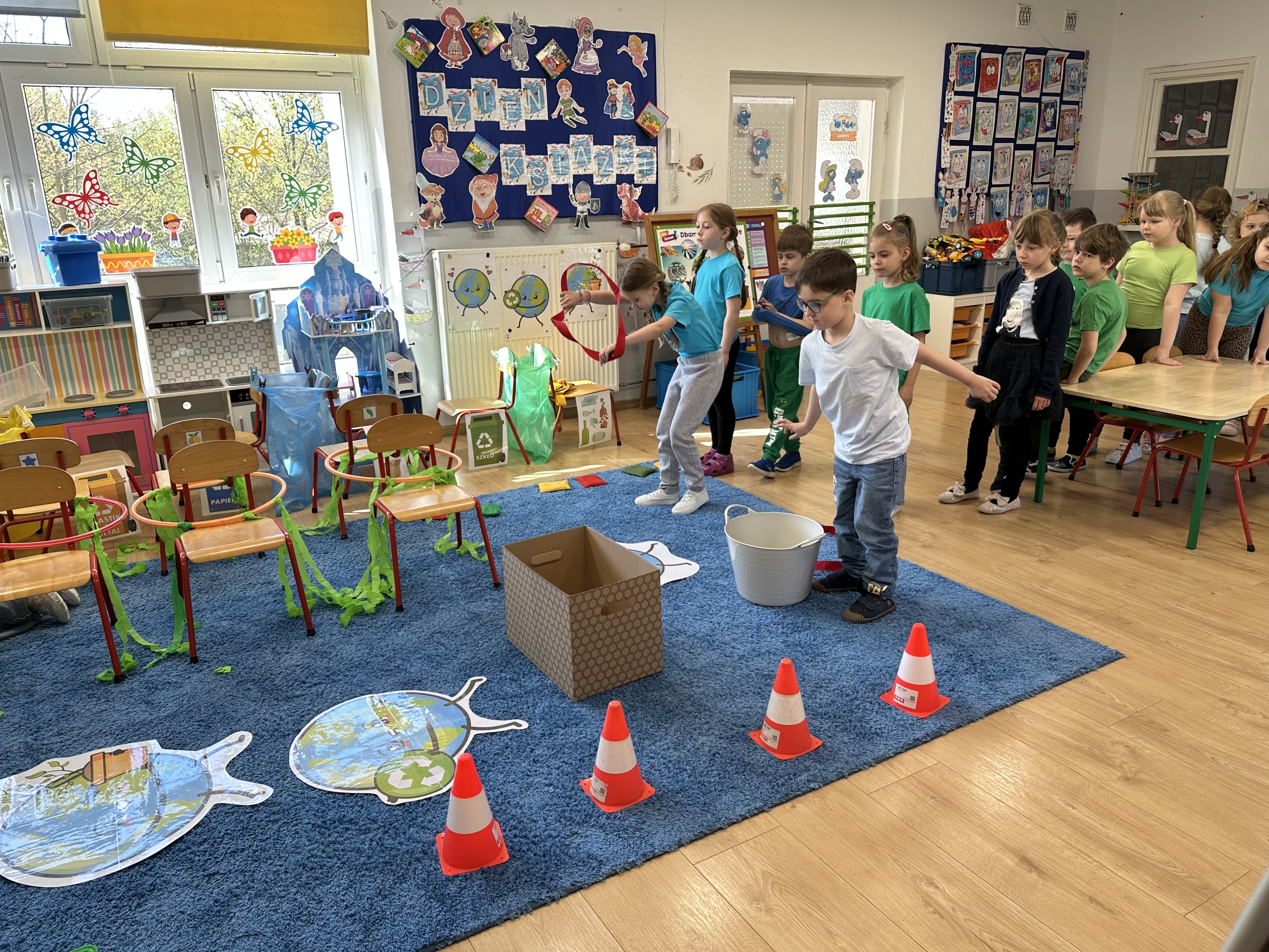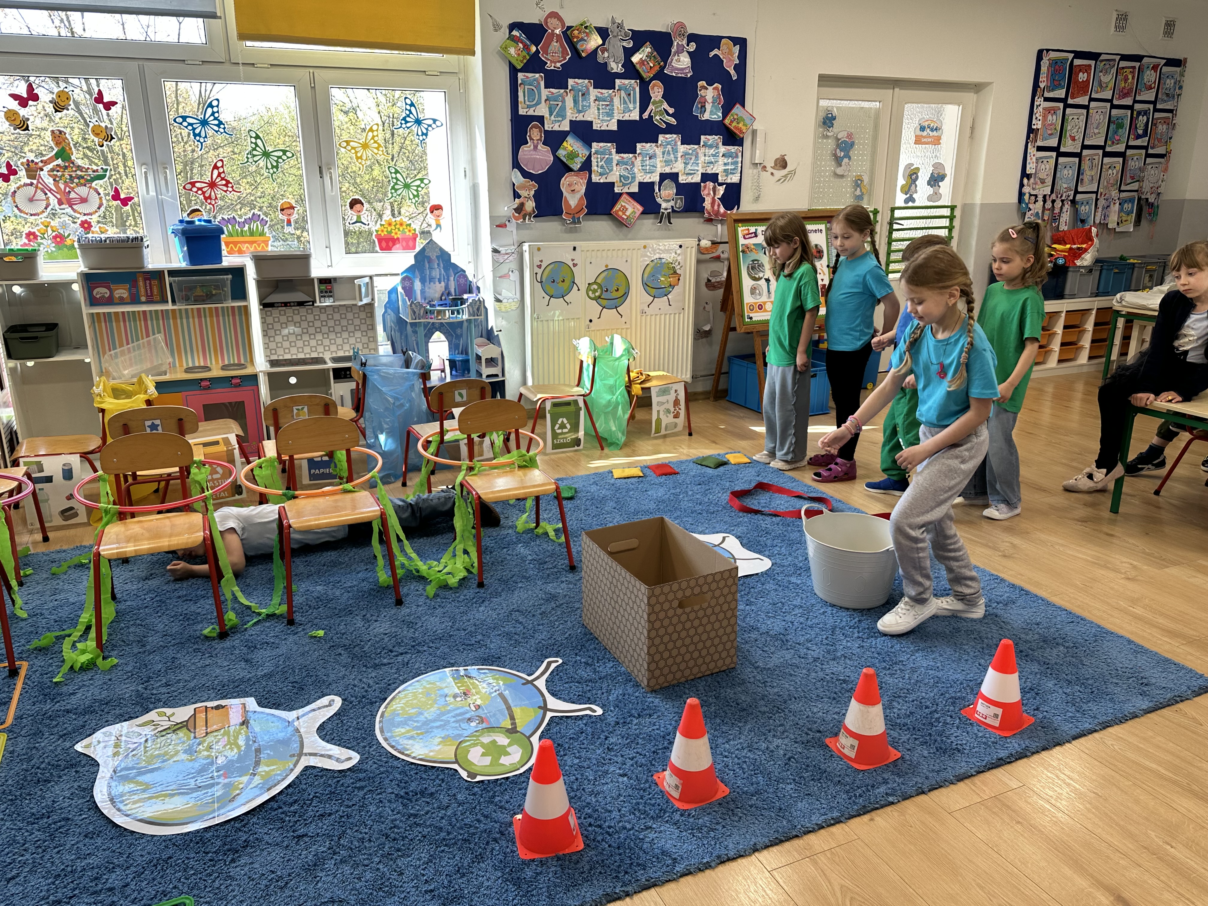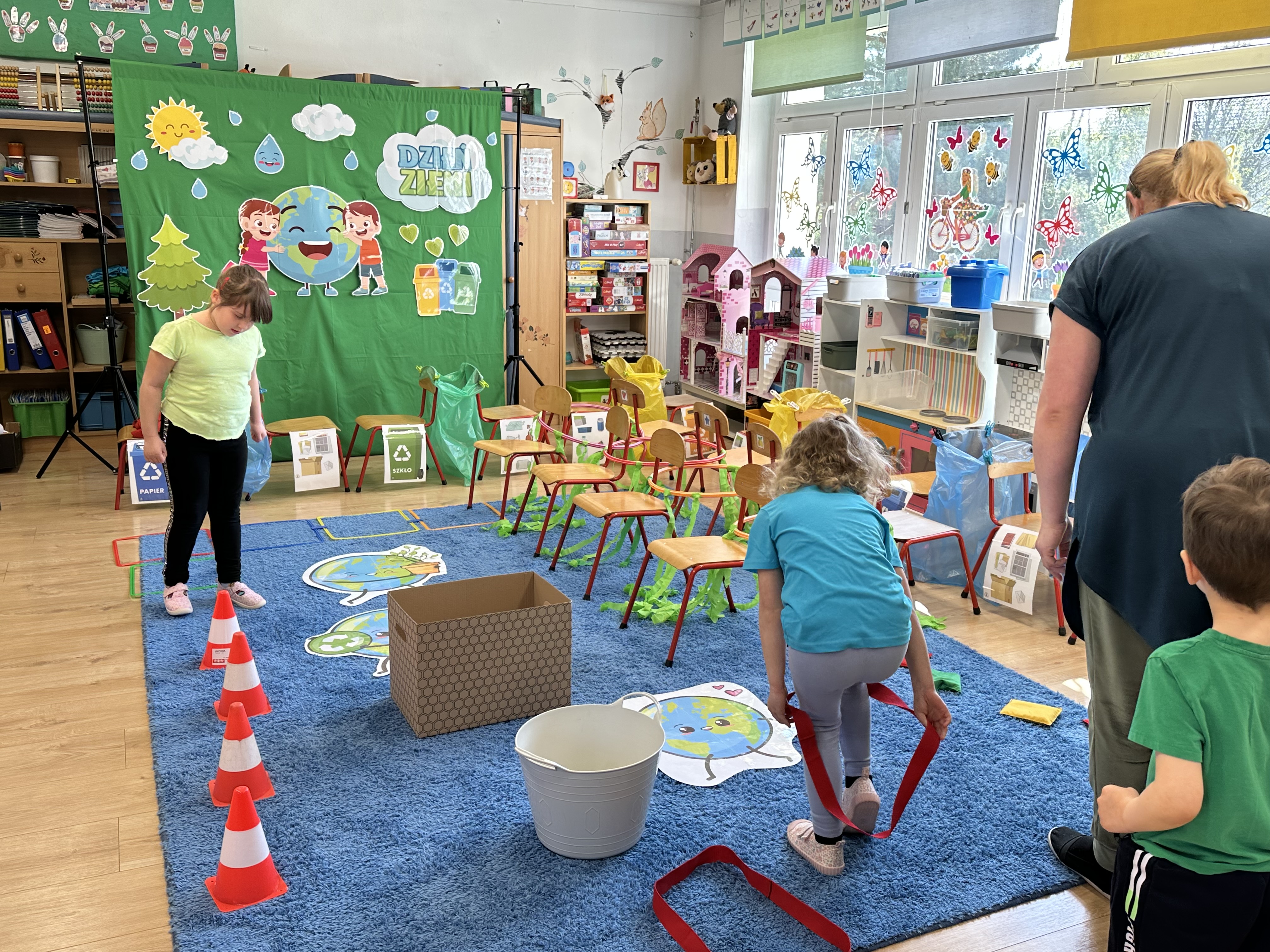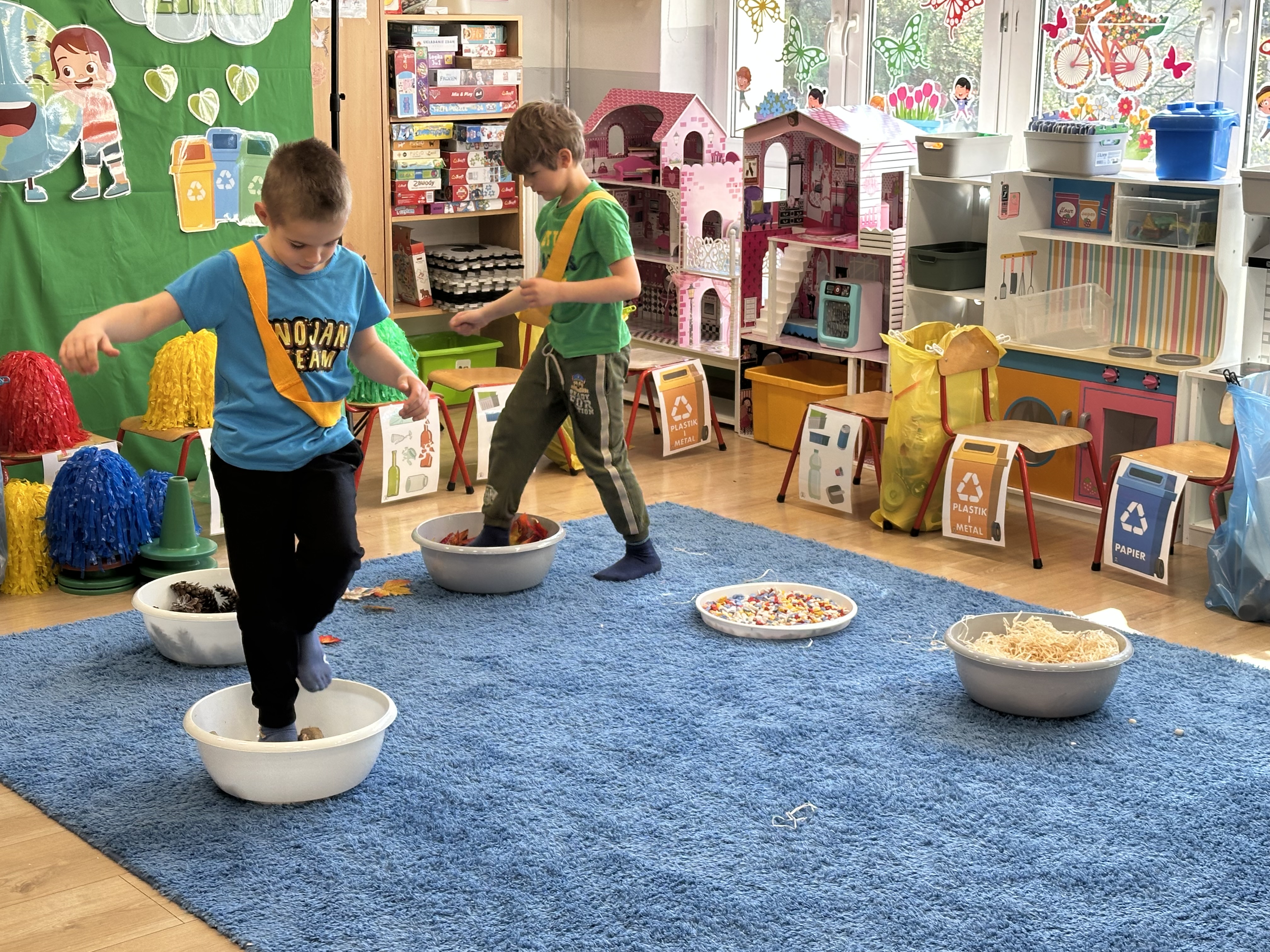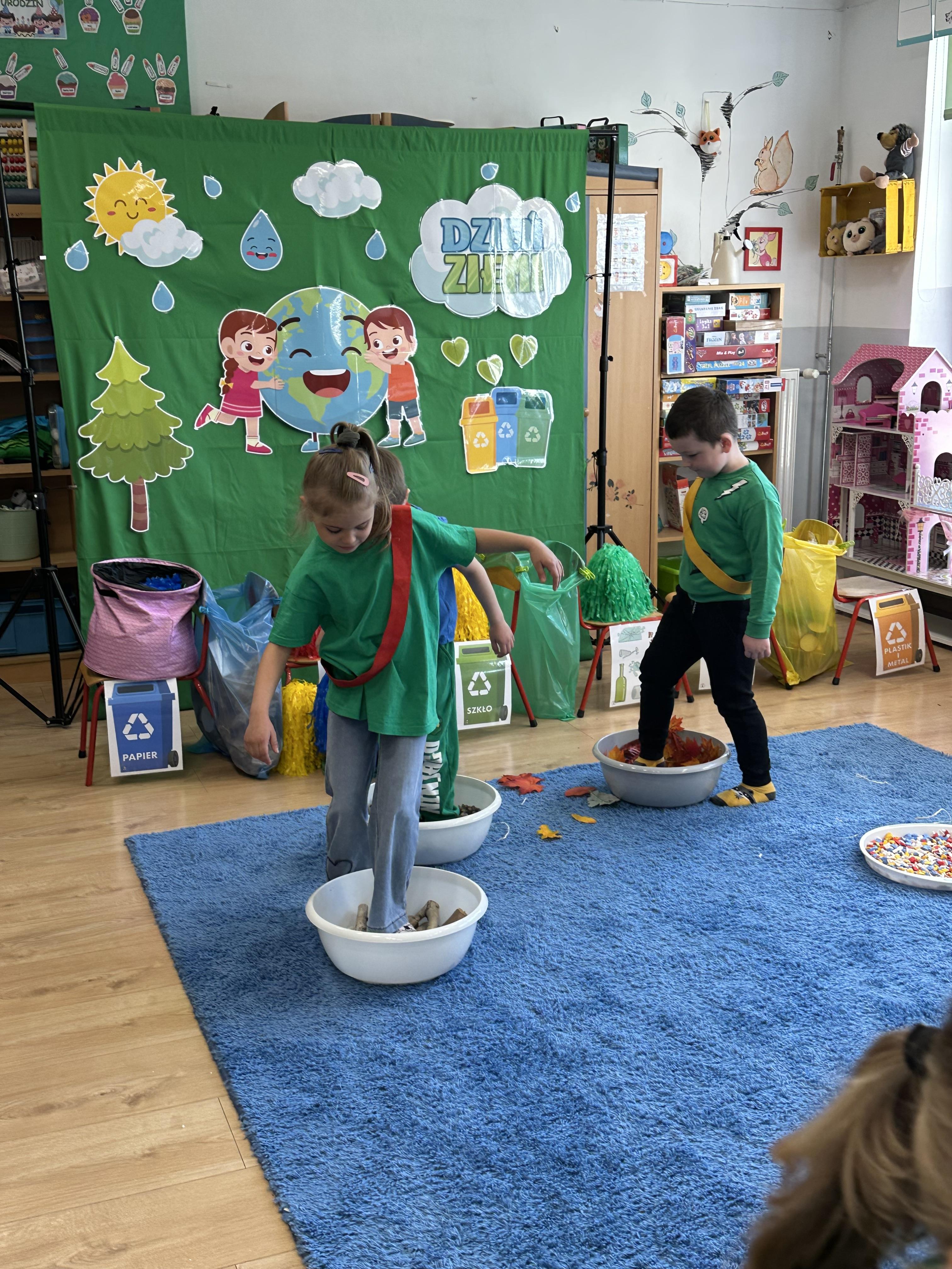 Kolejnym etapem było zadanie związane z ochroną mórz i oceanów. Dzieci „ratowały morze”, wyławiając z niebieskiego dywanu (symbolizującego wodę) różnego rodzaju odpady. Następnie uczyły się ich prawidłowej segregacji, co było doskonałą okazją do utrwalenia zasad dbania o środowisko.