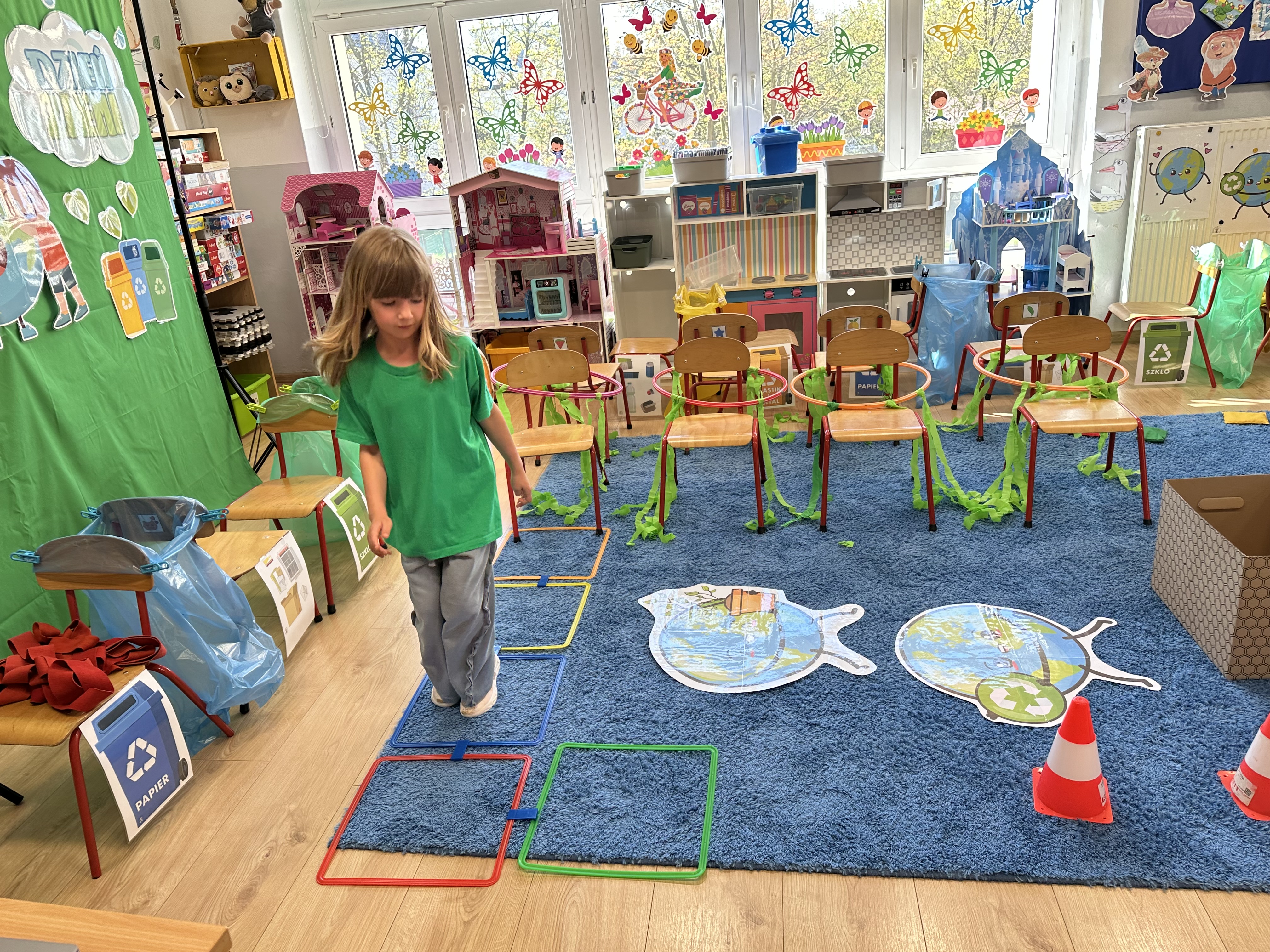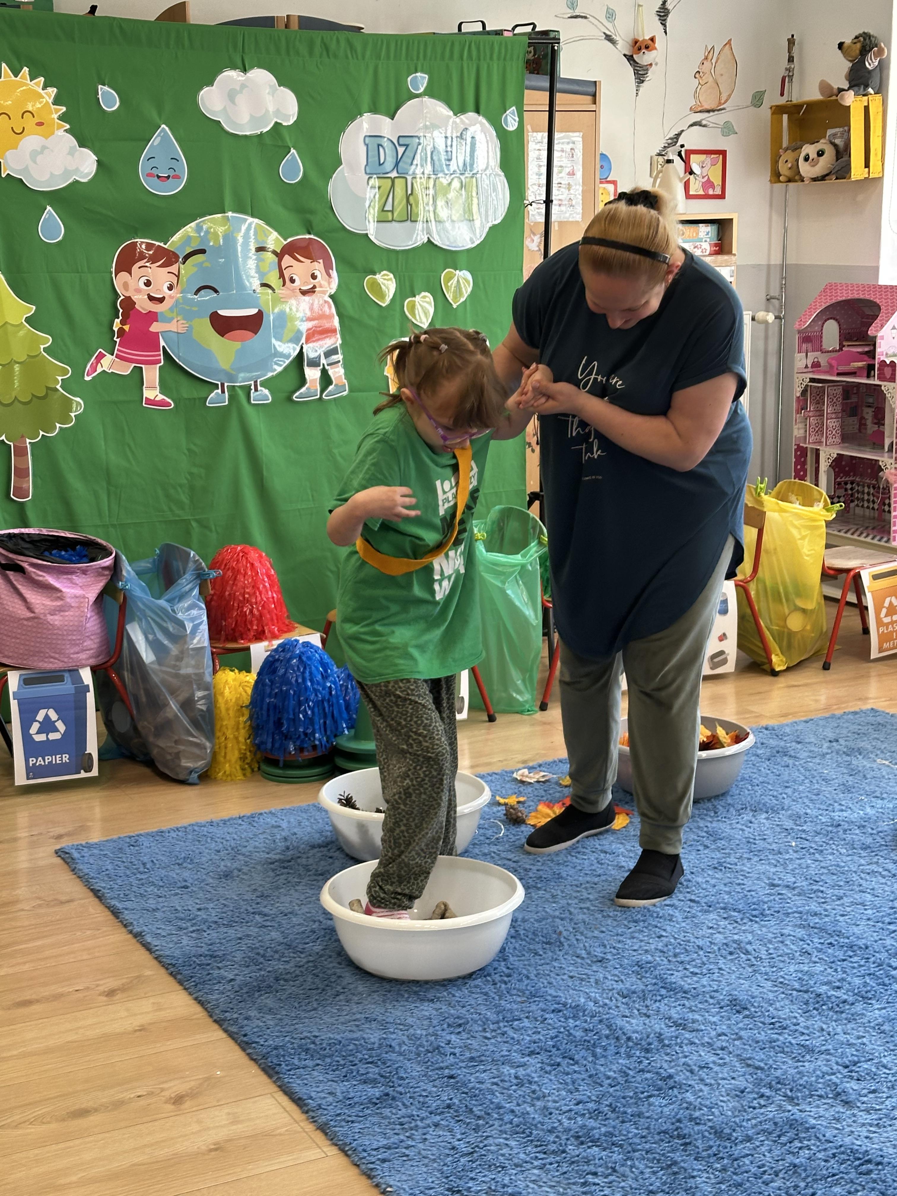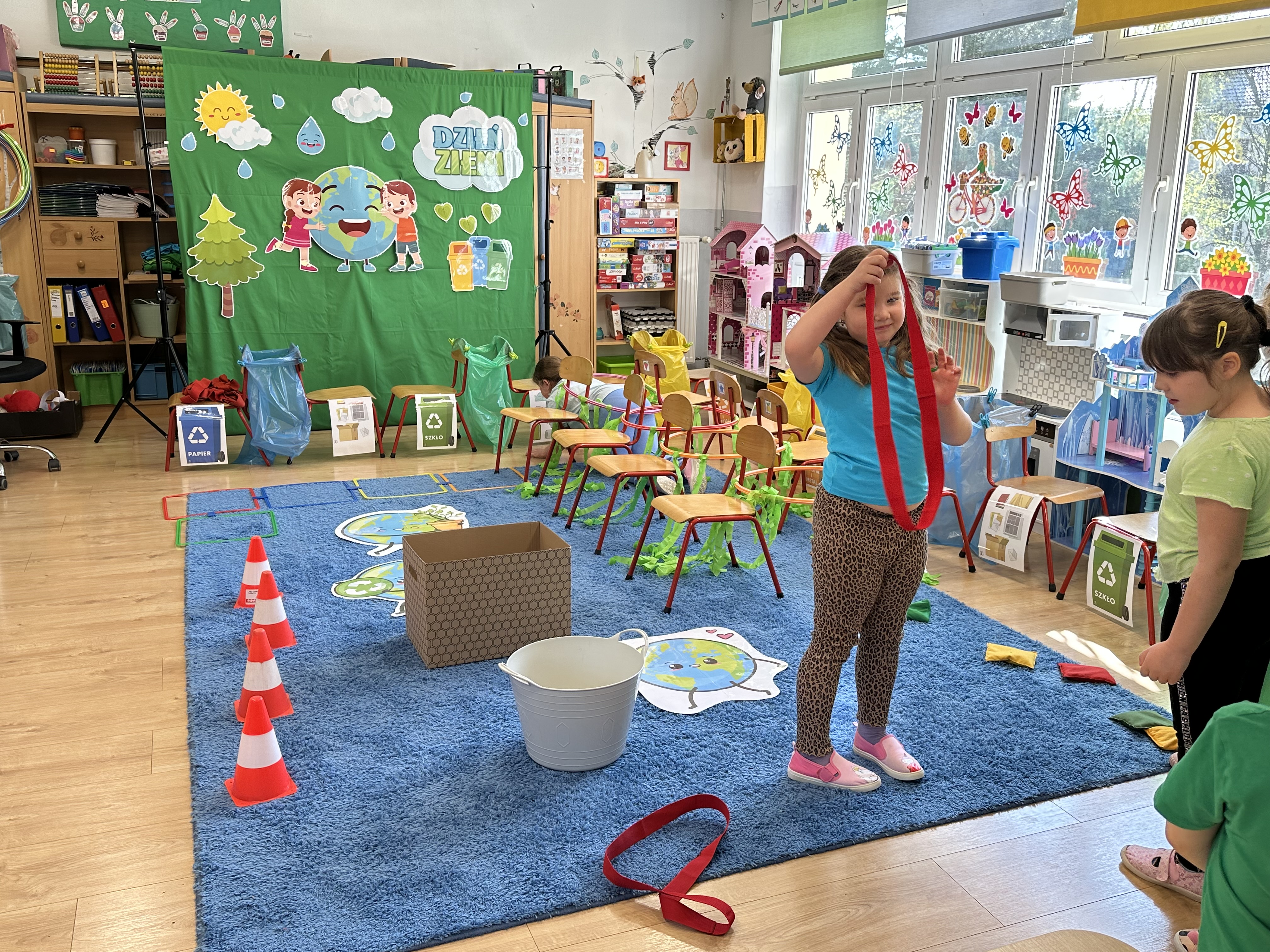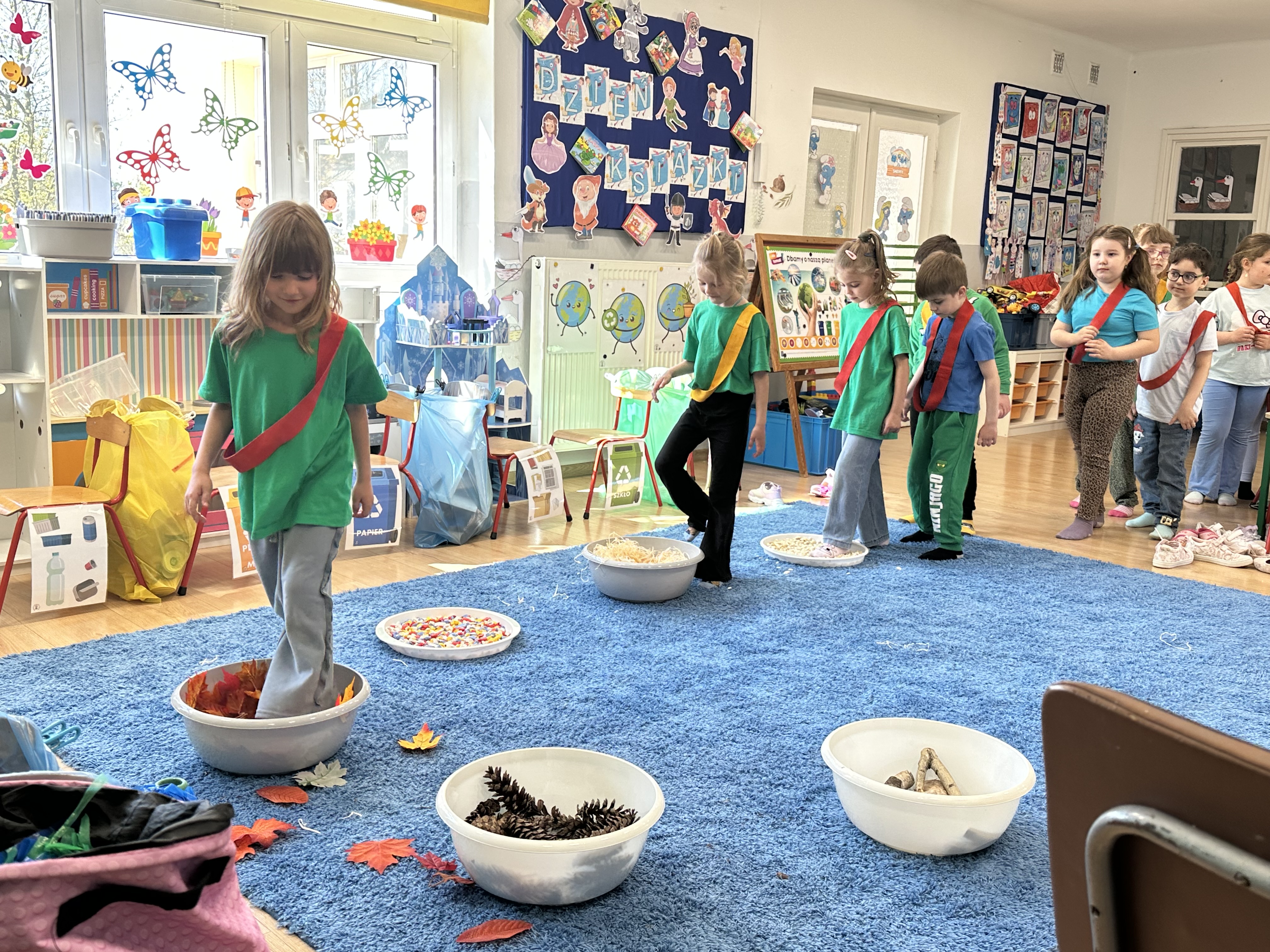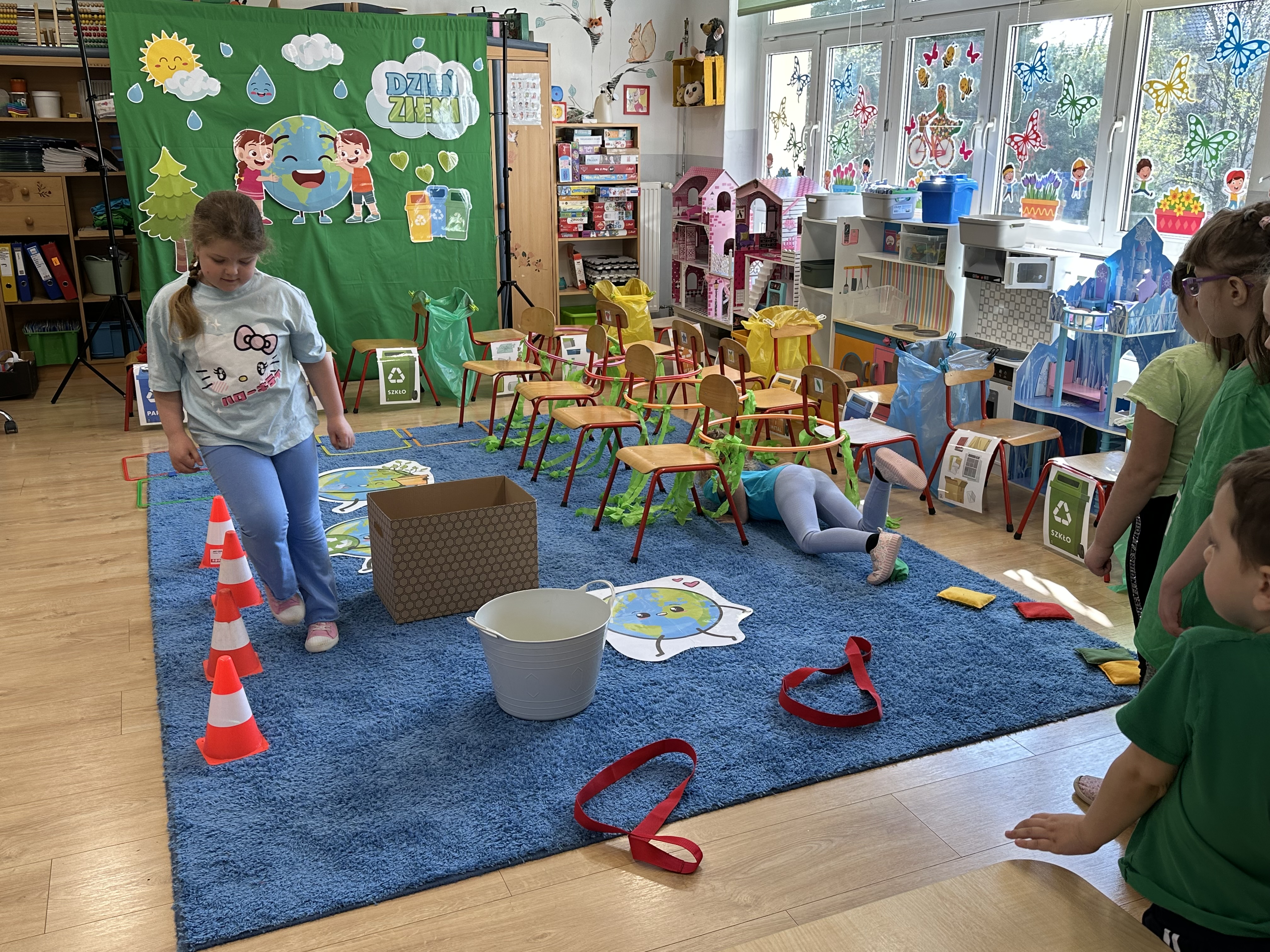 Kolejnym etapem było zadanie związane z ochroną mórz i oceanów. Dzieci „ratowały morze”, wyławiając z niebieskiego dywanu (symbolizującego wodę) różnego rodzaju odpady. Następnie uczyły się ich prawidłowej segregacji, co było doskonałą okazją do utrwalenia zasad dbania o środowisko.