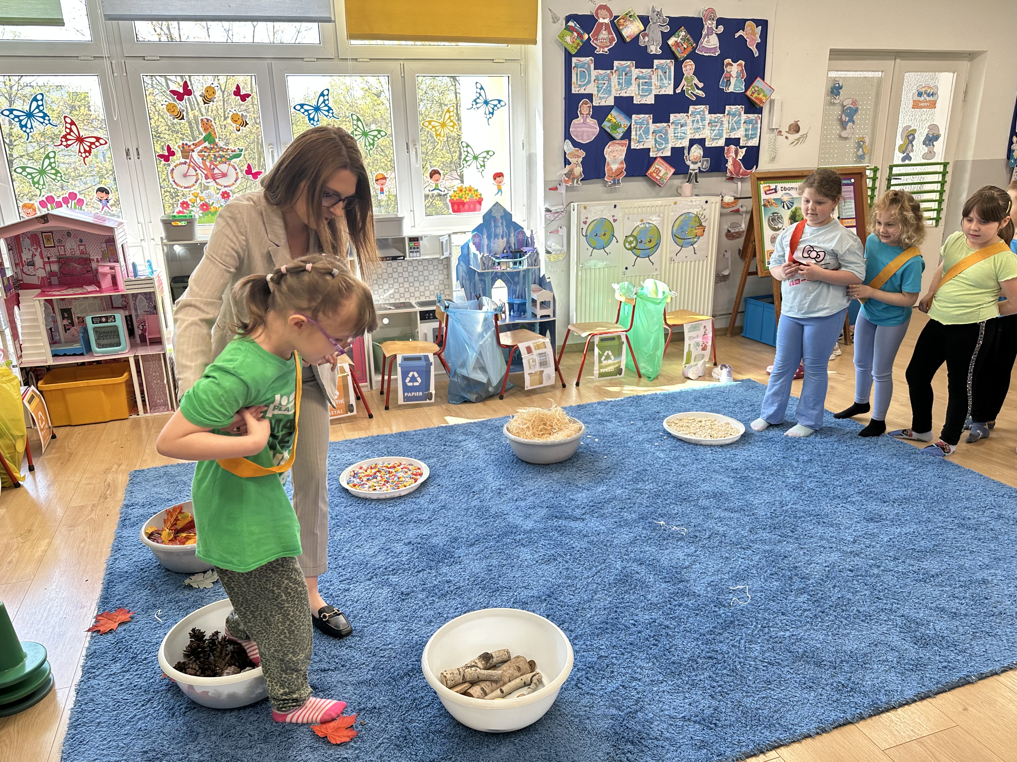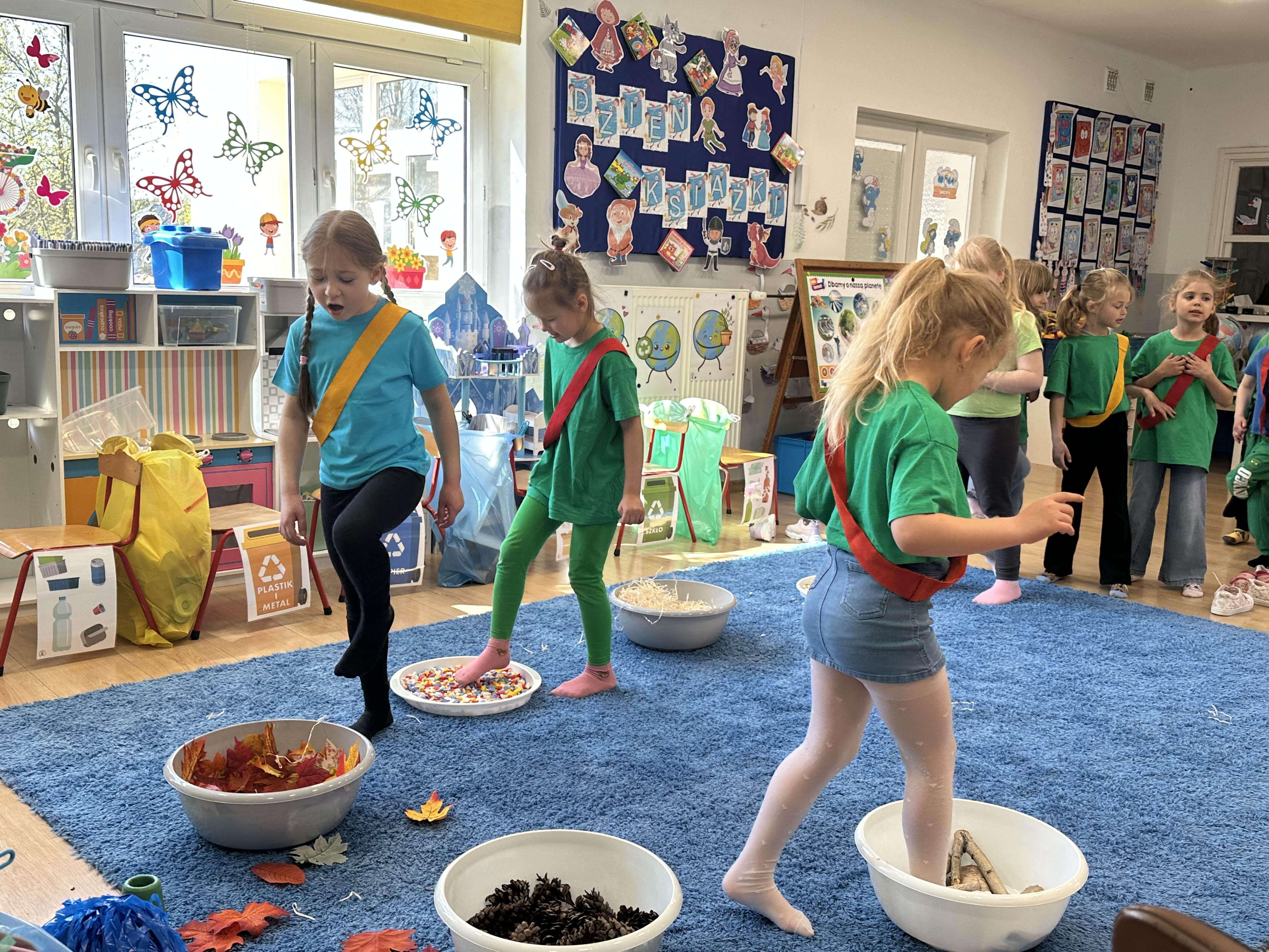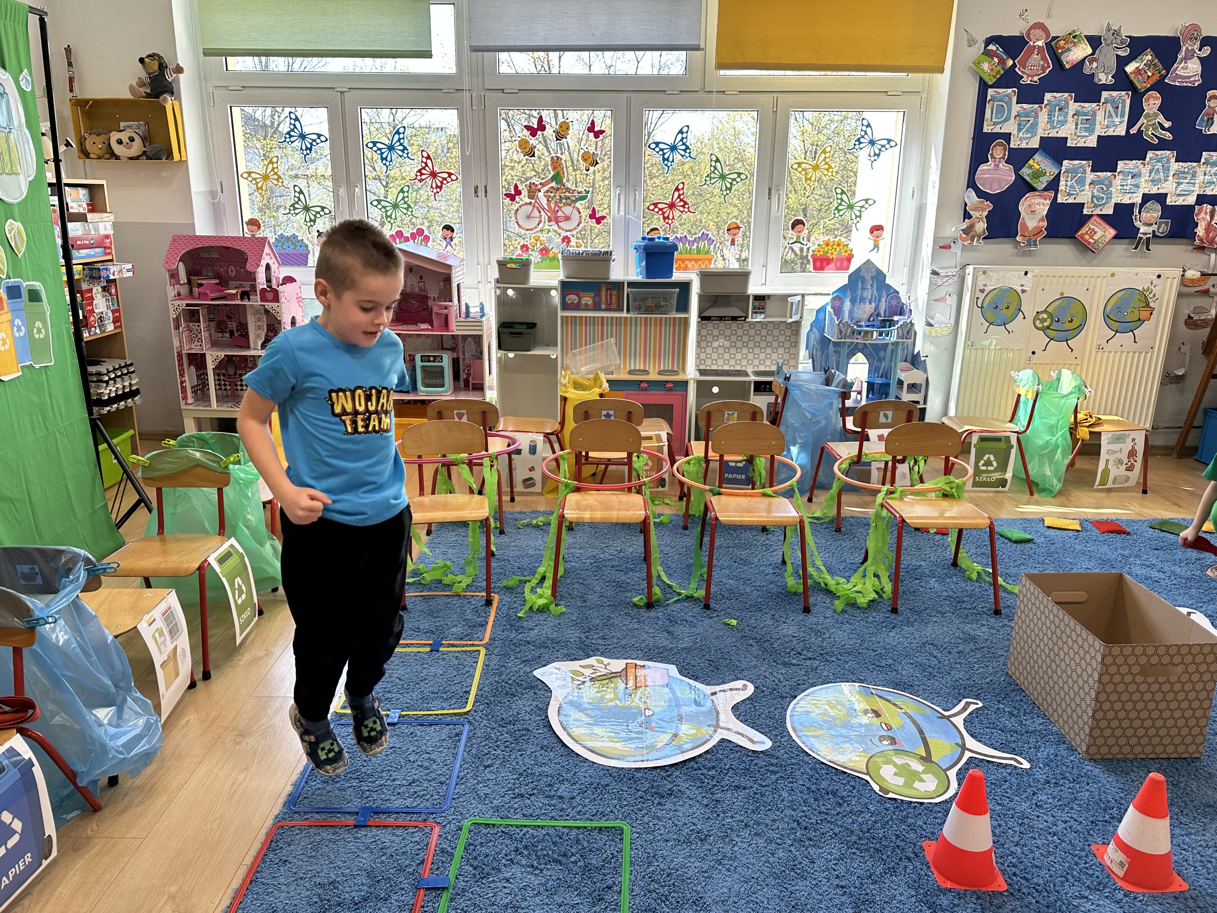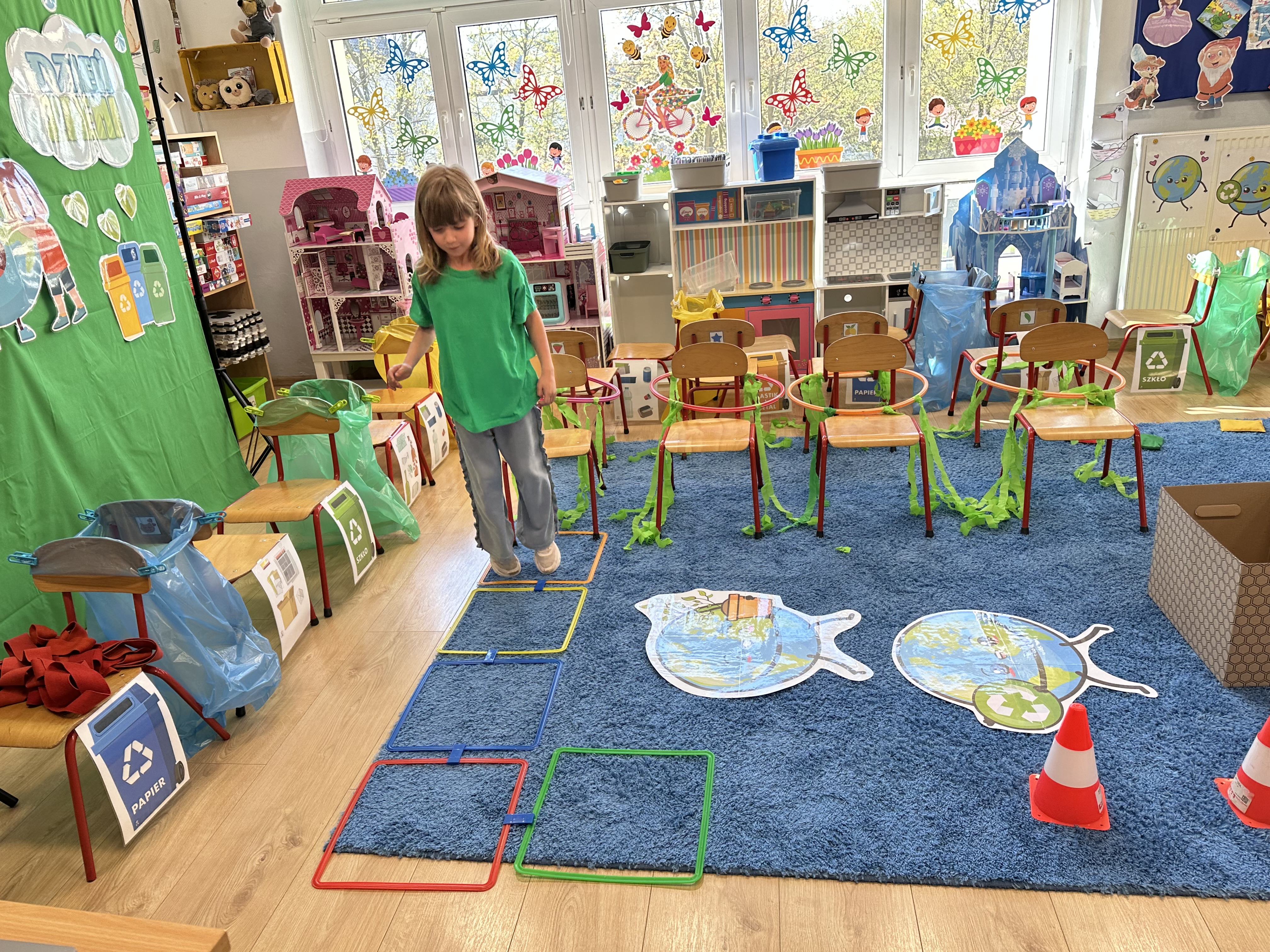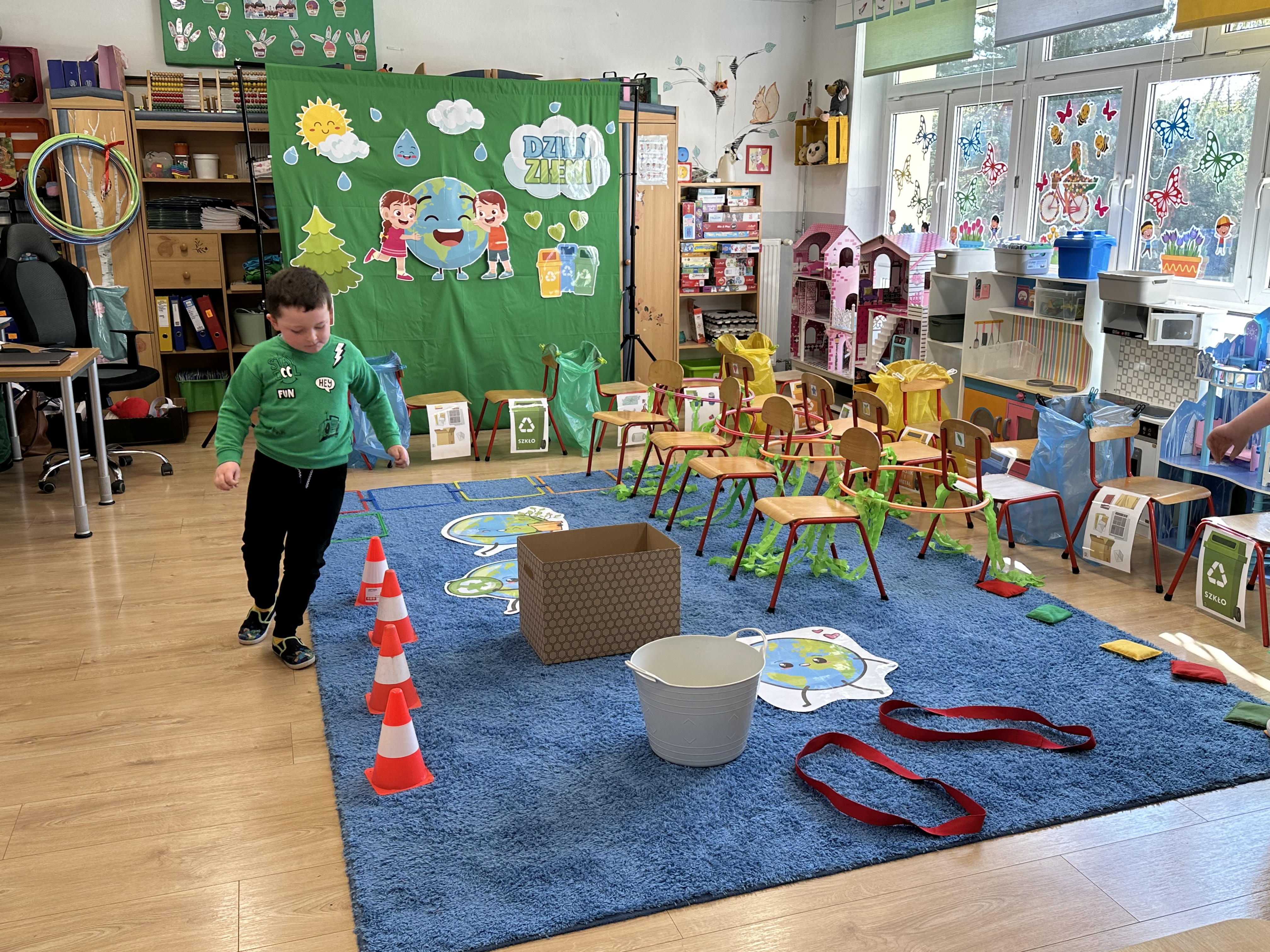 Kolejnym etapem było zadanie związane z ochroną mórz i oceanów. Dzieci „ratowały morze”, wyławiając z niebieskiego dywanu (symbolizującego wodę) różnego rodzaju odpady. Następnie uczyły się ich prawidłowej segregacji, co było doskonałą okazją do utrwalenia zasad dbania o środowisko.