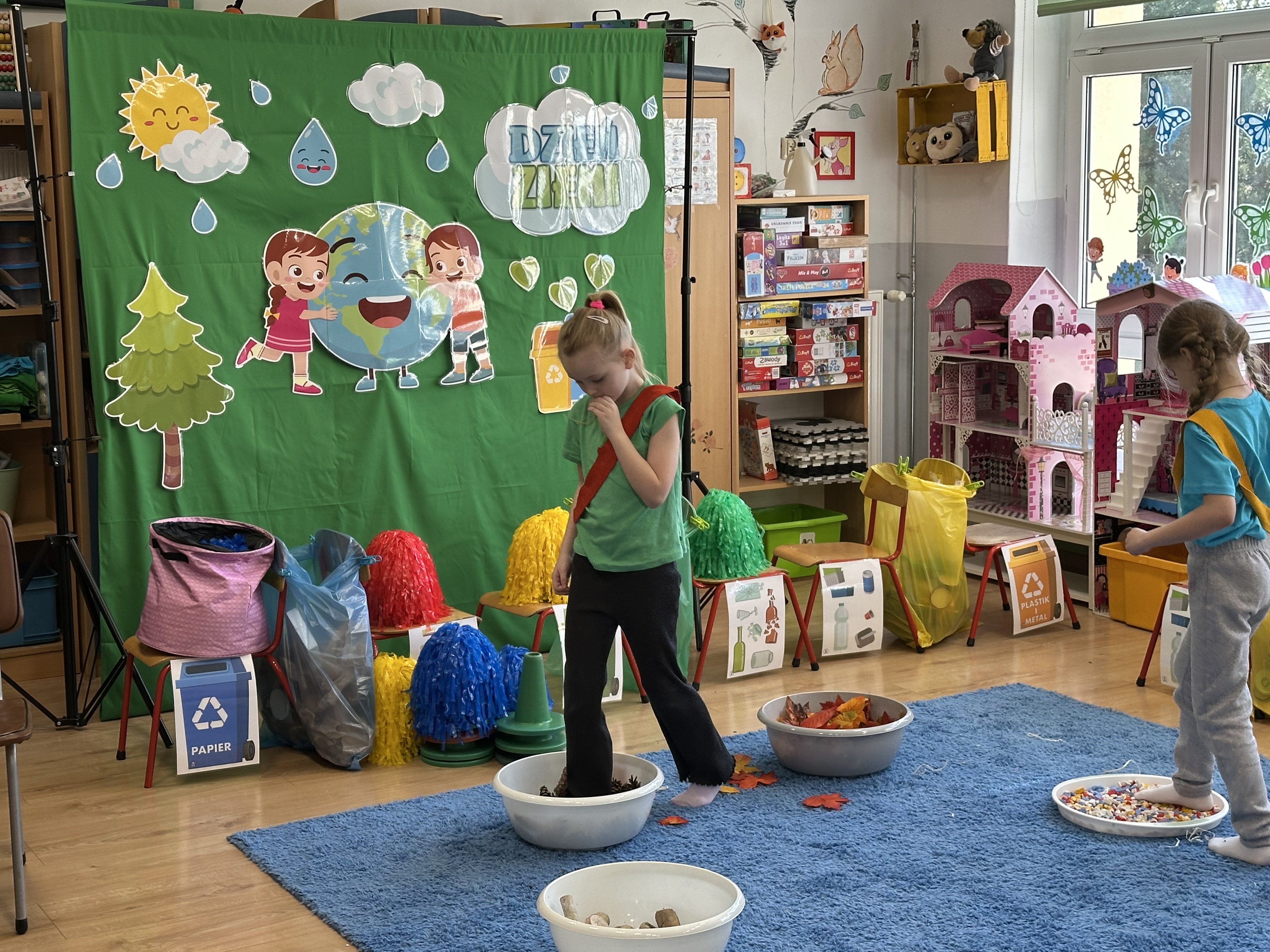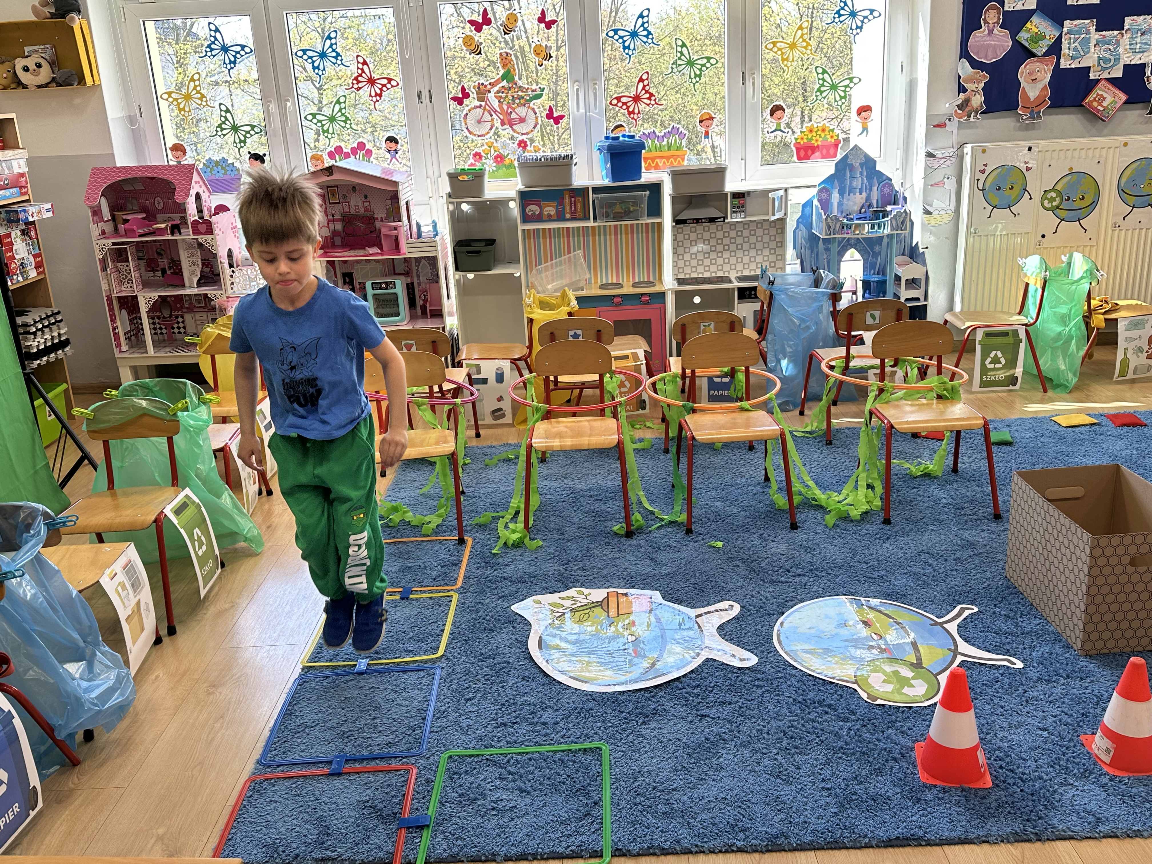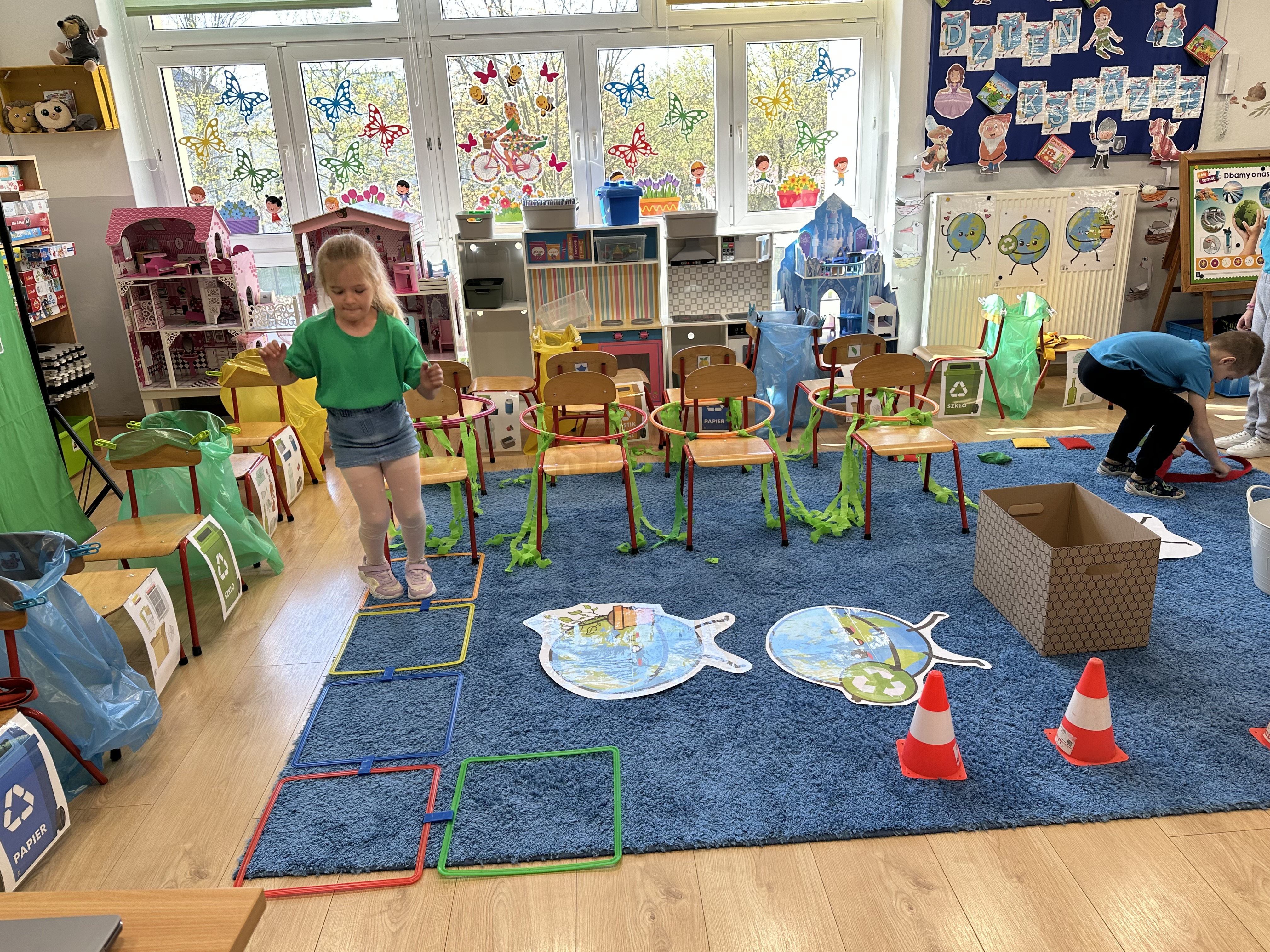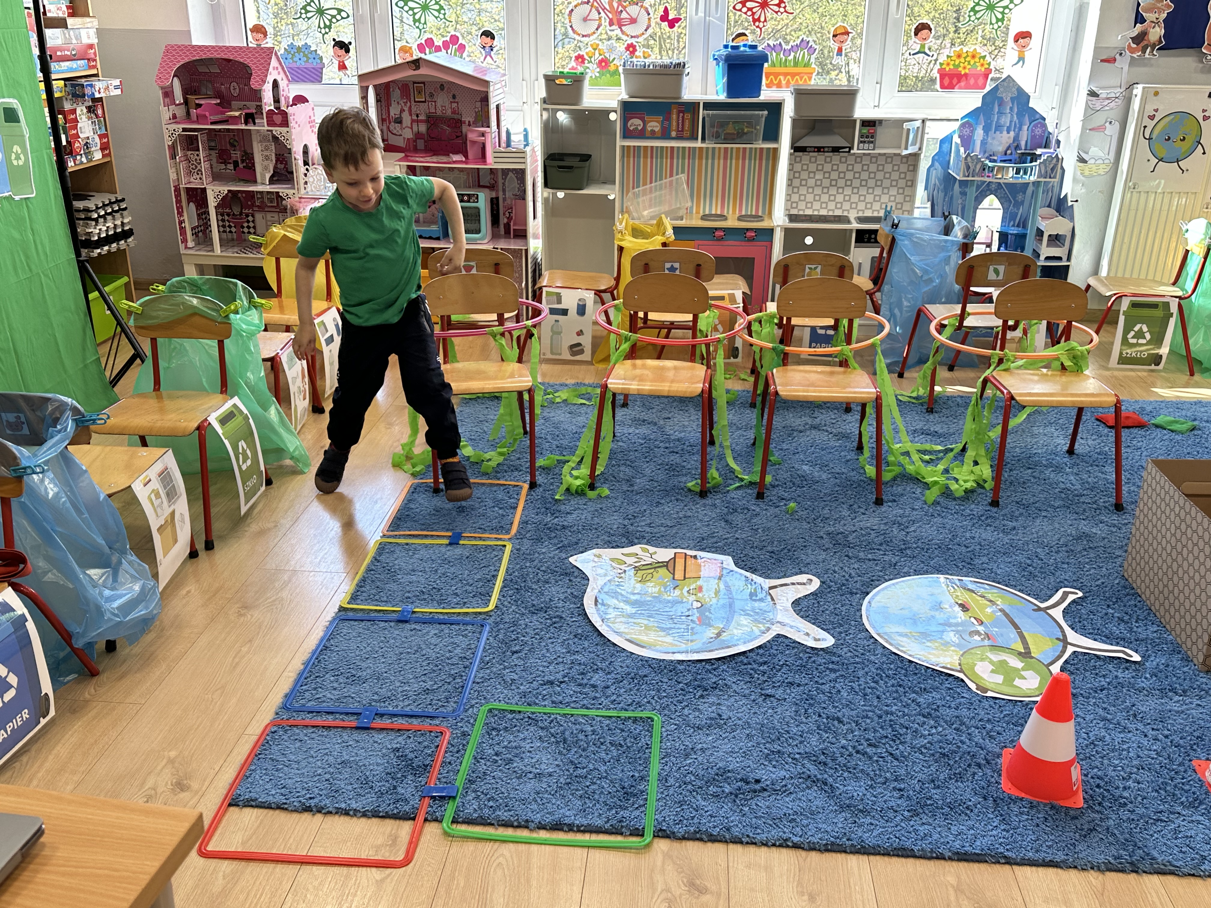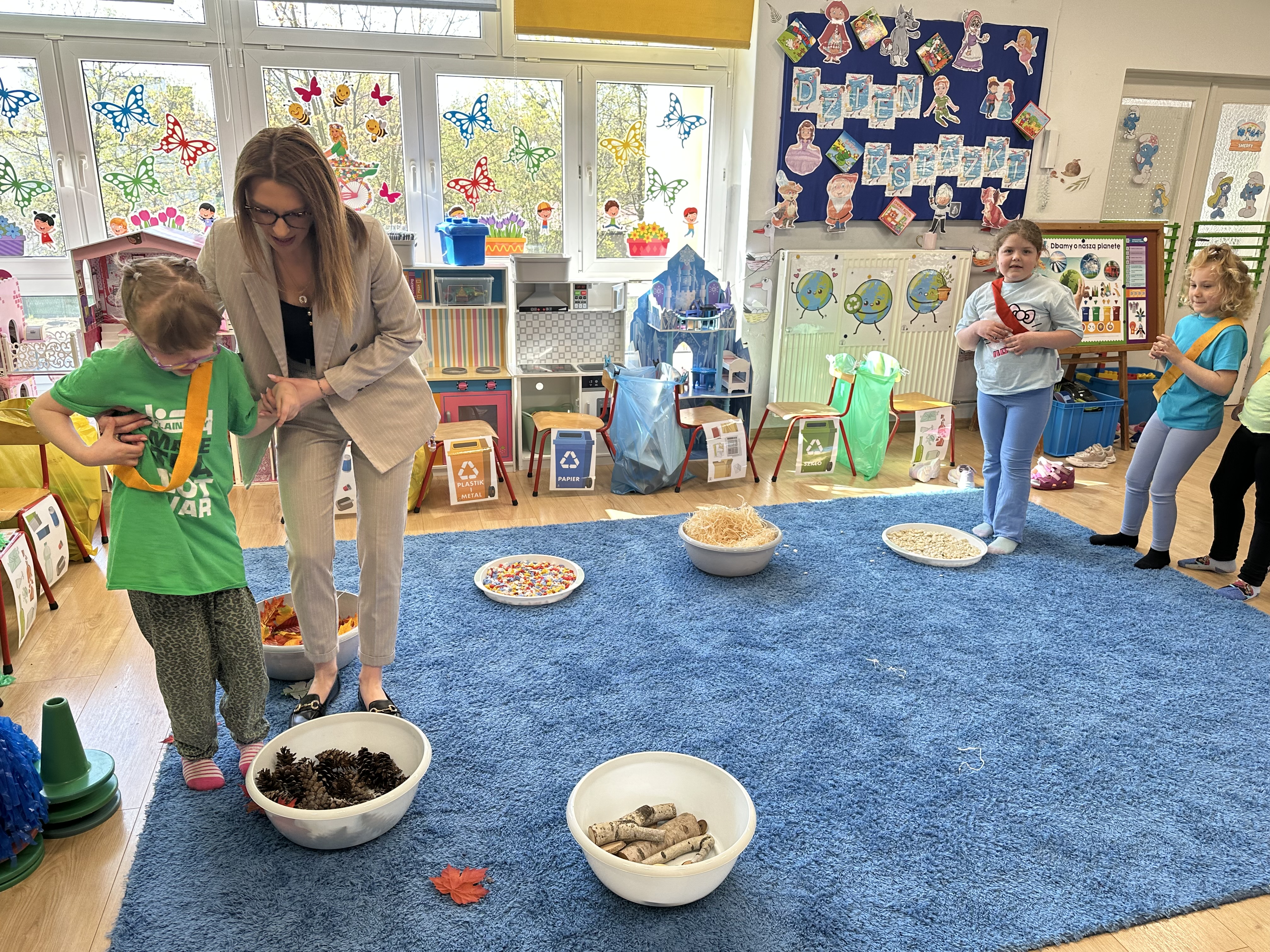 Kolejnym etapem było zadanie związane z ochroną mórz i oceanów. Dzieci „ratowały morze”, wyławiając z niebieskiego dywanu (symbolizującego wodę) różnego rodzaju odpady. Następnie uczyły się ich prawidłowej segregacji, co było doskonałą okazją do utrwalenia zasad dbania o środowisko.