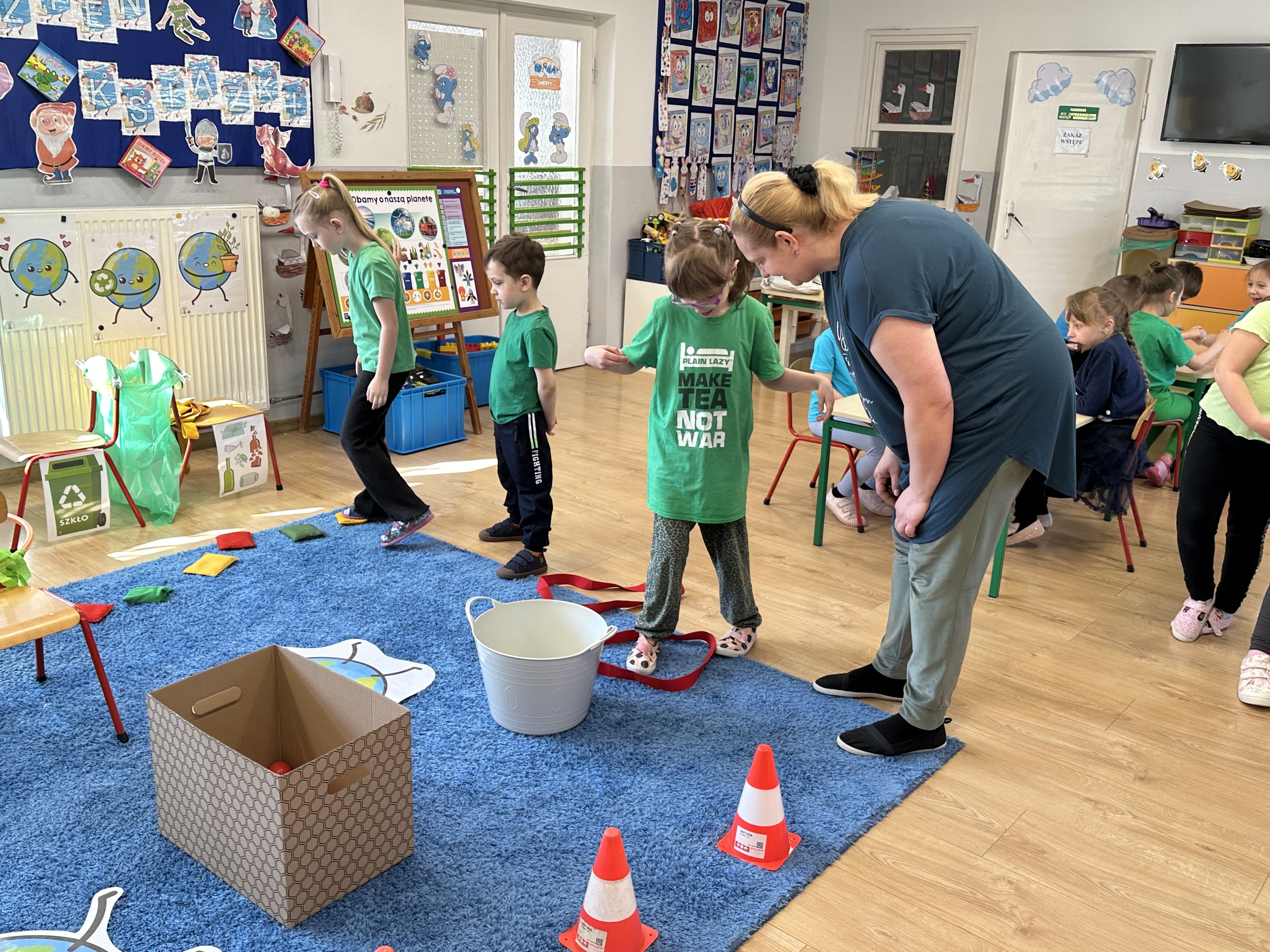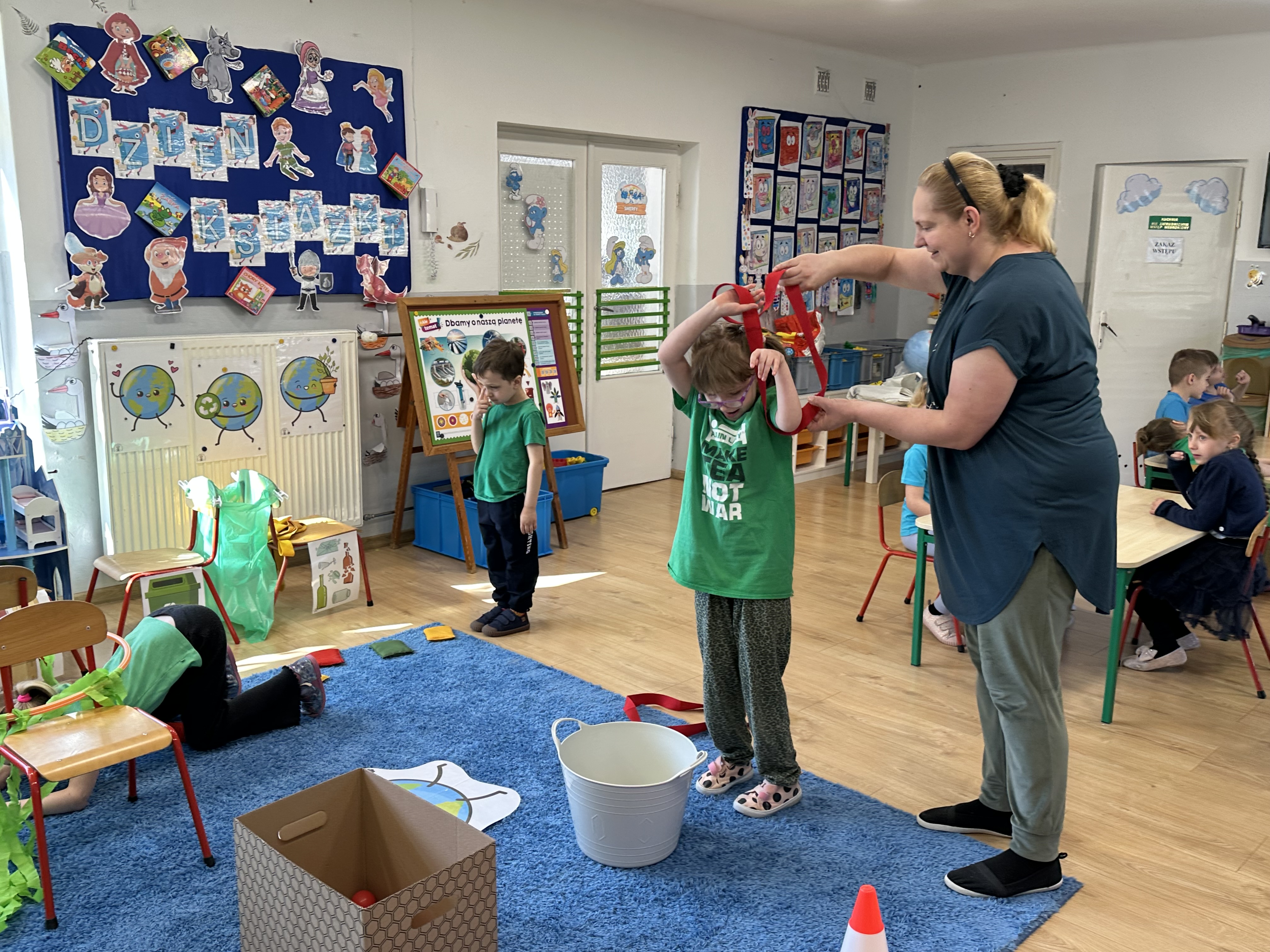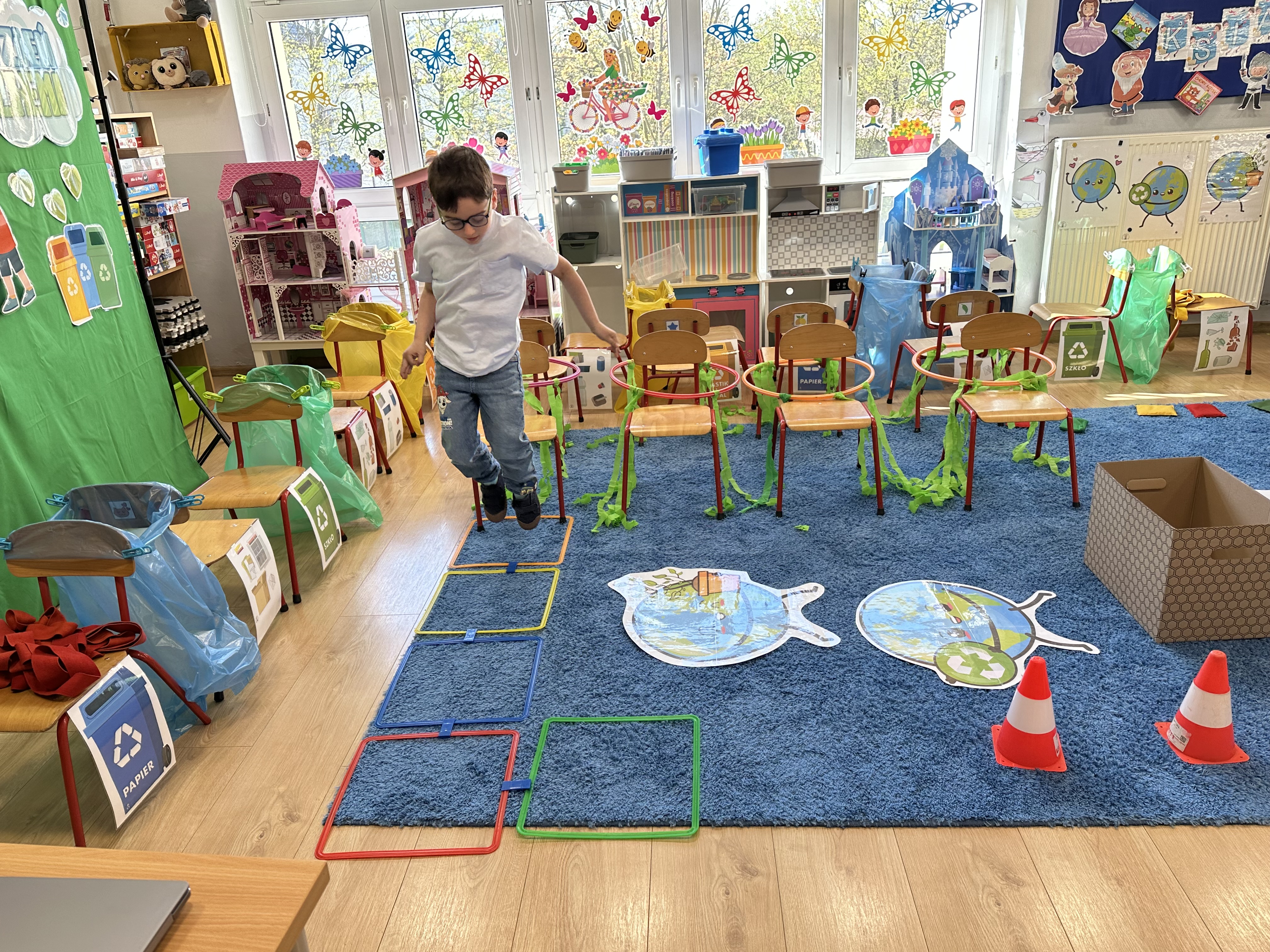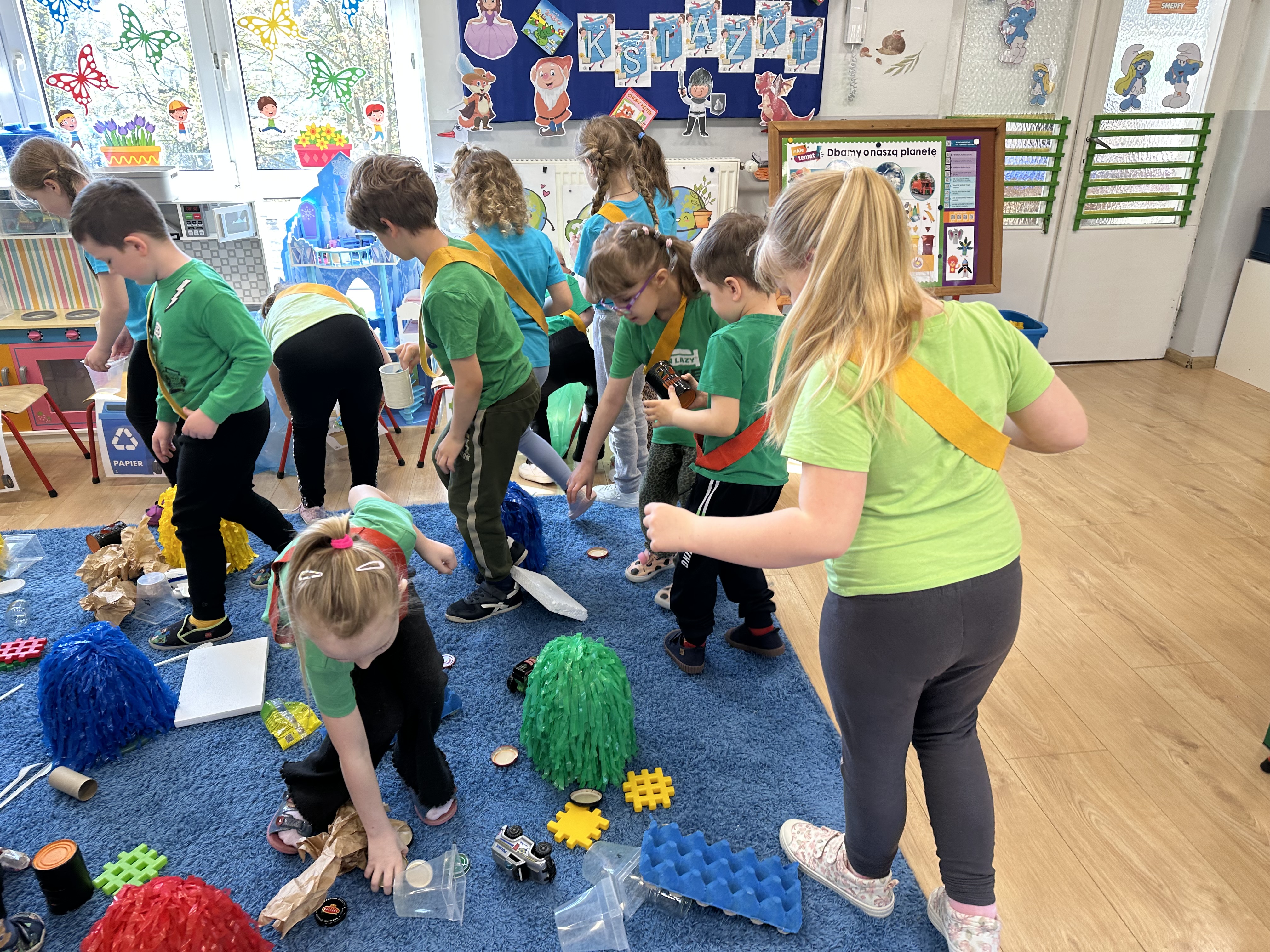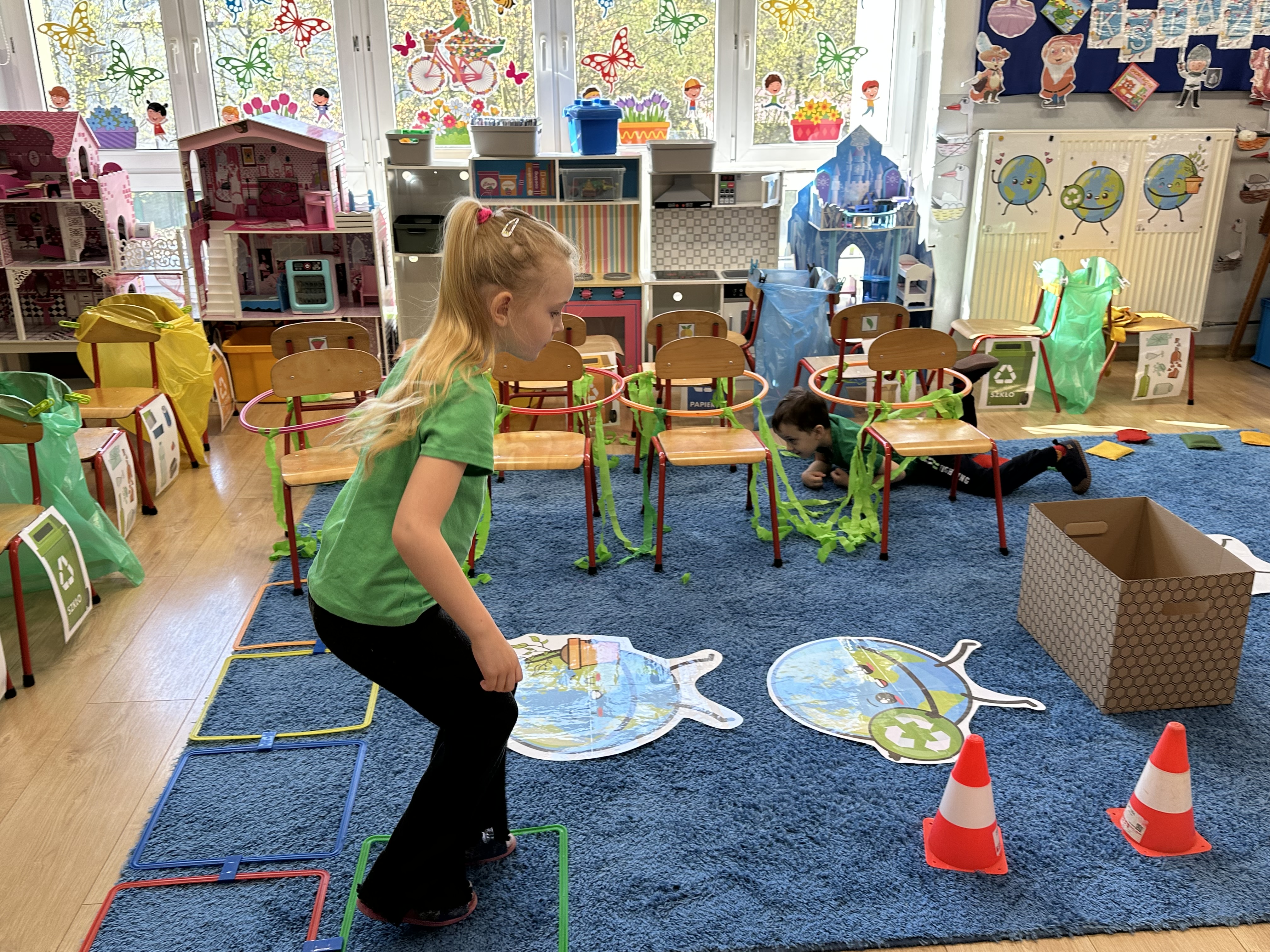 Kolejnym etapem było zadanie związane z ochroną mórz i oceanów. Dzieci „ratowały morze”, wyławiając z niebieskiego dywanu (symbolizującego wodę) różnego rodzaju odpady. Następnie uczyły się ich prawidłowej segregacji, co było doskonałą okazją do utrwalenia zasad dbania o środowisko.