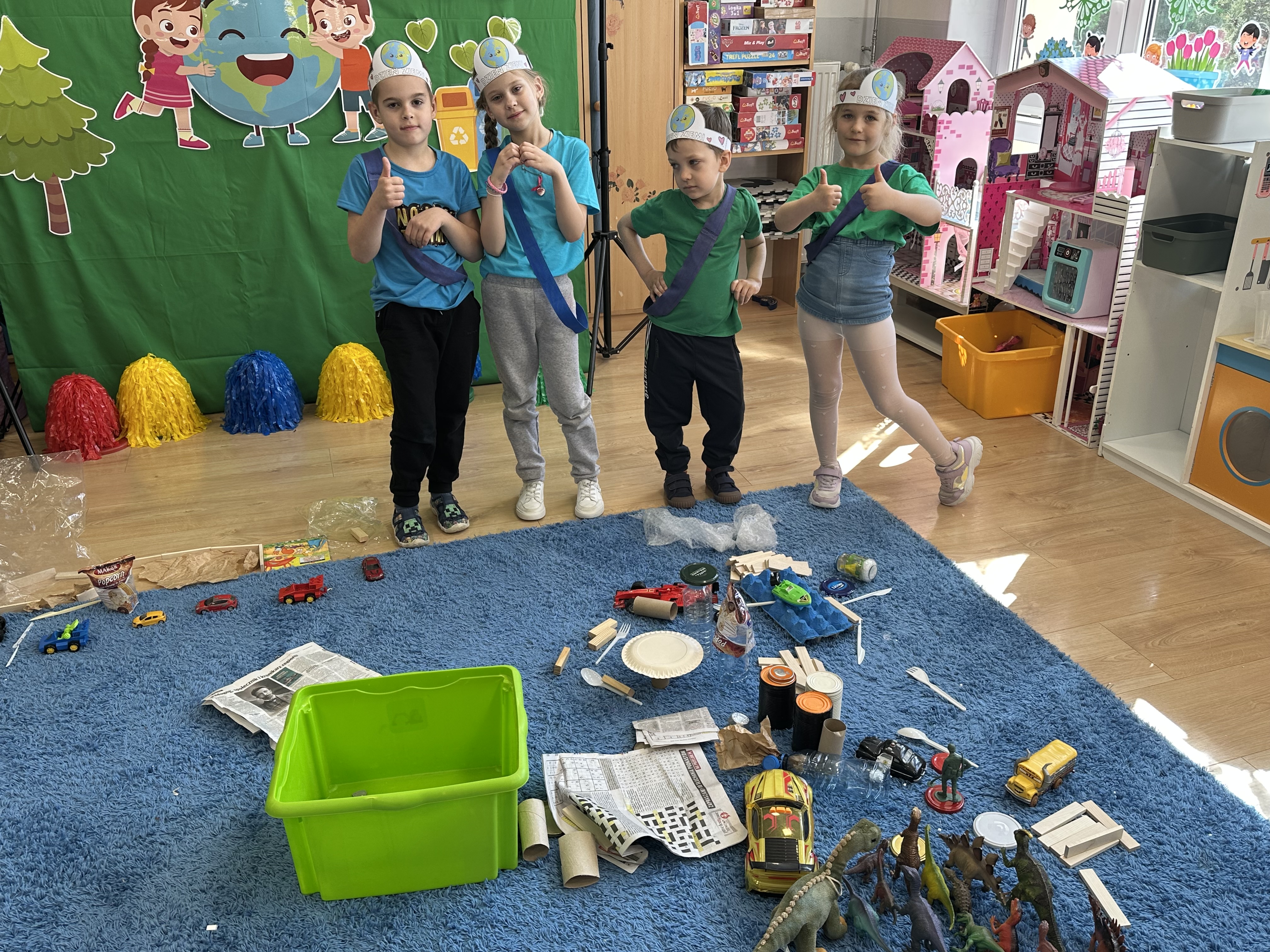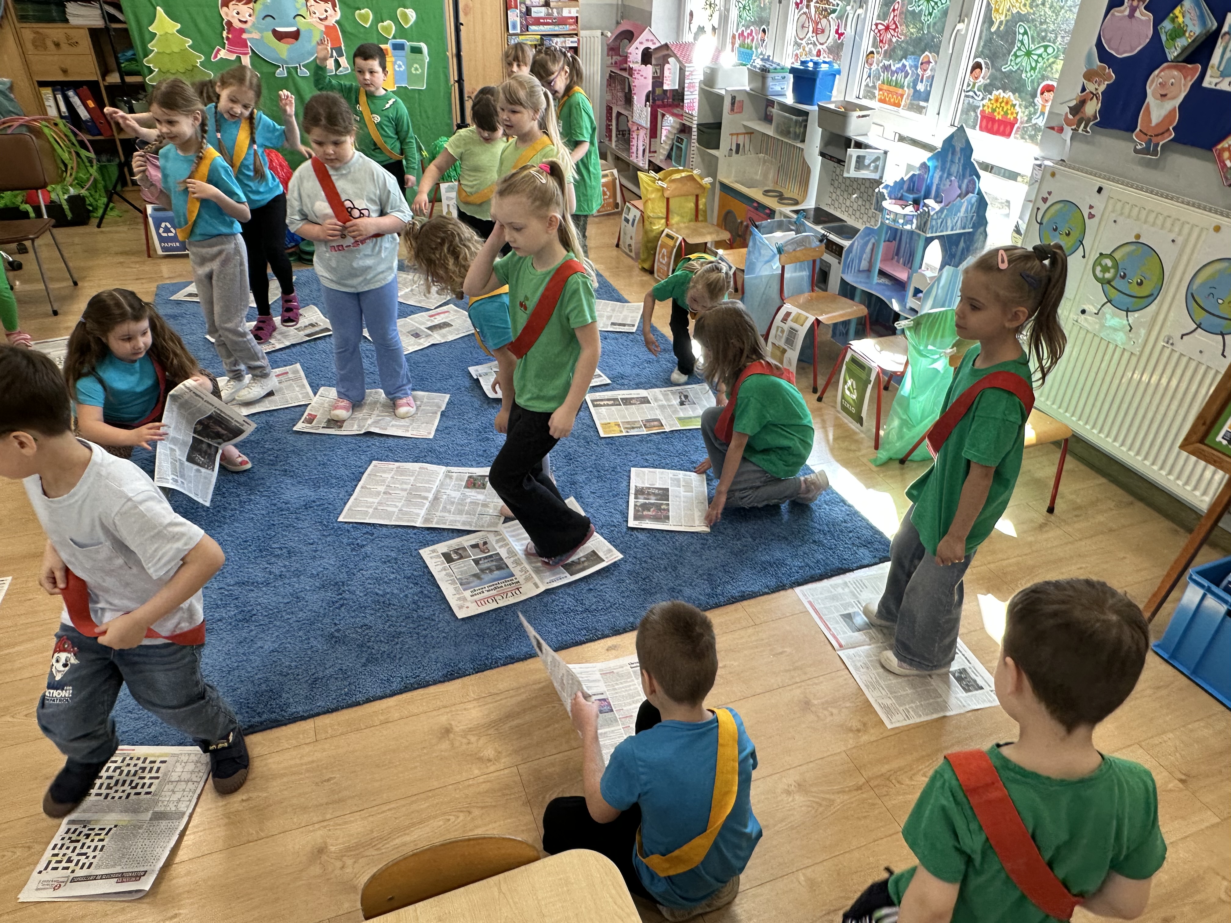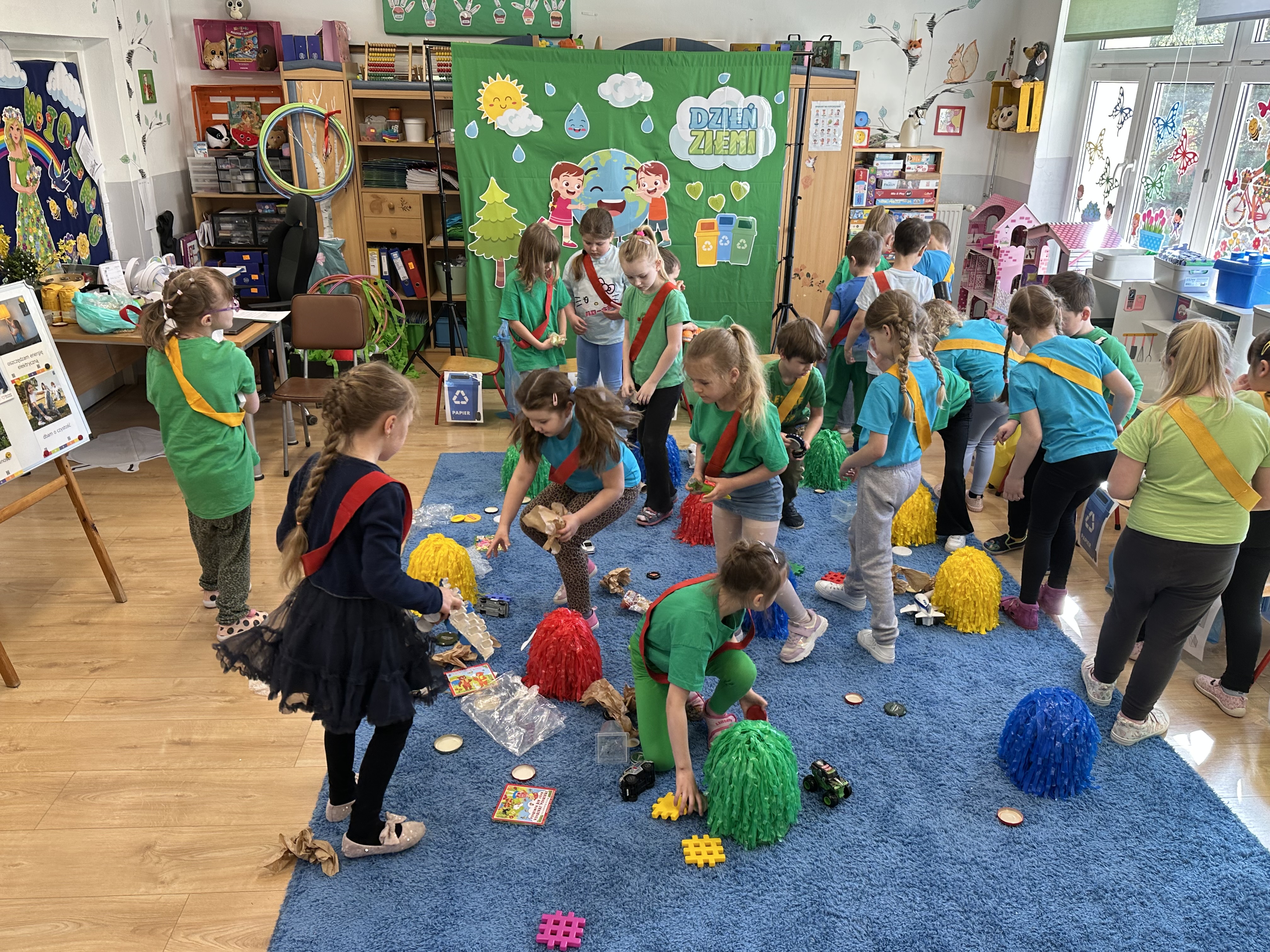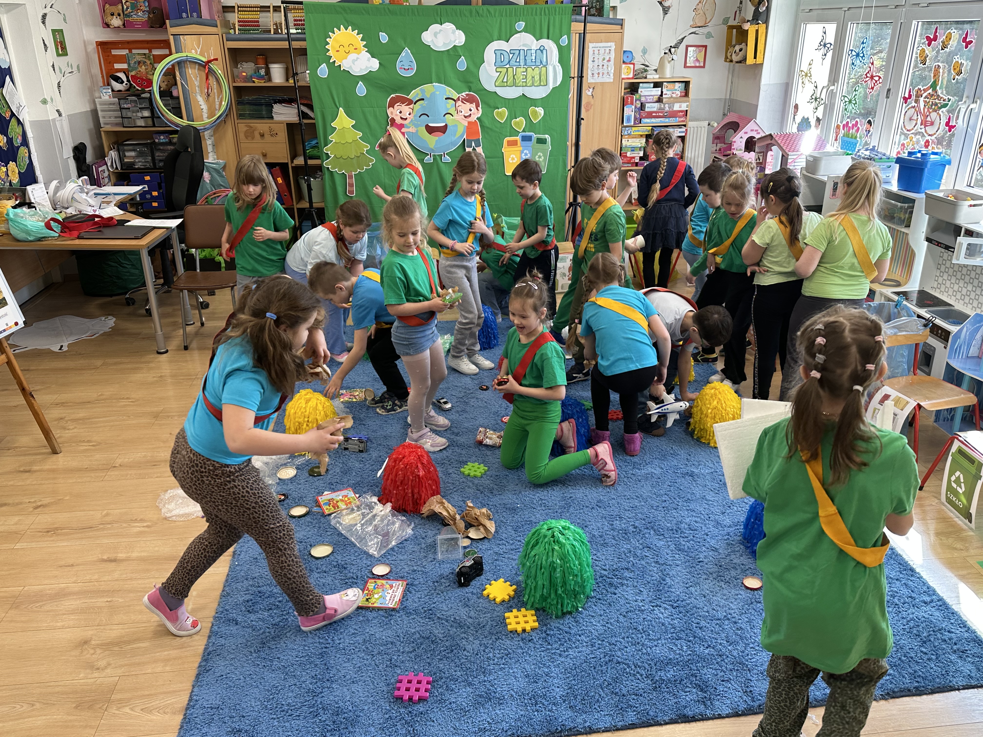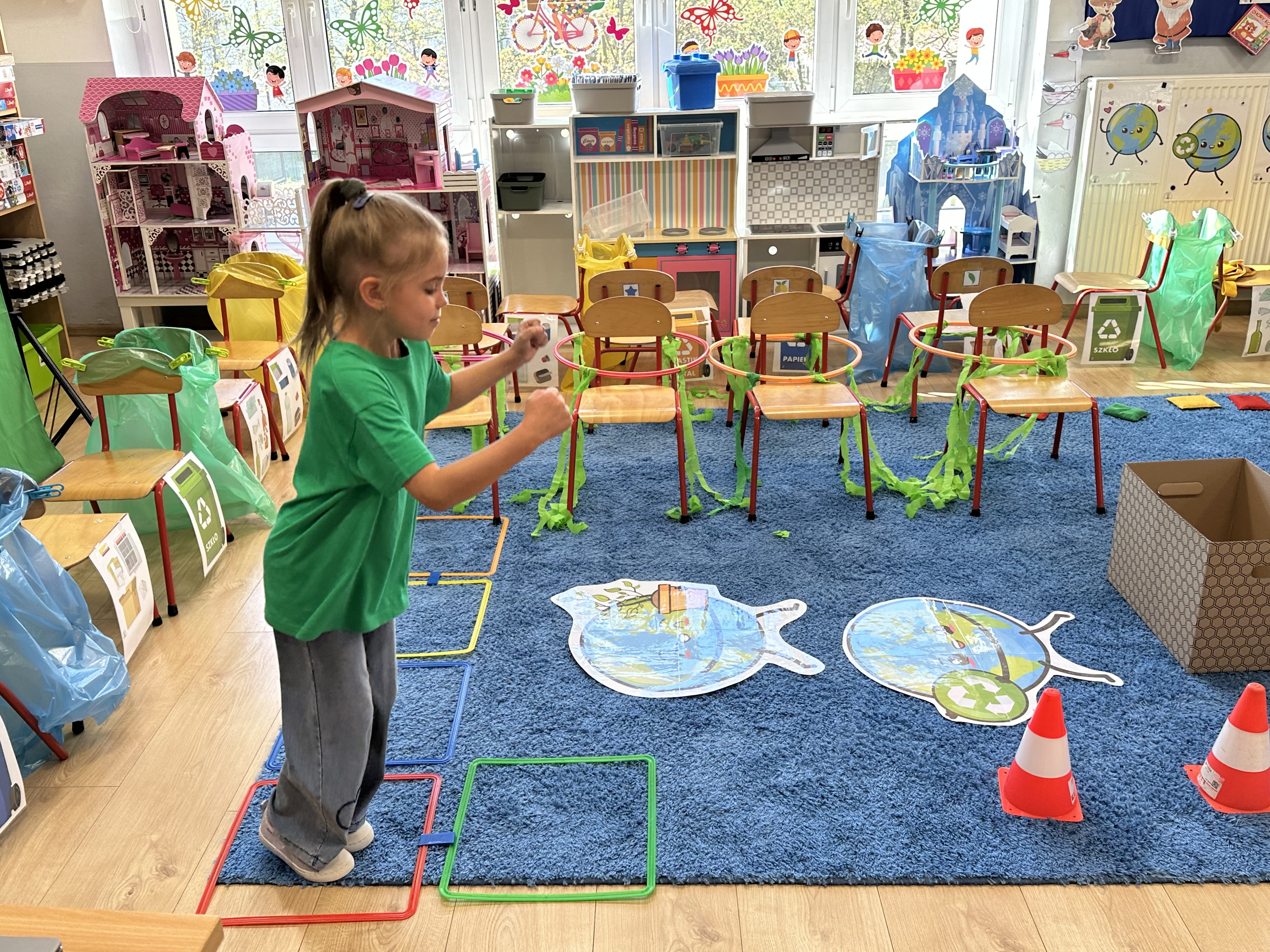 Kolejnym etapem było zadanie związane z ochroną mórz i oceanów. Dzieci „ratowały morze”, wyławiając z niebieskiego dywanu (symbolizującego wodę) różnego rodzaju odpady. Następnie uczyły się ich prawidłowej segregacji, co było doskonałą okazją do utrwalenia zasad dbania o środowisko.