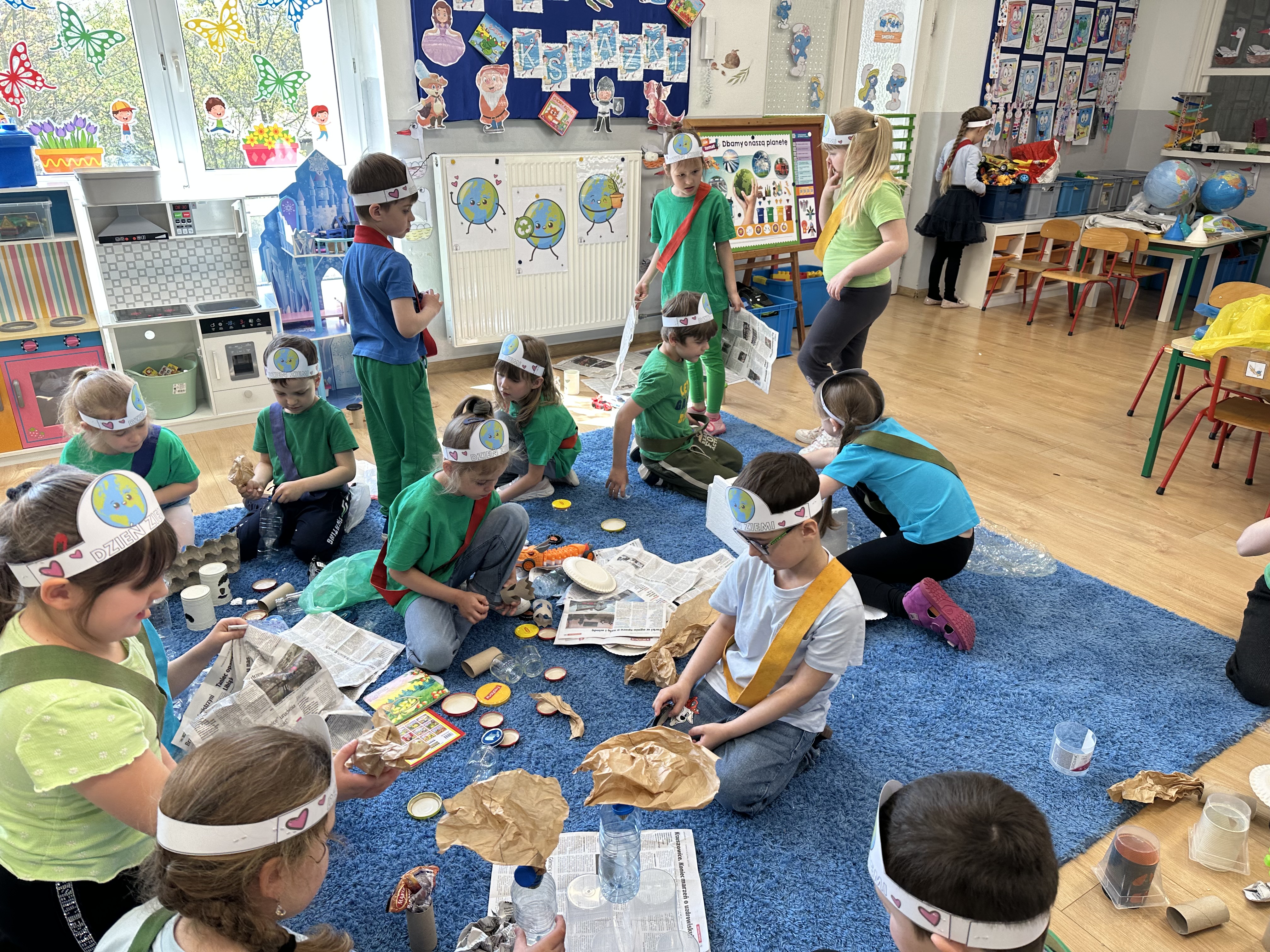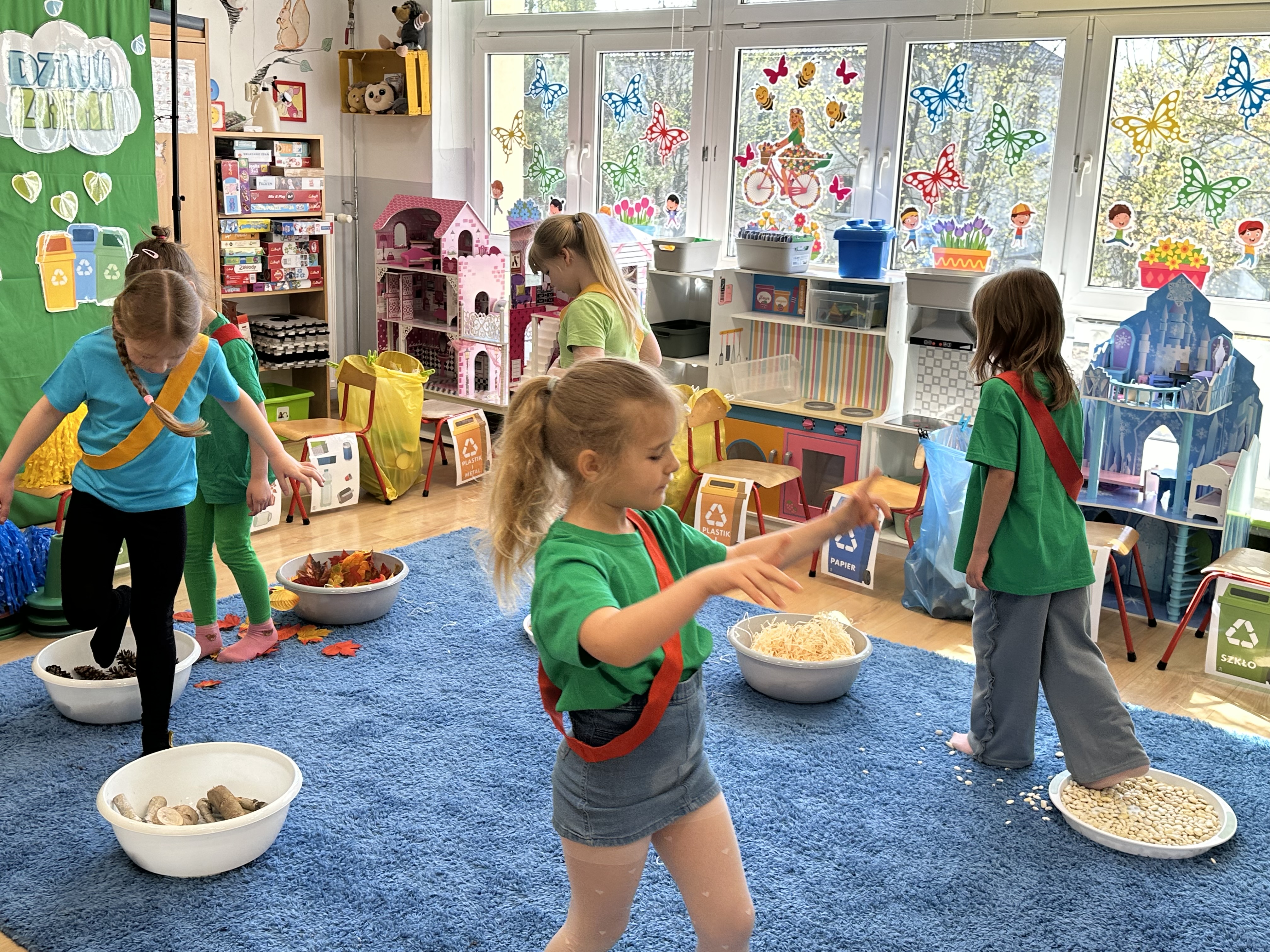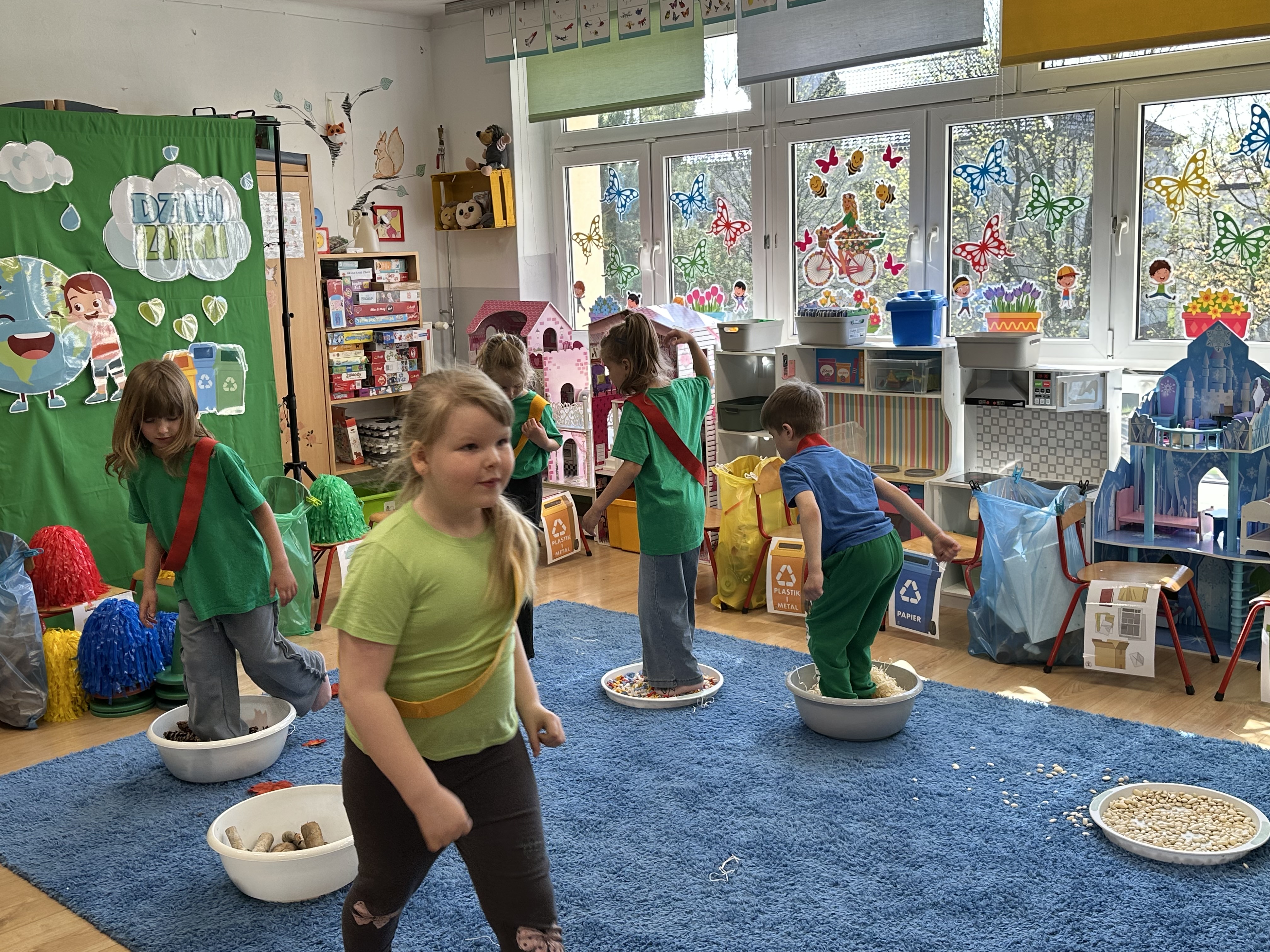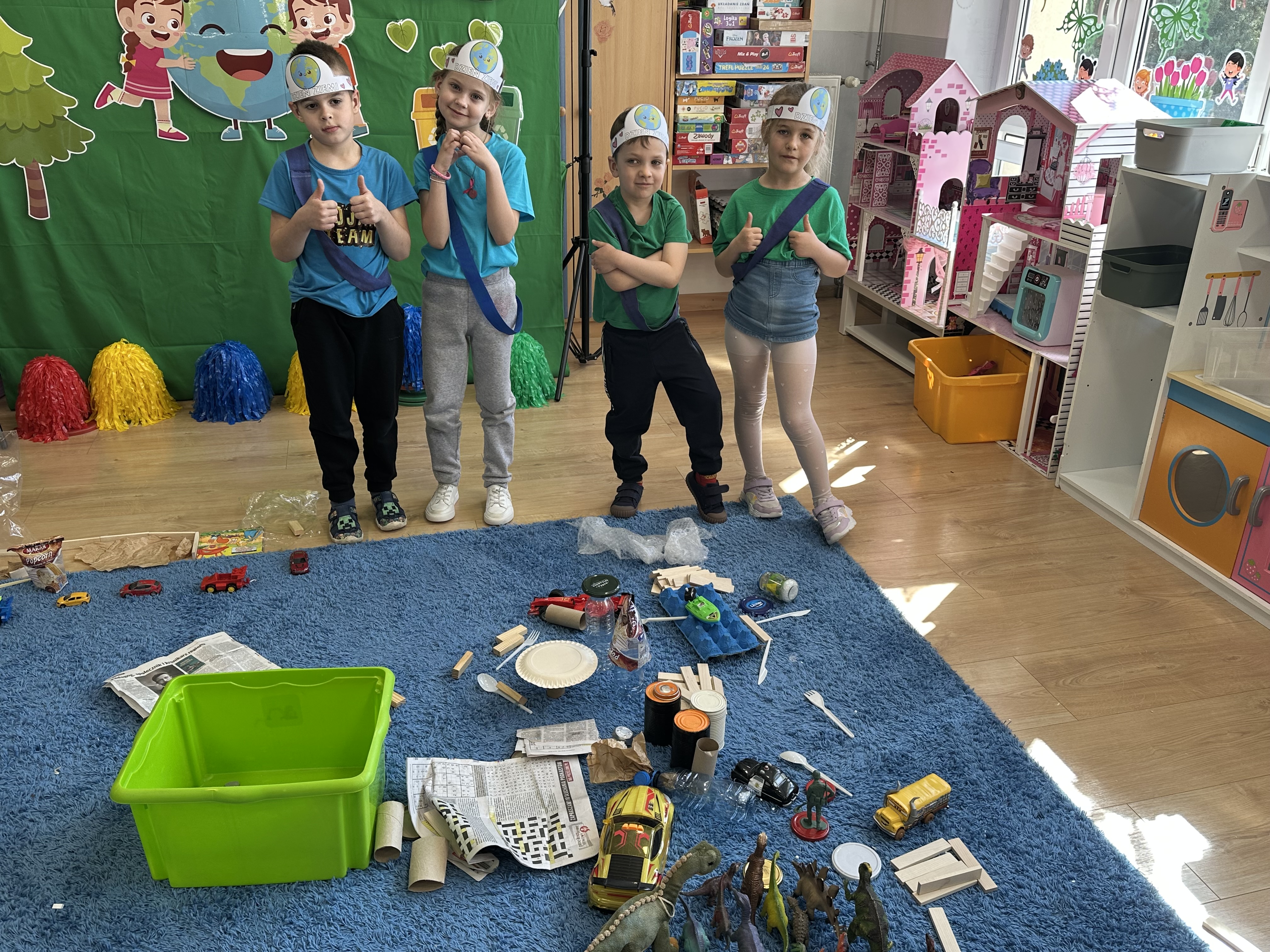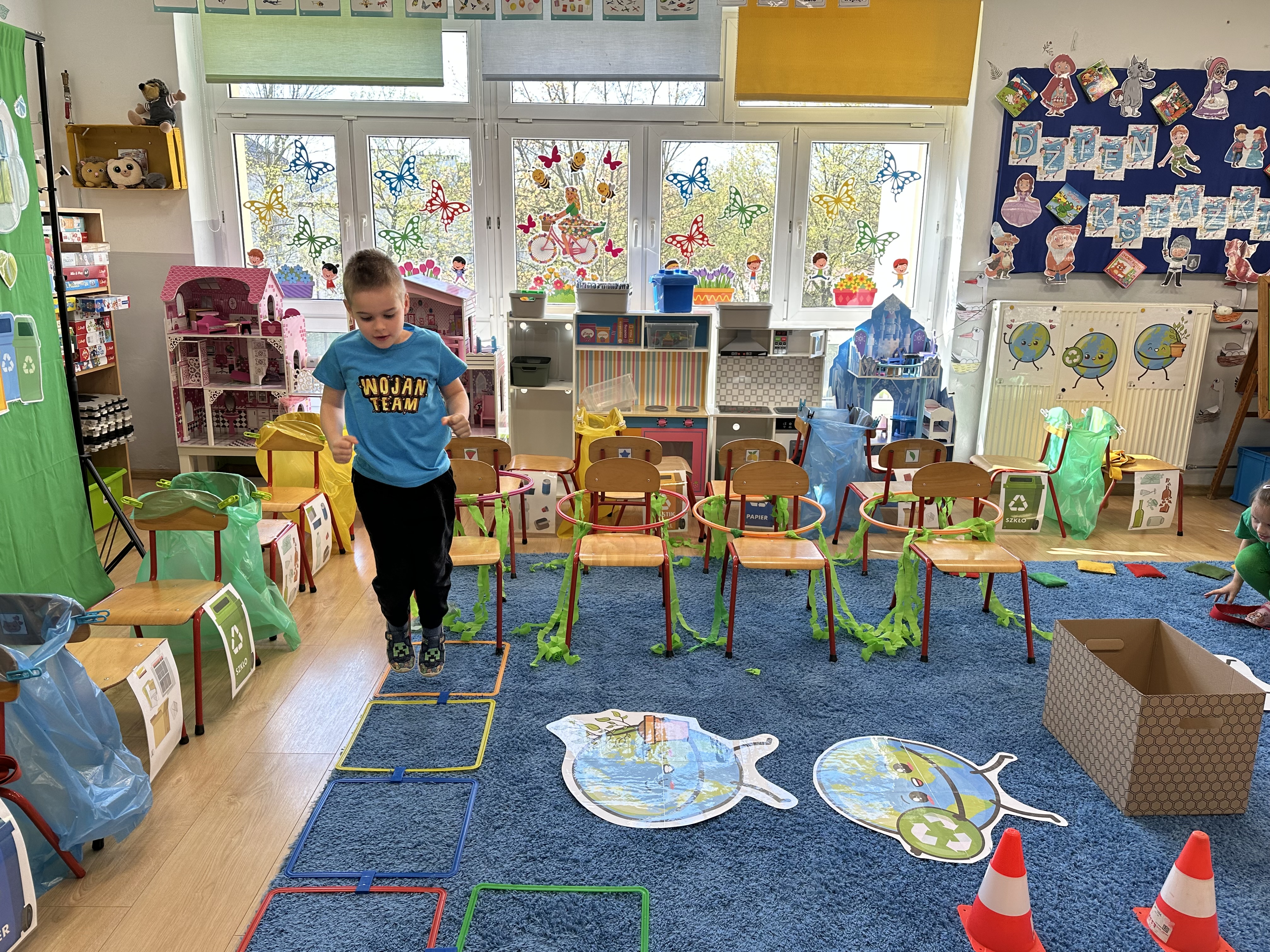Kolejnym etapem było zadanie związane z ochroną mórz i oceanów. Dzieci „ratowały morze”, wyławiając z niebieskiego dywanu (symbolizującego wodę) różnego rodzaju odpady. Następnie uczyły się ich prawidłowej segregacji, co było doskonałą okazją do utrwalenia zasad dbania o środowisko.