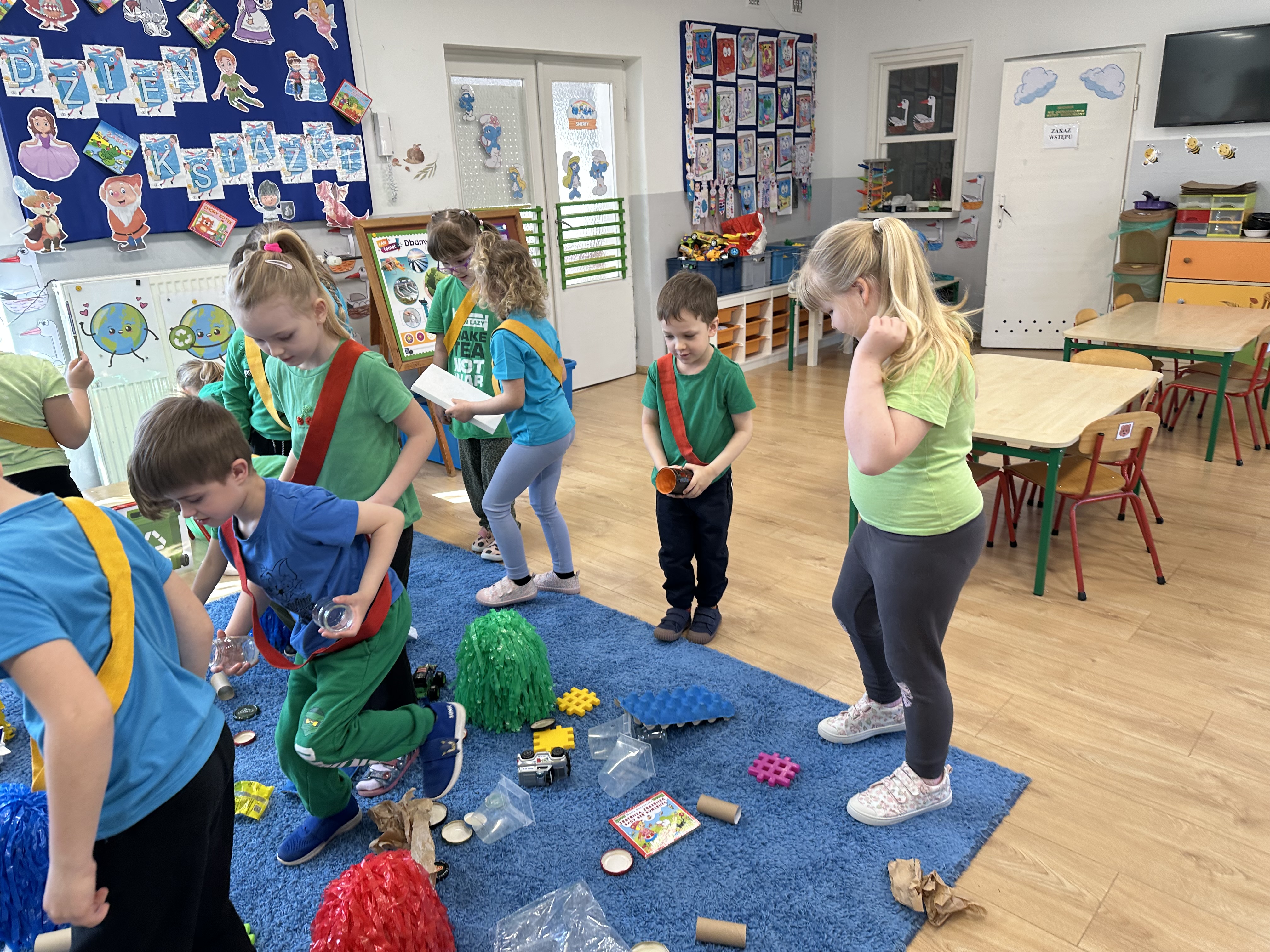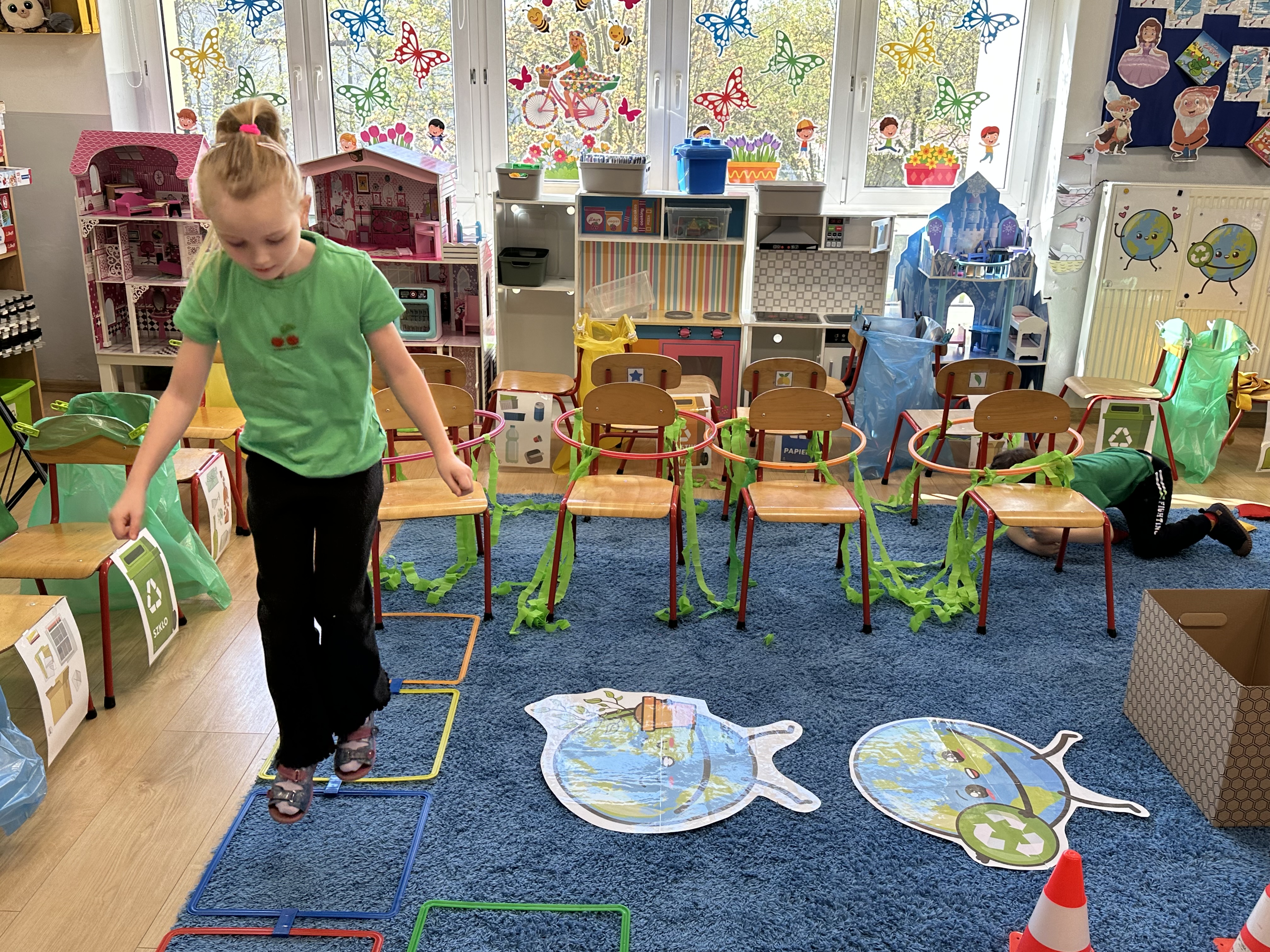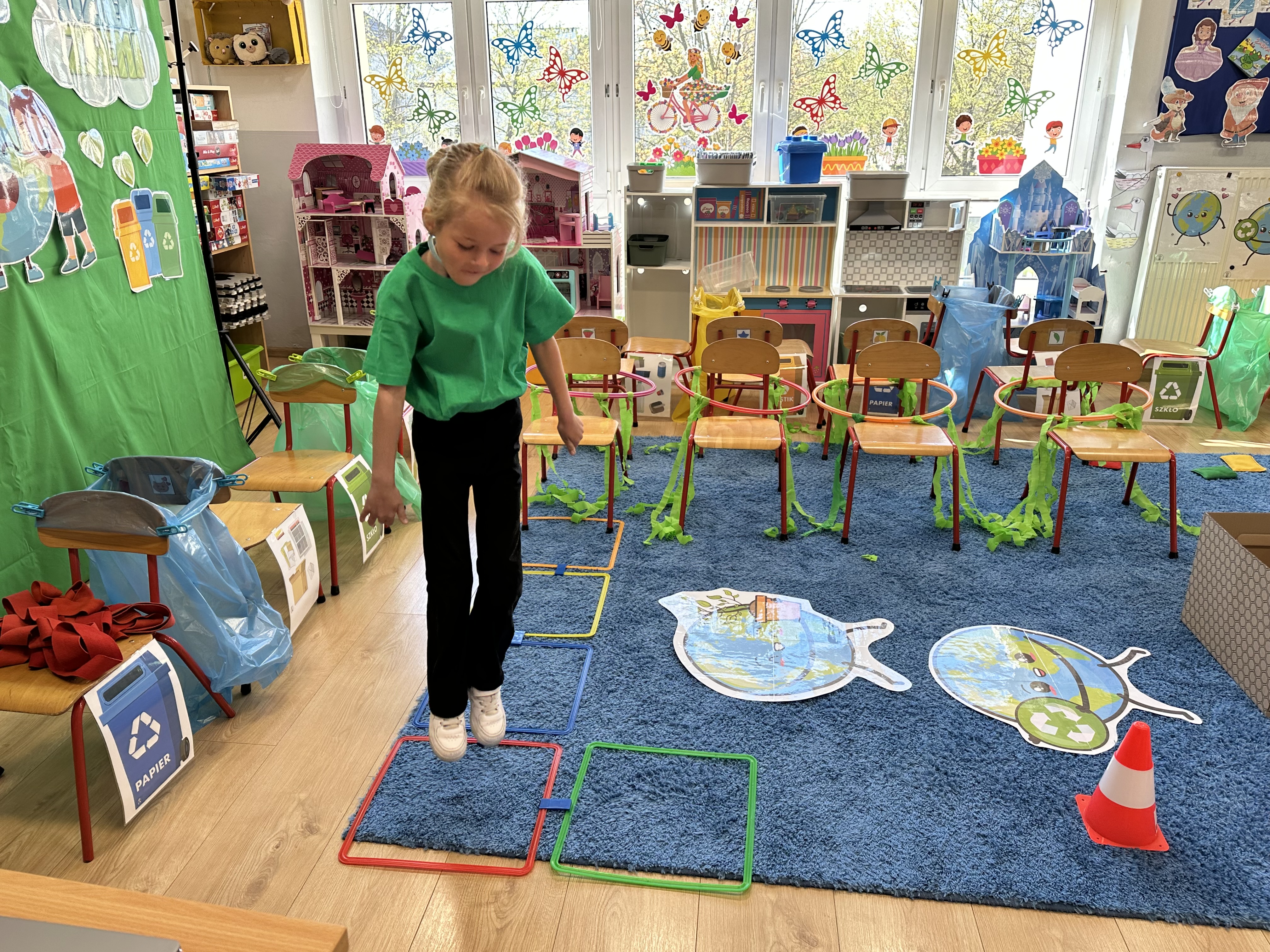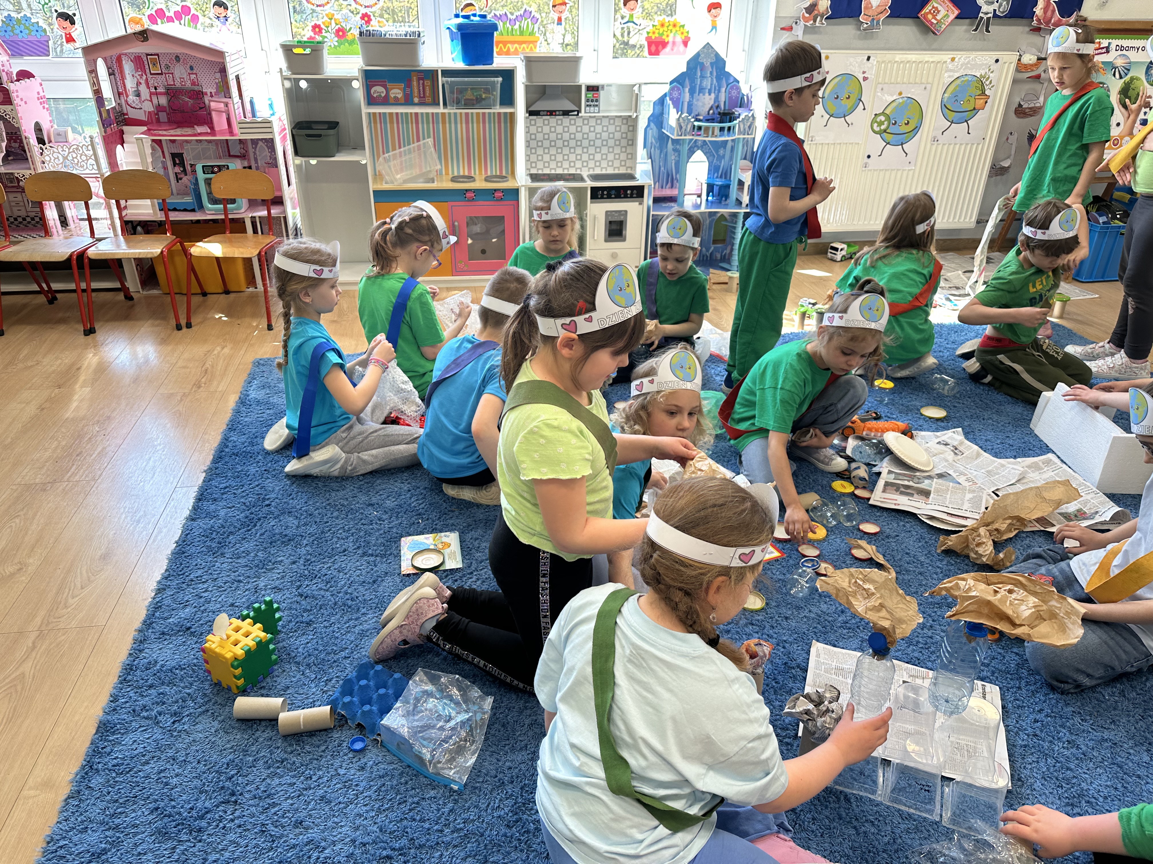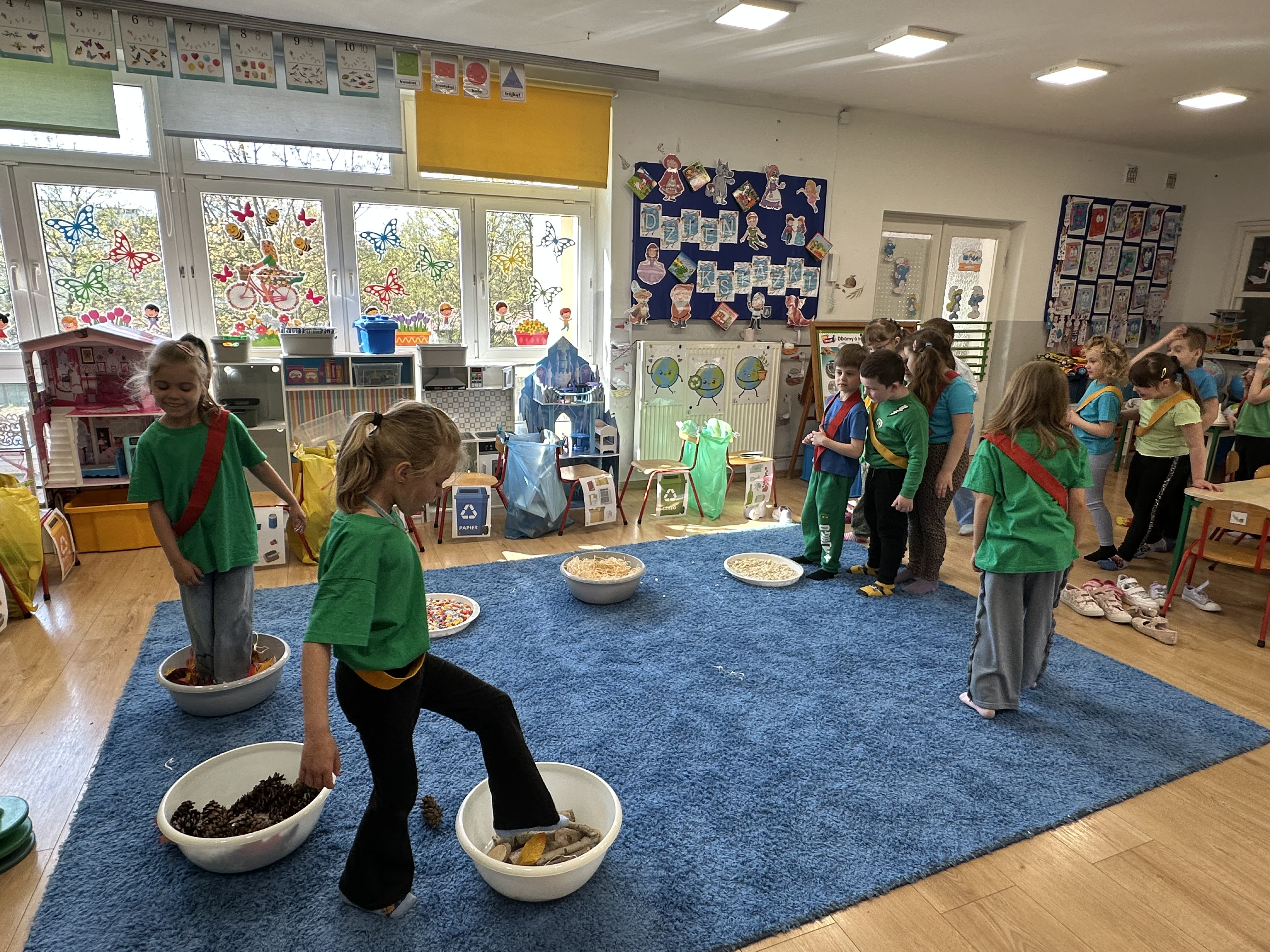 Kolejnym etapem było zadanie związane z ochroną mórz i oceanów. Dzieci „ratowały morze”, wyławiając z niebieskiego dywanu (symbolizującego wodę) różnego rodzaju odpady. Następnie uczyły się ich prawidłowej segregacji, co było doskonałą okazją do utrwalenia zasad dbania o środowisko.