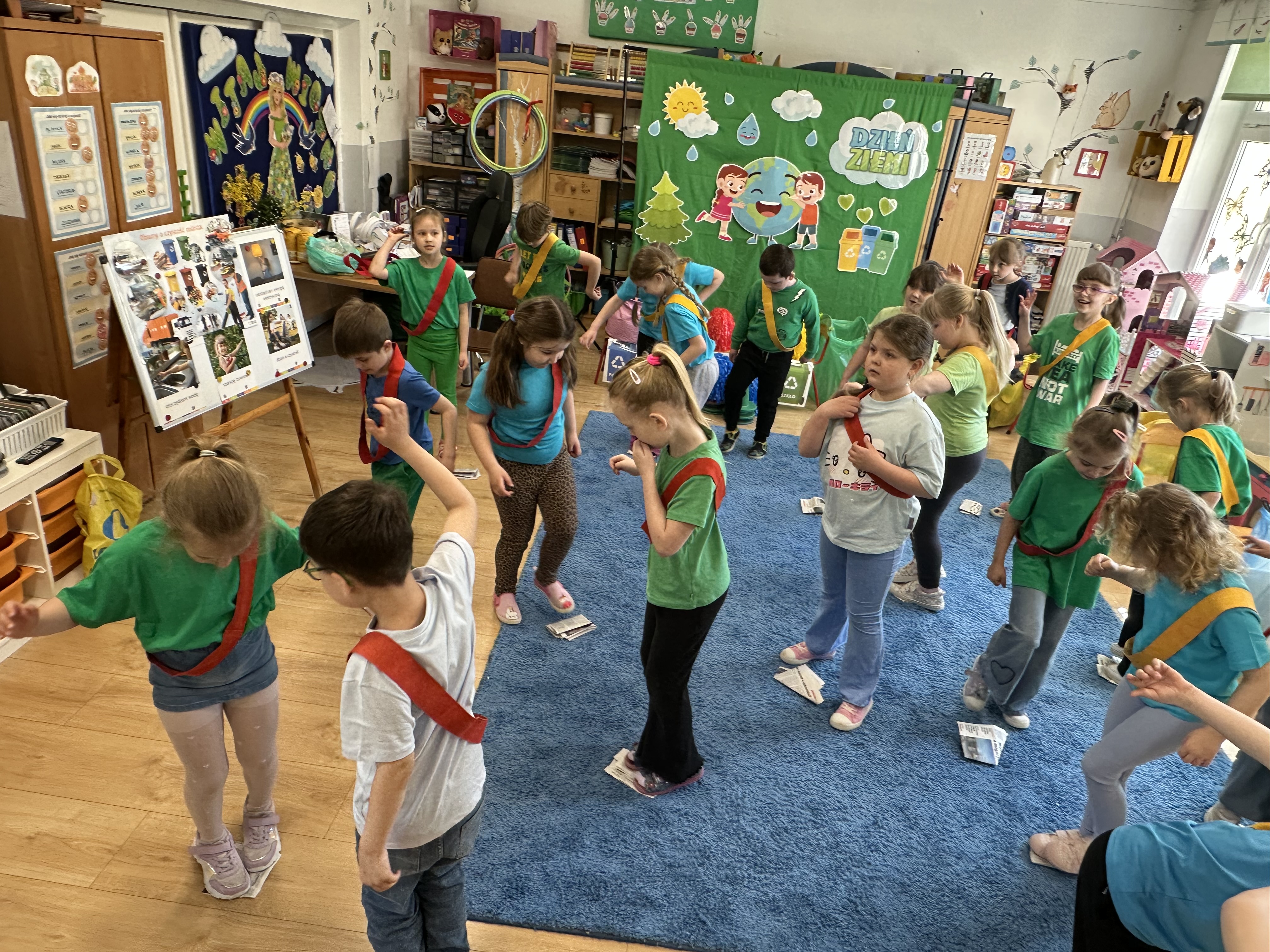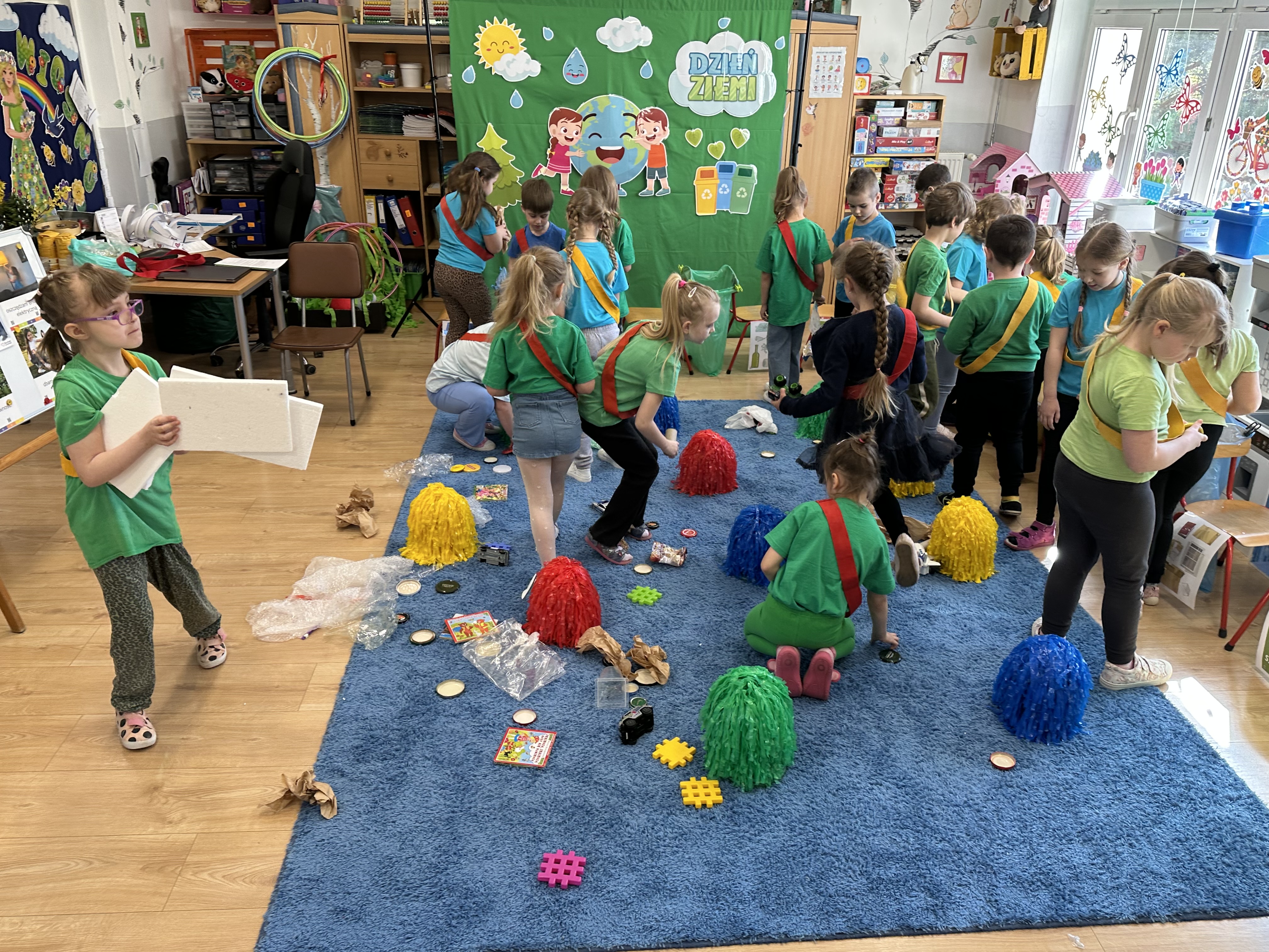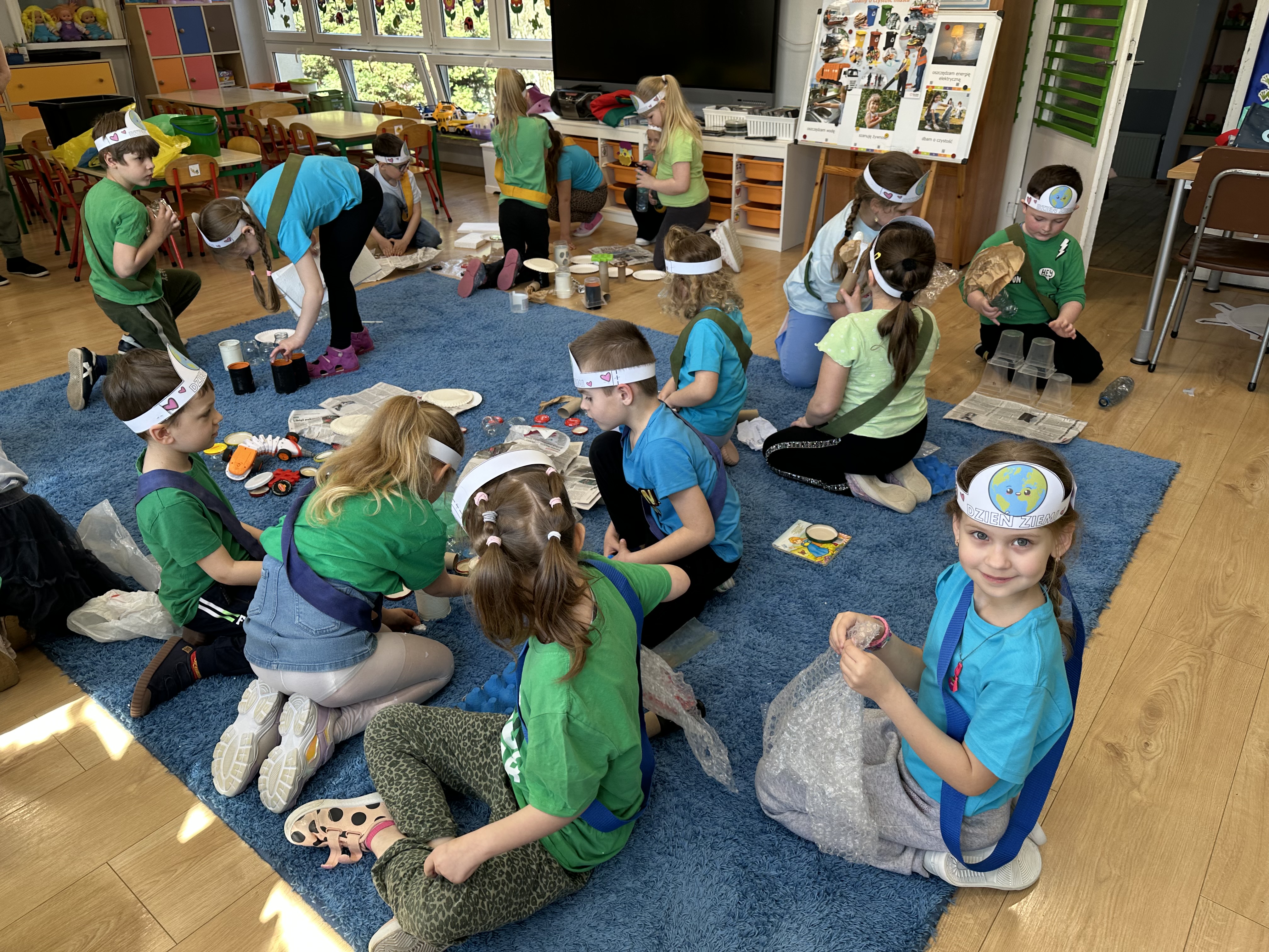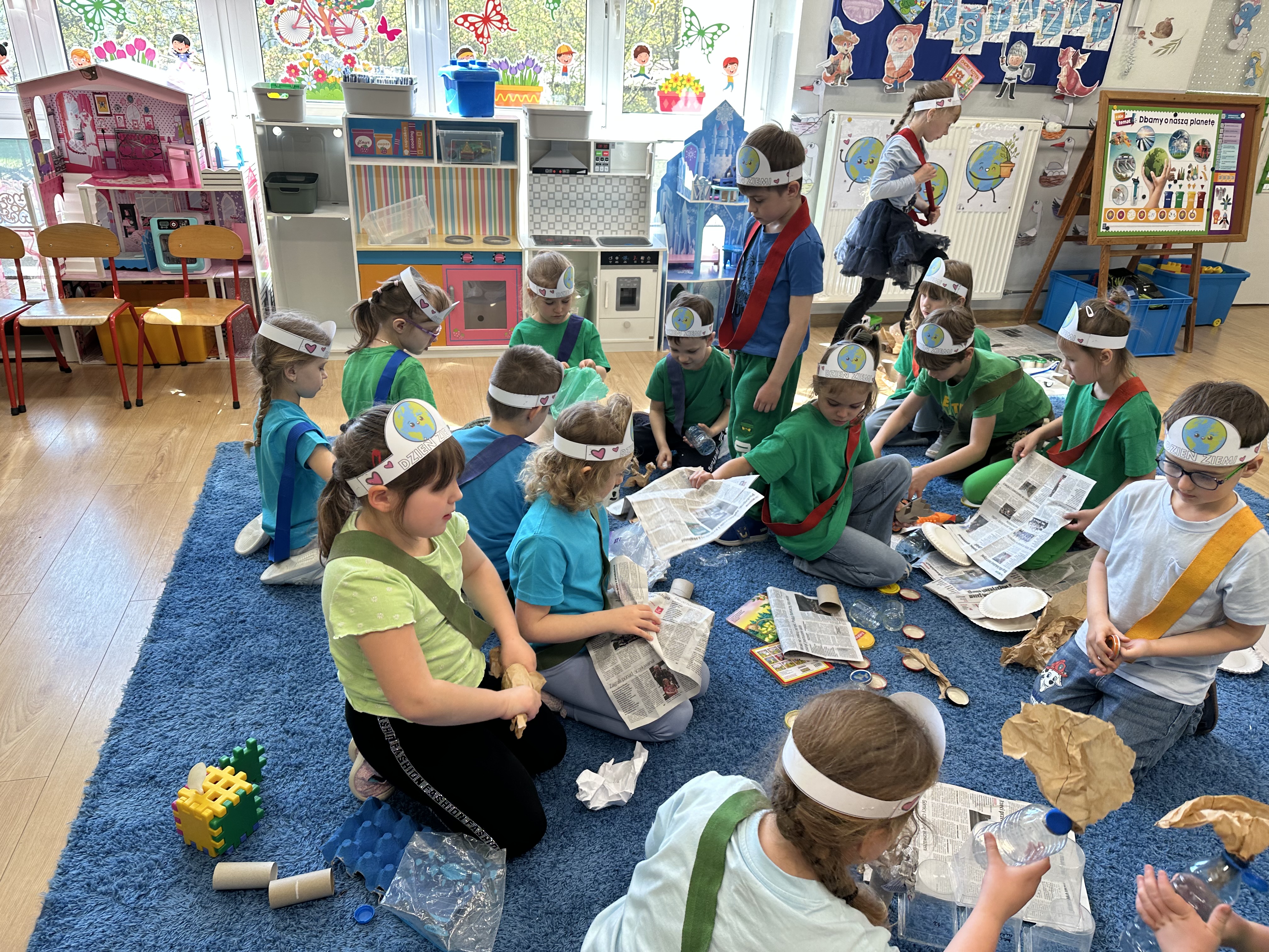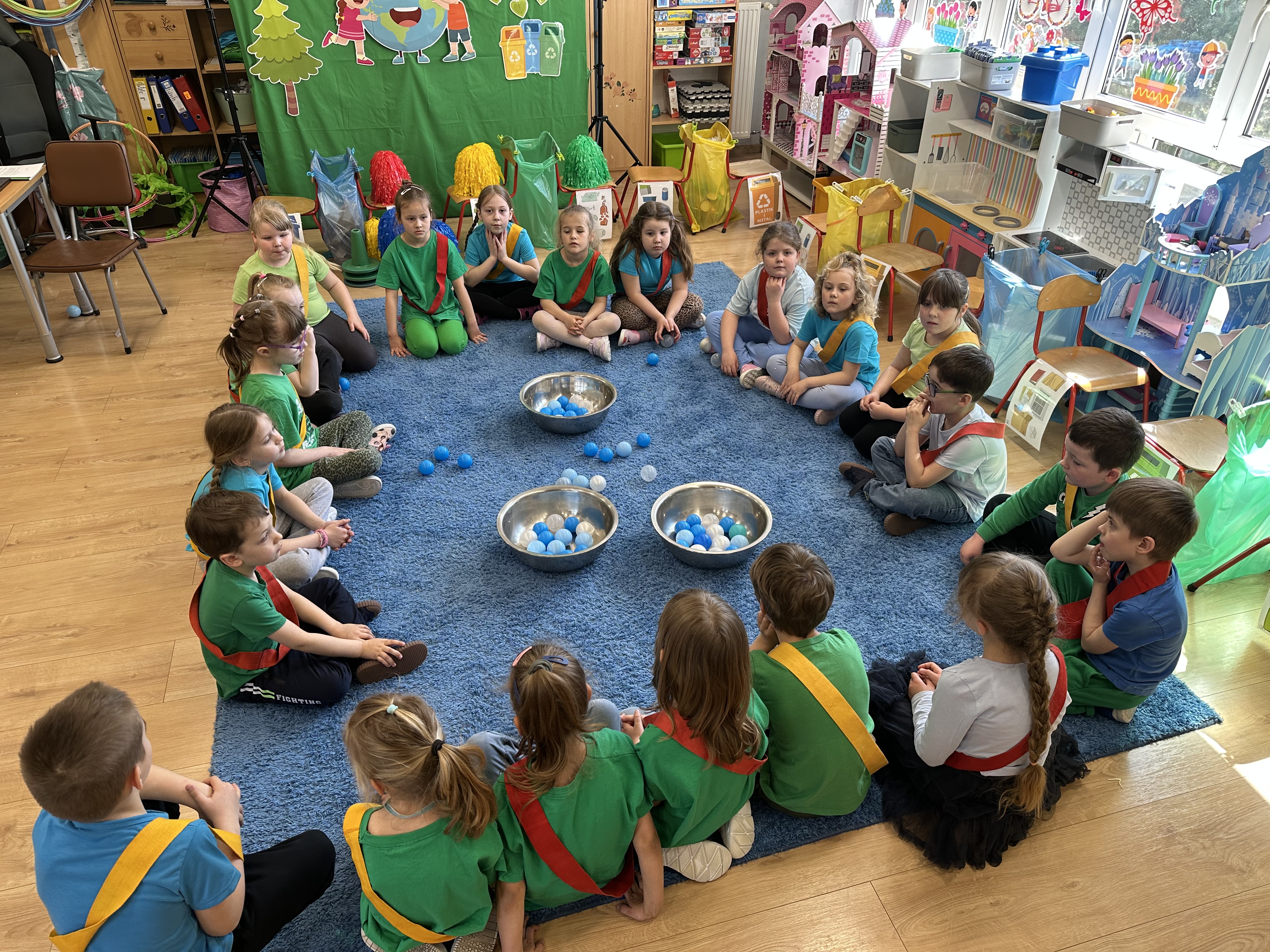 Kolejnym etapem było zadanie związane z ochroną mórz i oceanów. Dzieci „ratowały morze”, wyławiając z niebieskiego dywanu (symbolizującego wodę) różnego rodzaju odpady. Następnie uczyły się ich prawidłowej segregacji, co było doskonałą okazją do utrwalenia zasad dbania o środowisko.