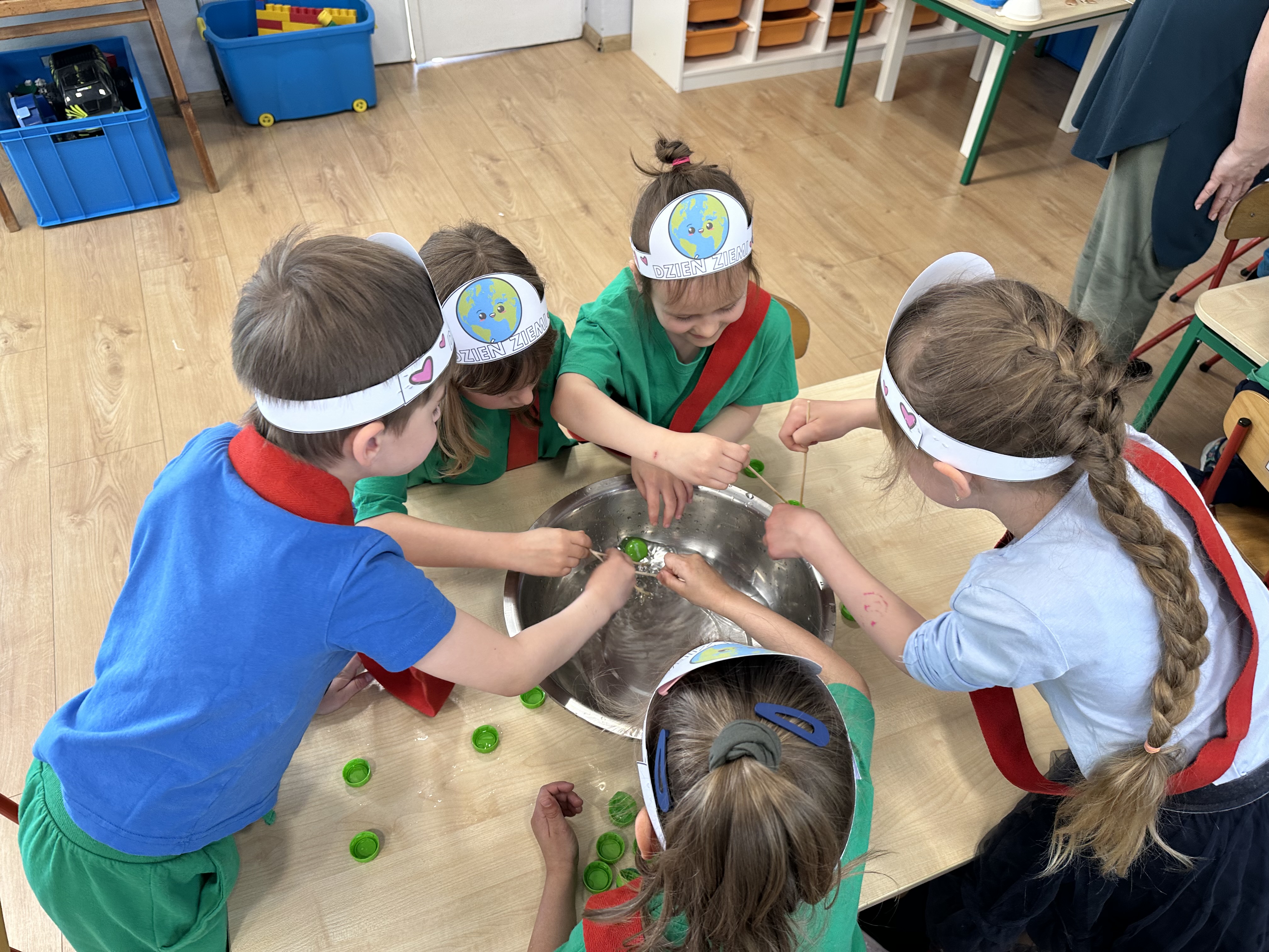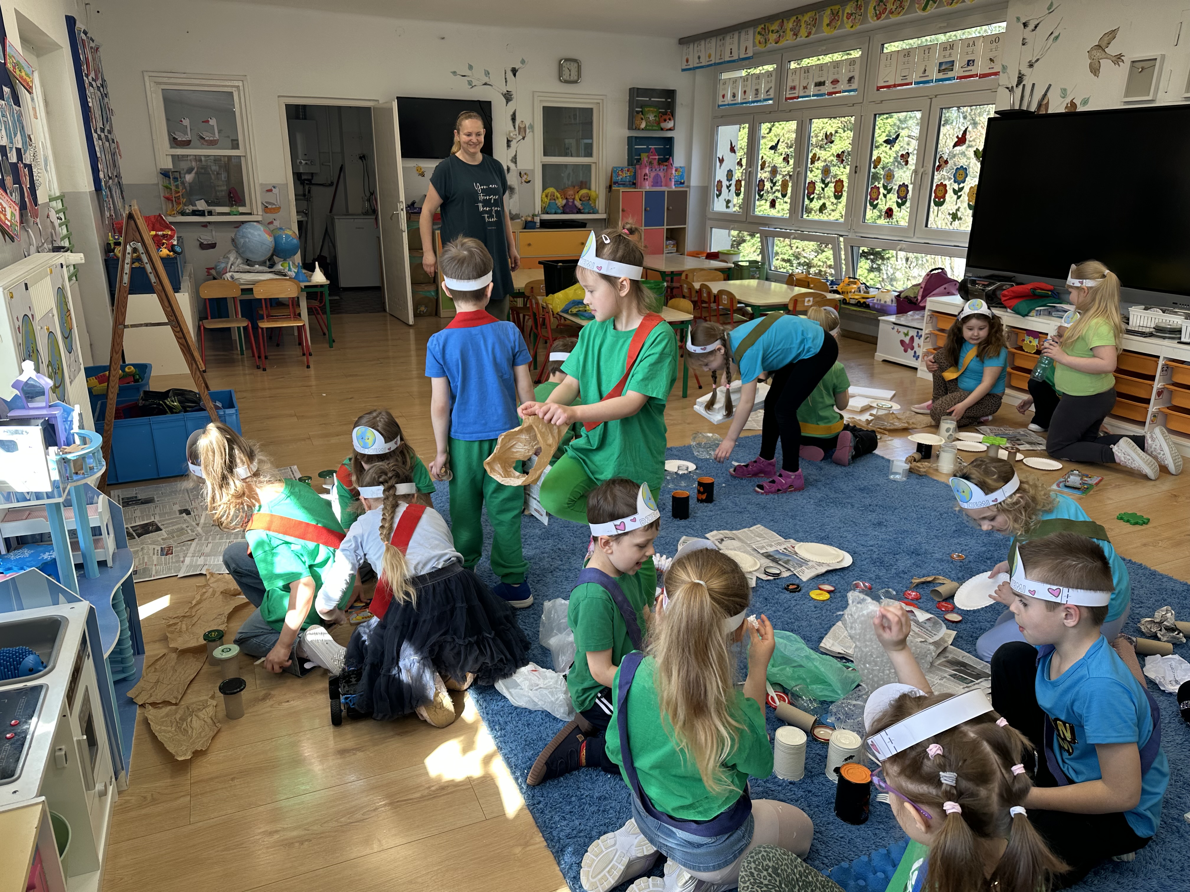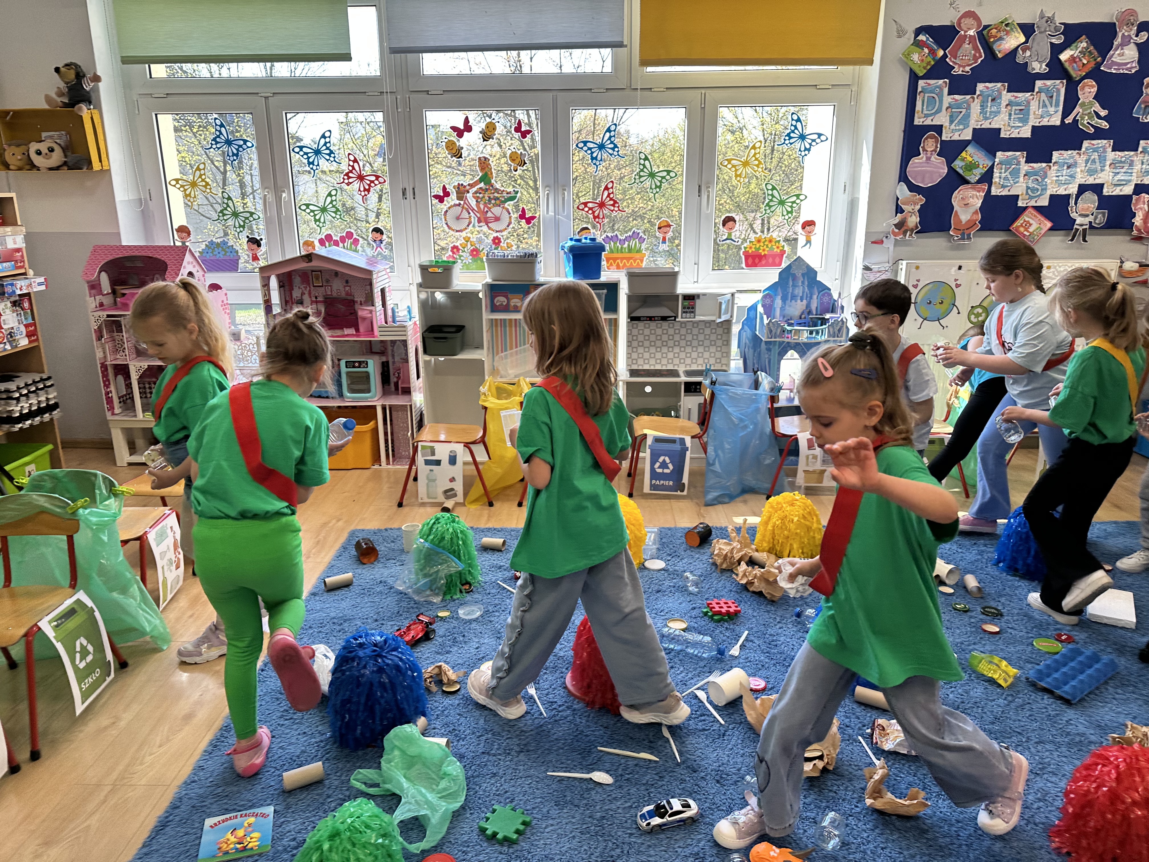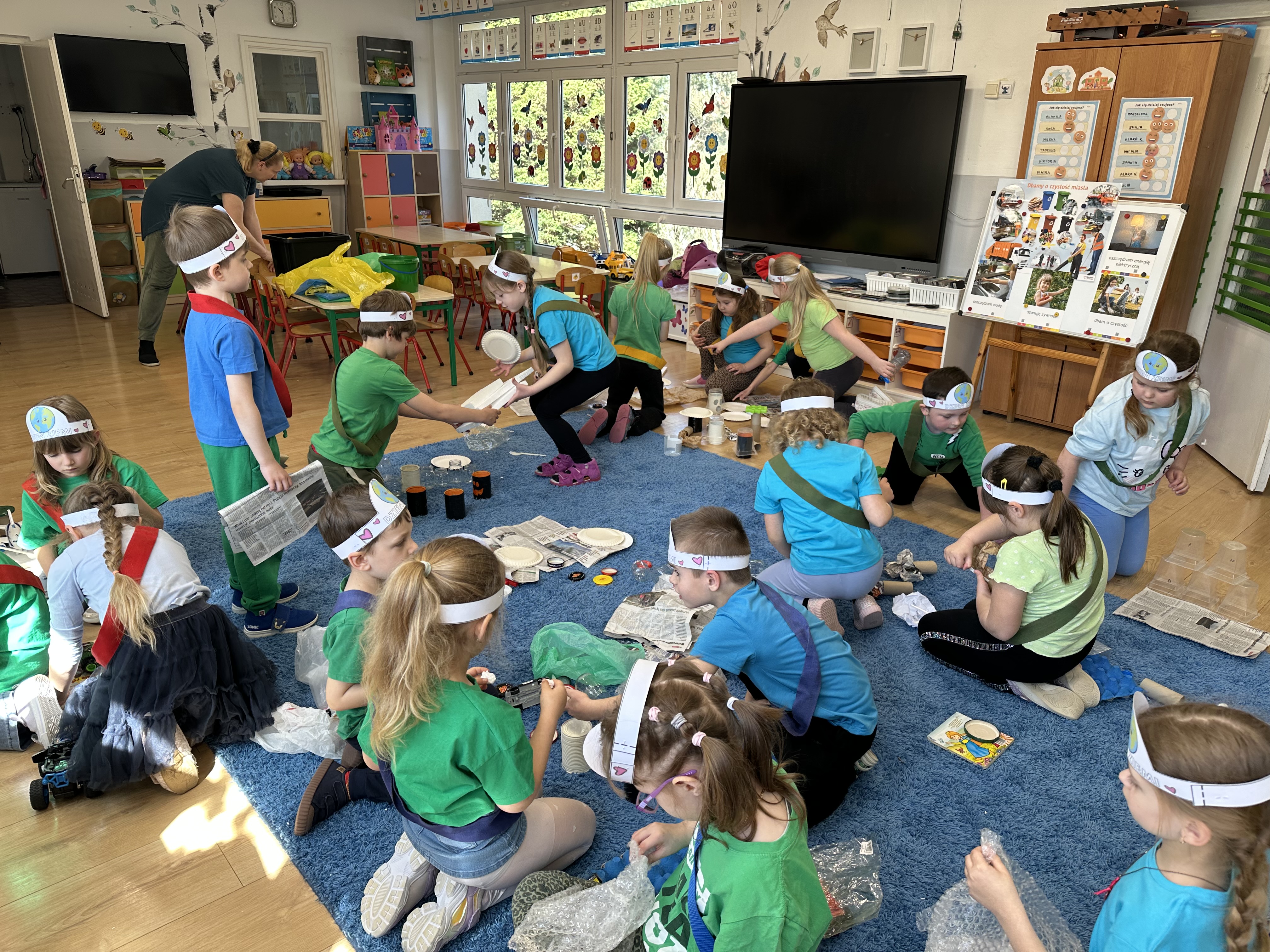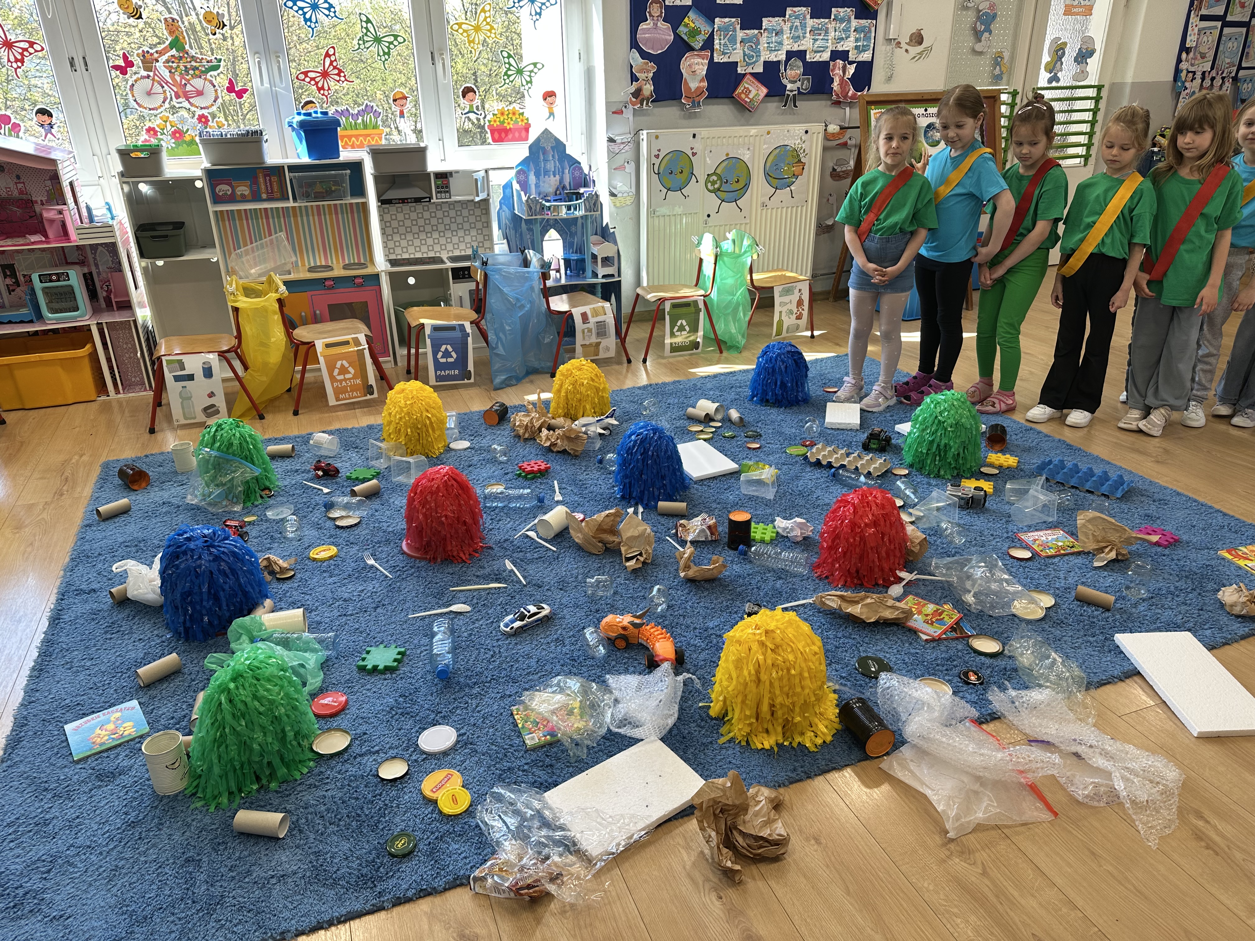 Kolejnym etapem było zadanie związane z ochroną mórz i oceanów. Dzieci „ratowały morze”, wyławiając z niebieskiego dywanu (symbolizującego wodę) różnego rodzaju odpady. Następnie uczyły się ich prawidłowej segregacji, co było doskonałą okazją do utrwalenia zasad dbania o środowisko.