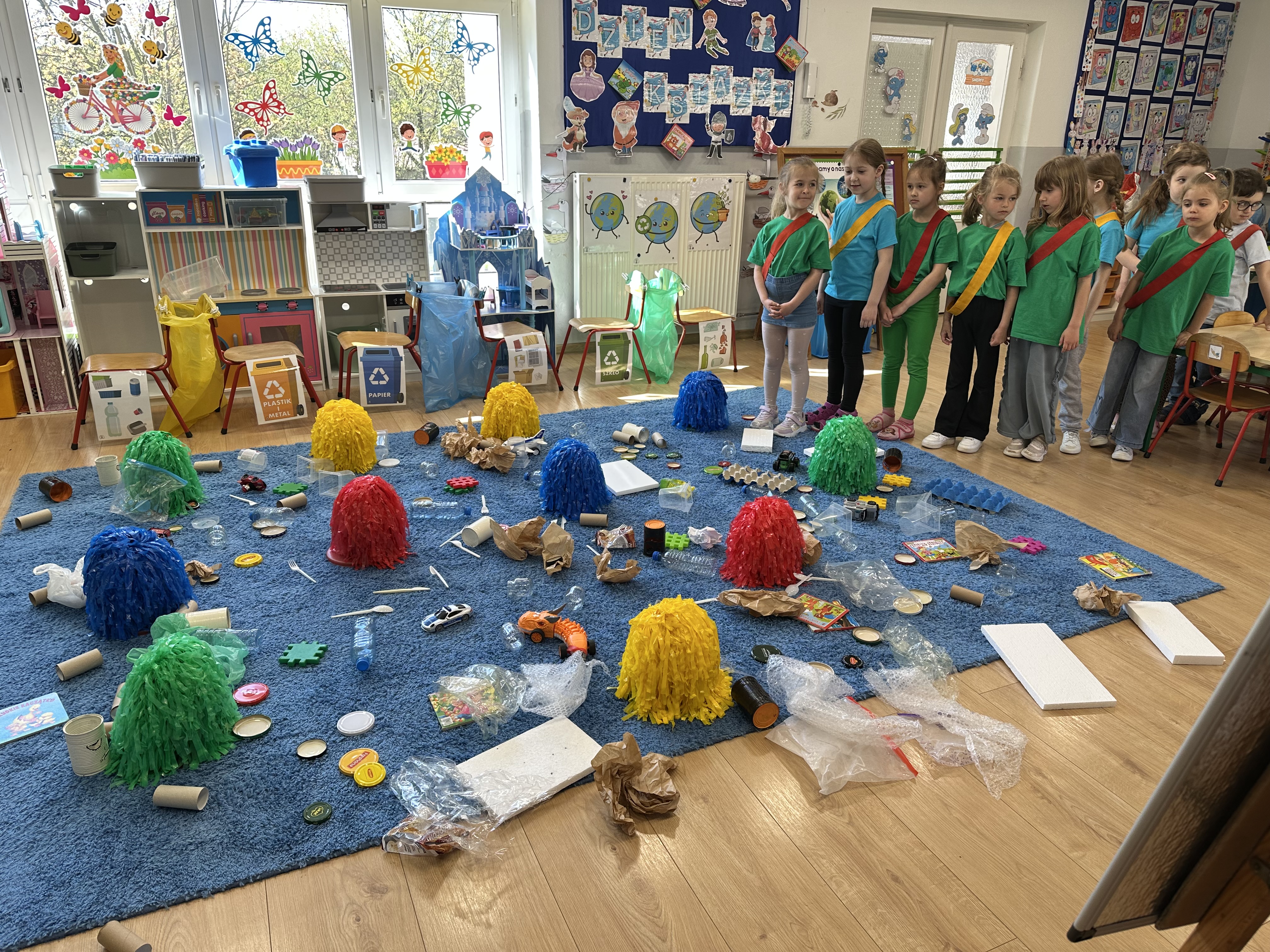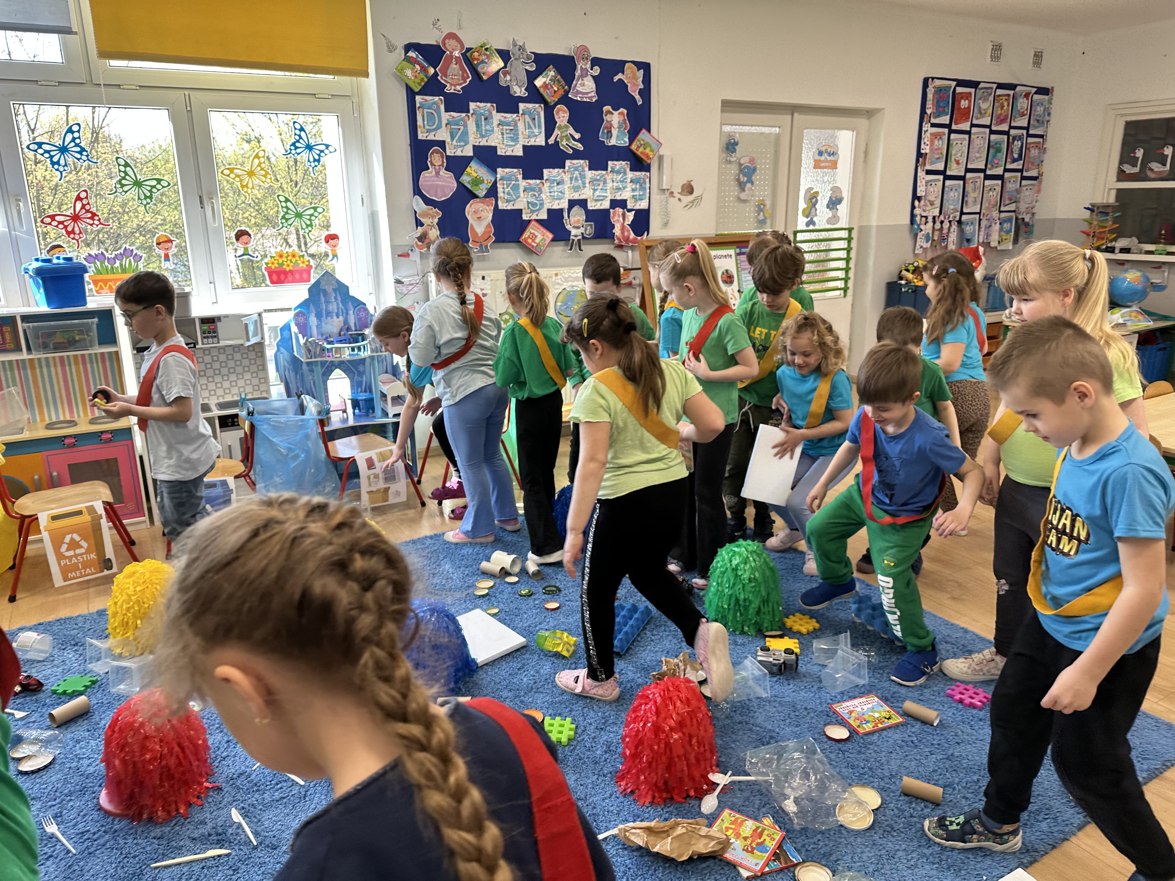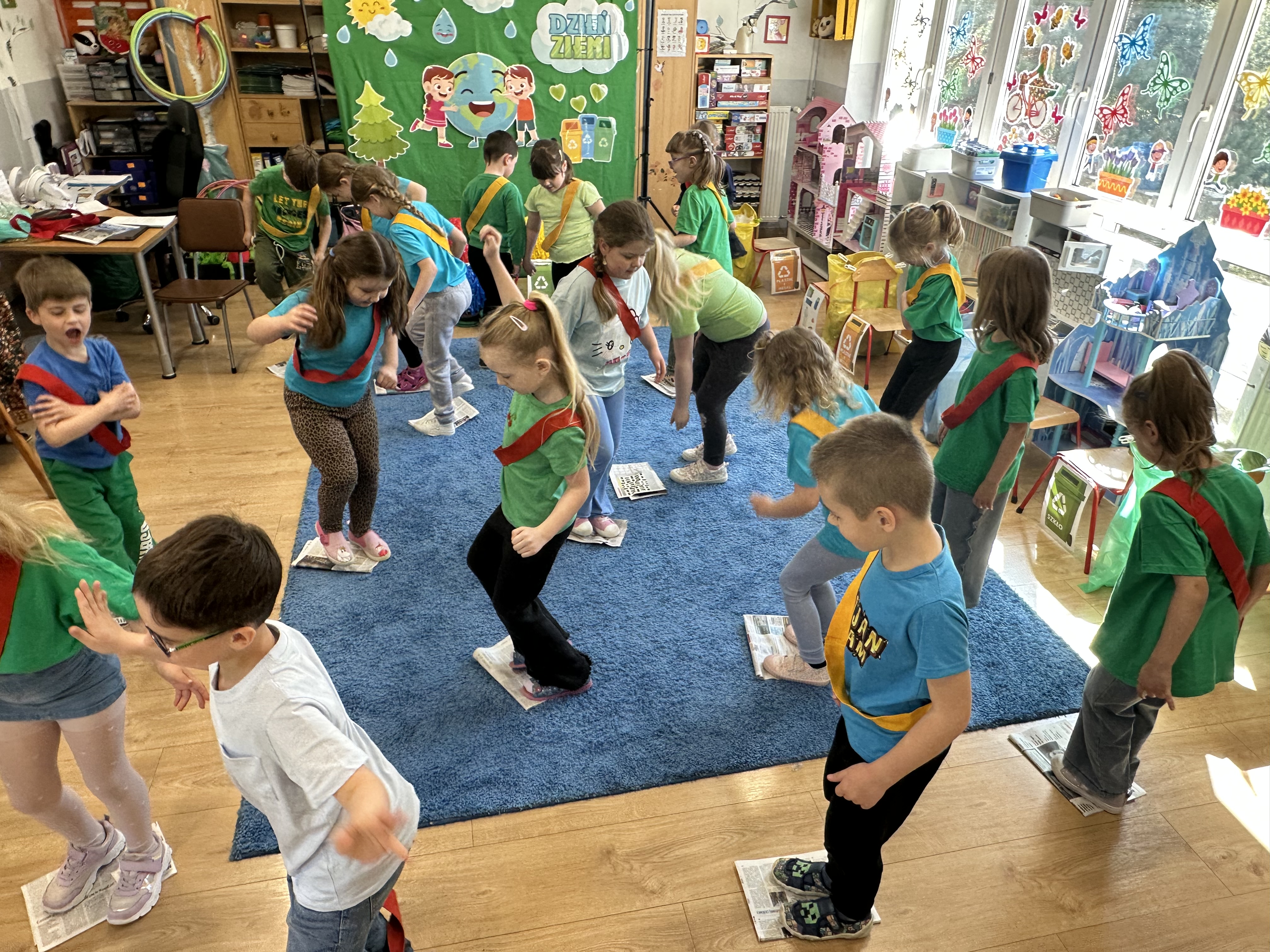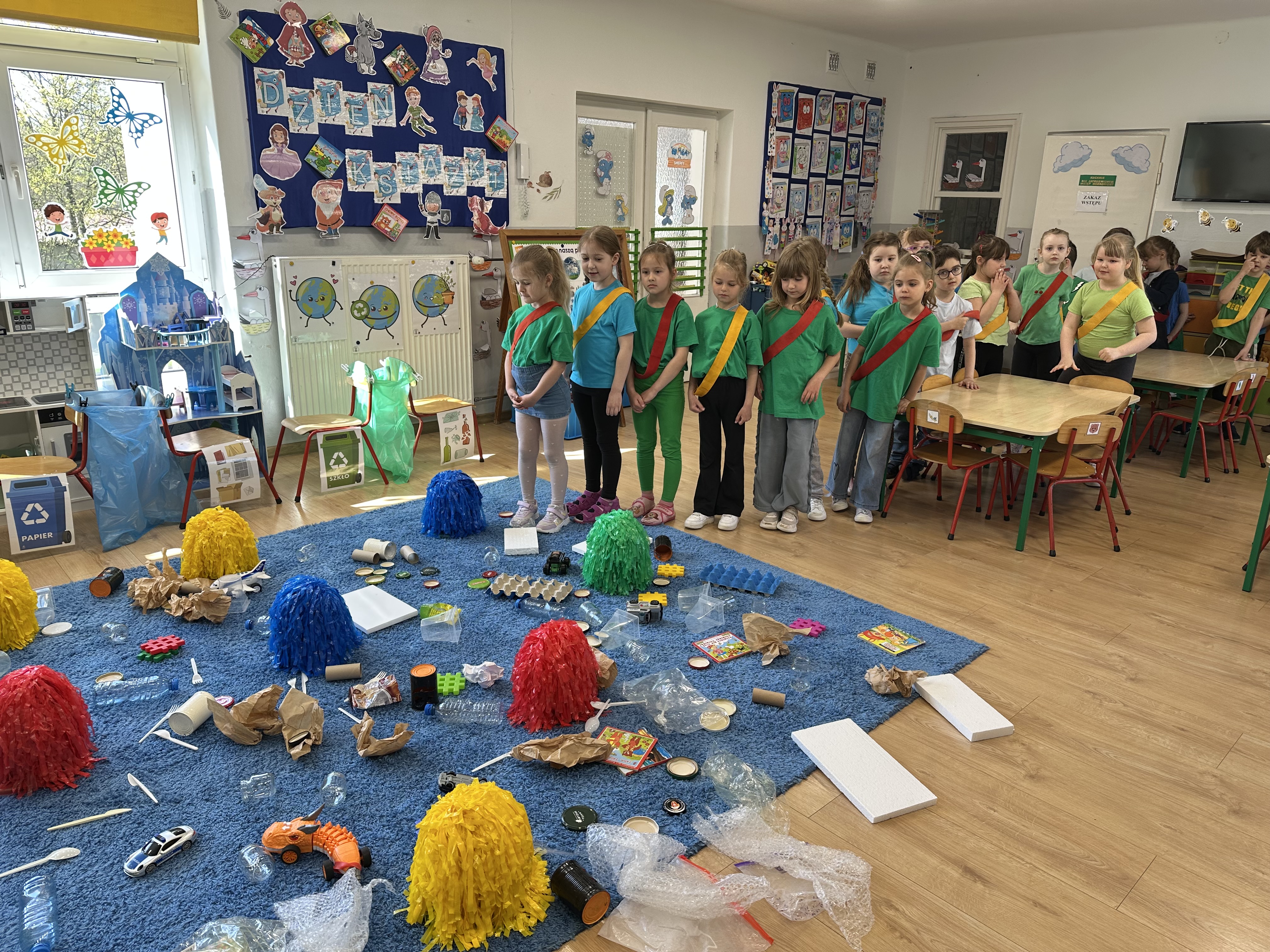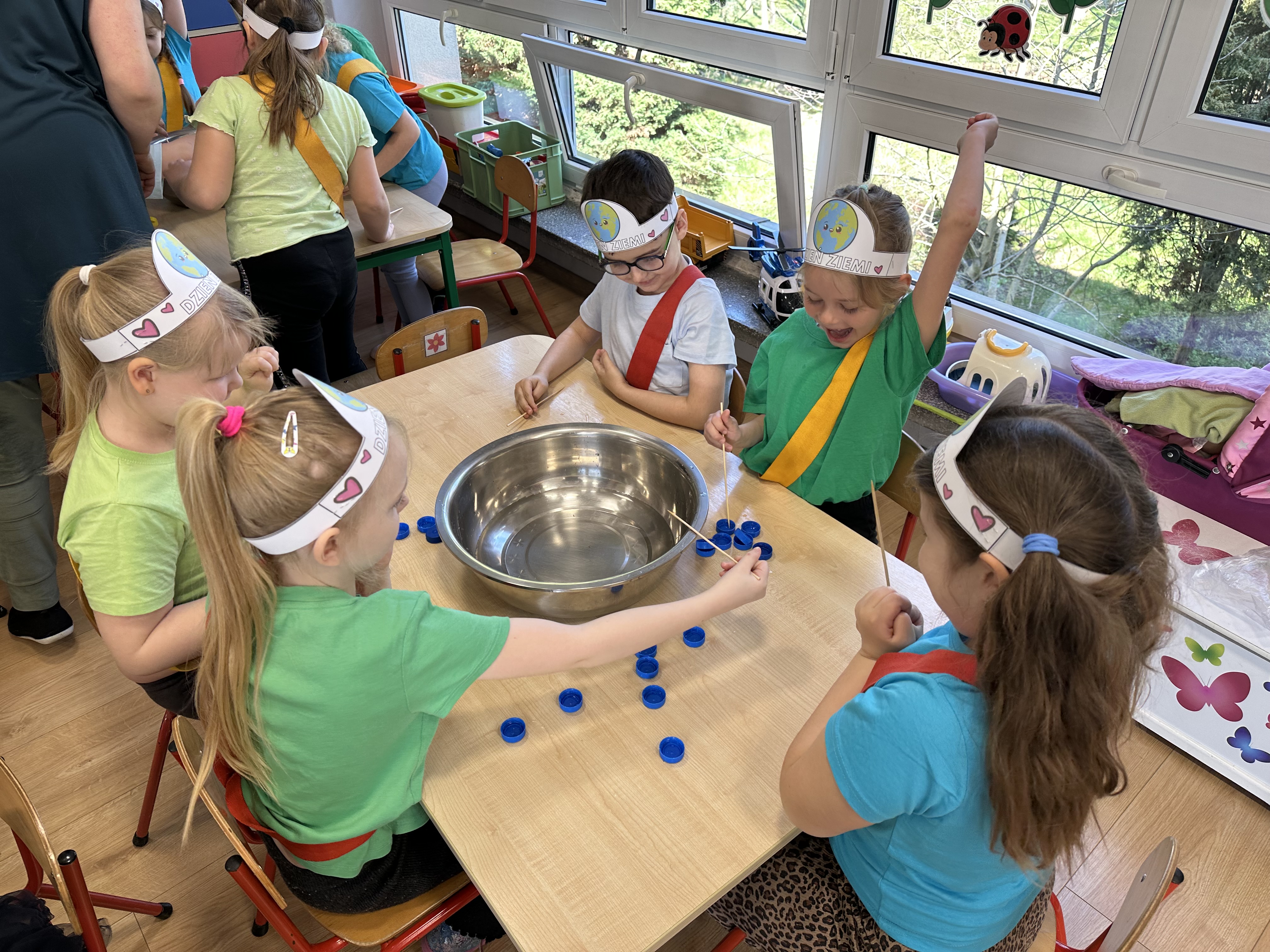 Kolejnym etapem było zadanie związane z ochroną mórz i oceanów. Dzieci „ratowały morze”, wyławiając z niebieskiego dywanu (symbolizującego wodę) różnego rodzaju odpady. Następnie uczyły się ich prawidłowej segregacji, co było doskonałą okazją do utrwalenia zasad dbania o środowisko.