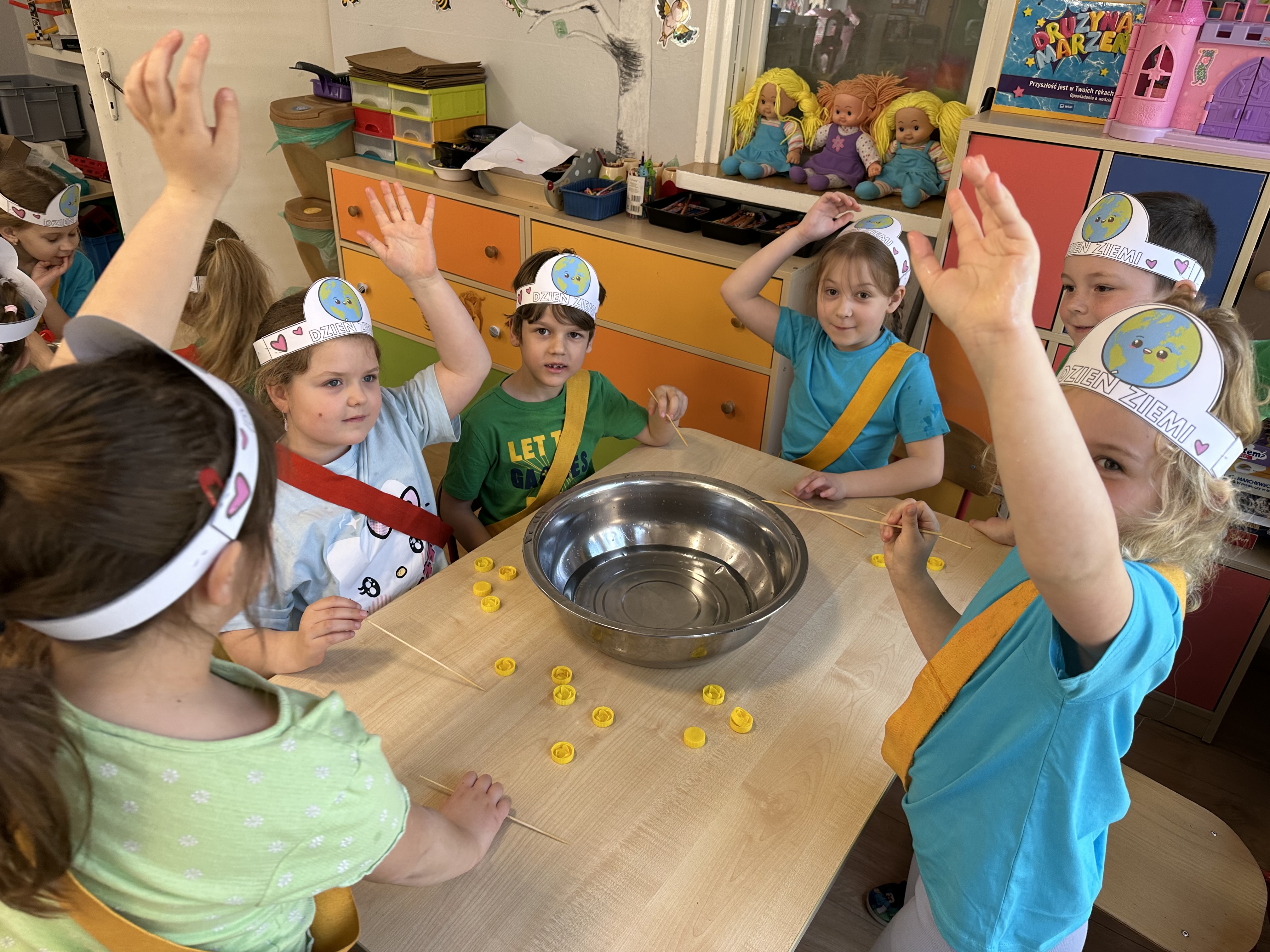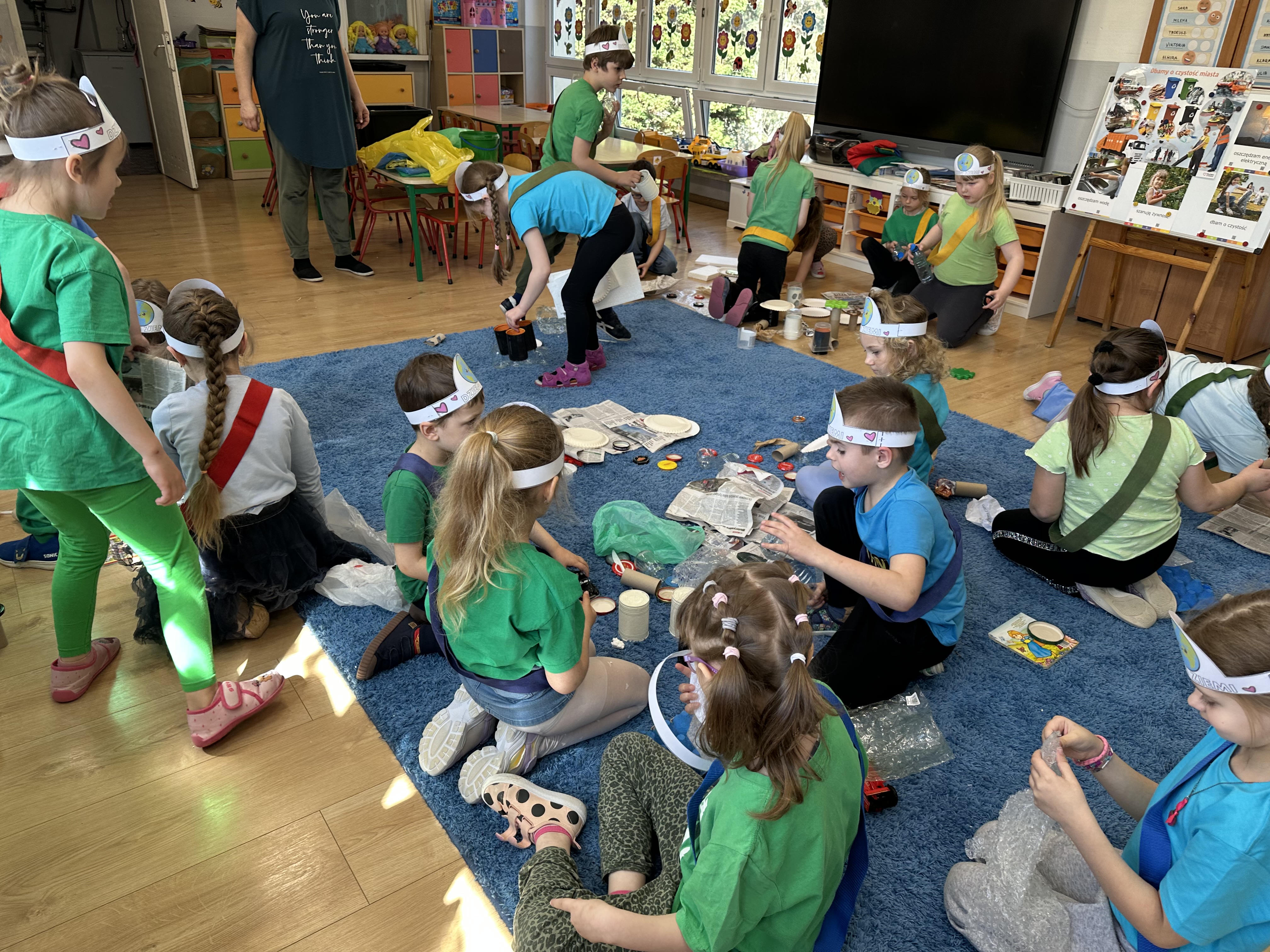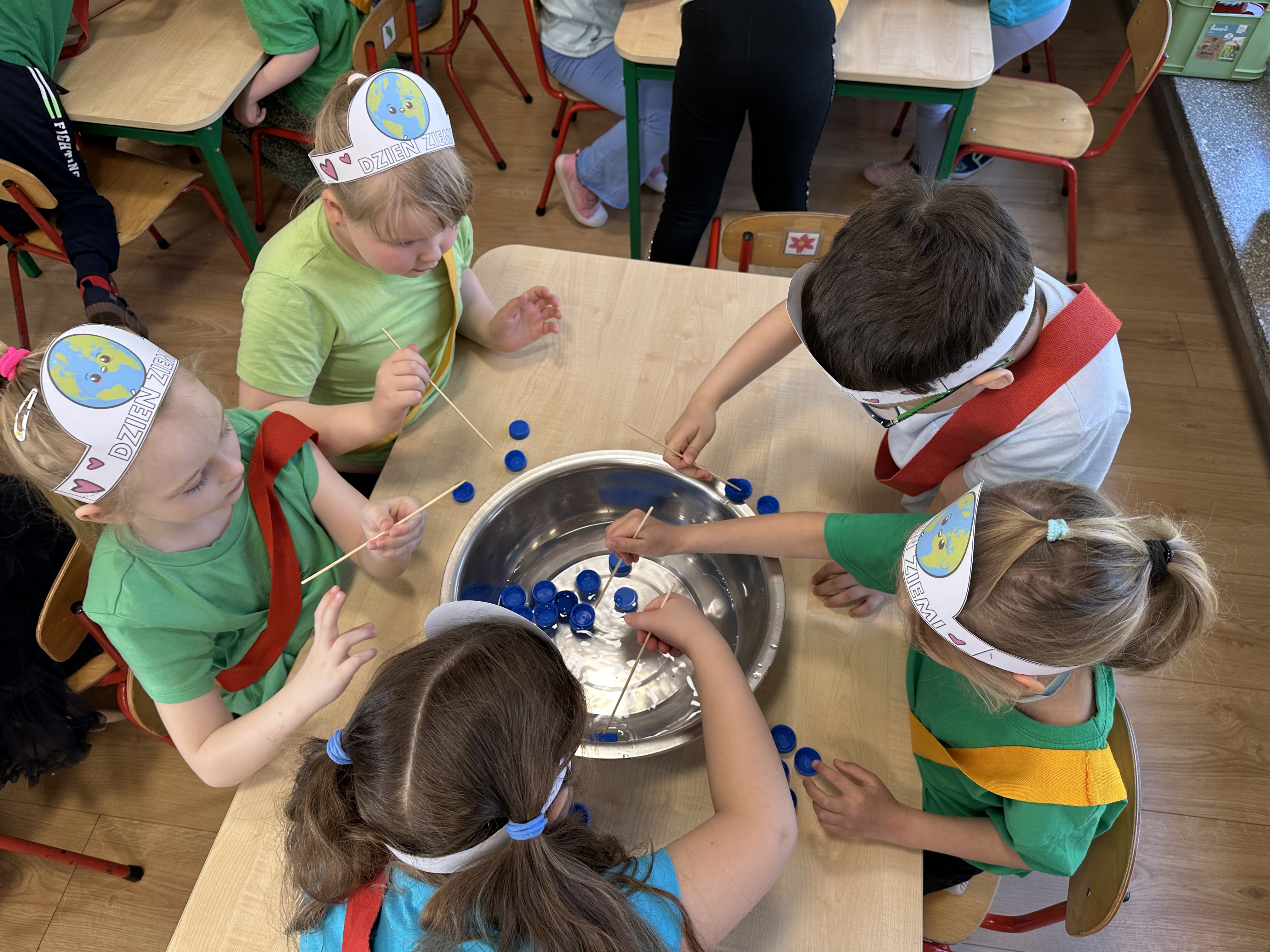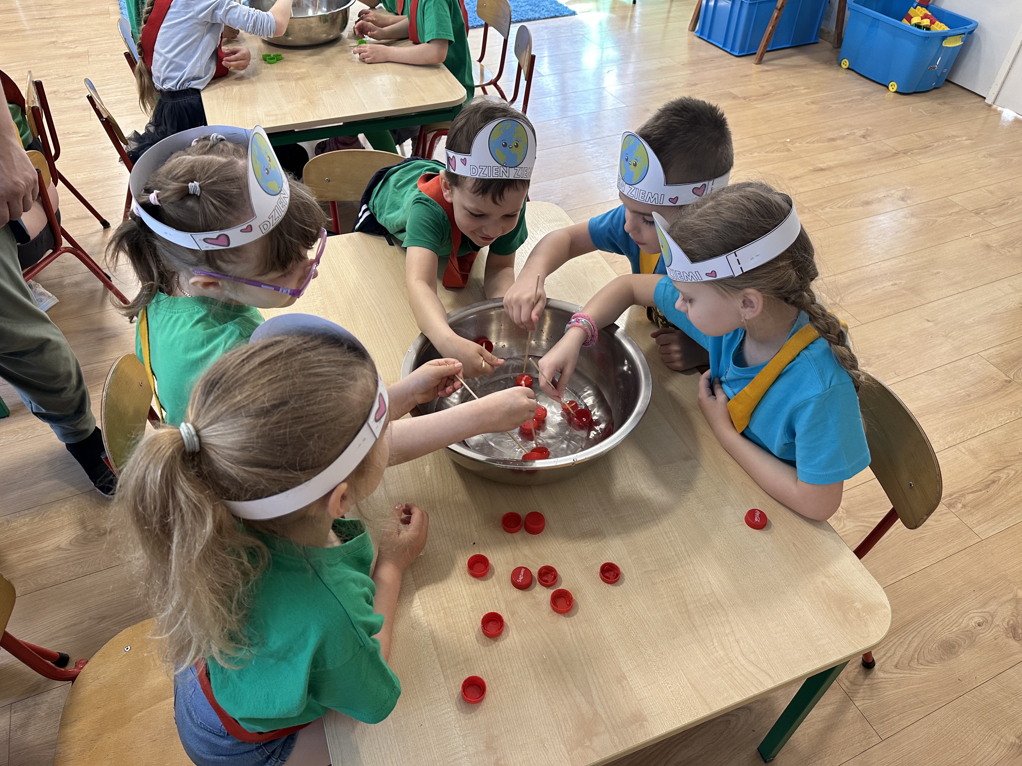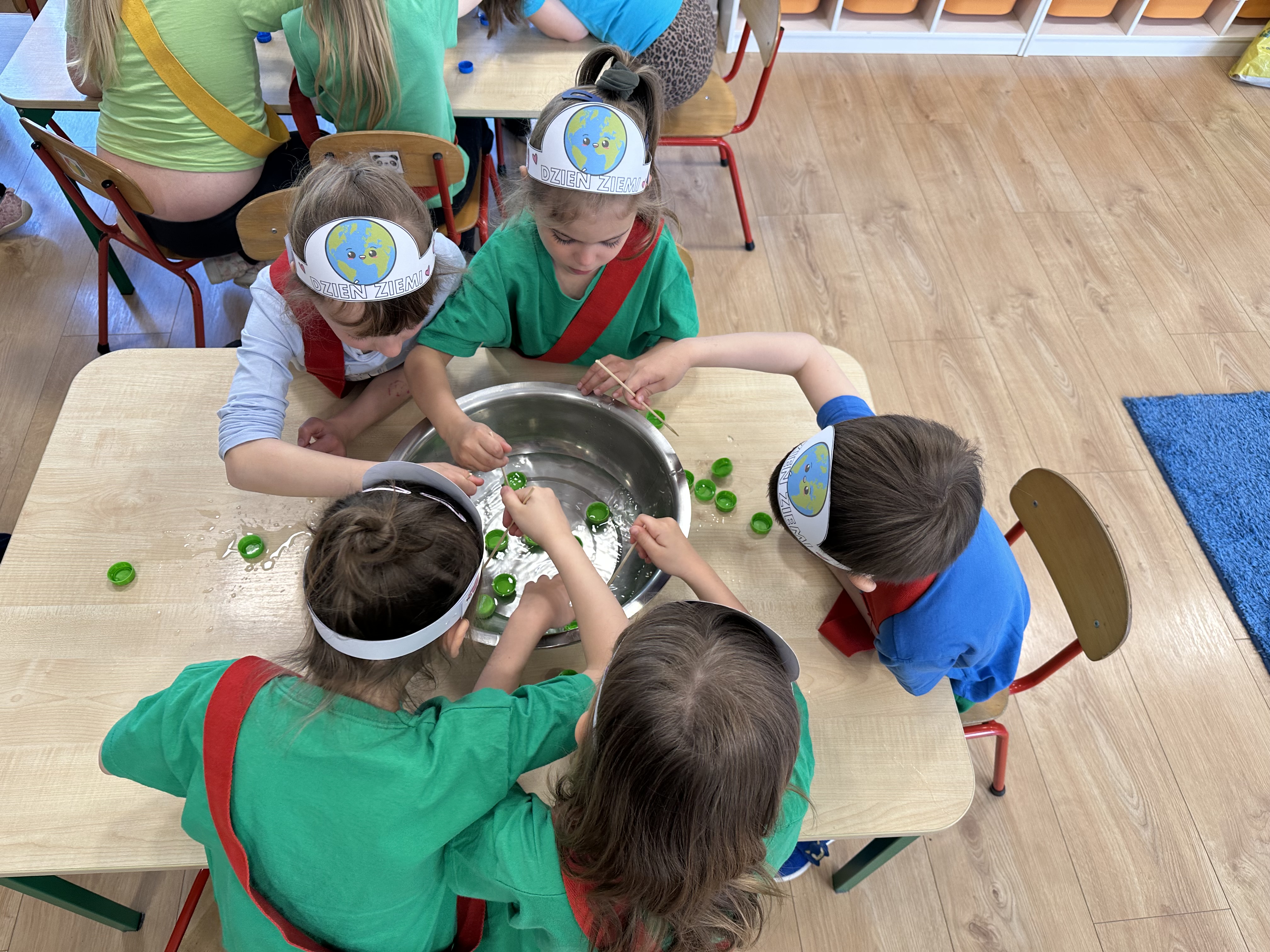 Kolejnym etapem było zadanie związane z ochroną mórz i oceanów. Dzieci „ratowały morze”, wyławiając z niebieskiego dywanu (symbolizującego wodę) różnego rodzaju odpady. Następnie uczyły się ich prawidłowej segregacji, co było doskonałą okazją do utrwalenia zasad dbania o środowisko.