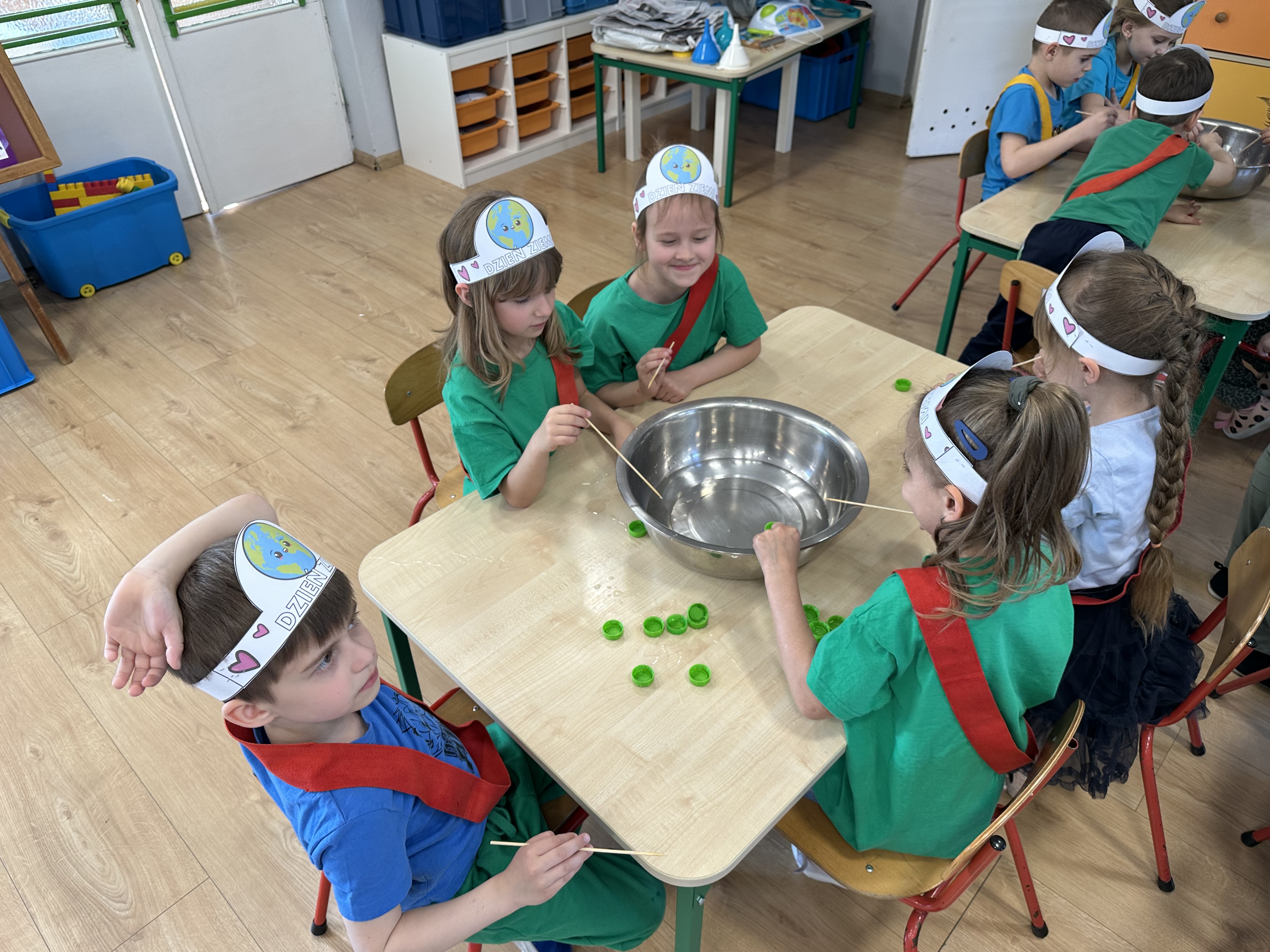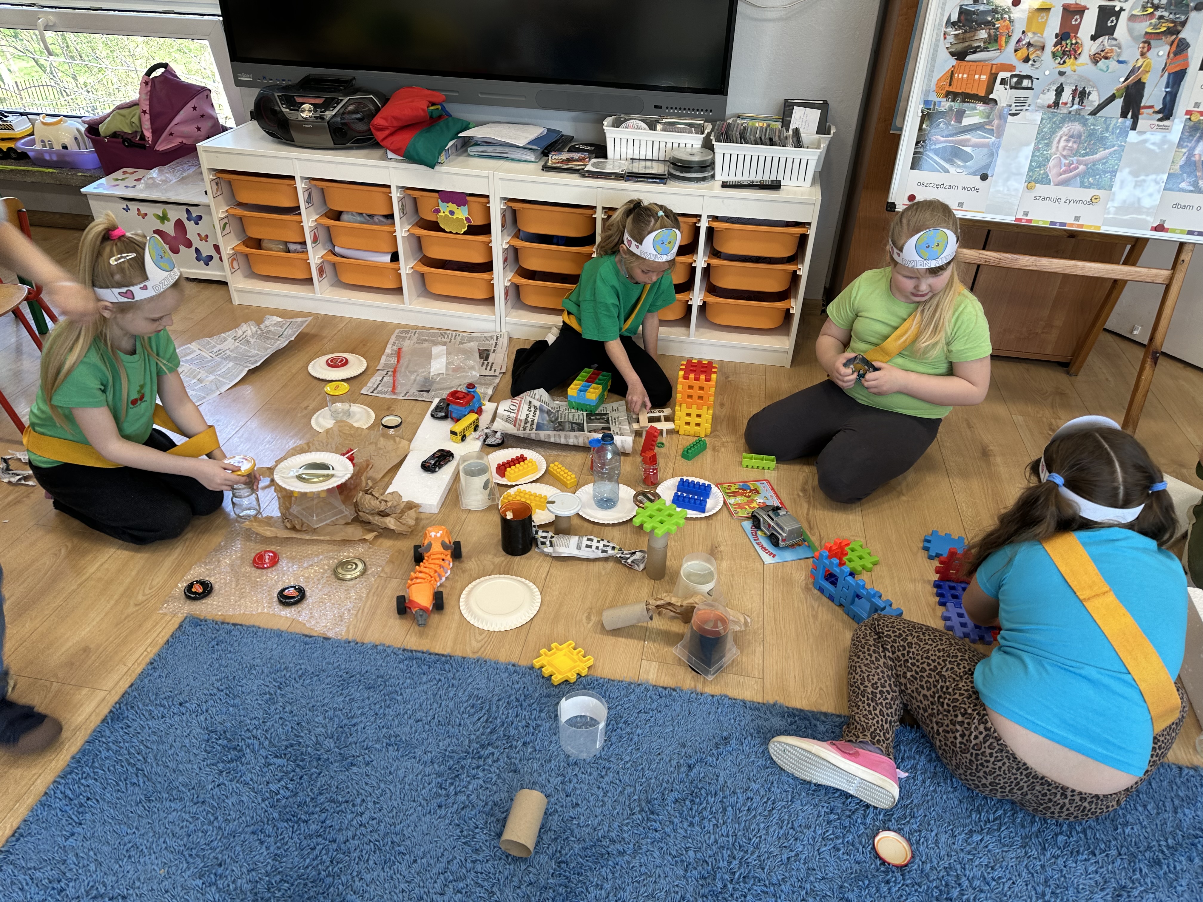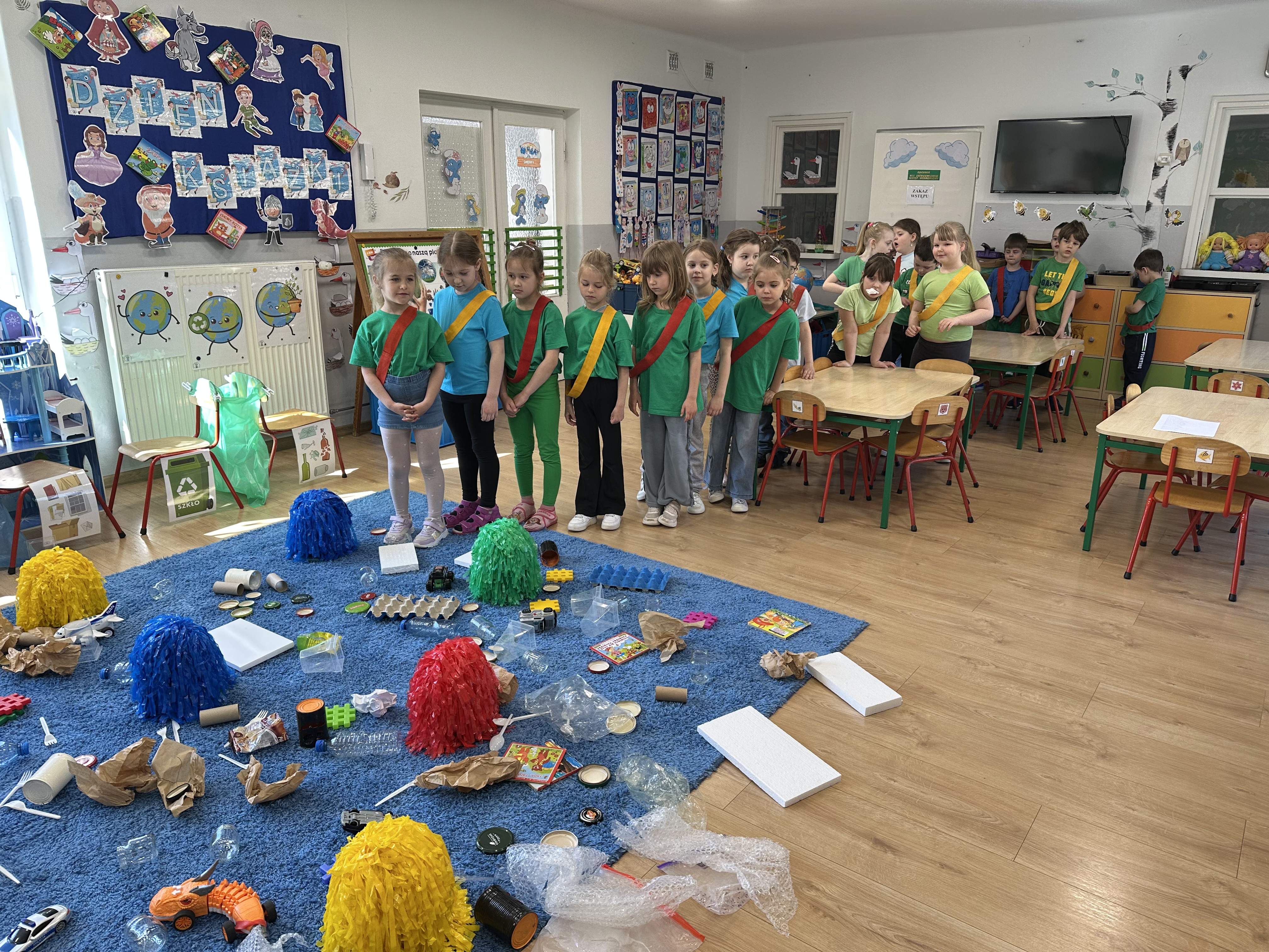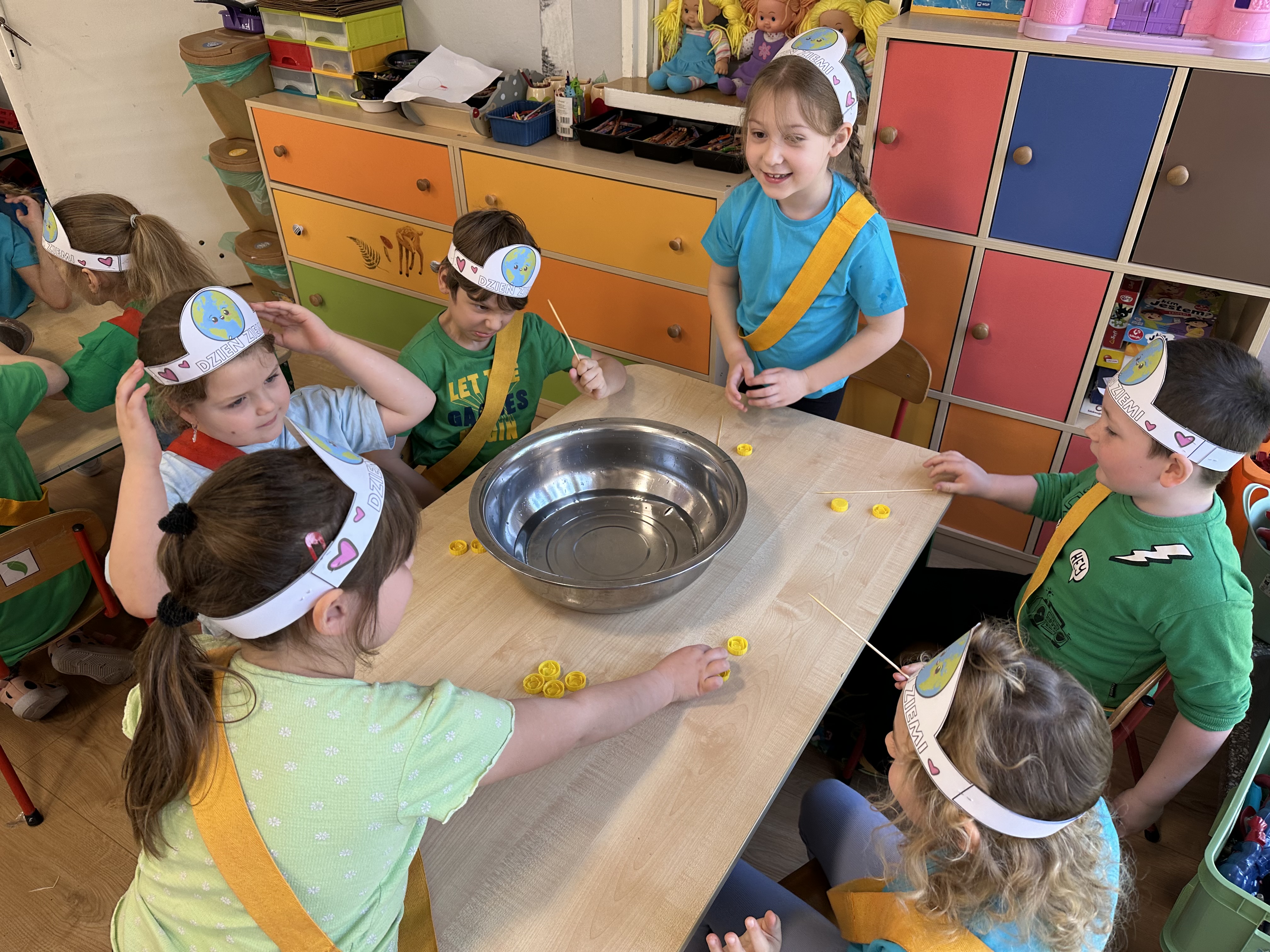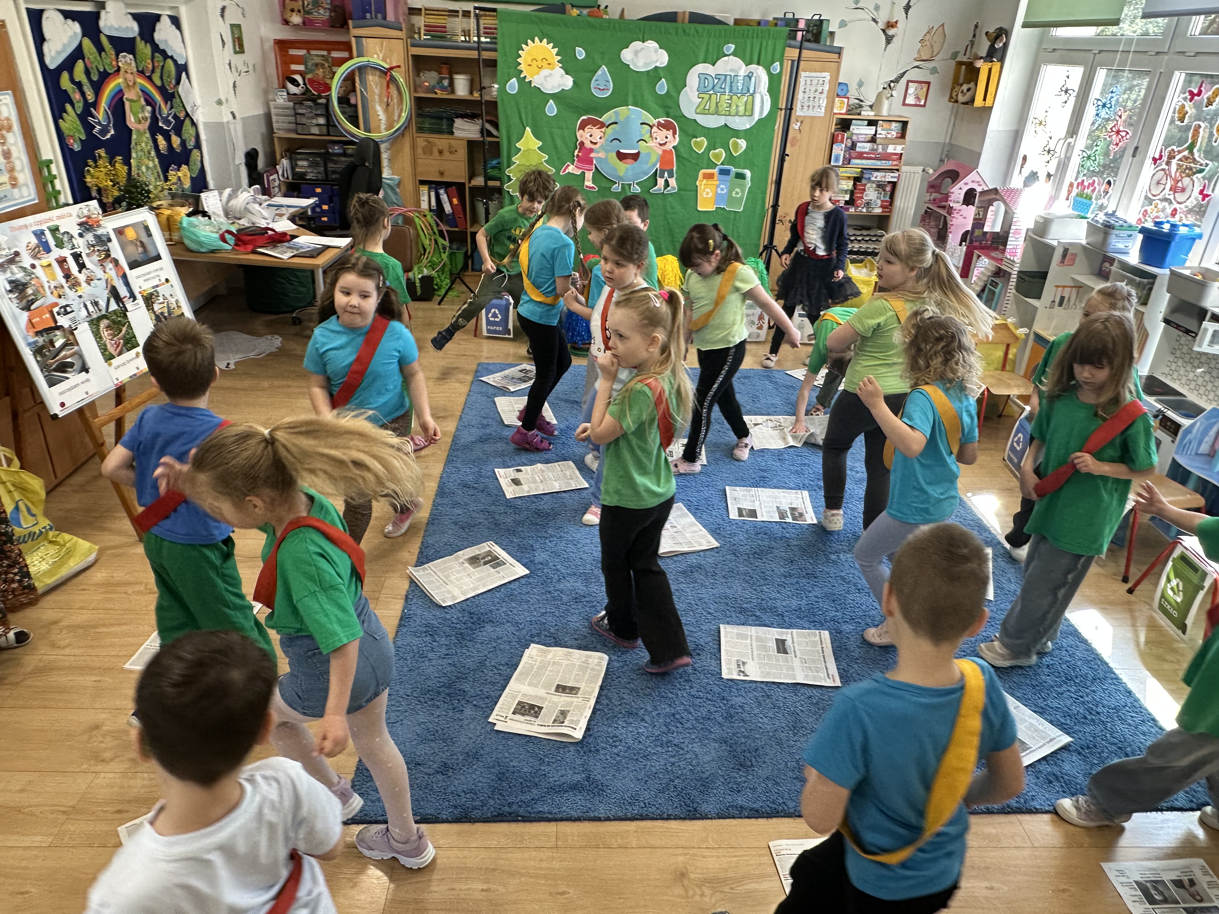 Kolejnym etapem było zadanie związane z ochroną mórz i oceanów. Dzieci „ratowały morze”, wyławiając z niebieskiego dywanu (symbolizującego wodę) różnego rodzaju odpady. Następnie uczyły się ich prawidłowej segregacji, co było doskonałą okazją do utrwalenia zasad dbania o środowisko.