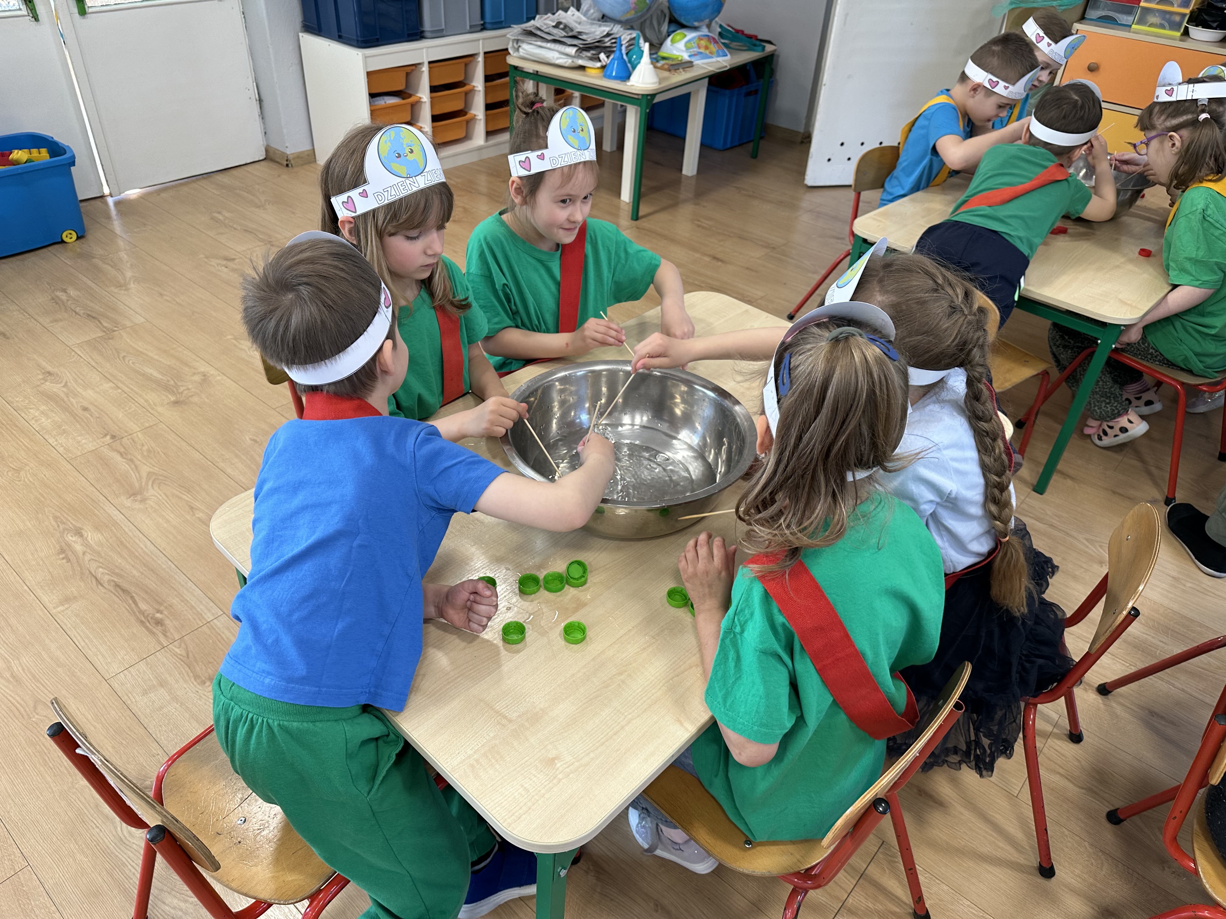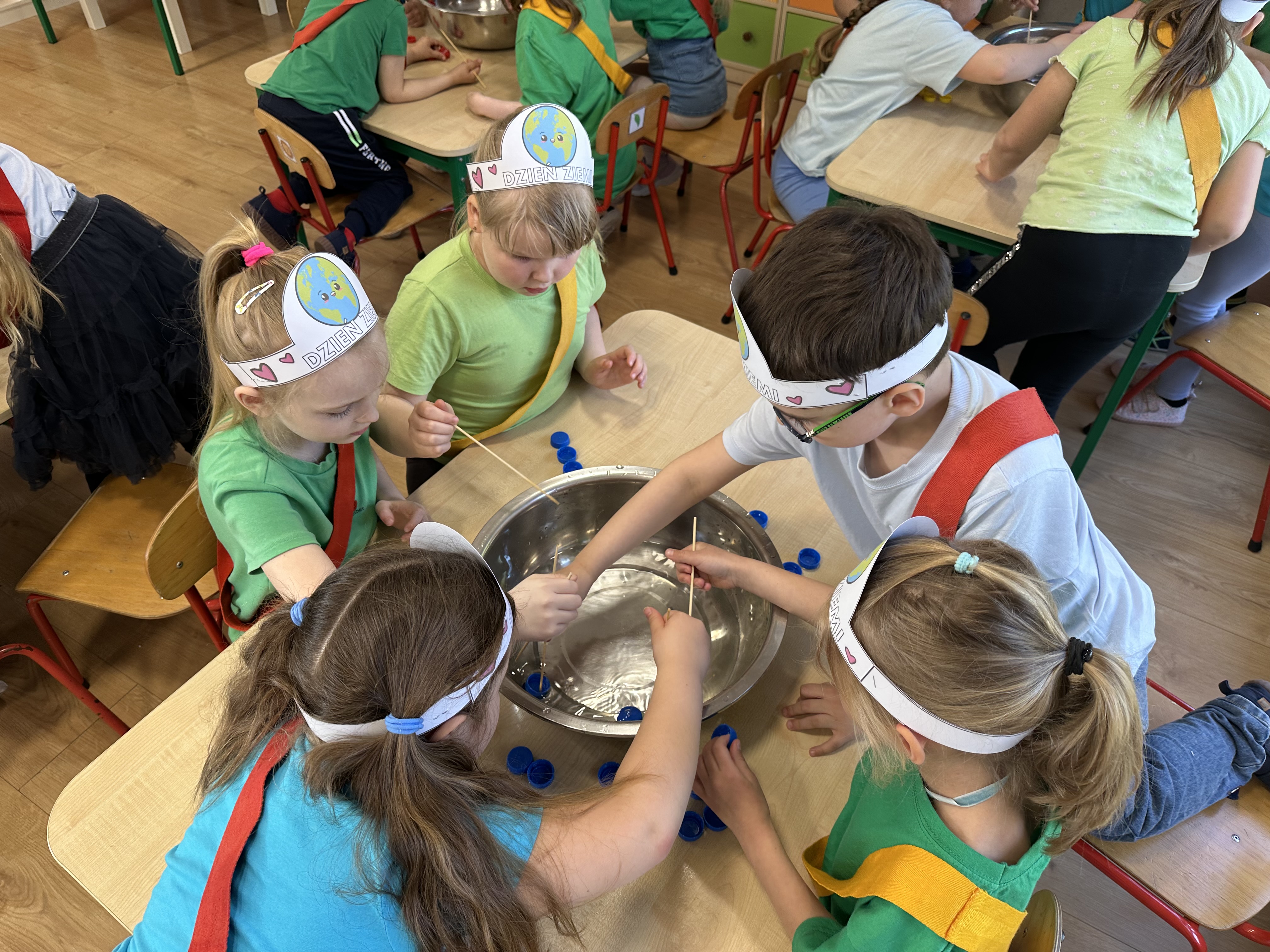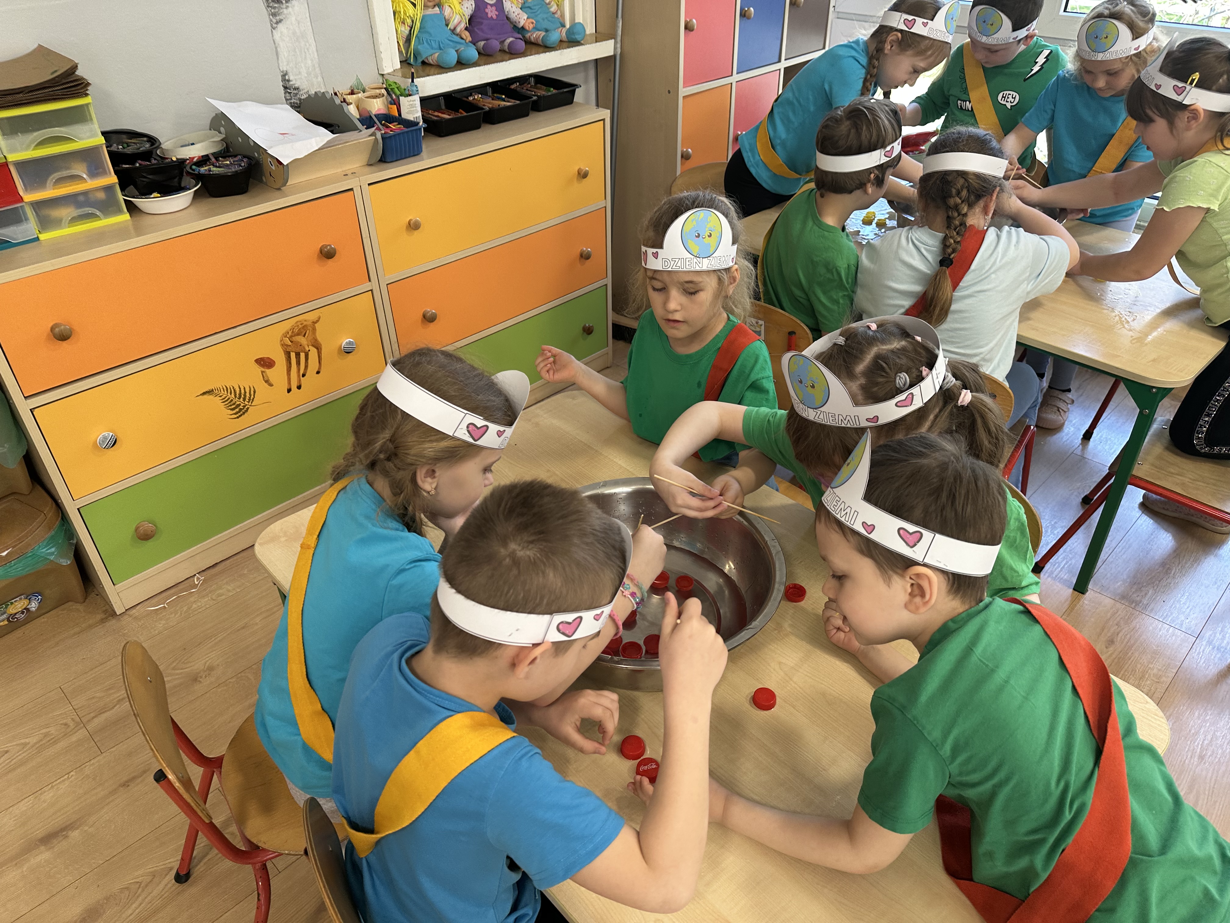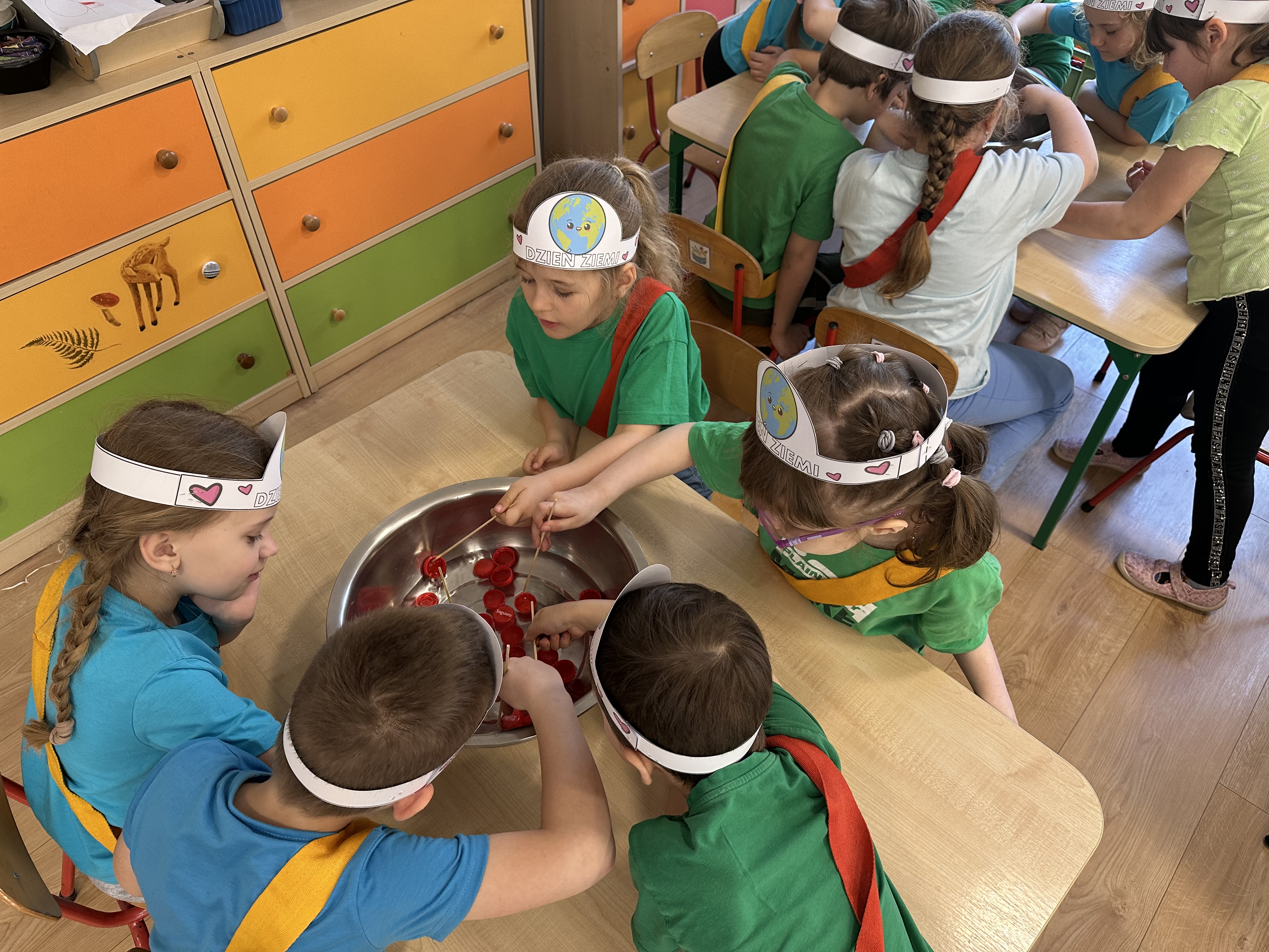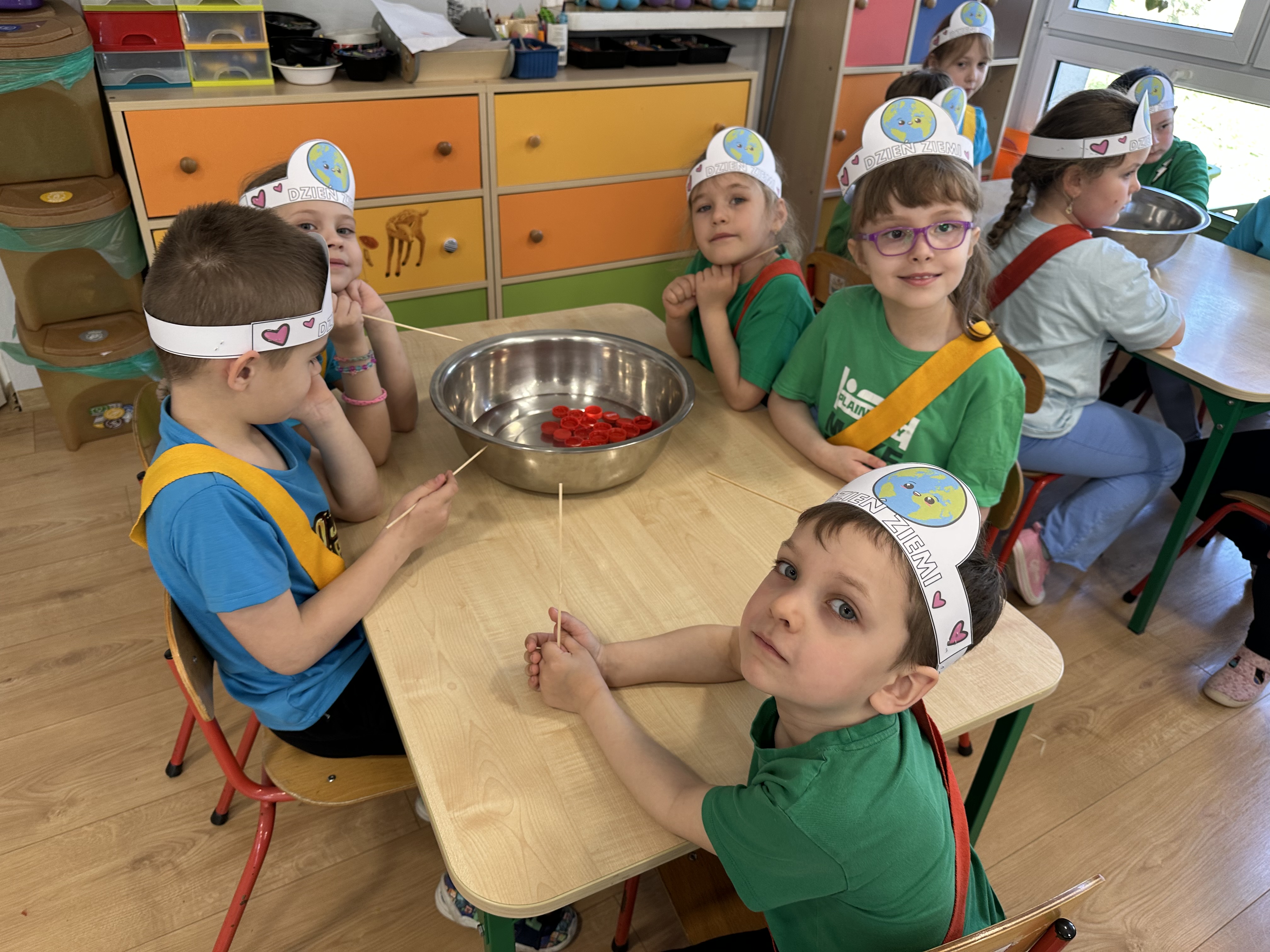 Kolejnym etapem było zadanie związane z ochroną mórz i oceanów. Dzieci „ratowały morze”, wyławiając z niebieskiego dywanu (symbolizującego wodę) różnego rodzaju odpady. Następnie uczyły się ich prawidłowej segregacji, co było doskonałą okazją do utrwalenia zasad dbania o środowisko.
