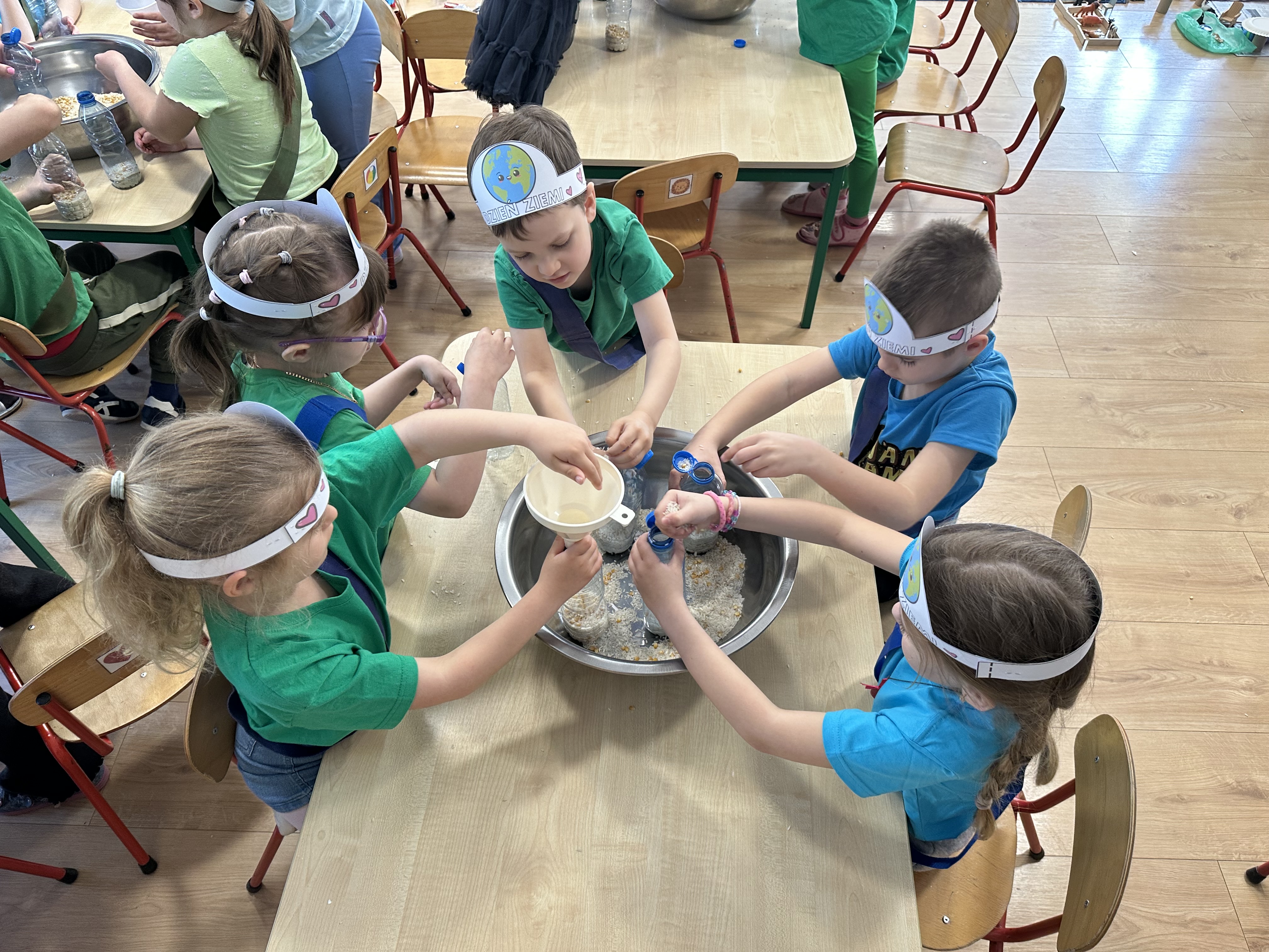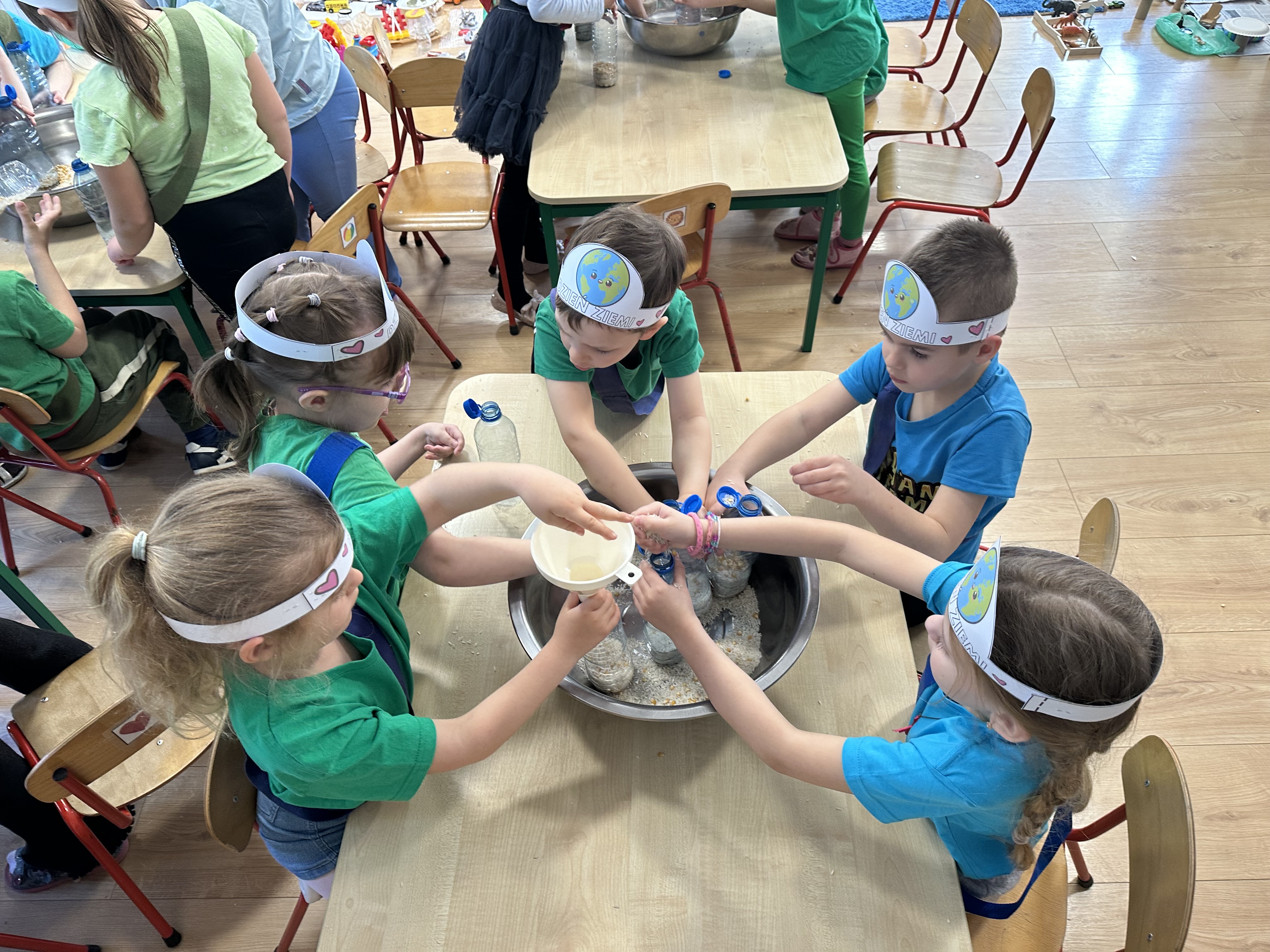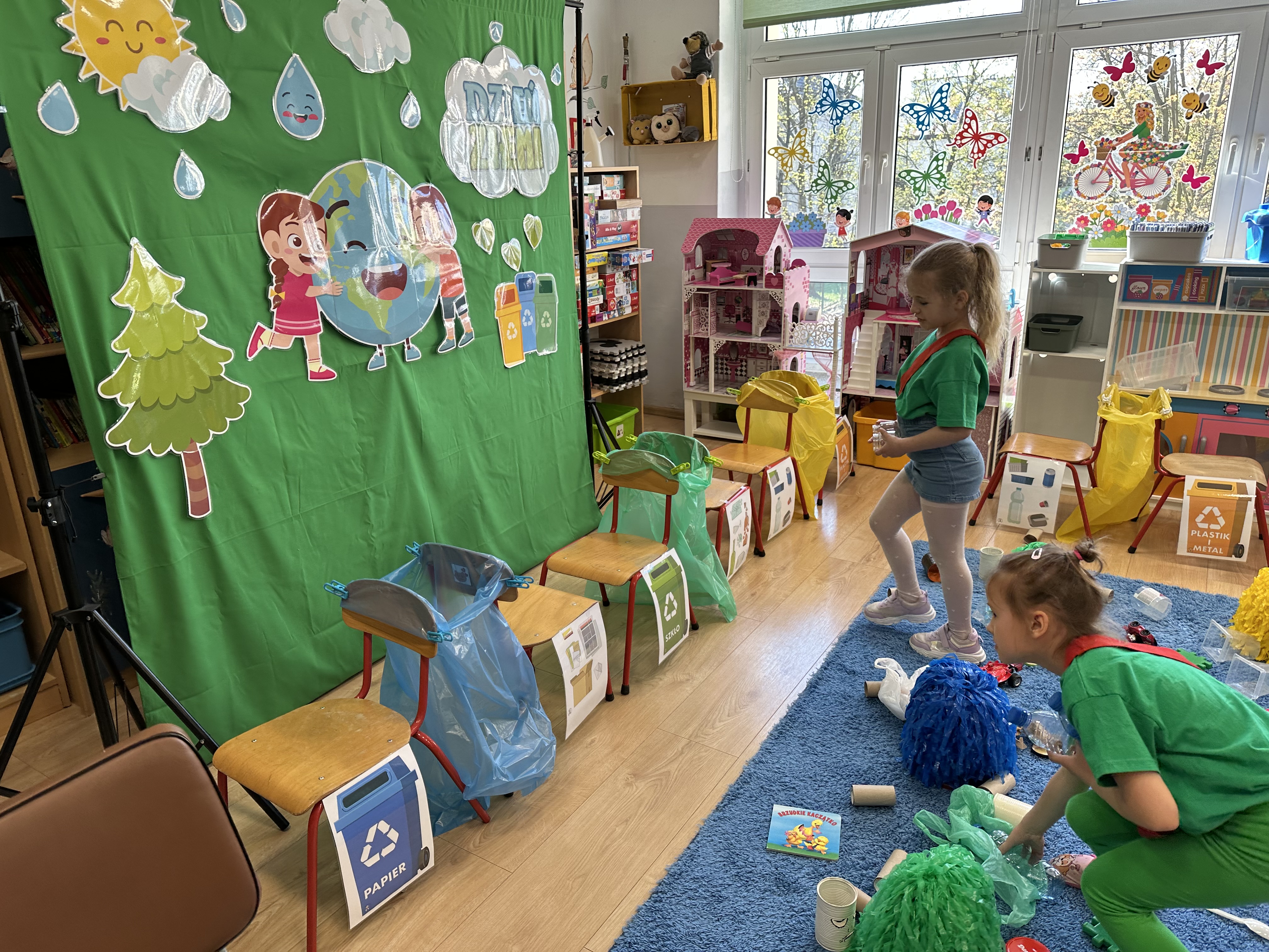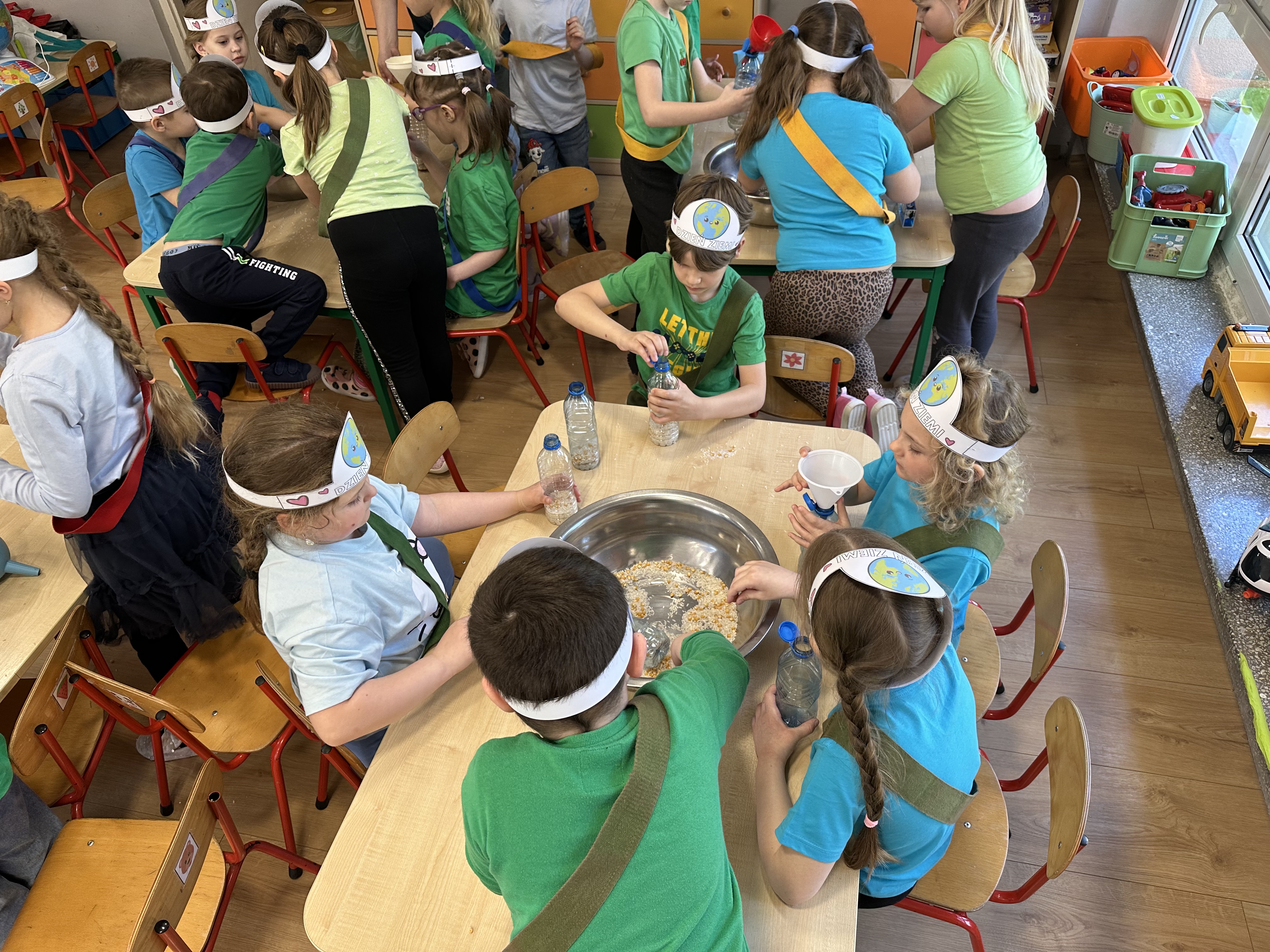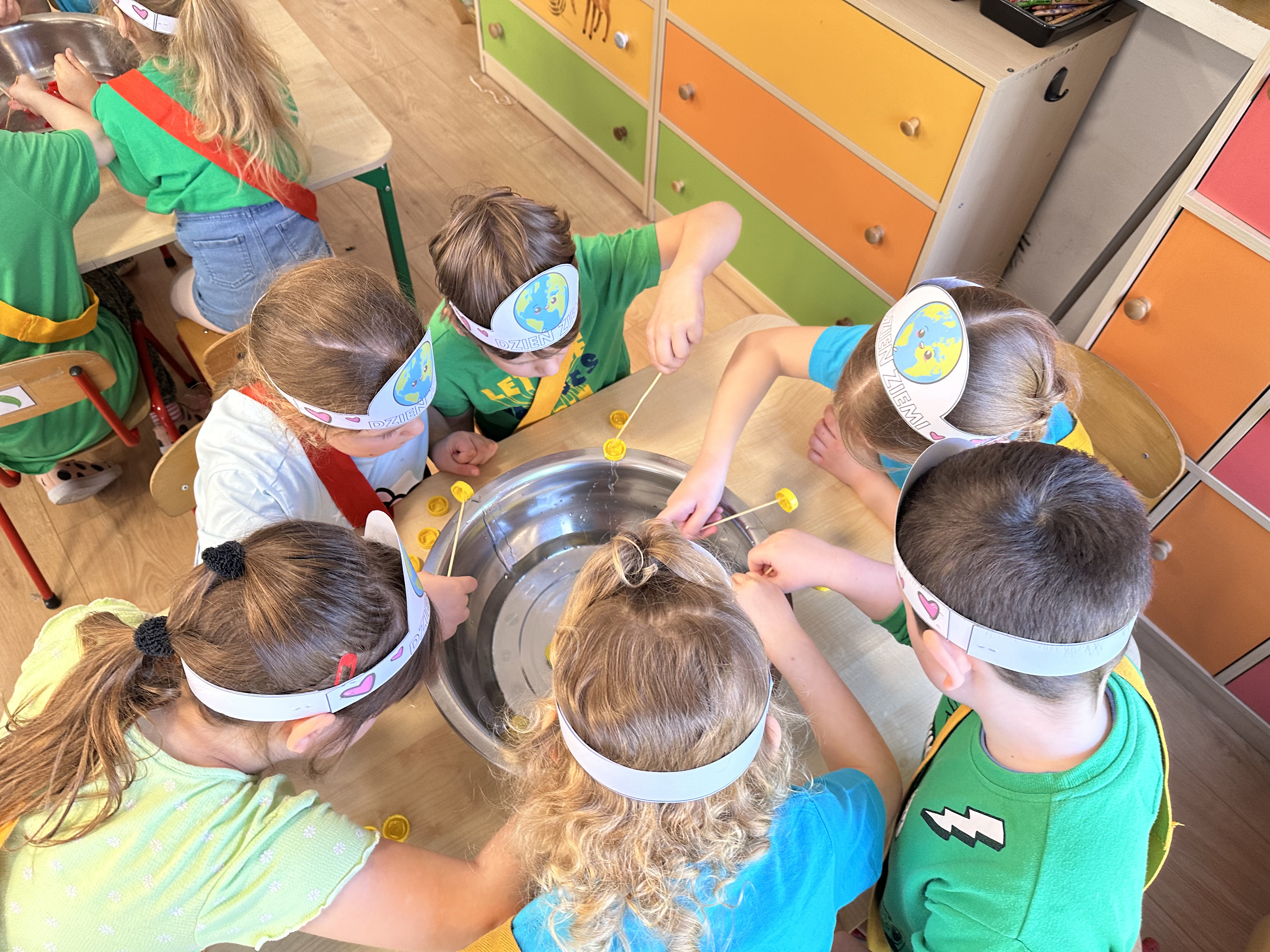 Kolejnym etapem było zadanie związane z ochroną mórz i oceanów. Dzieci „ratowały morze”, wyławiając z niebieskiego dywanu (symbolizującego wodę) różnego rodzaju odpady. Następnie uczyły się ich prawidłowej segregacji, co było doskonałą okazją do utrwalenia zasad dbania o środowisko.