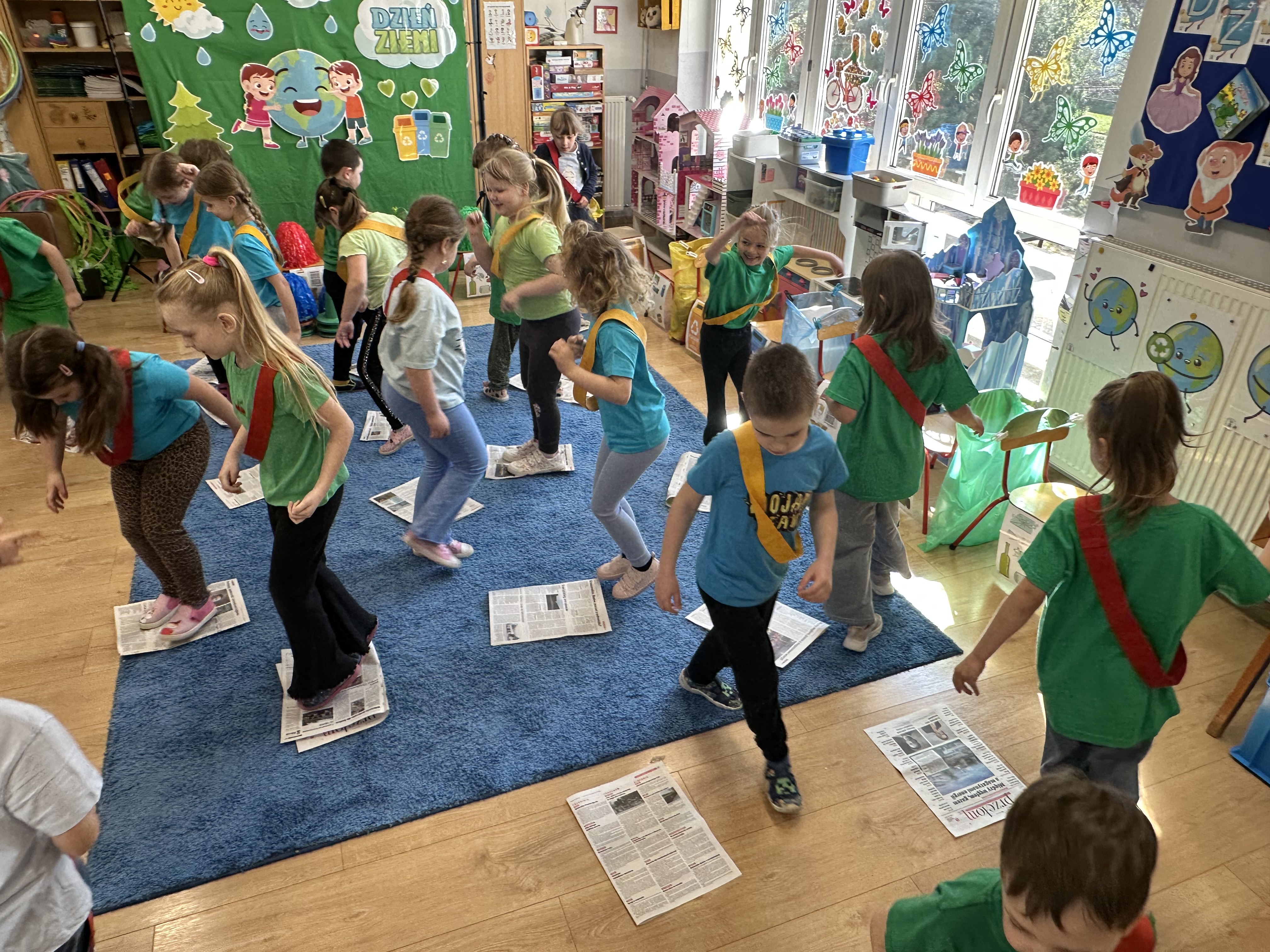 -taniec na gazecie przy muzyce, rozwijający koordynację i integrację grupy,