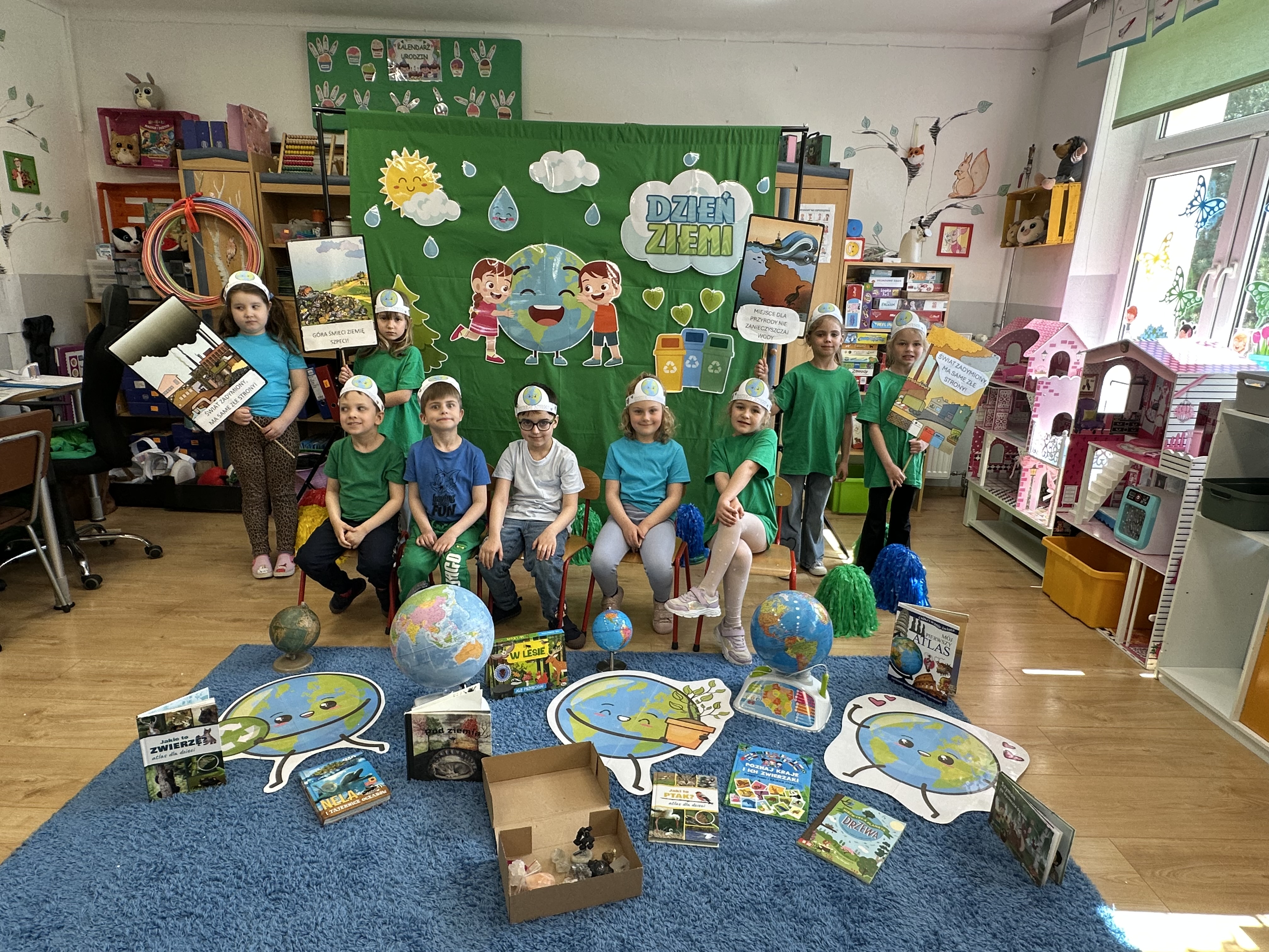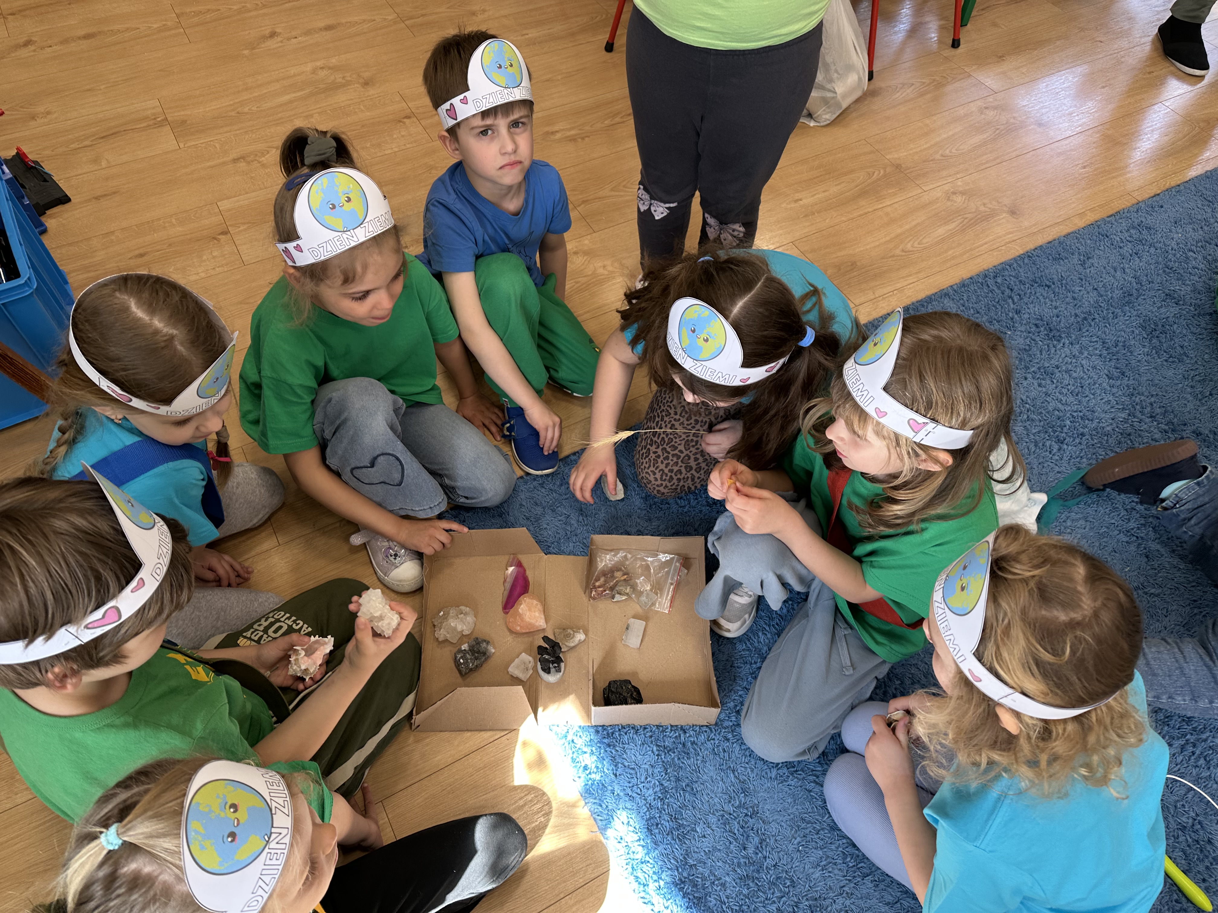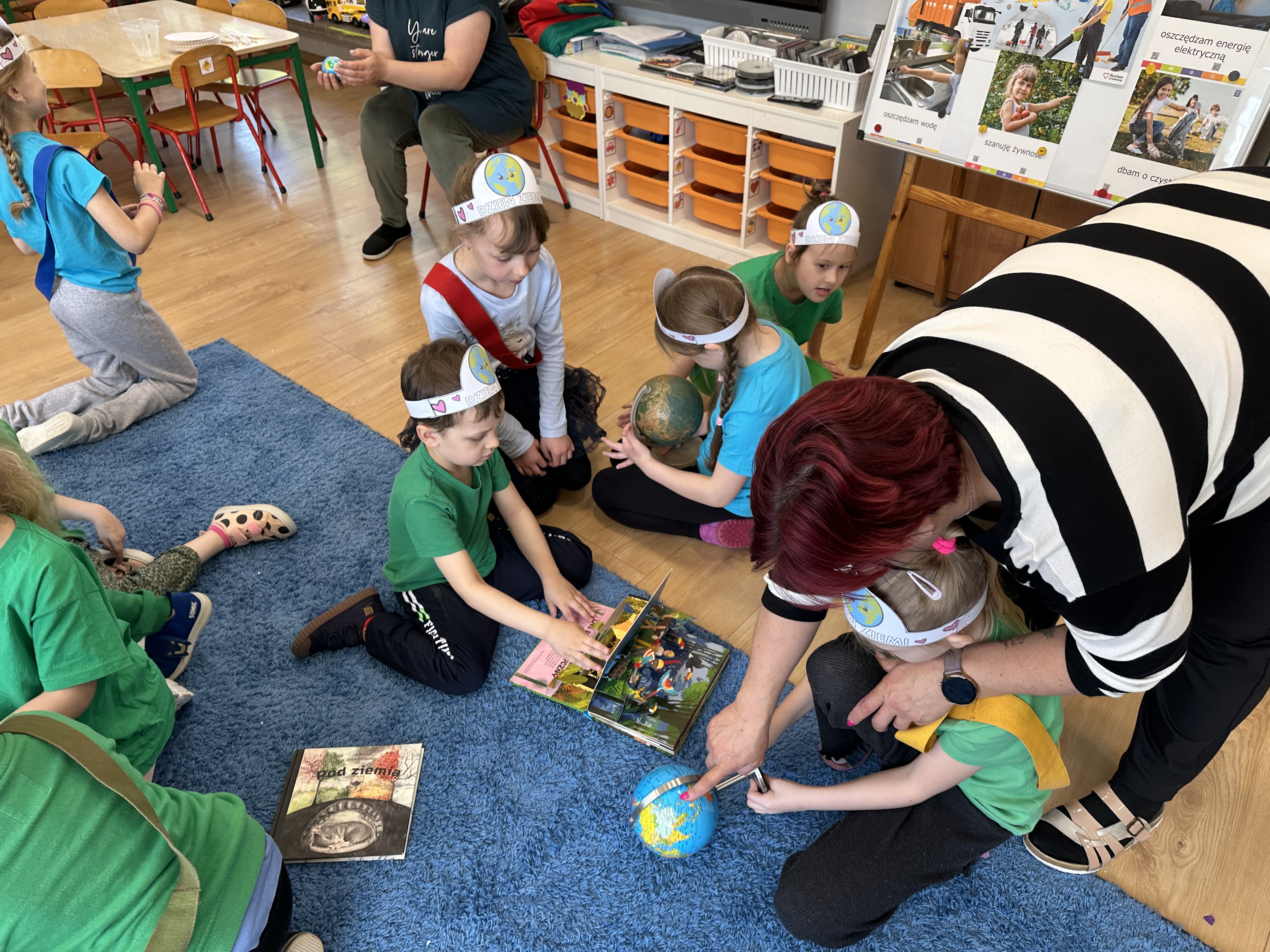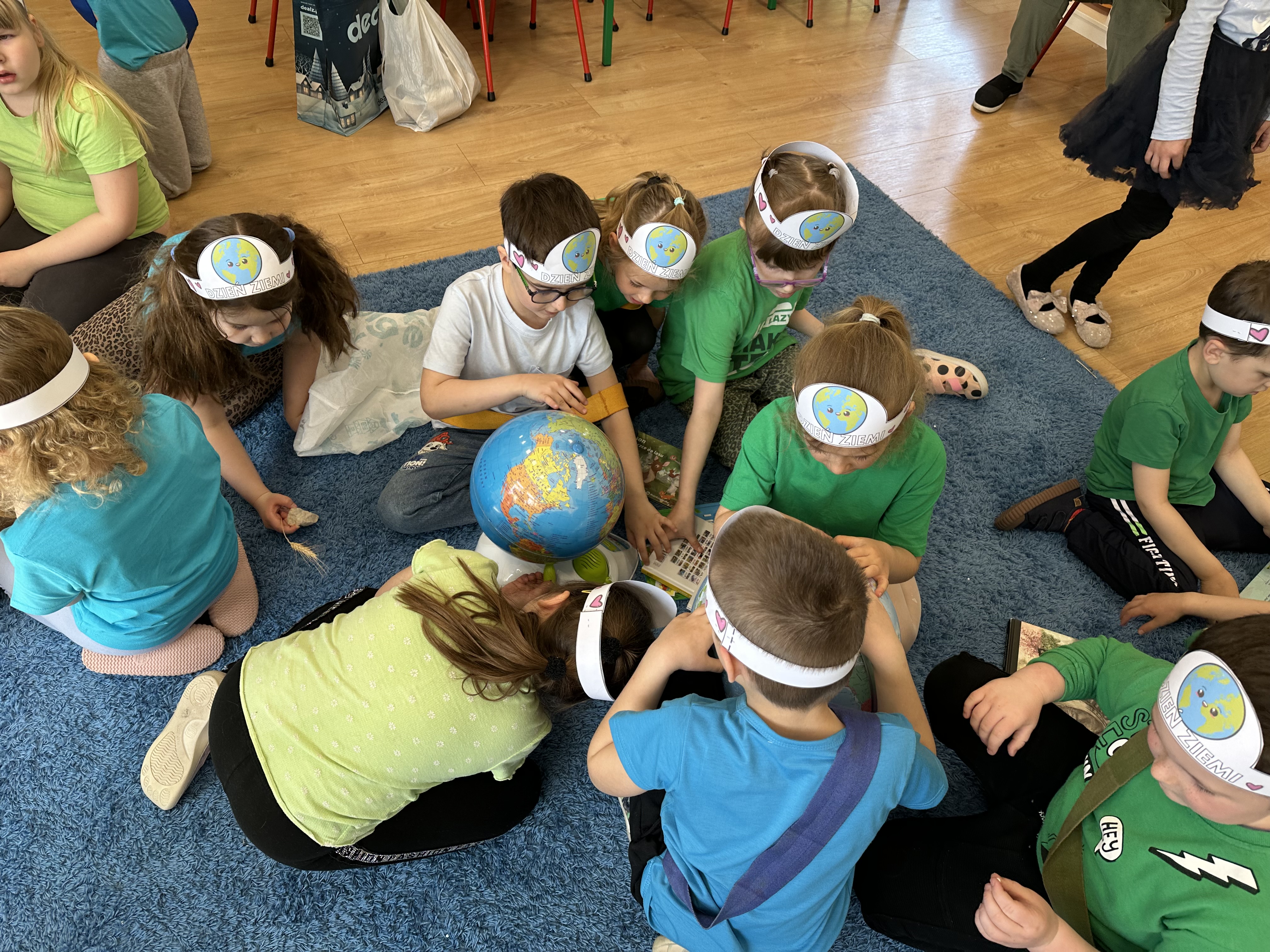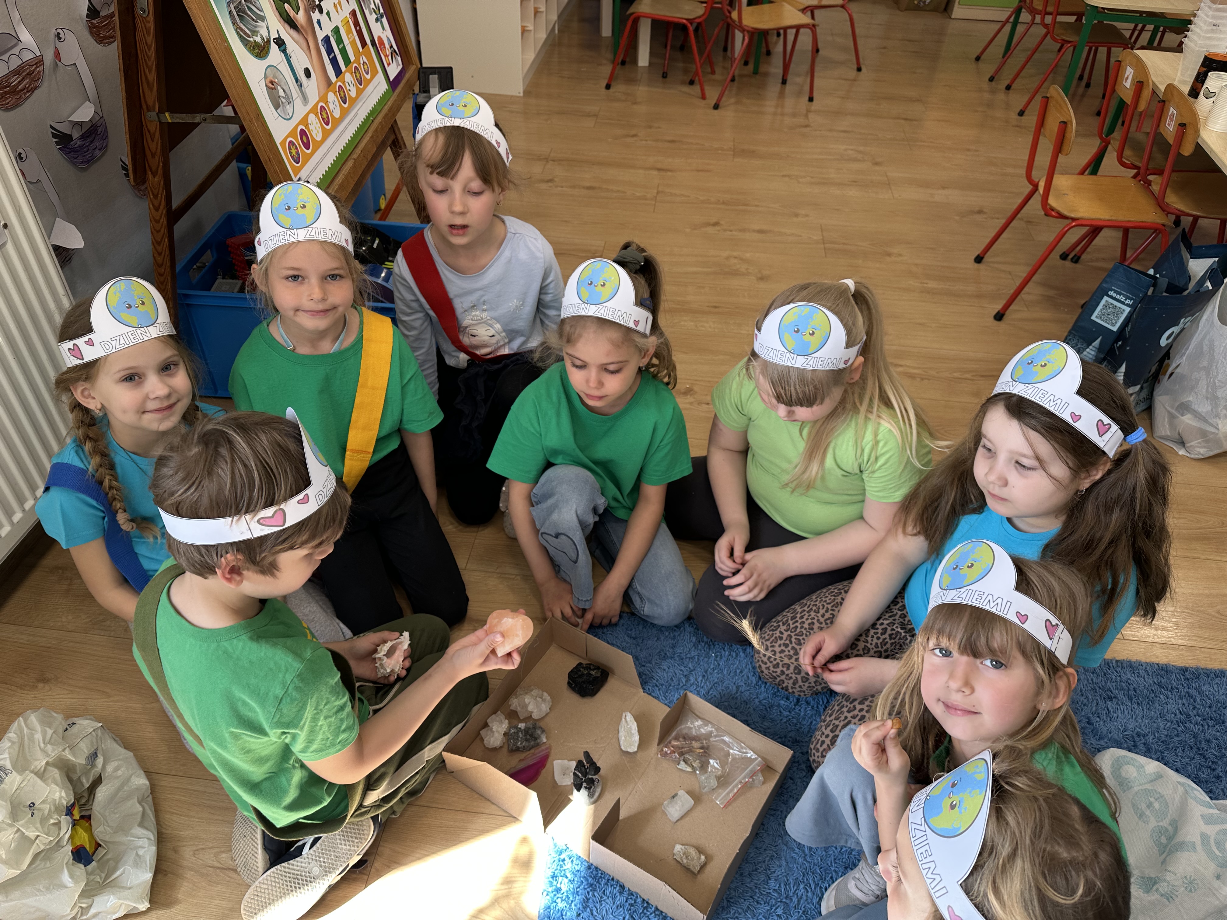 -prezentacja przedmiotów przyniesionych przez dzieci, takich jak globusy, książki czy „skarby Ziemi” (np. bursztyny, pamiątki z kopalni soli),