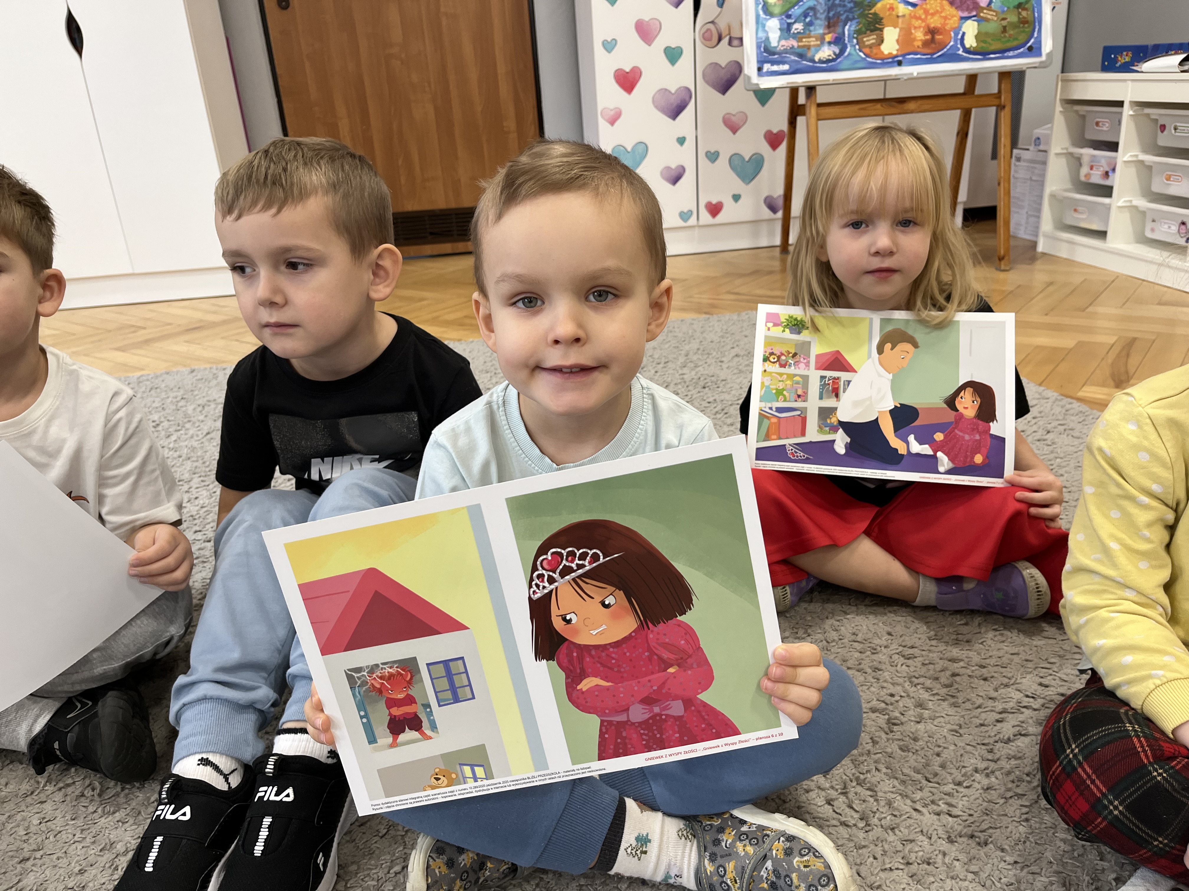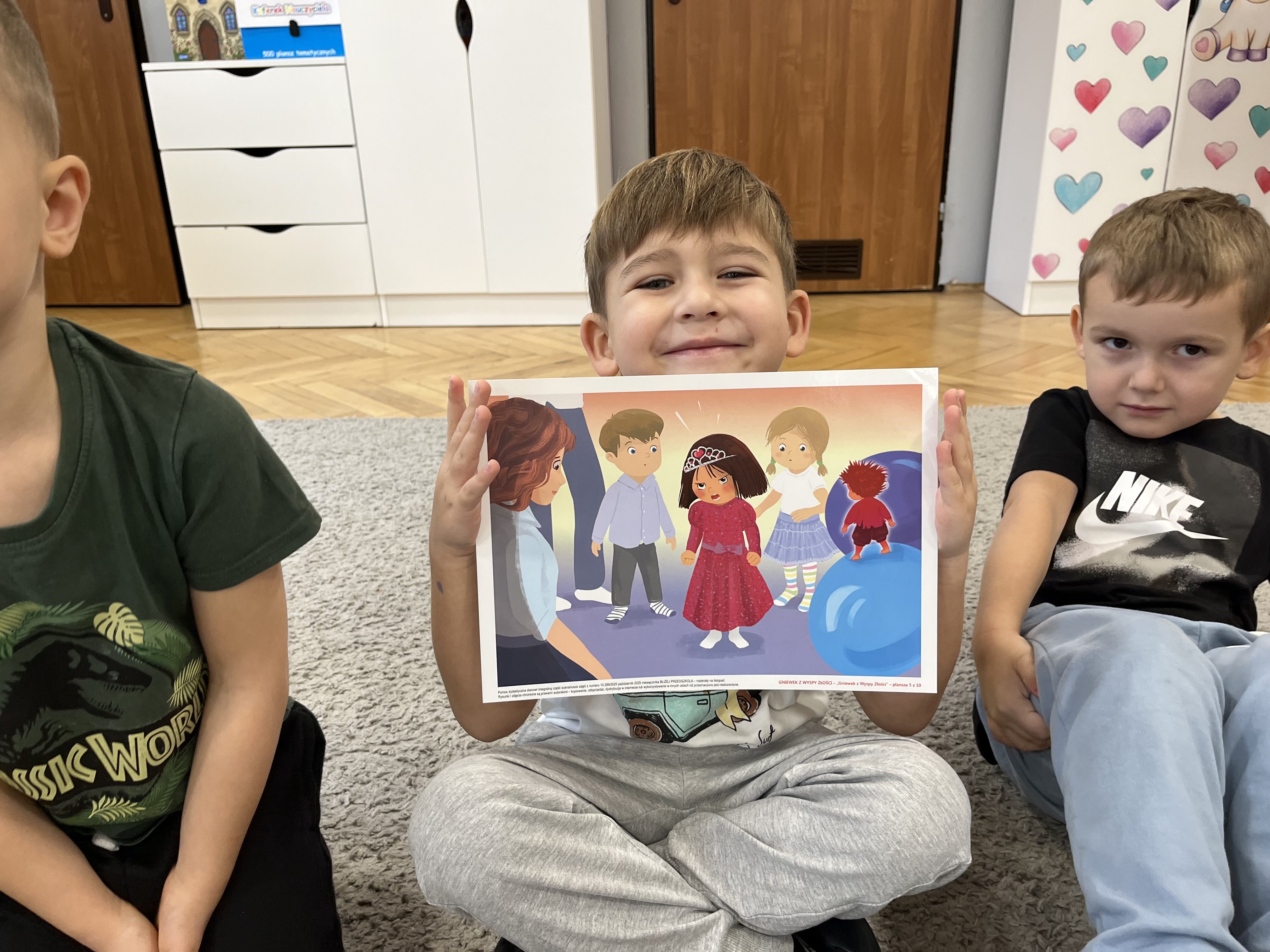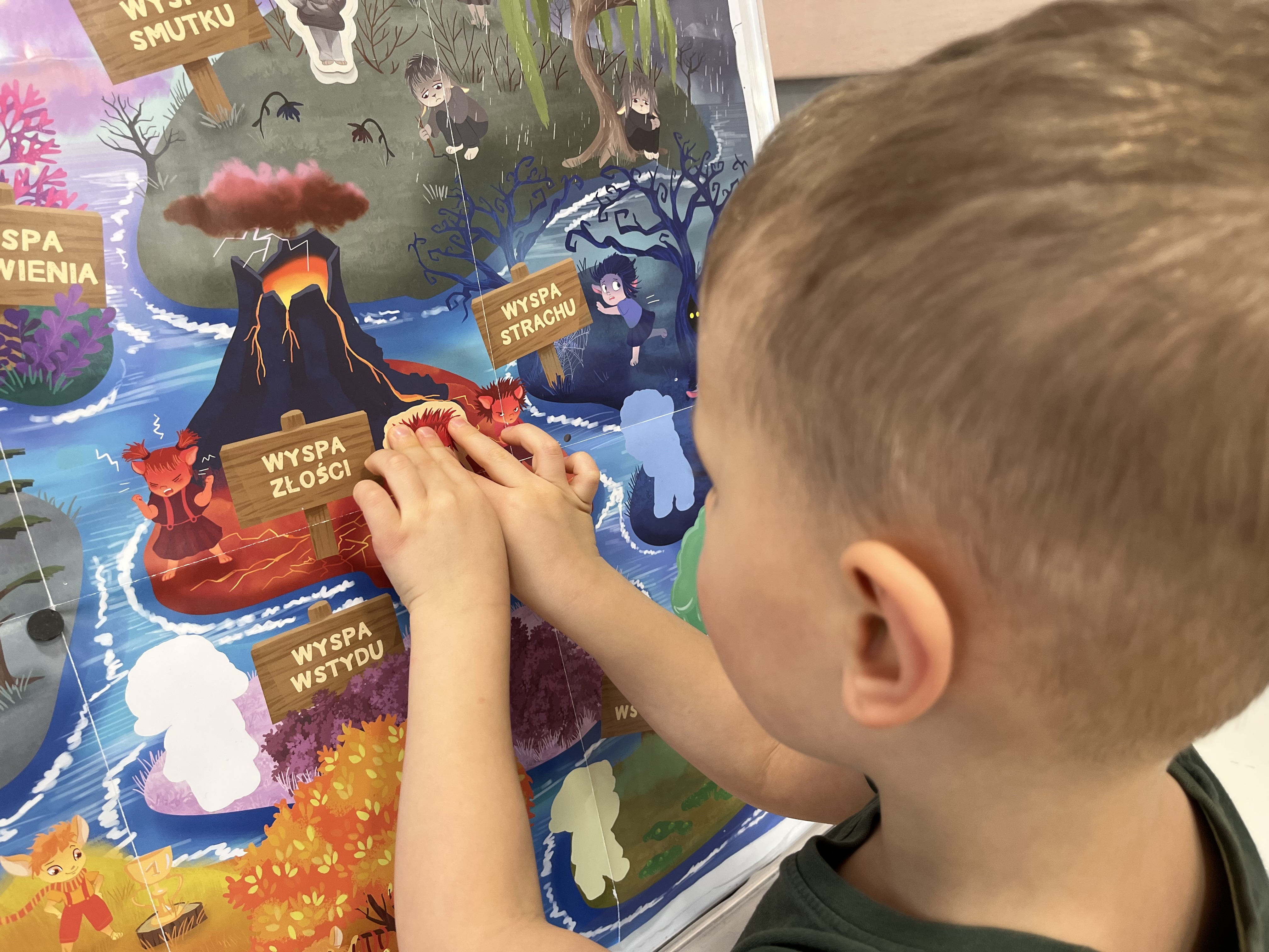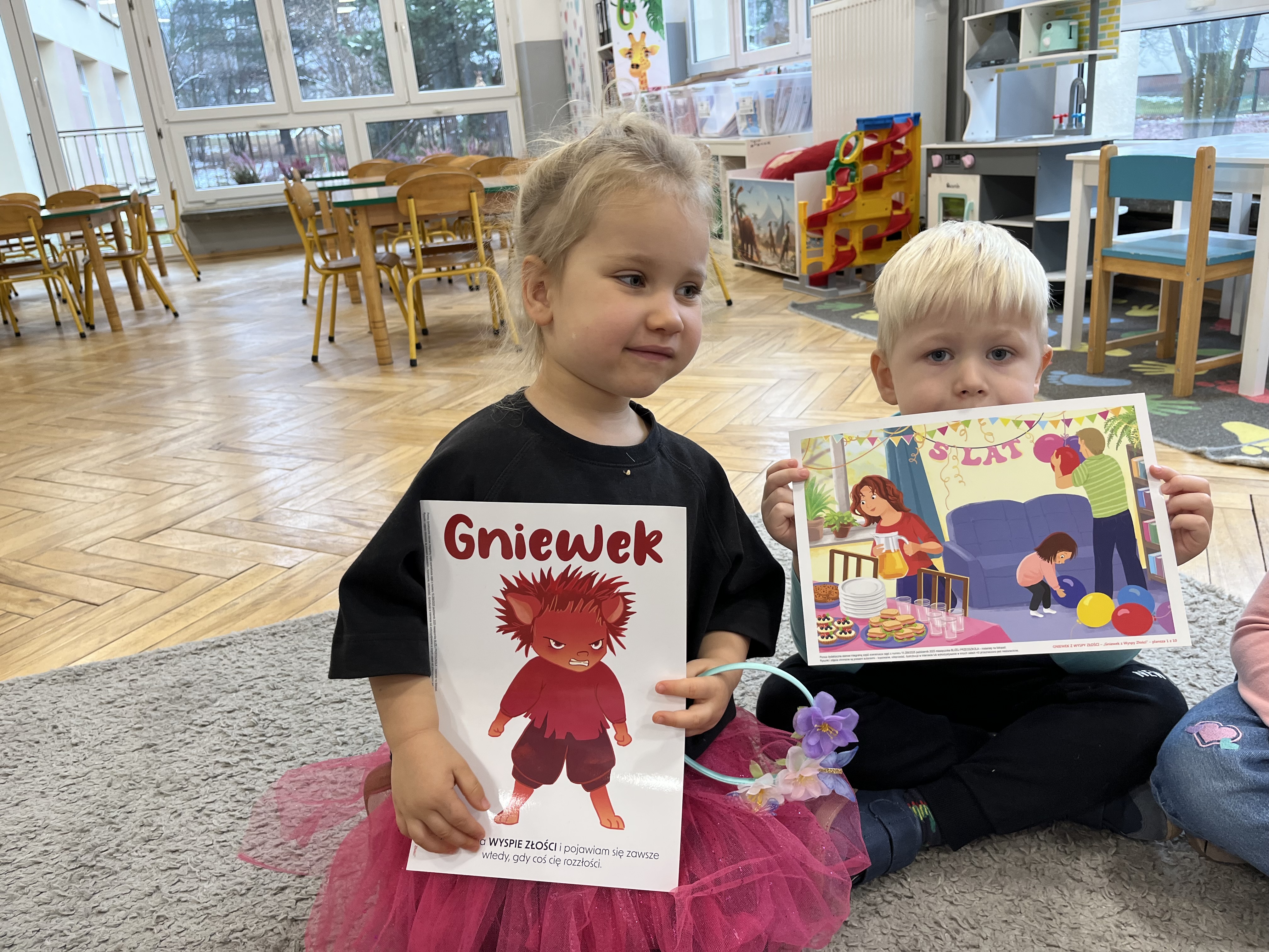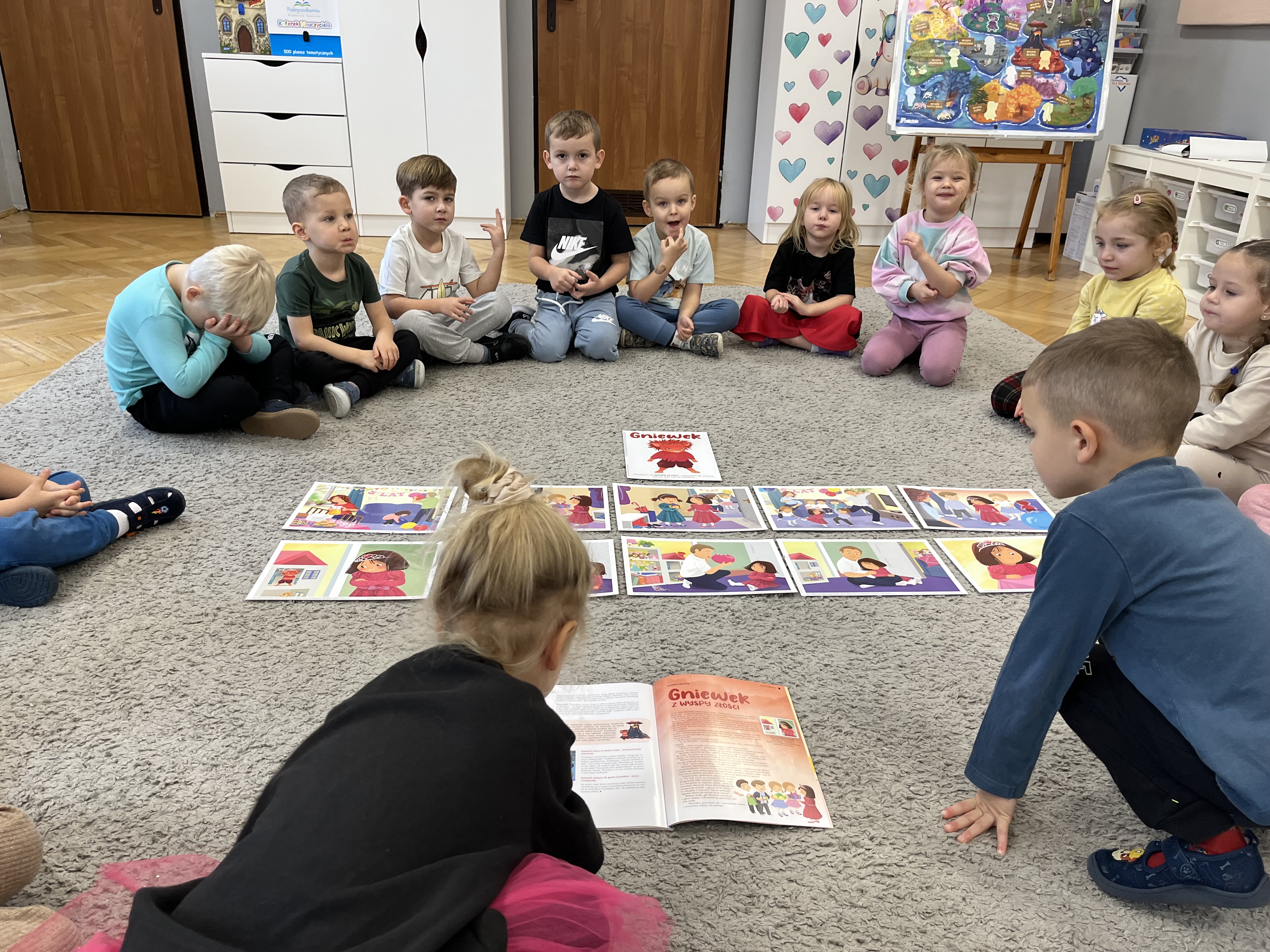 w grudniu w naszej grupie realizowaliśmy kolejne zajęcia w ramach projektu „Czuciaki”, tym razem poświęcone emocji złości. Punktem wyjścia była bajka „Gniewek z Wyspy Złości” Natalii Łasochy, której bohaterką jest Martynka przeżywająca bardzo intensywne emocje w dniu swoich urodzin. Podczas zajęć dzieci wysłuchały bajki, oglądały ilustracje i rozmawiały o tym, co czuła Martynka oraz dlaczego pojawił się u niej Gniewek – Czuciak symbolizujący złość. Wspólnie doszliśmy do wniosku, że złość jest naturalną emocją, którą odczuwa każdy z nas, zarówno dzieci, jak i dorośli. Rozmawialiśmy jednak także o tym, że bardzo ważne jest, w jaki sposób ją wyrażamy, aby nie ranić innych.