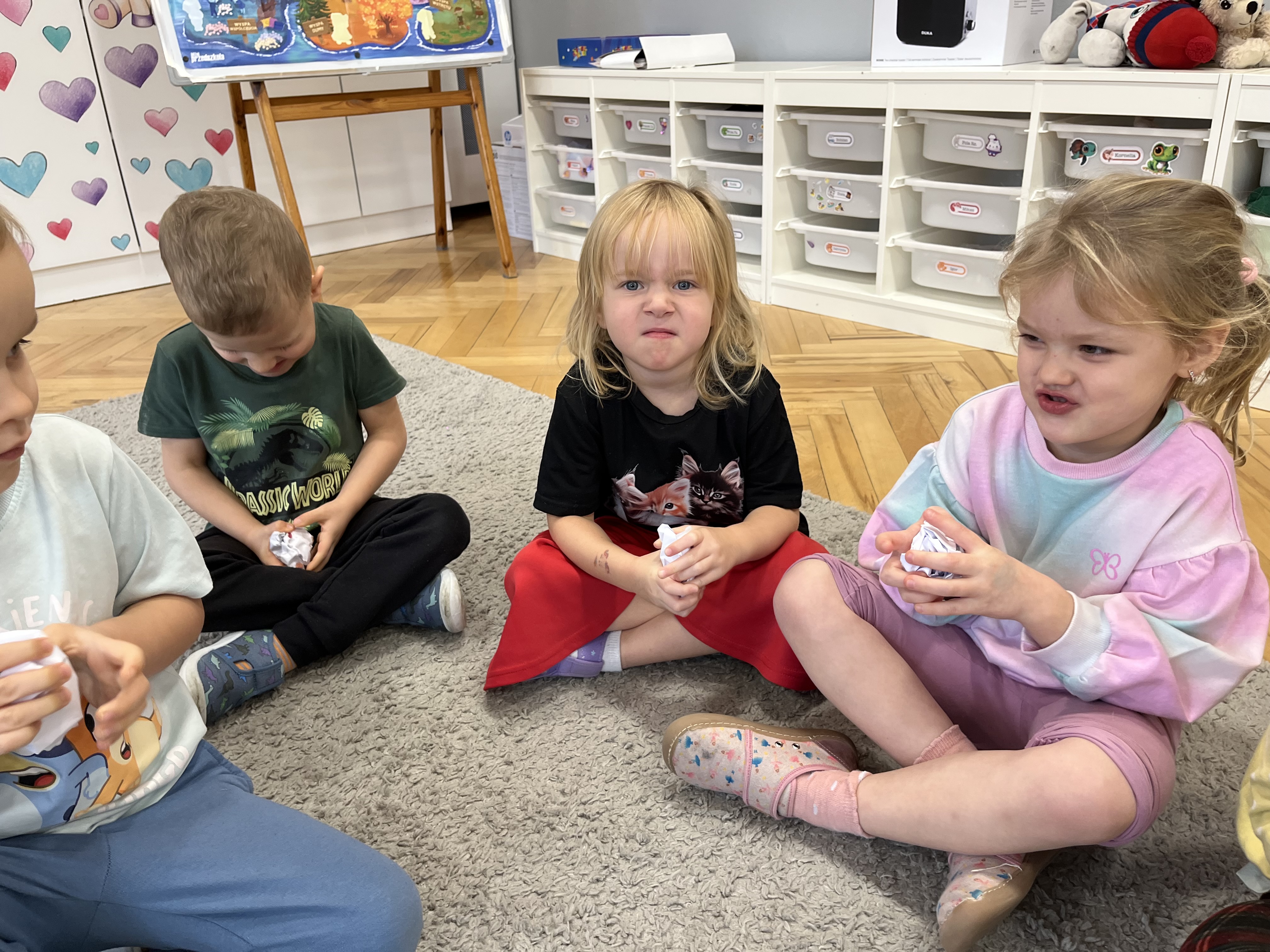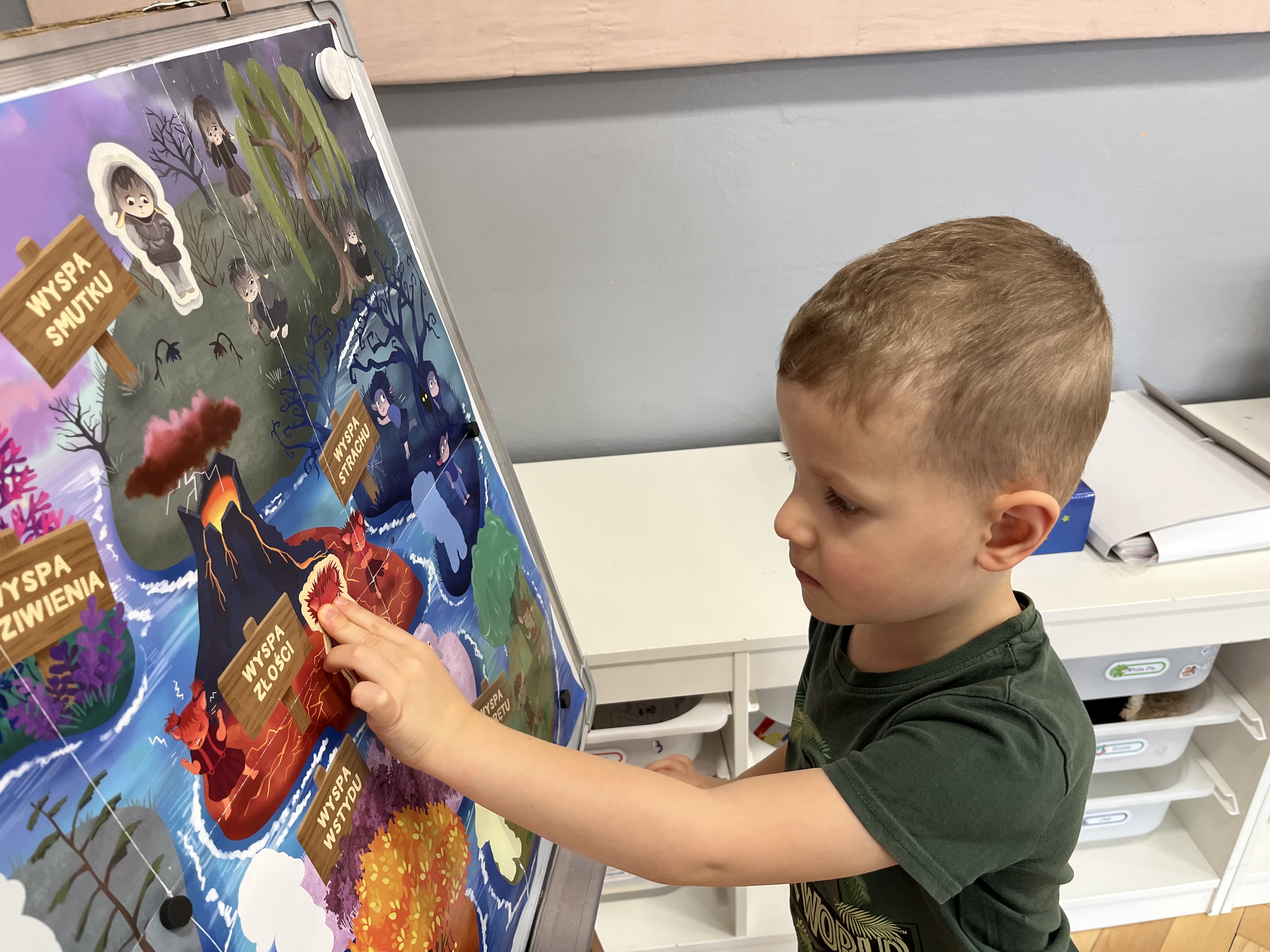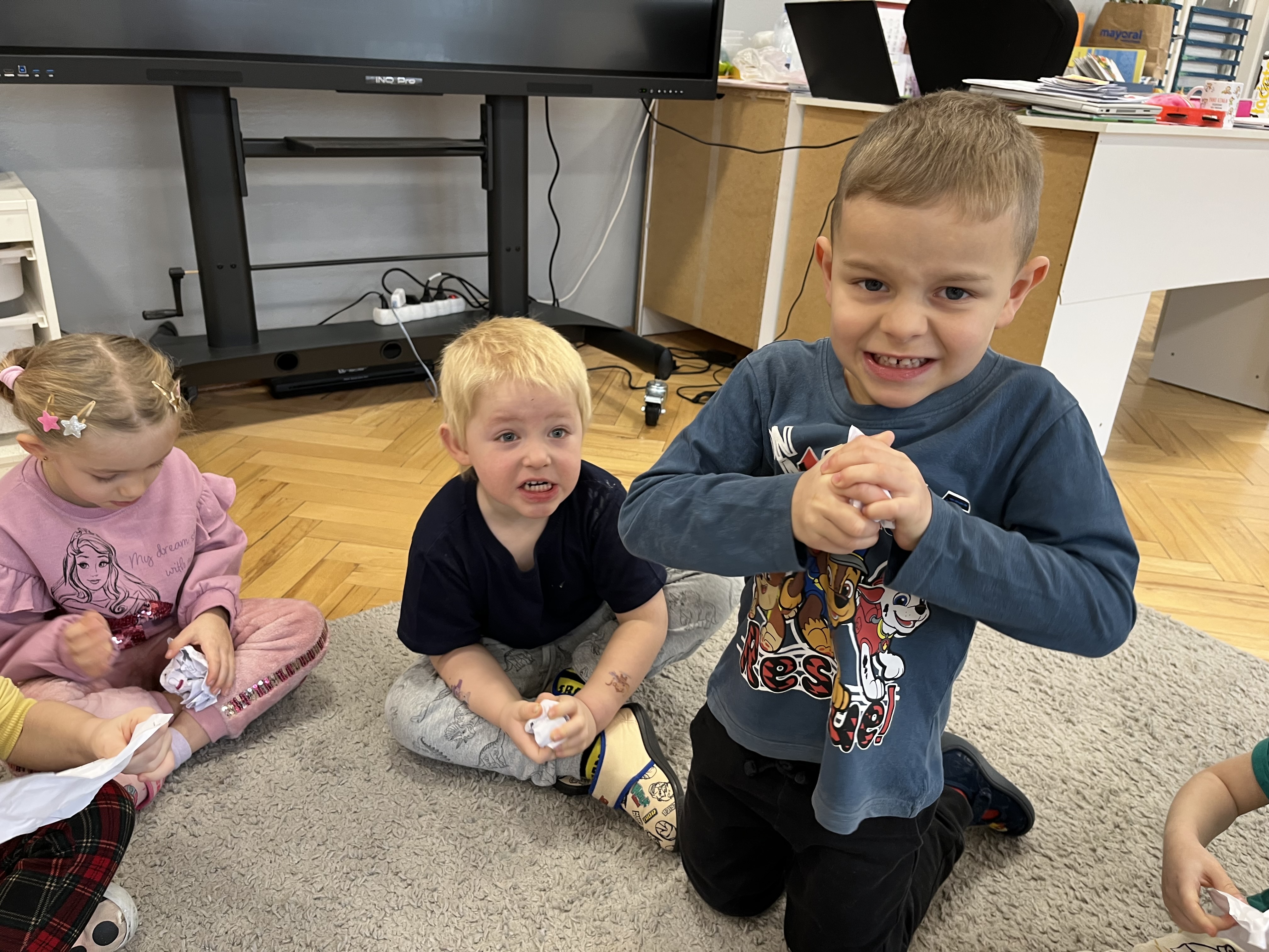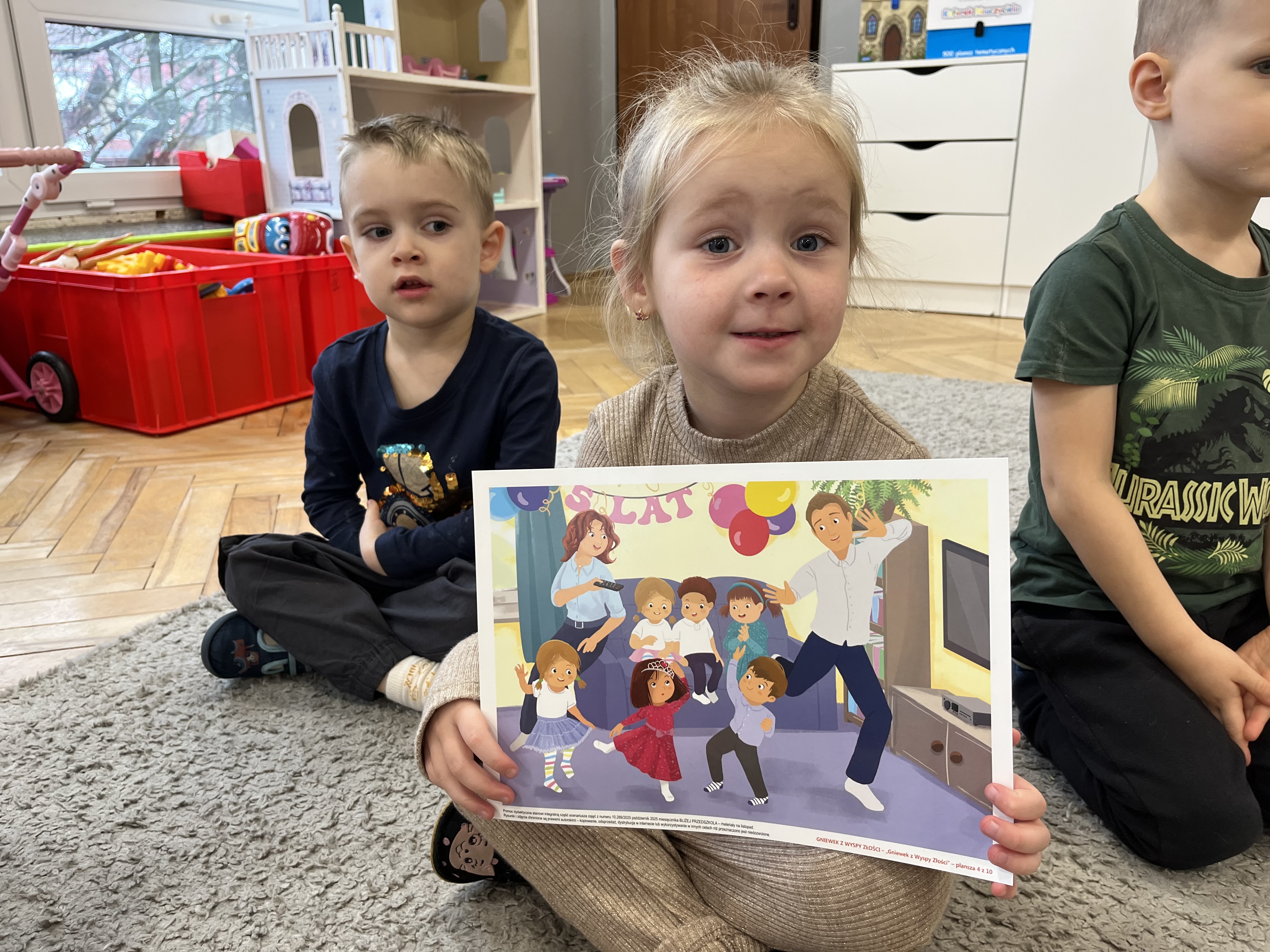 w grudniu w naszej grupie realizowaliśmy kolejne zajęcia w ramach projektu „Czuciaki”, tym razem poświęcone emocji złości. Punktem wyjścia była bajka „Gniewek z Wyspy Złości” Natalii Łasochy, której bohaterką jest Martynka przeżywająca bardzo intensywne emocje w dniu swoich urodzin. Podczas zajęć dzieci wysłuchały bajki, oglądały ilustracje i rozmawiały o tym, co czuła Martynka oraz dlaczego pojawił się u niej Gniewek – Czuciak symbolizujący złość. Wspólnie doszliśmy do wniosku, że złość jest naturalną emocją, którą odczuwa każdy z nas, zarówno dzieci, jak i dorośli. Rozmawialiśmy jednak także o tym, że bardzo ważne jest, w jaki sposób ją wyrażamy, aby nie ranić innych.