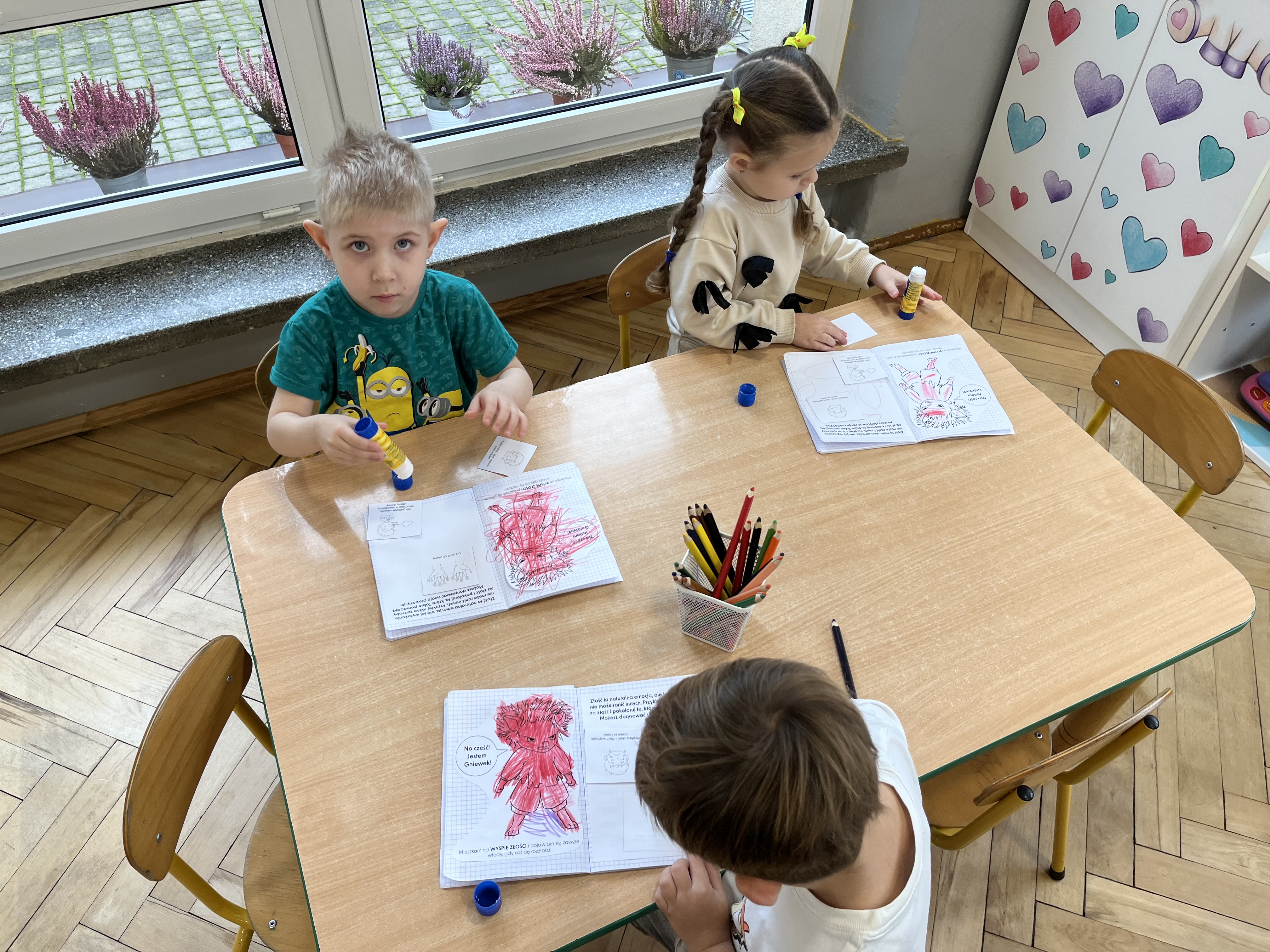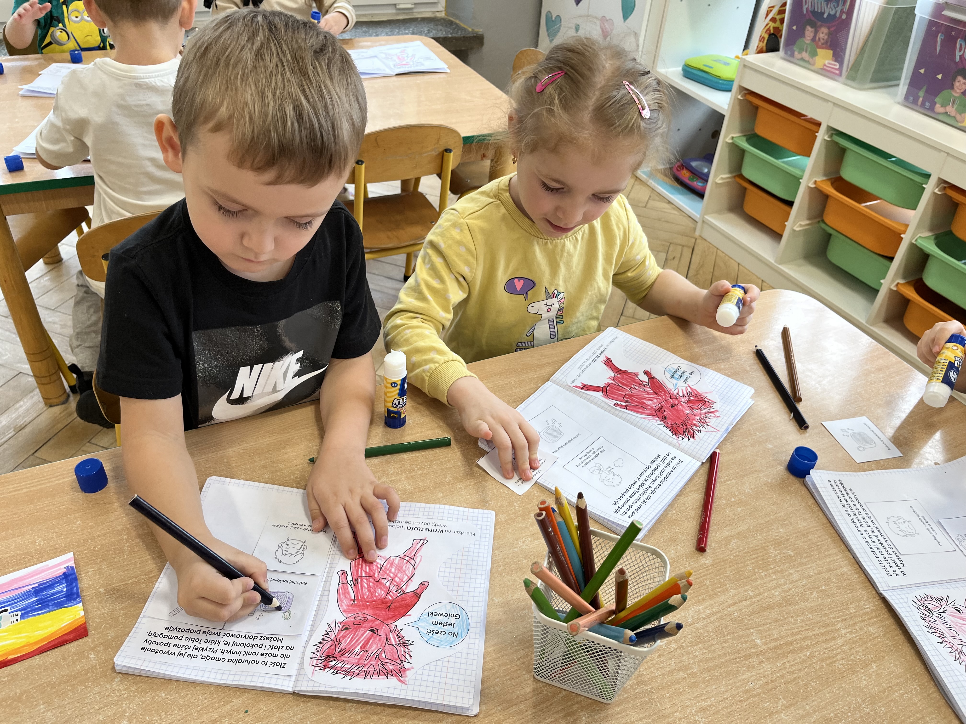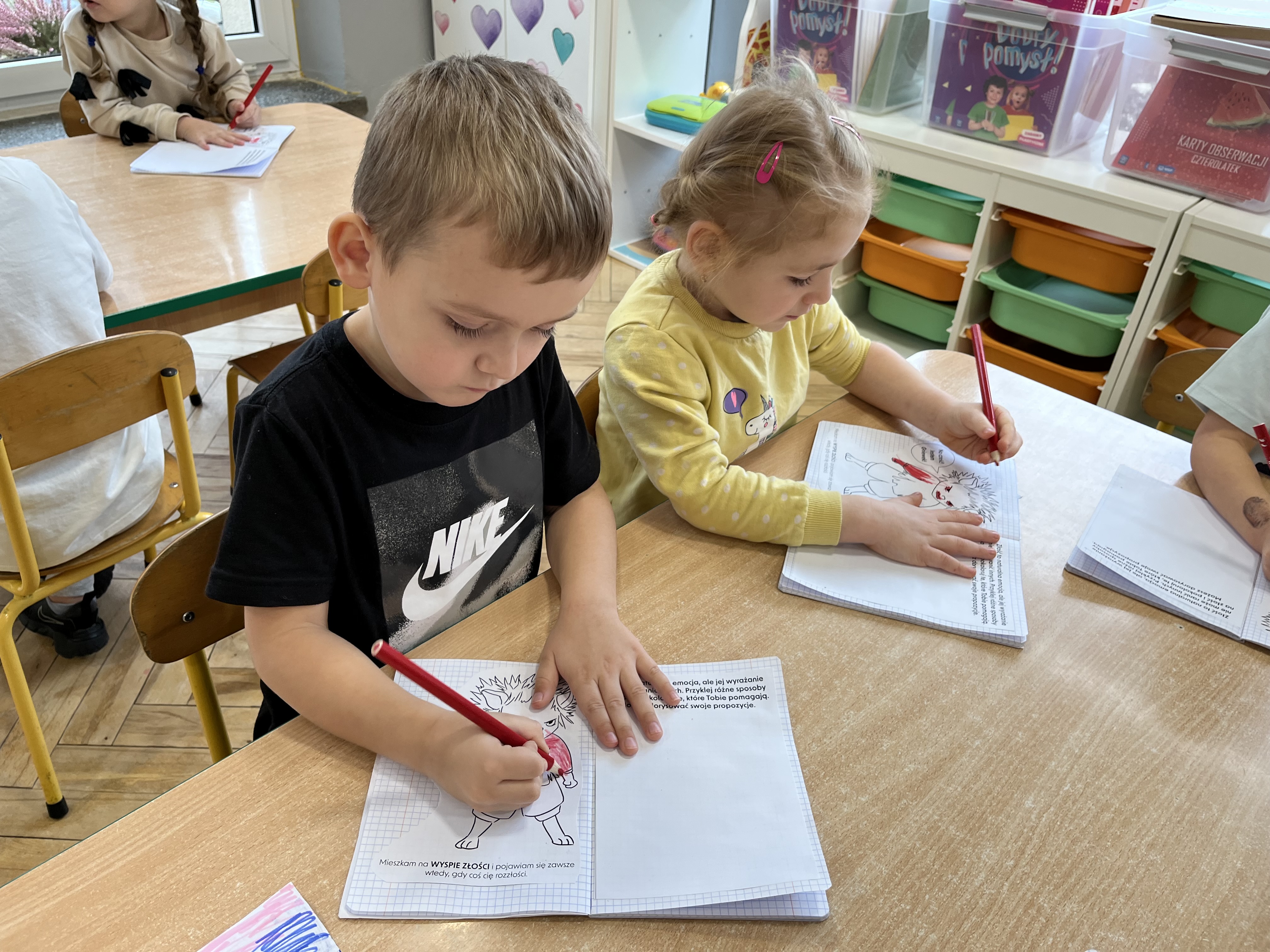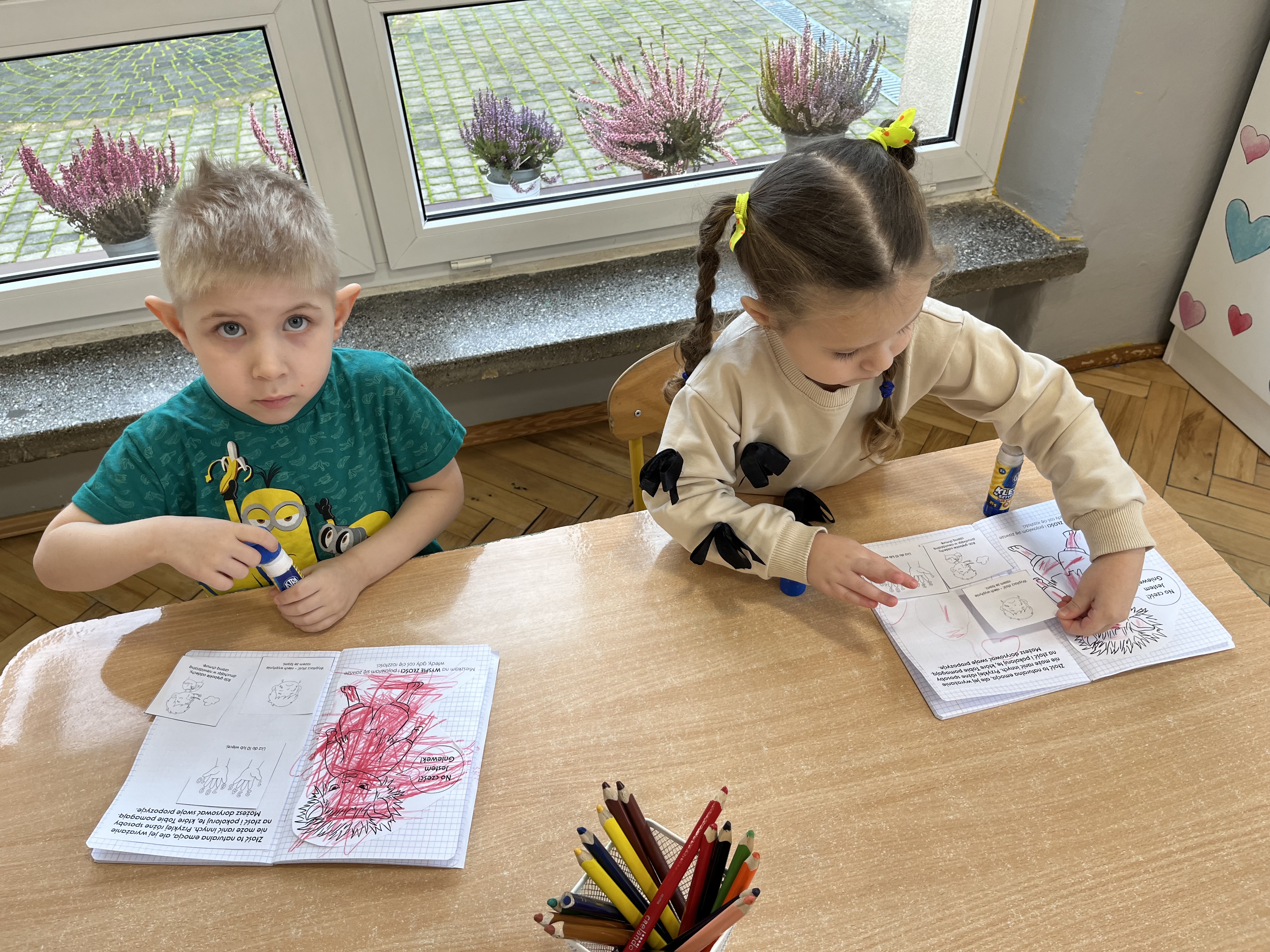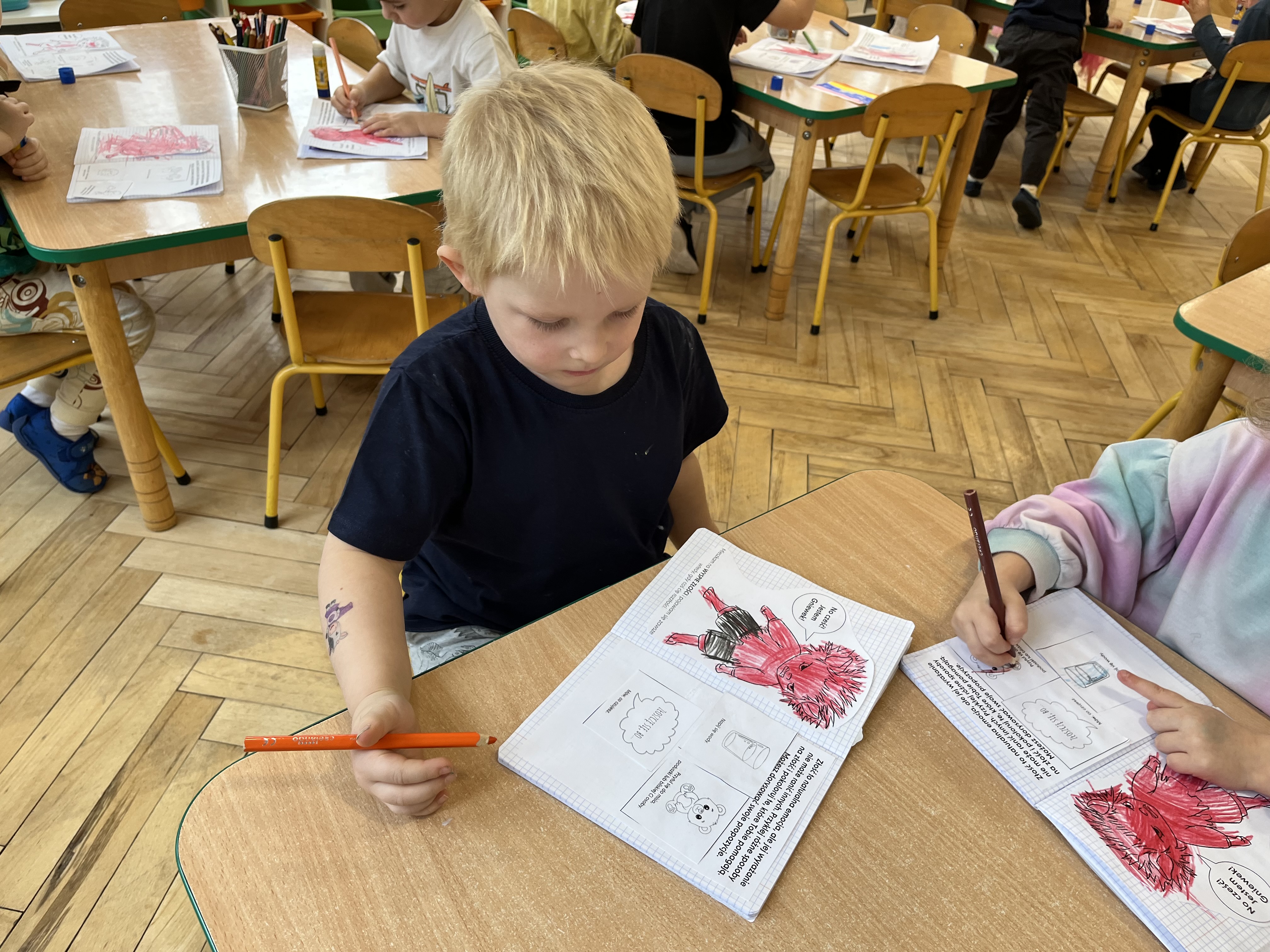 W trakcie zajęć dzieci uczestniczyły w prostym doświadczeniu z balonem, które obrazowało narastanie napięcia emocjonalnego. Przedszkolaki zauważyły, że tłumienie złości może prowadzić do „wybuchu”, natomiast mówienie o uczuciach i stosowanie odpowiednich sposobów pomaga to napięcie zmniejszyć. Wspólnie stworzyliśmy „bank pomysłów na złość”, w którym znalazły się m.in. głębokie oddechy, ruch, rysowanie, przytulanie, rozmowa o emocjach czy chwila wyciszenia. Dzieci pracowały również z emocjonalną książeczką – wklejały sylwetę Gniewka, kolorowały go oraz zaznaczały własne sposoby radzenia sobie ze złością. Zwracaliśmy uwagę, że na nasze emocje wpływa także zmęczenie czy głód, co było widoczne w historii Martynki.