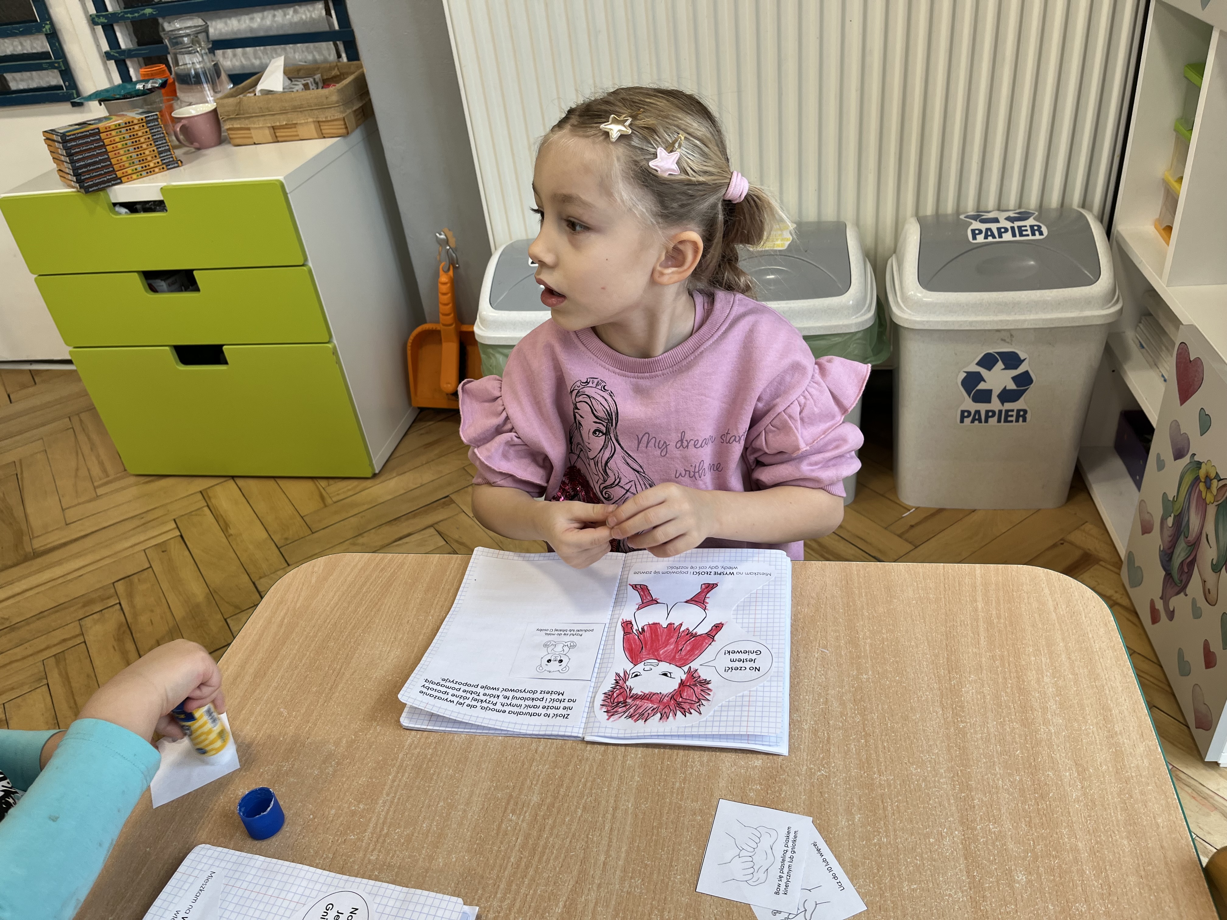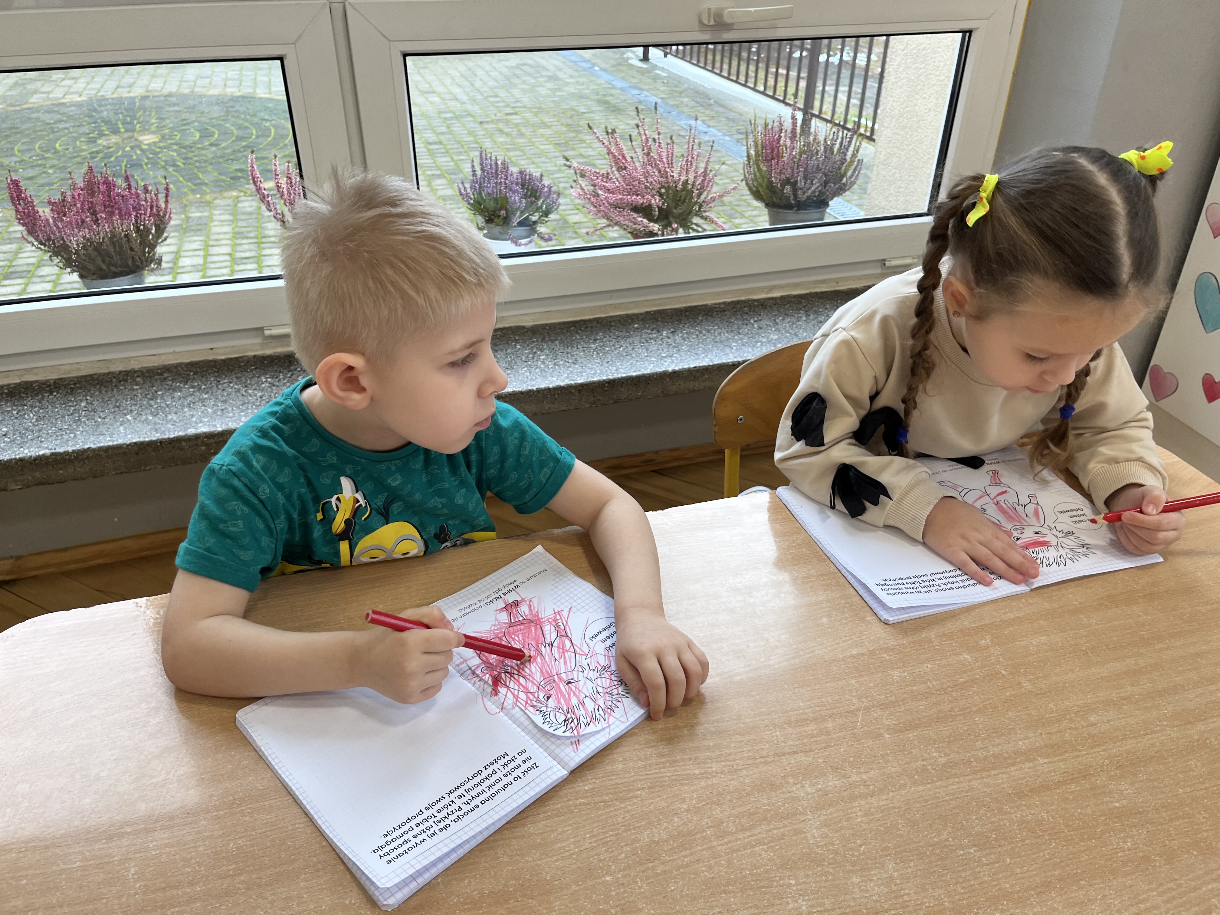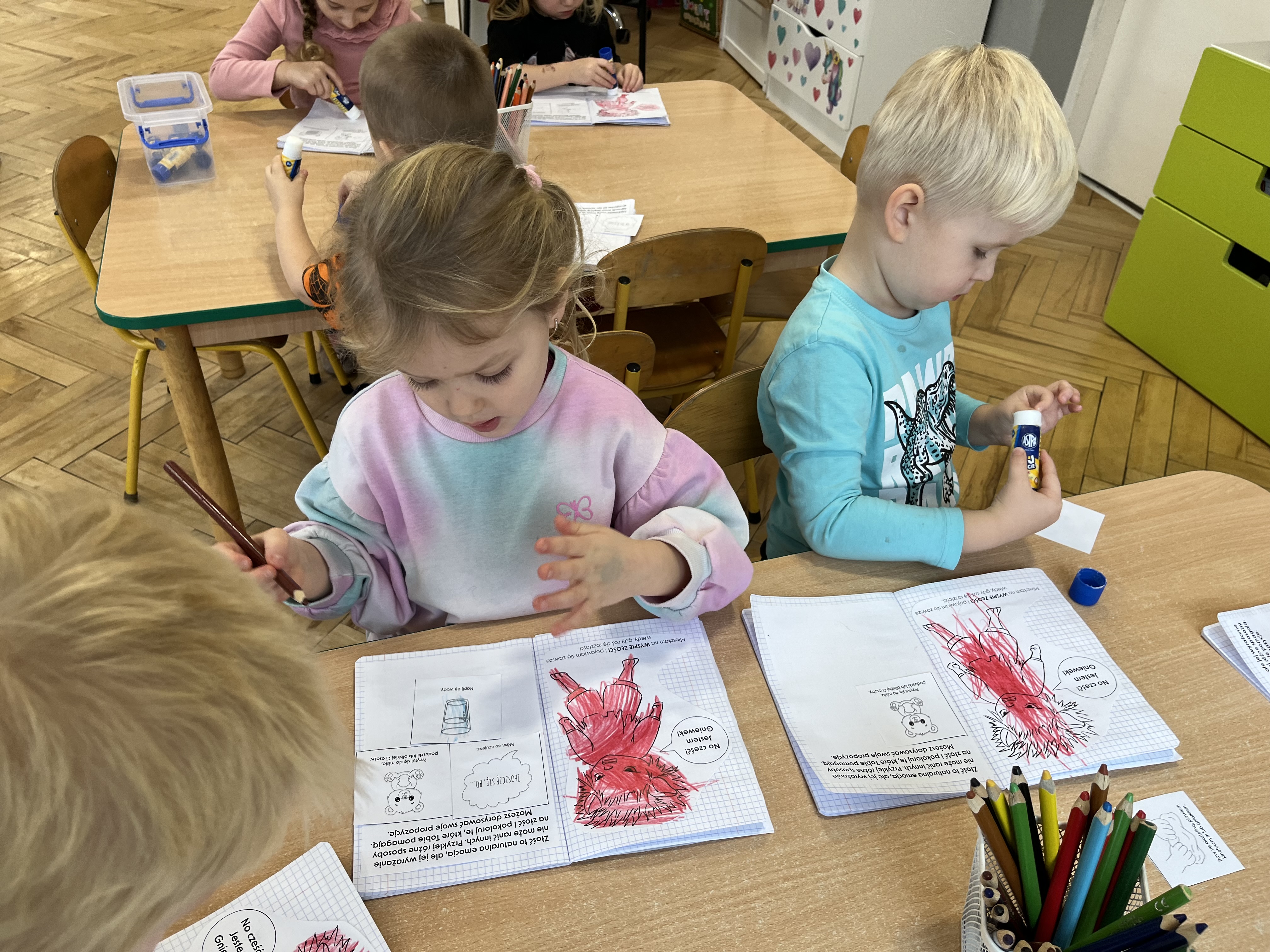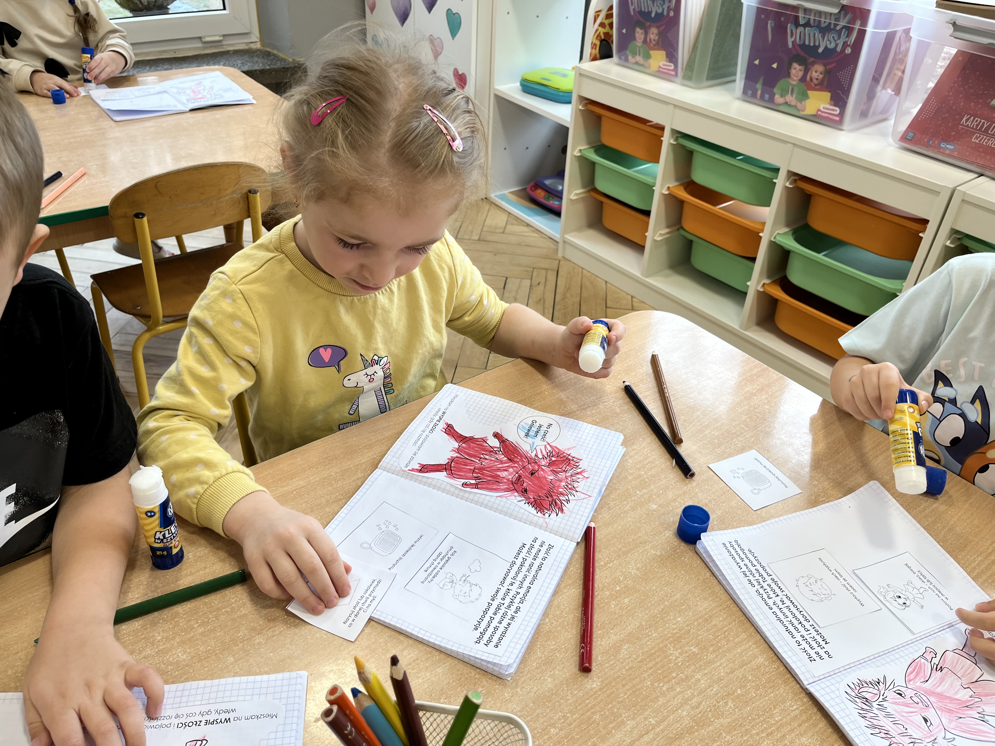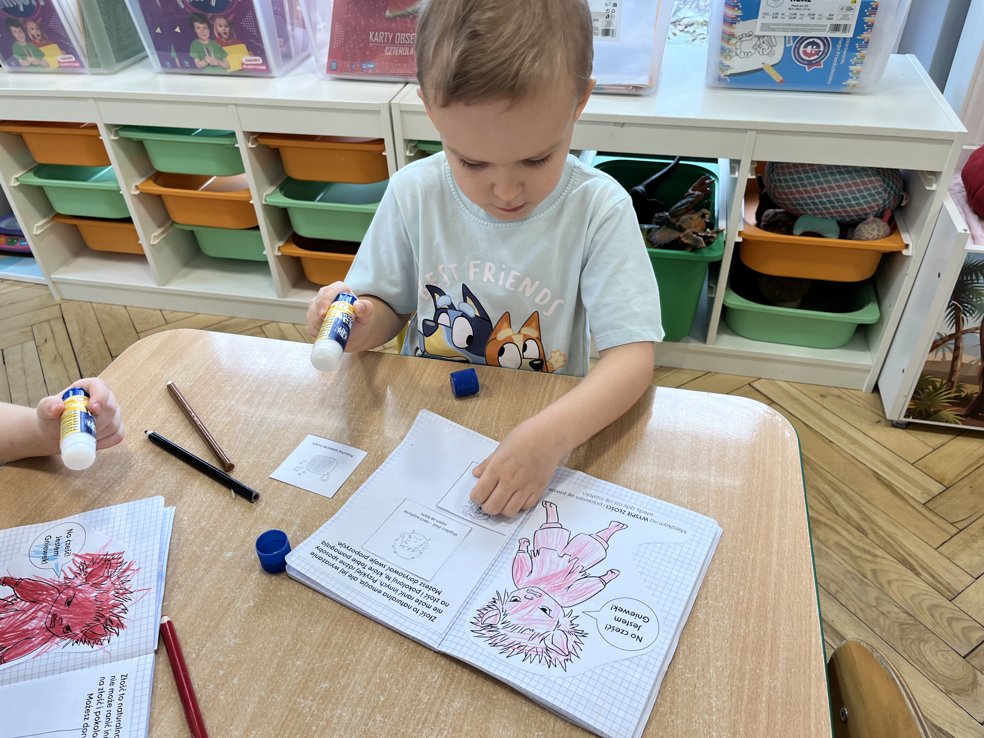 W trakcie zajęć dzieci uczestniczyły w prostym doświadczeniu z balonem, które obrazowało narastanie napięcia emocjonalnego. Przedszkolaki zauważyły, że tłumienie złości może prowadzić do „wybuchu”, natomiast mówienie o uczuciach i stosowanie odpowiednich sposobów pomaga to napięcie zmniejszyć. Wspólnie stworzyliśmy „bank pomysłów na złość”, w którym znalazły się m.in. głębokie oddechy, ruch, rysowanie, przytulanie, rozmowa o emocjach czy chwila wyciszenia. Dzieci pracowały również z emocjonalną książeczką – wklejały sylwetę Gniewka, kolorowały go oraz zaznaczały własne sposoby radzenia sobie ze złością. Zwracaliśmy uwagę, że na nasze emocje wpływa także zmęczenie czy głód, co było widoczne w historii Martynki.