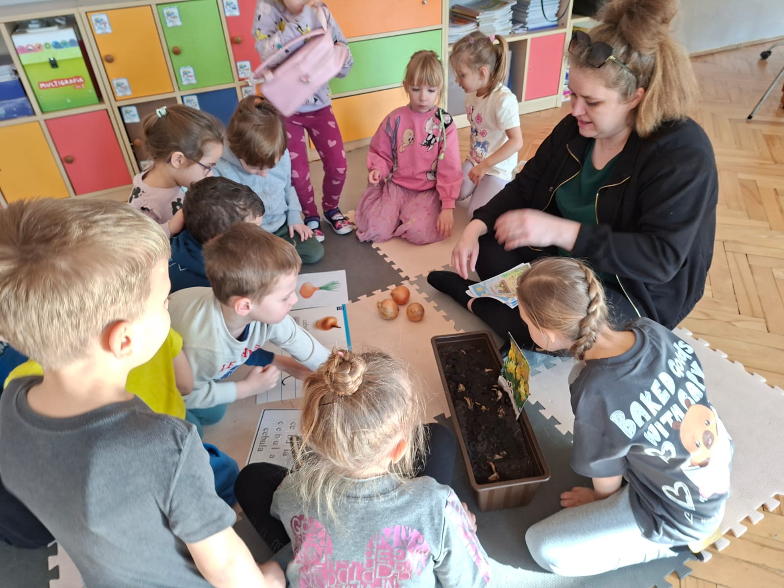 W trakcie zajęć rozmawialiśmy o tym, jak zakłada się wiosenną uprawę oraz czego potrzebują rośliny, aby mogły rosnąć i się rozwijać. Dzieci miały również okazję wcielić się w małych ogrodników – wspólnie sadziliśmy kwiaty z nasion: bratki i aksamitki, a także kwiaty z cebulek – narcyzy. Posadziliśmy również warzywa – pomidory. Dzieci z dużym zaangażowaniem uczestniczyły w sadzeniu i z ciekawością obserwują, jak nasze rośliny będą rosły.