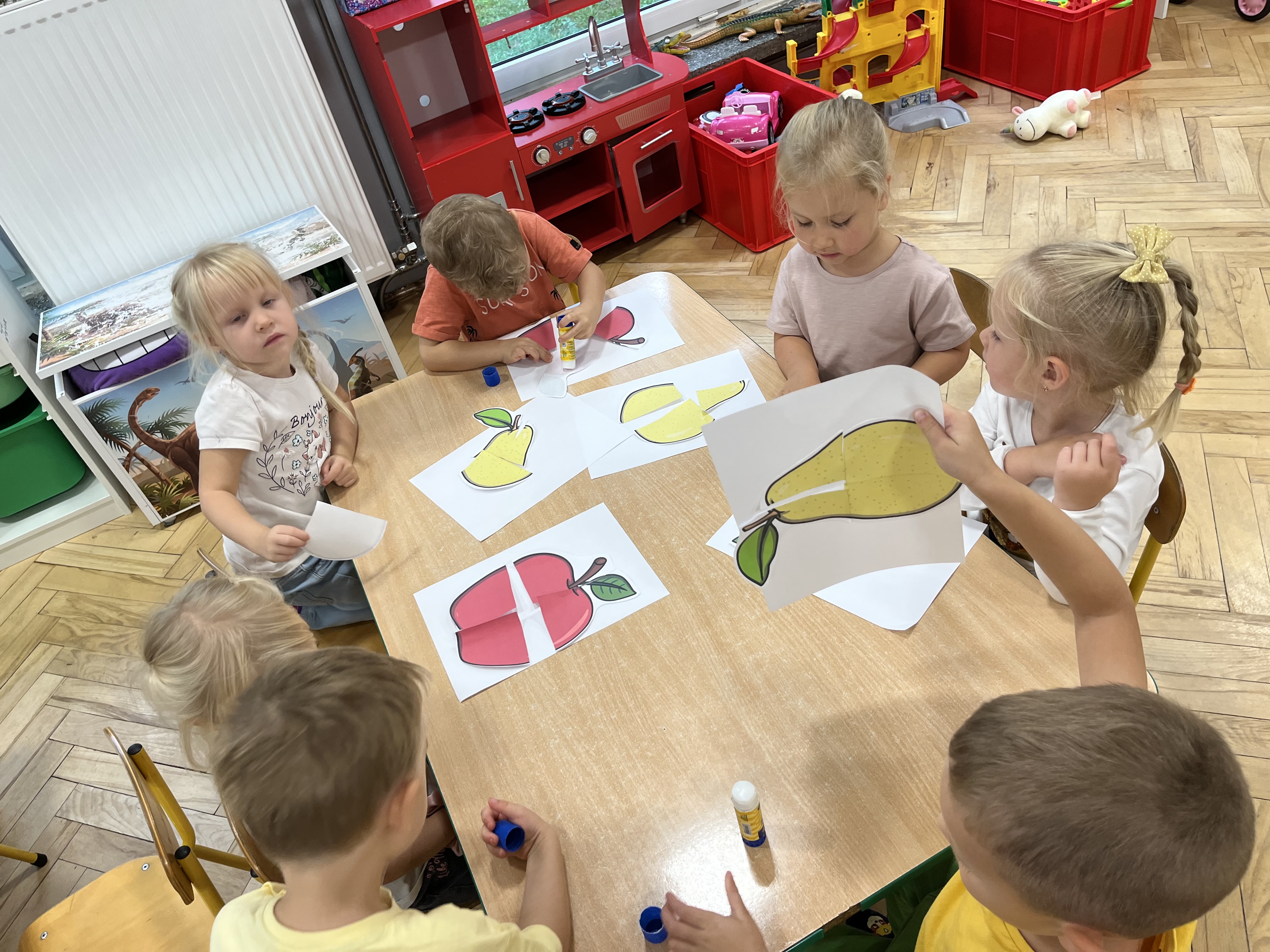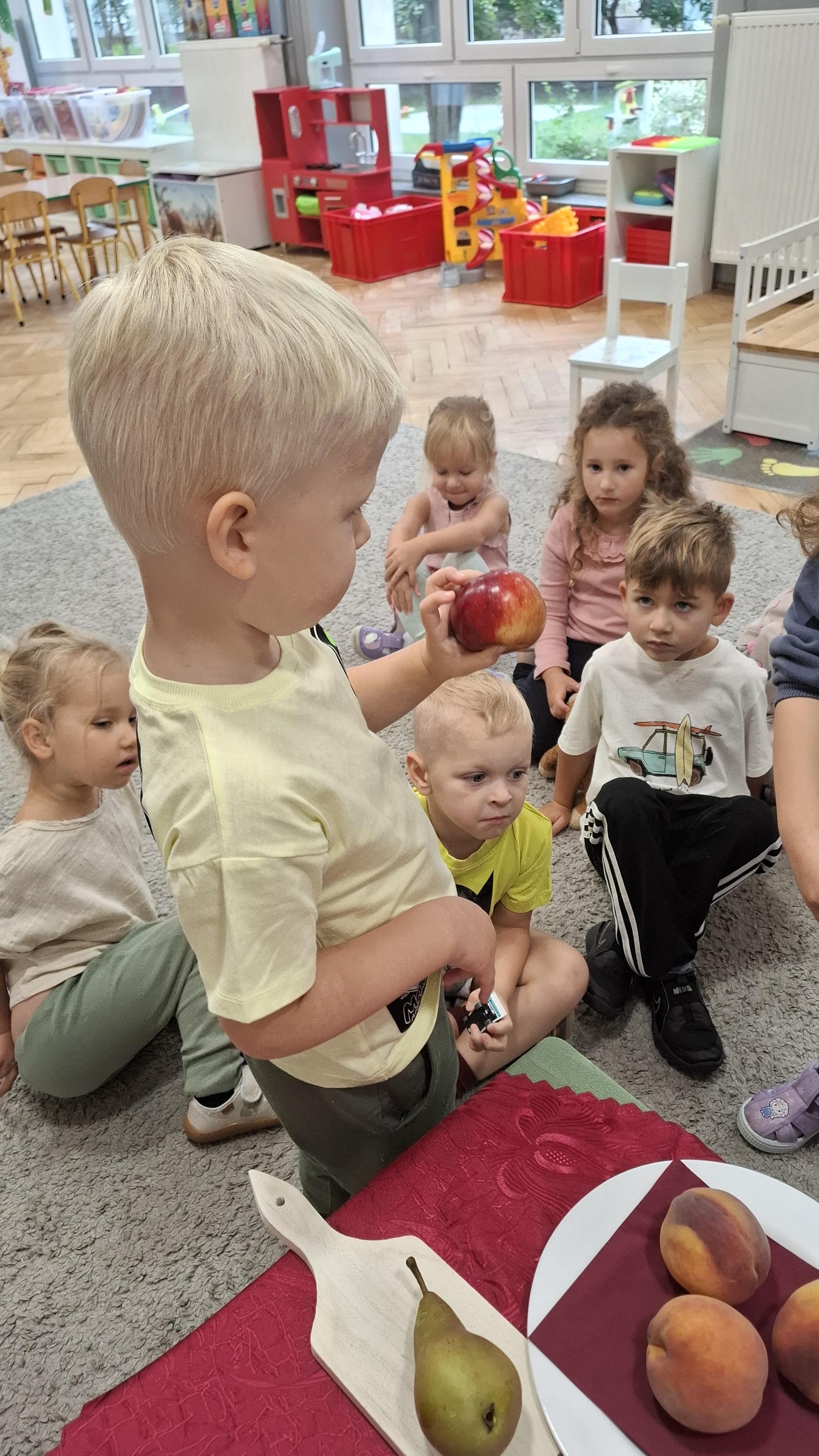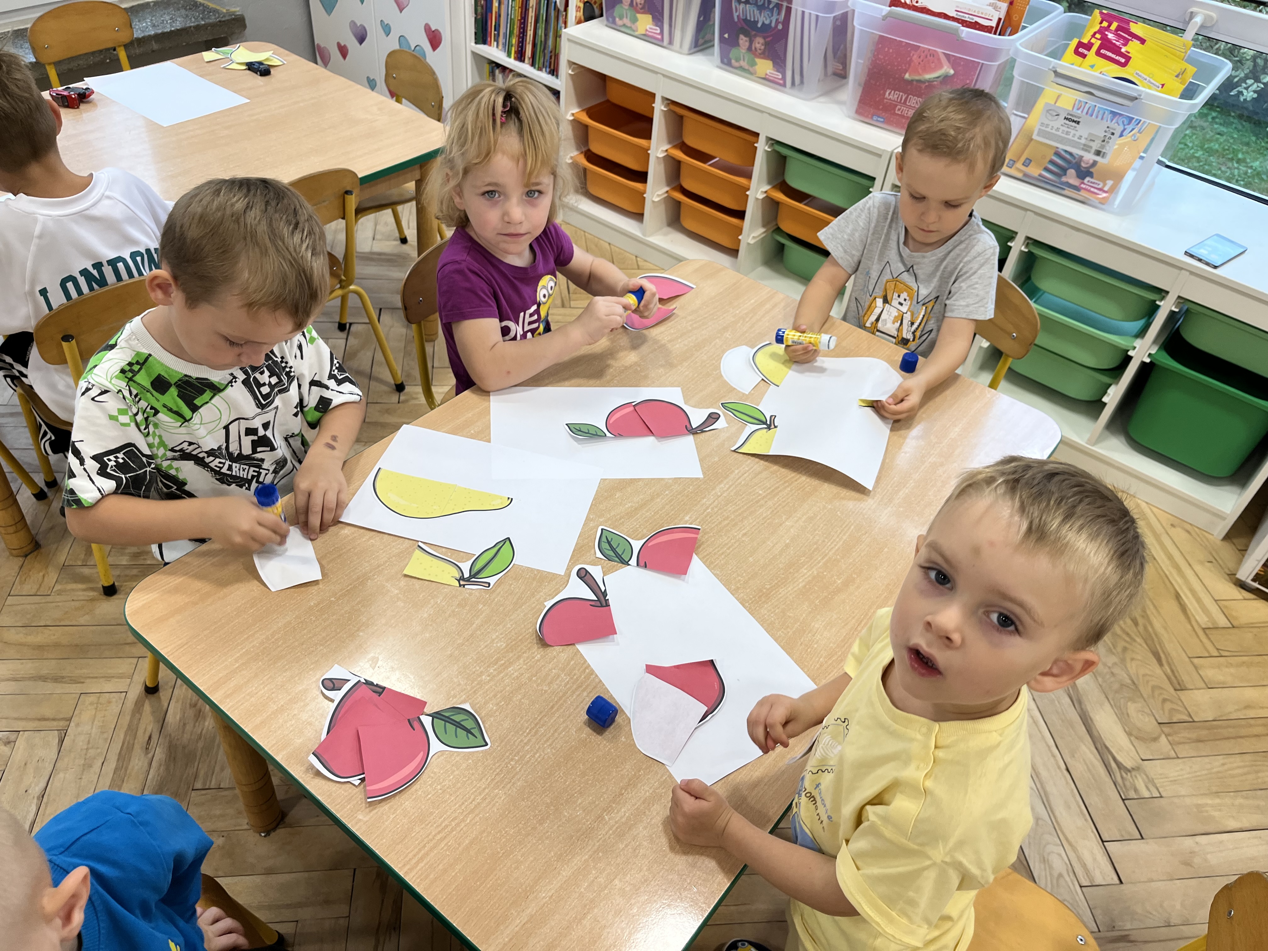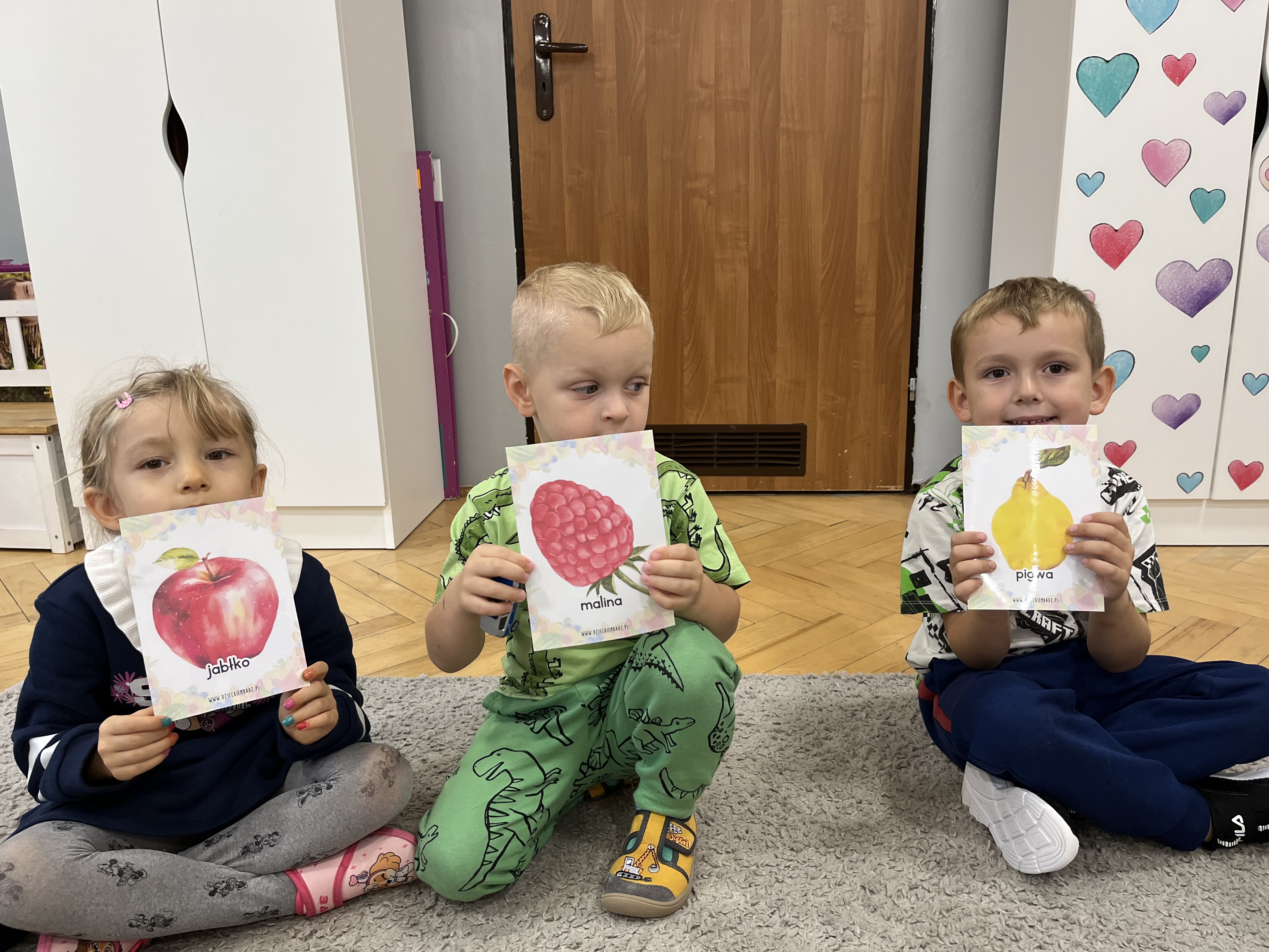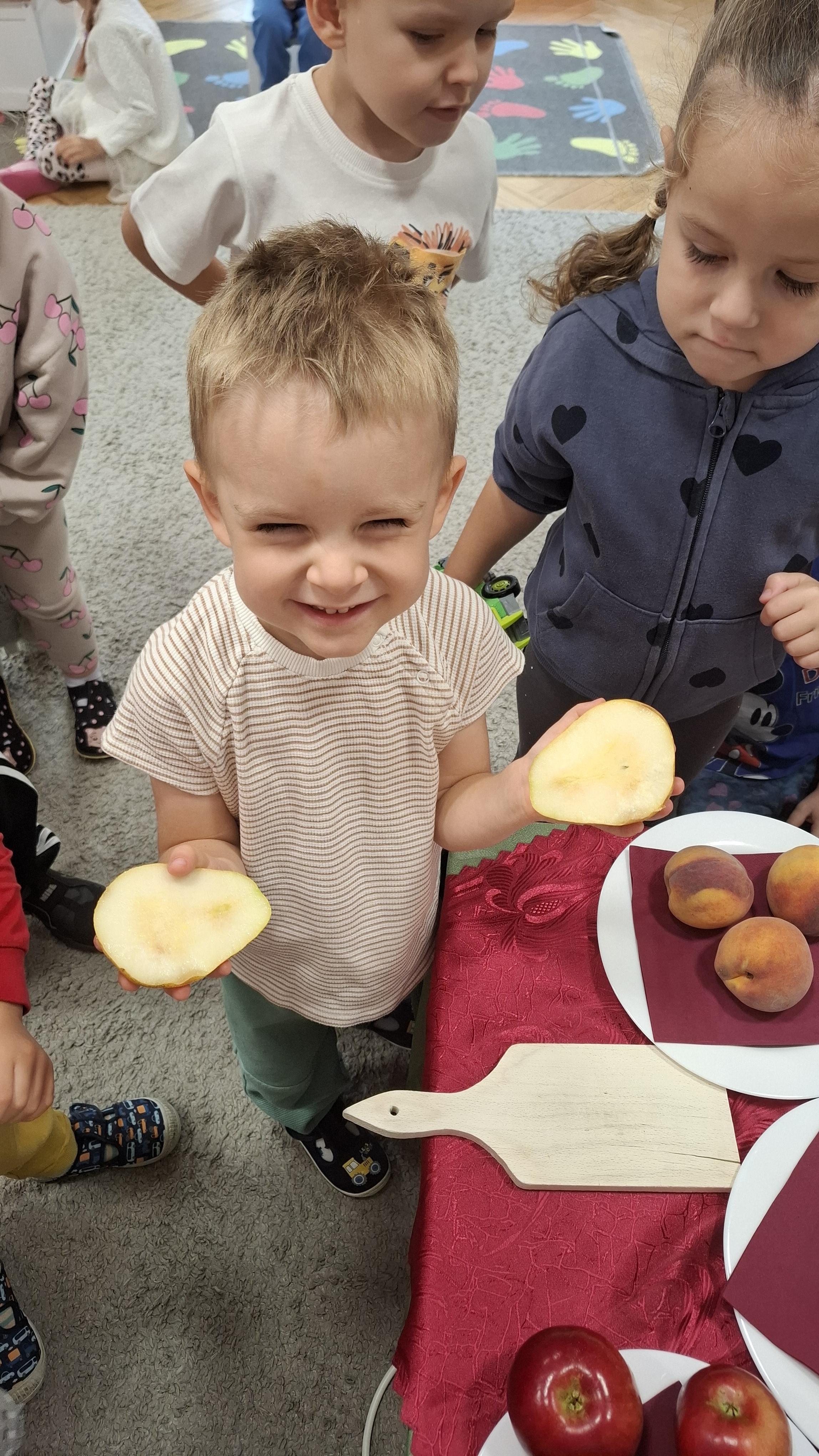Miniony tydzień był pełen owocowych tematów – dzieci utrwalały nazwy owoców oraz uczyły się dzielić słowa na sylaby. Podczas zabaw „Co rośnie w sadzie i co z tego będzie?” oraz „Owoce i dżem” dowiedziały się, jakie smakołyki i produkty można przygotować z owoców. Poznały również piramidę i talerz żywieniowy, wskazując, gdzie znajdują się owoce i dlaczego są one tak ważne dla zdrowia. Co więcej, dzieci same przygotowały pyszny i zdrowy deser z jogurtu naturalnego, jabłka i miodu – smakował wyśmienicie i dał im wiele radości!