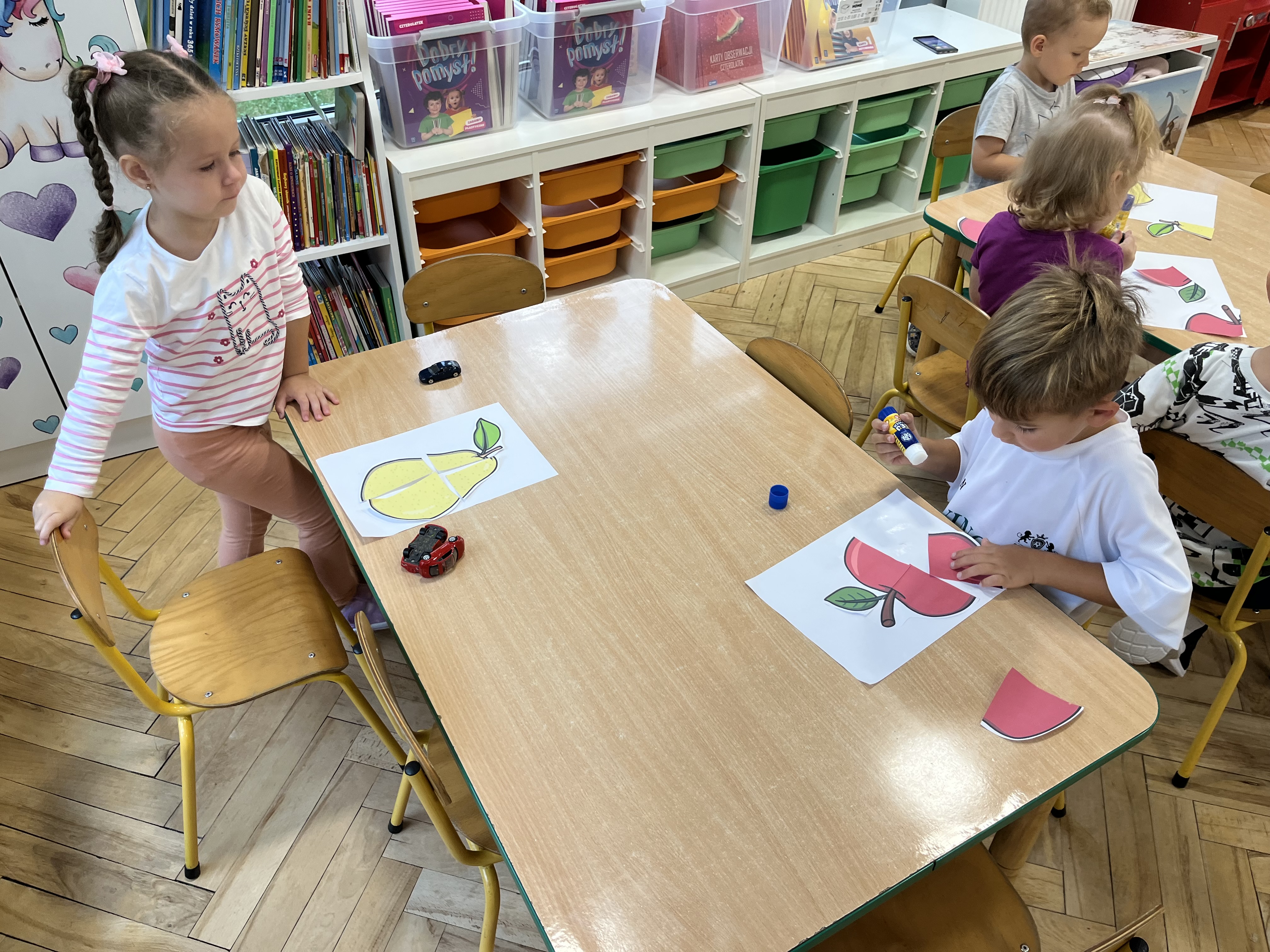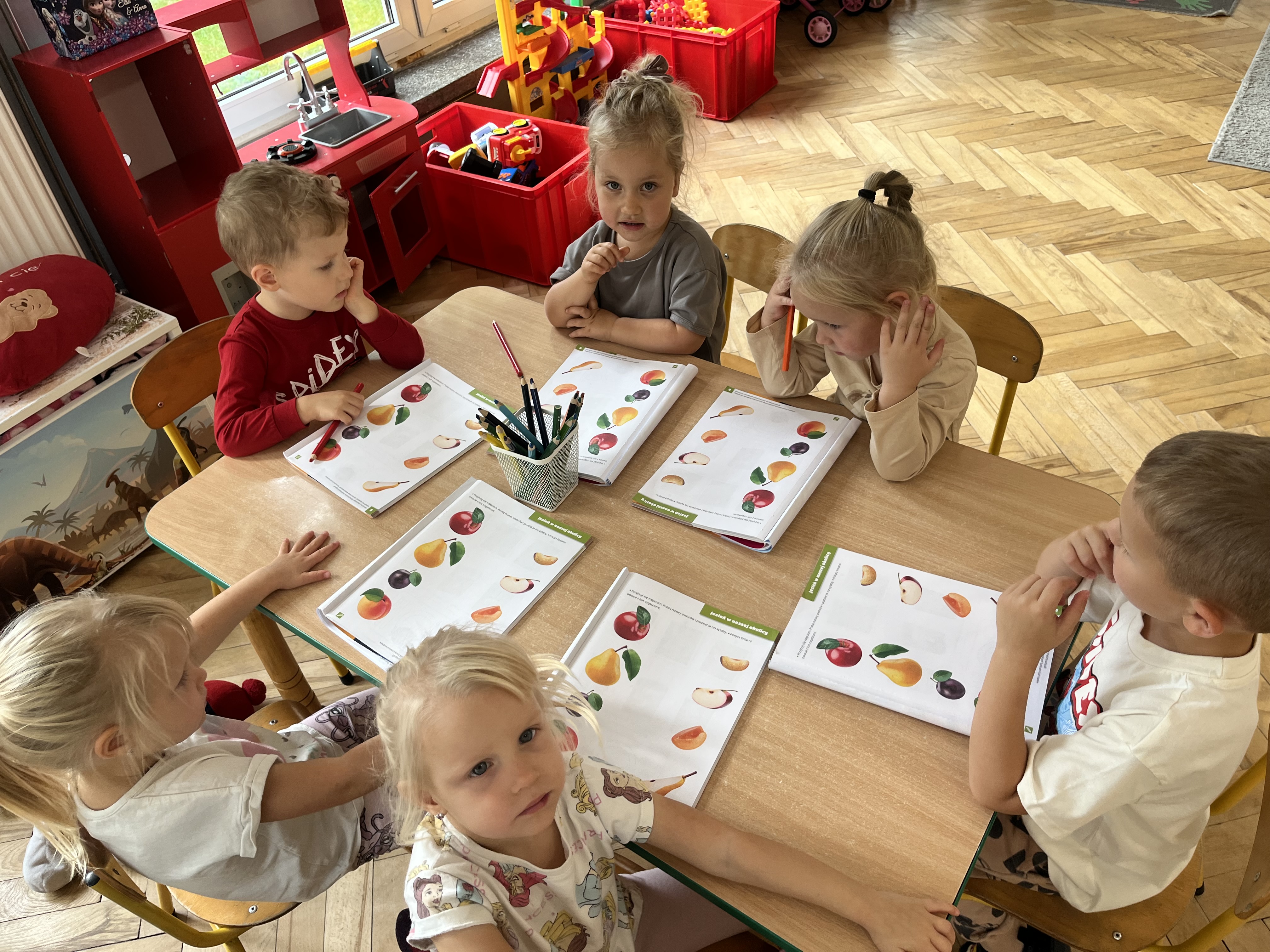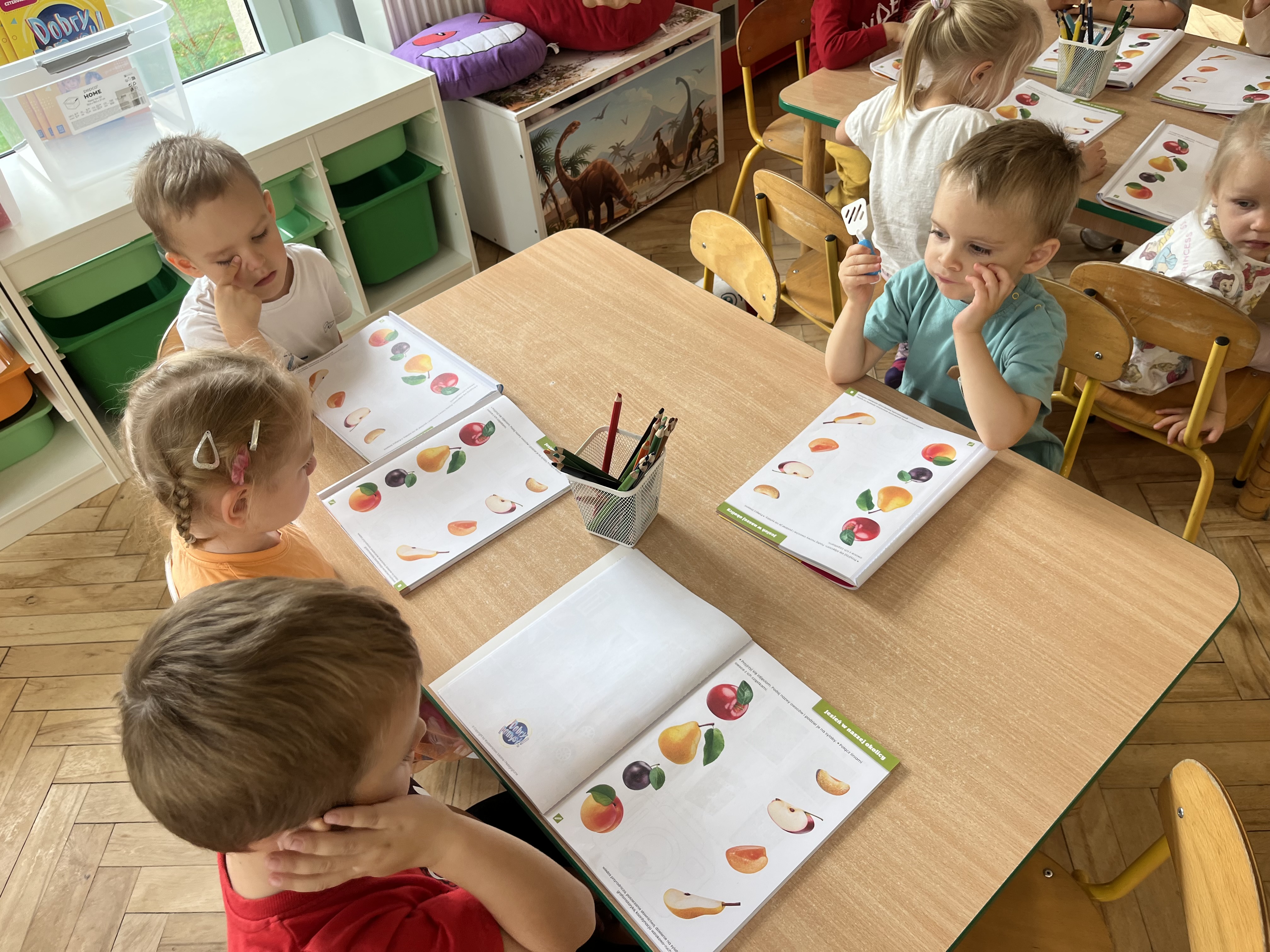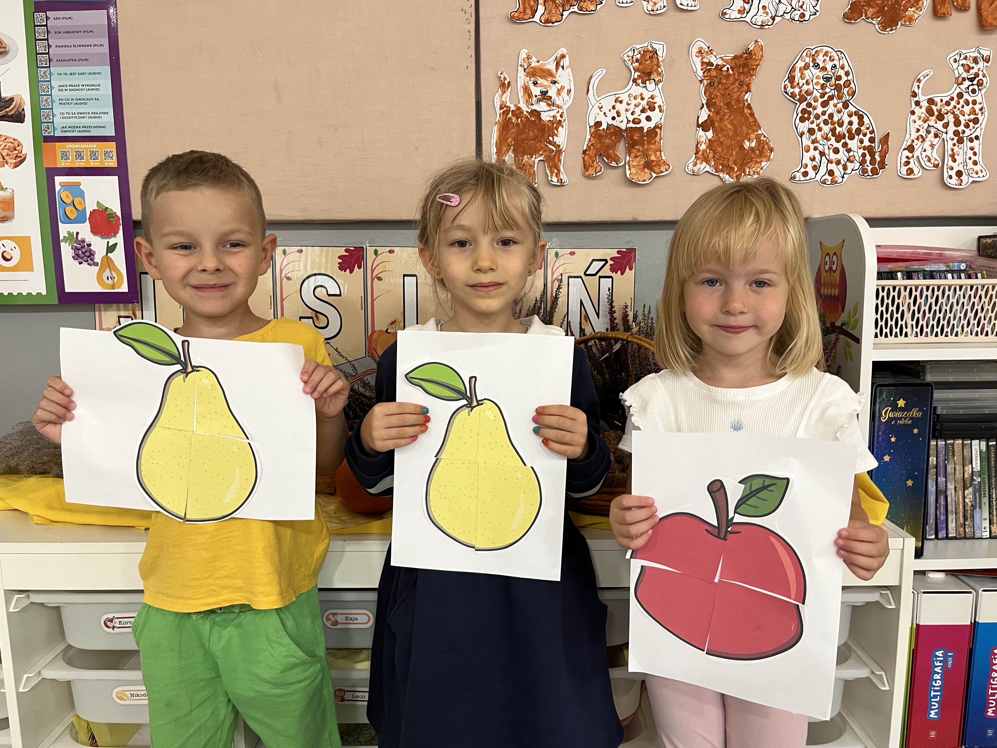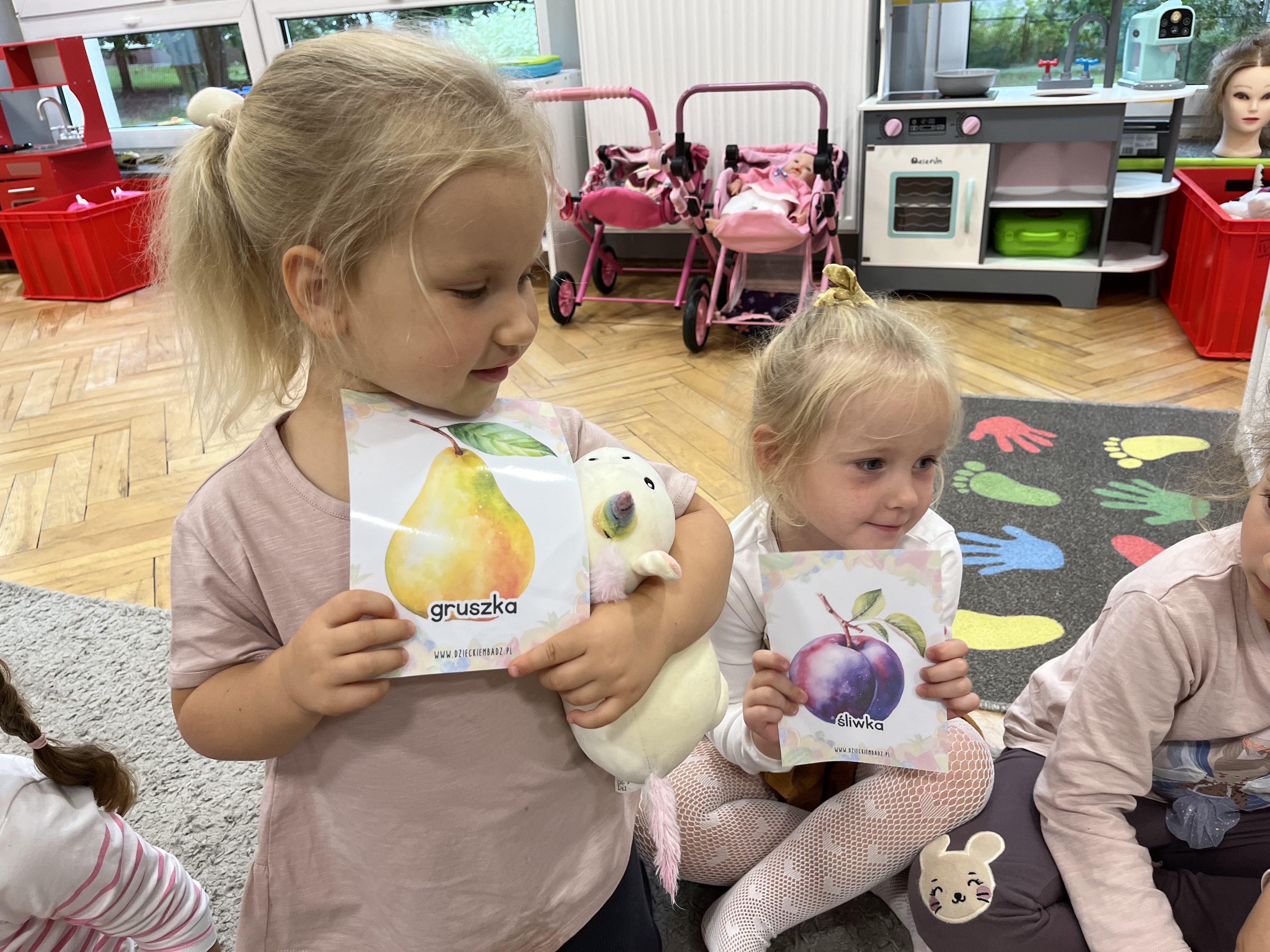 Miniony tydzień był pełen owocowych tematów – dzieci utrwalały nazwy owoców oraz uczyły się dzielić słowa na sylaby. Podczas zabaw „Co rośnie w sadzie i co z tego będzie?” oraz „Owoce i dżem” dowiedziały się, jakie smakołyki i produkty można przygotować z owoców. Poznały również piramidę i talerz żywieniowy, wskazując, gdzie znajdują się owoce i dlaczego są one tak ważne dla zdrowia. Co więcej, dzieci same przygotowały pyszny i zdrowy deser z jogurtu naturalnego, jabłka i miodu – smakował wyśmienicie i dał im wiele radości!