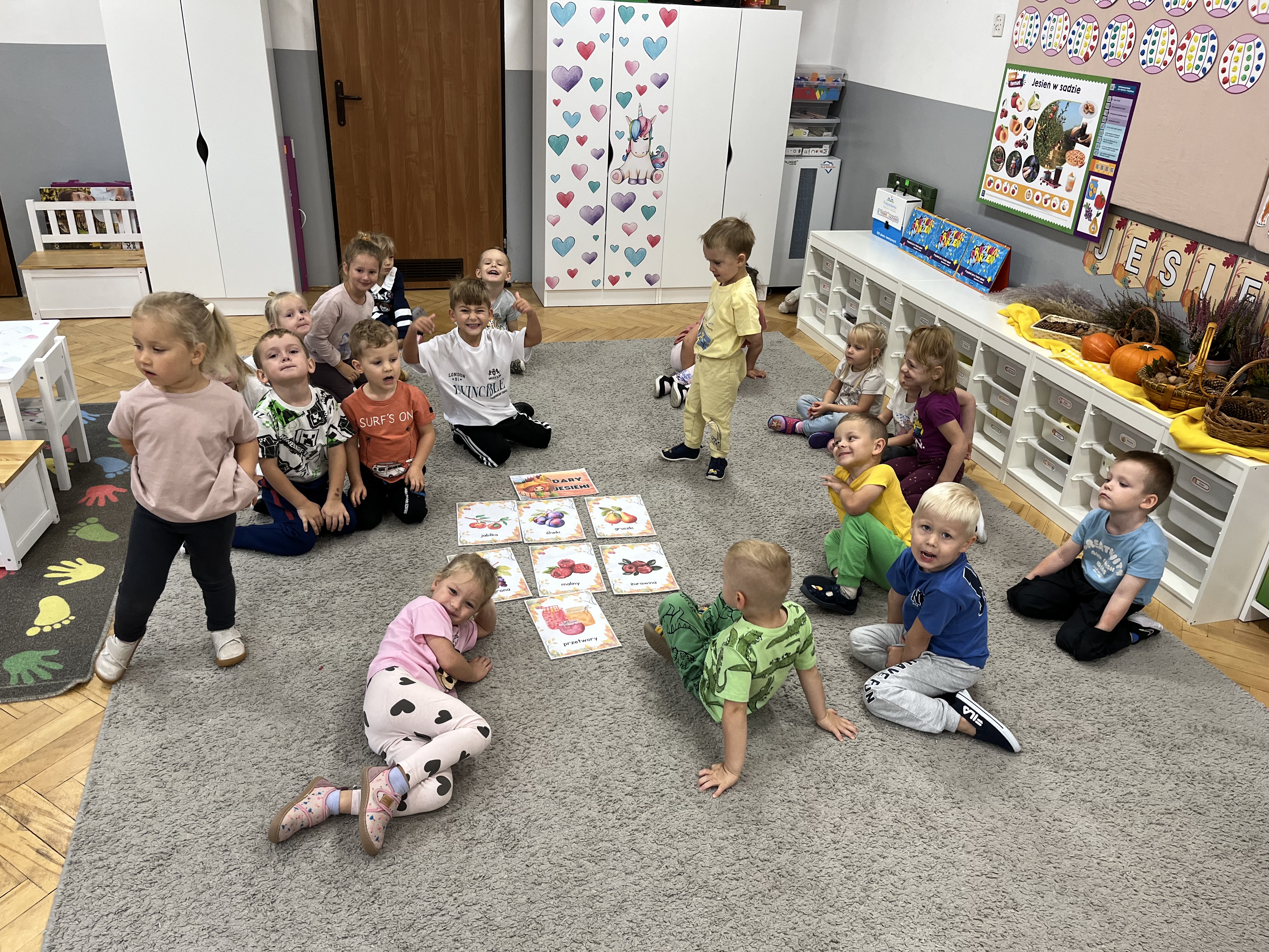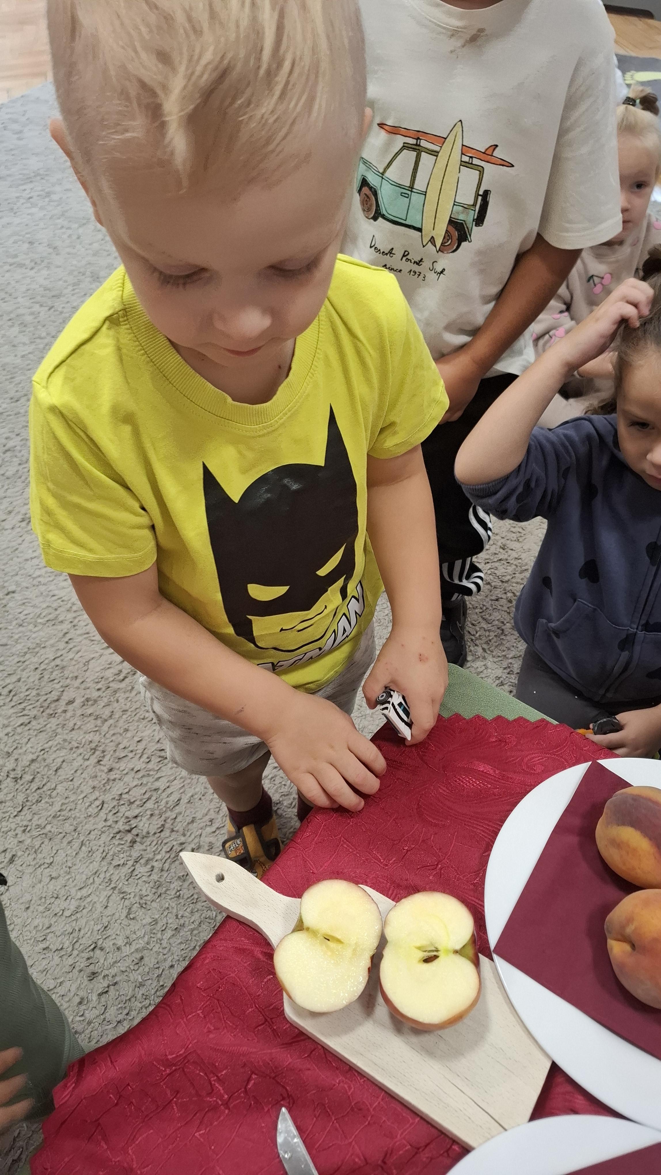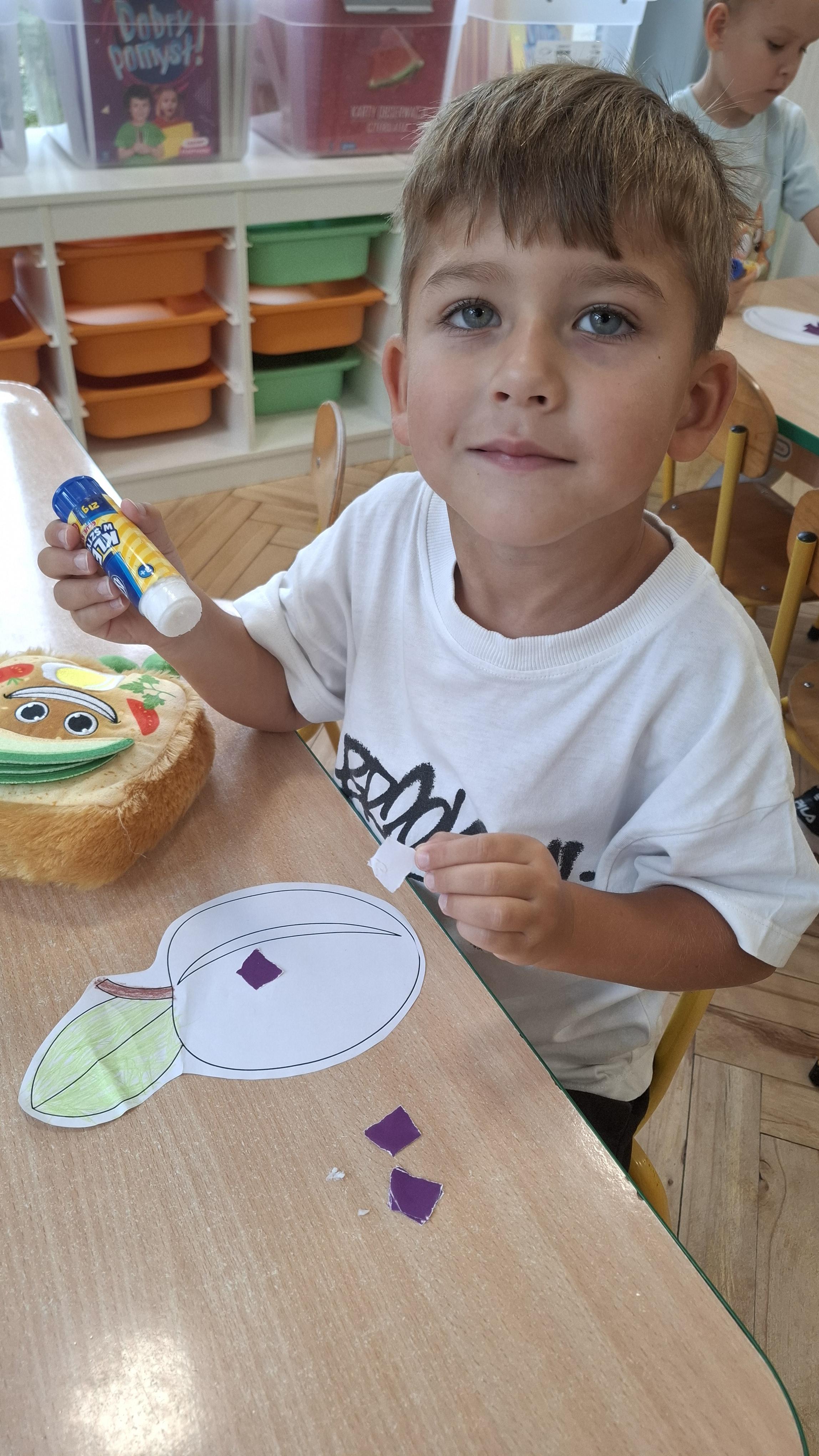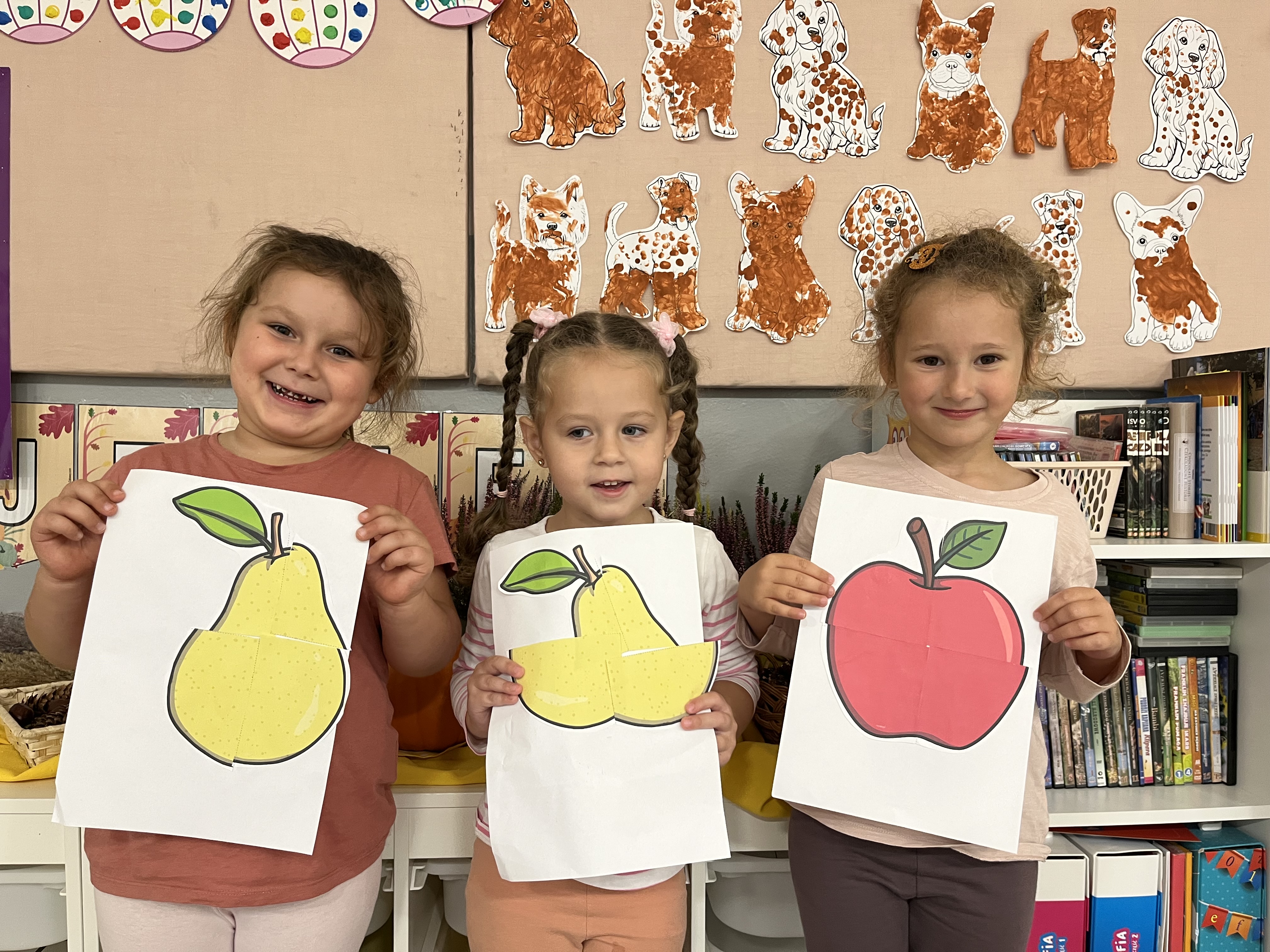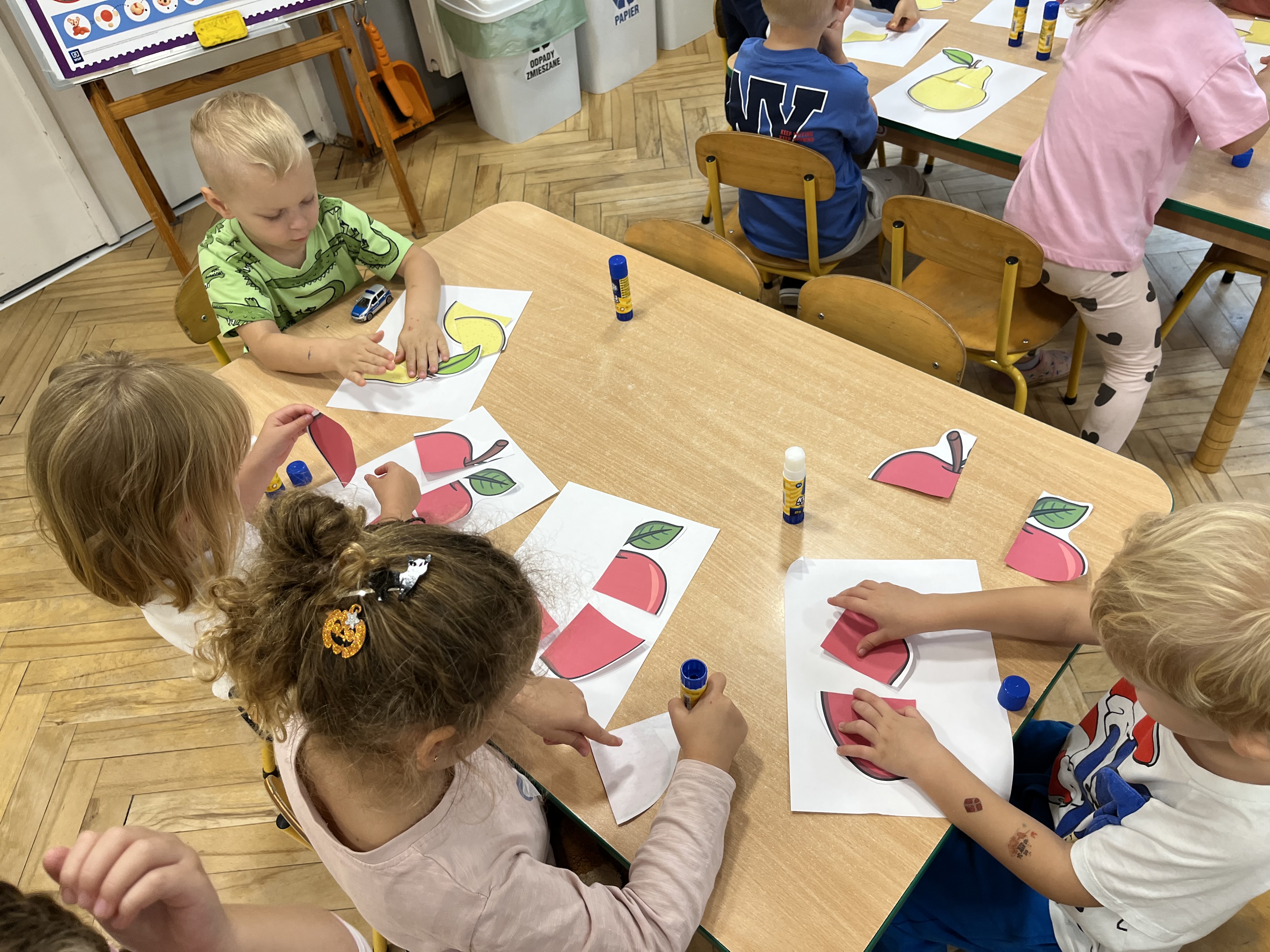 Miniony tydzień był pełen owocowych tematów – dzieci utrwalały nazwy owoców oraz uczyły się dzielić słowa na sylaby. Podczas zabaw „Co rośnie w sadzie i co z tego będzie?” oraz „Owoce i dżem” dowiedziały się, jakie smakołyki i produkty można przygotować z owoców. Poznały również piramidę i talerz żywieniowy, wskazując, gdzie znajdują się owoce i dlaczego są one tak ważne dla zdrowia. Co więcej, dzieci same przygotowały pyszny i zdrowy deser z jogurtu naturalnego, jabłka i miodu – smakował wyśmienicie i dał im wiele radości!