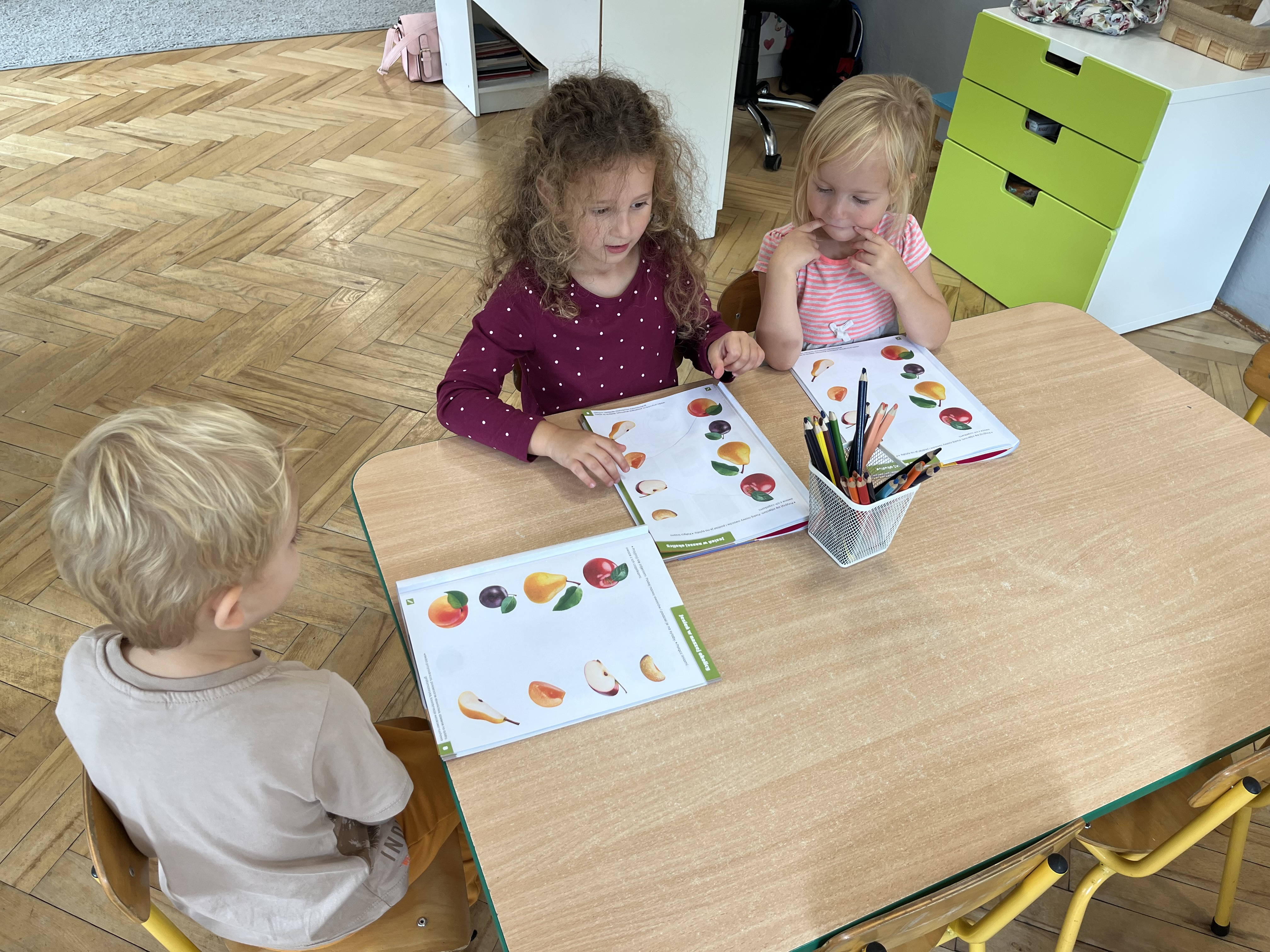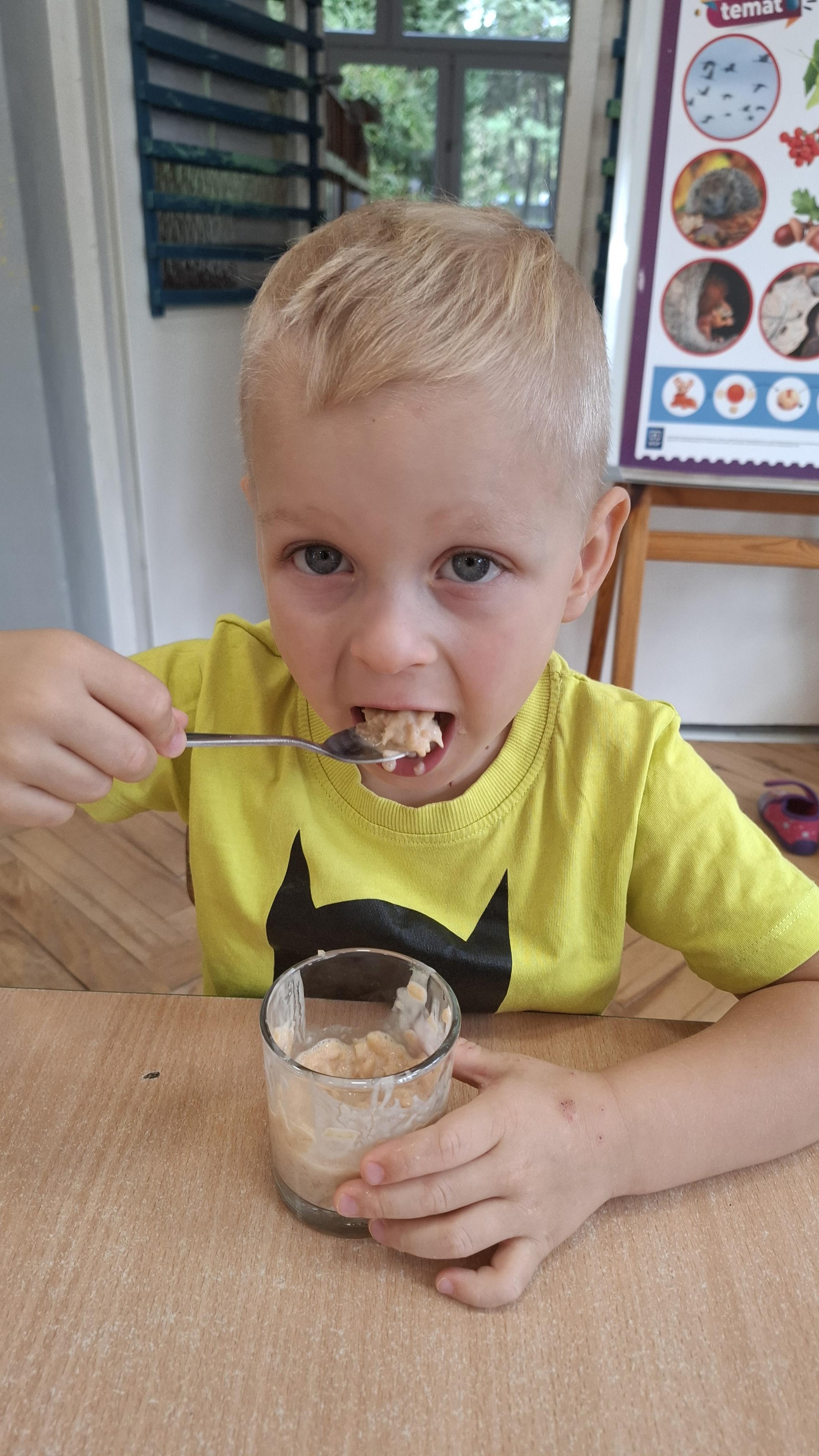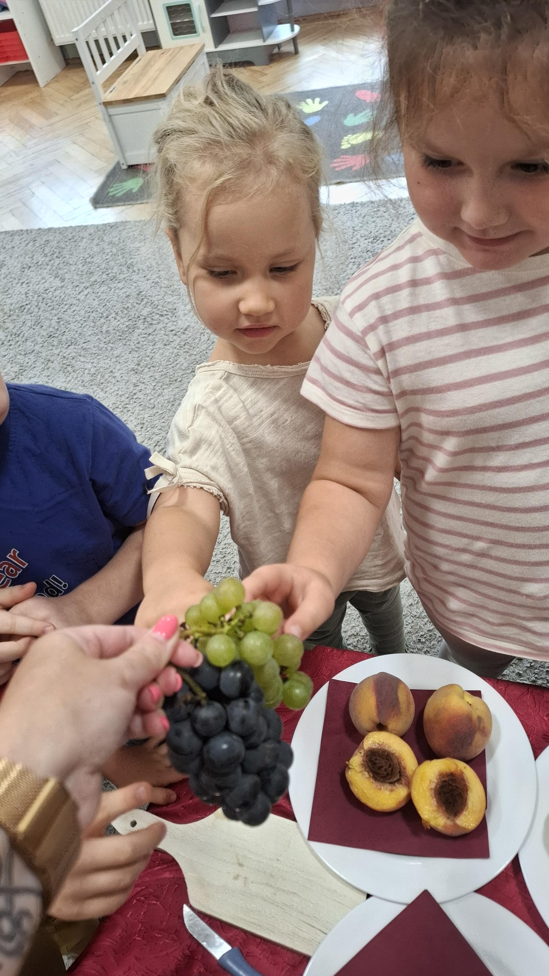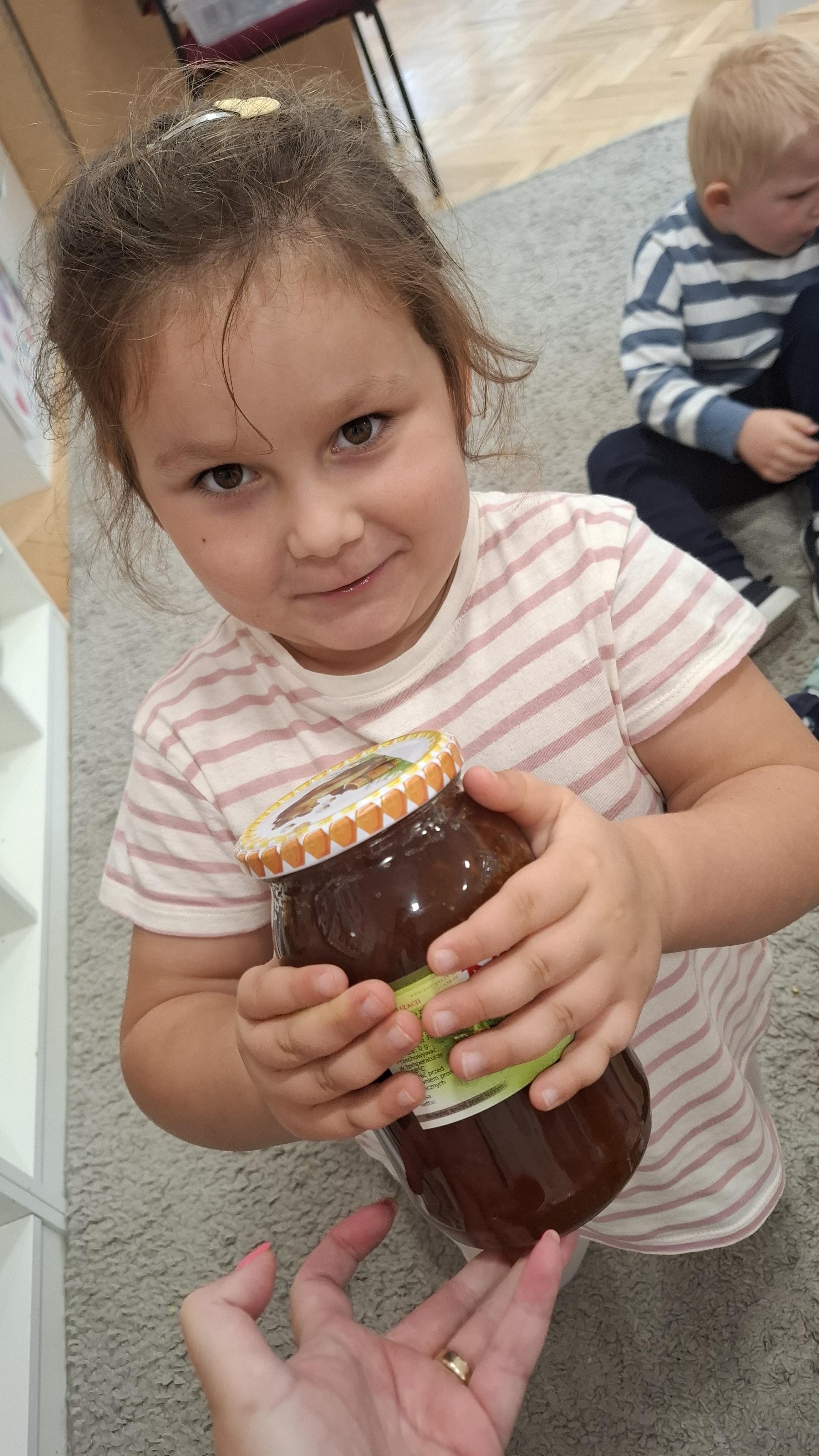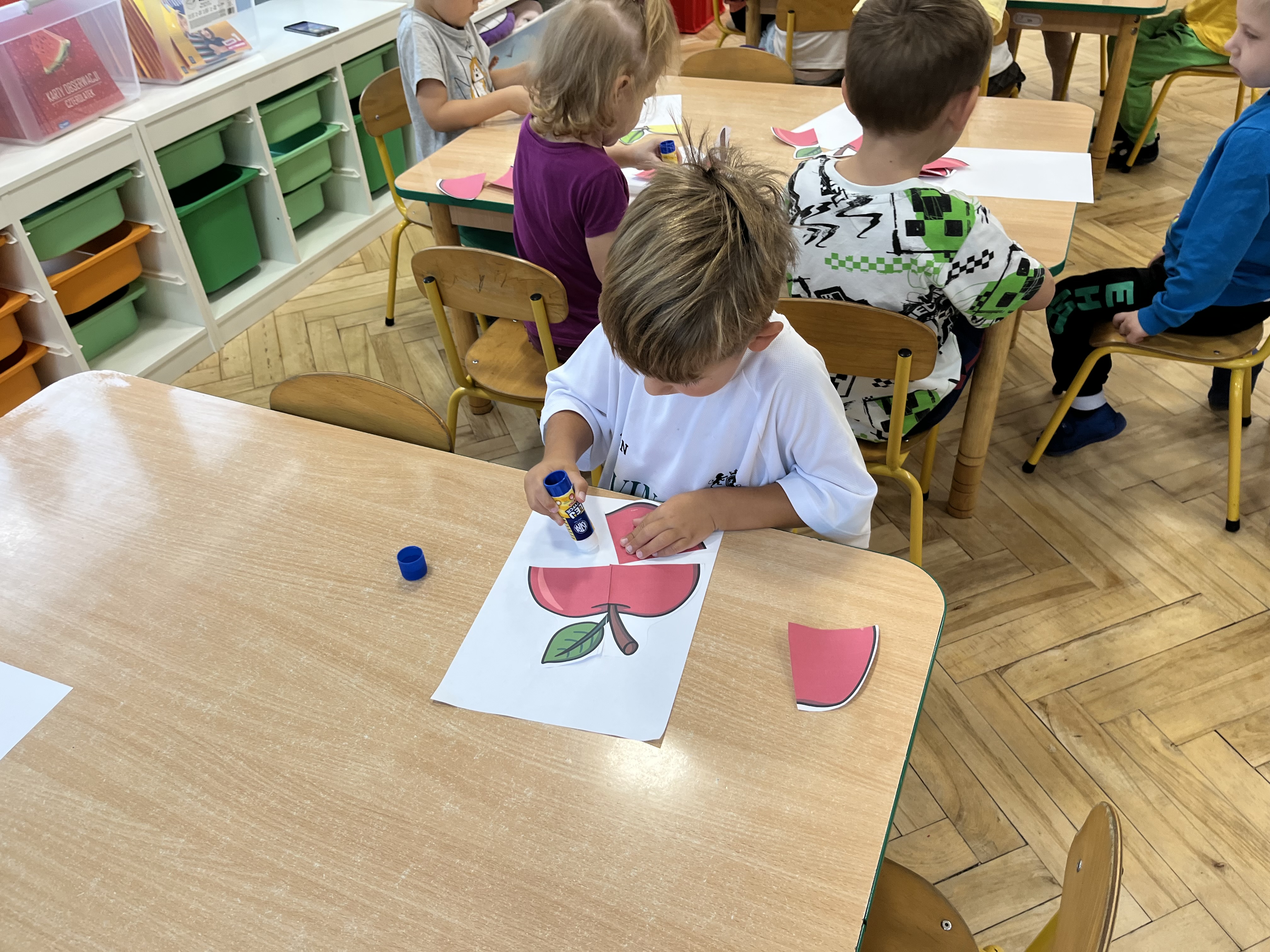 Miniony tydzień był pełen owocowych tematów – dzieci utrwalały nazwy owoców oraz uczyły się dzielić słowa na sylaby. Podczas zabaw „Co rośnie w sadzie i co z tego będzie?” oraz „Owoce i dżem” dowiedziały się, jakie smakołyki i produkty można przygotować z owoców. Poznały również piramidę i talerz żywieniowy, wskazując, gdzie znajdują się owoce i dlaczego są one tak ważne dla zdrowia. Co więcej, dzieci same przygotowały pyszny i zdrowy deser z jogurtu naturalnego, jabłka i miodu – smakował wyśmienicie i dał im wiele radości!