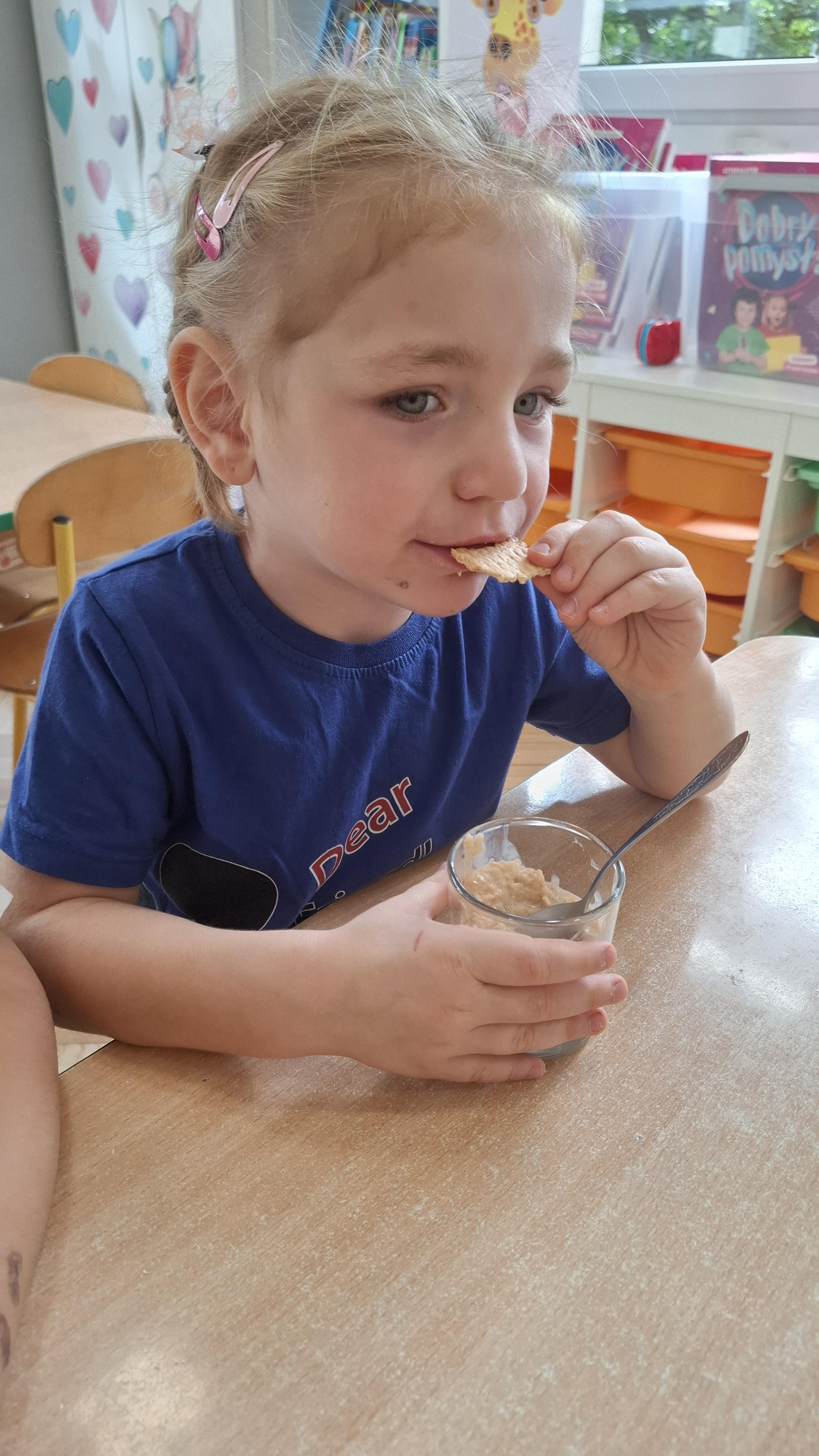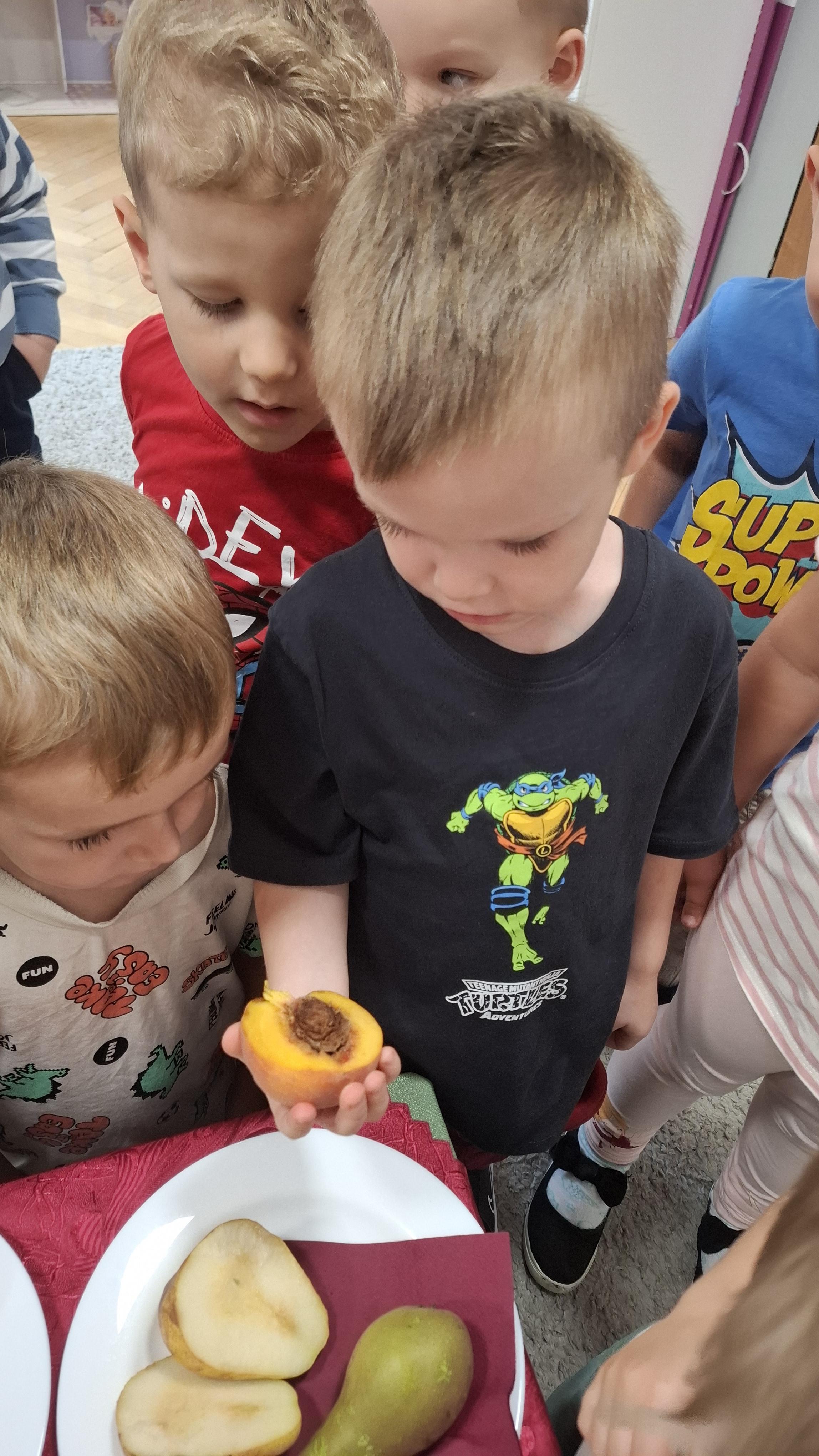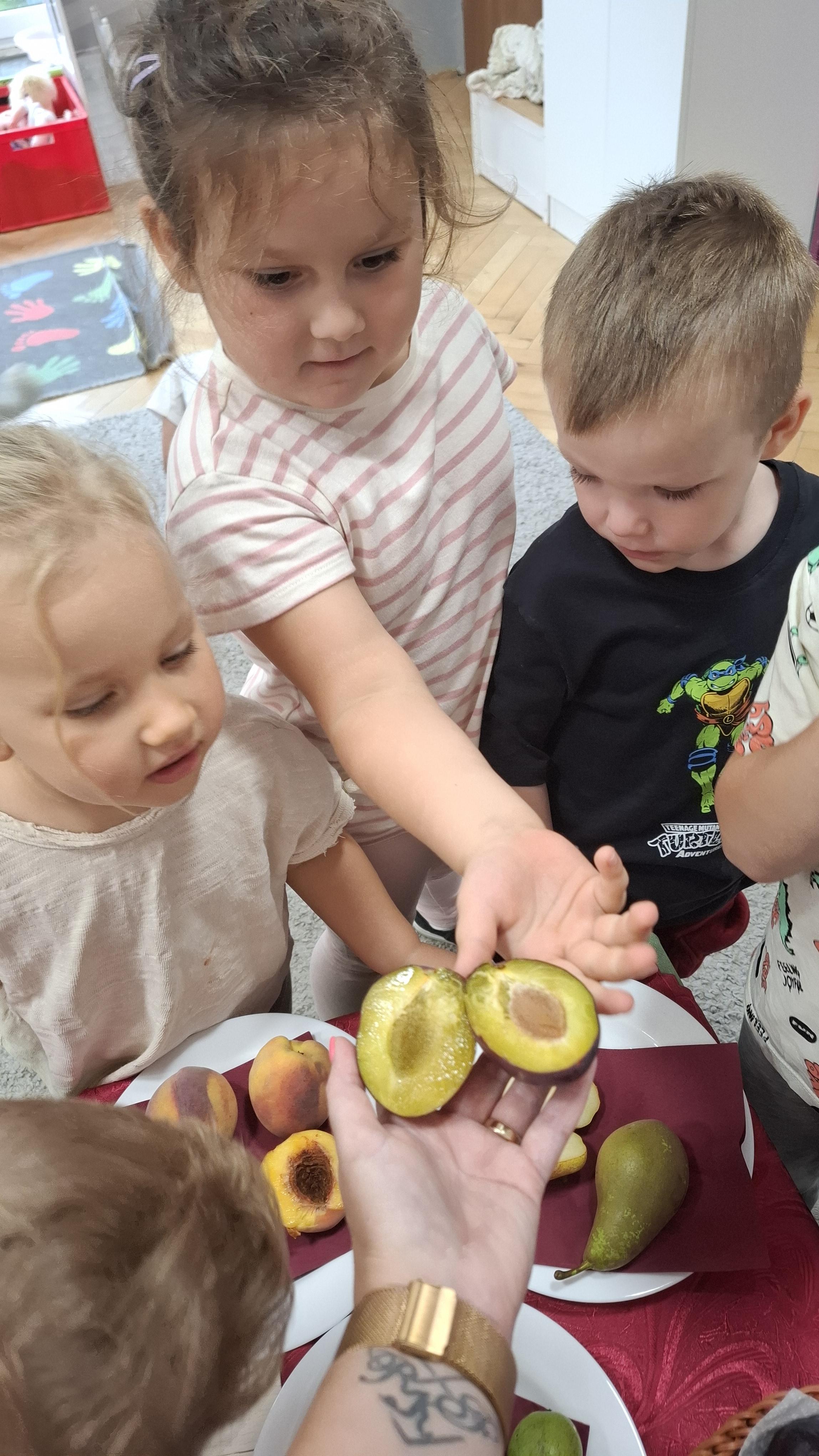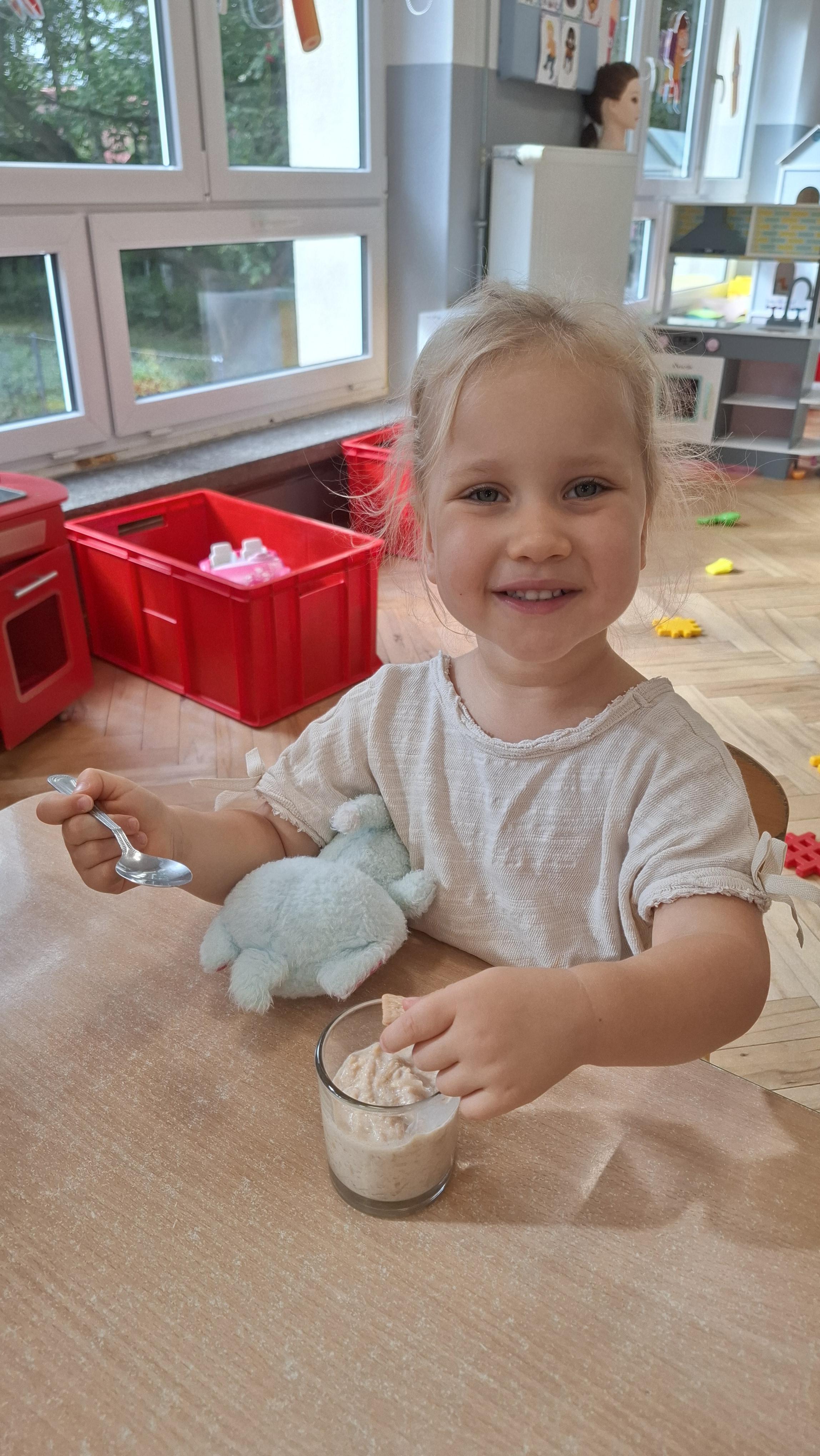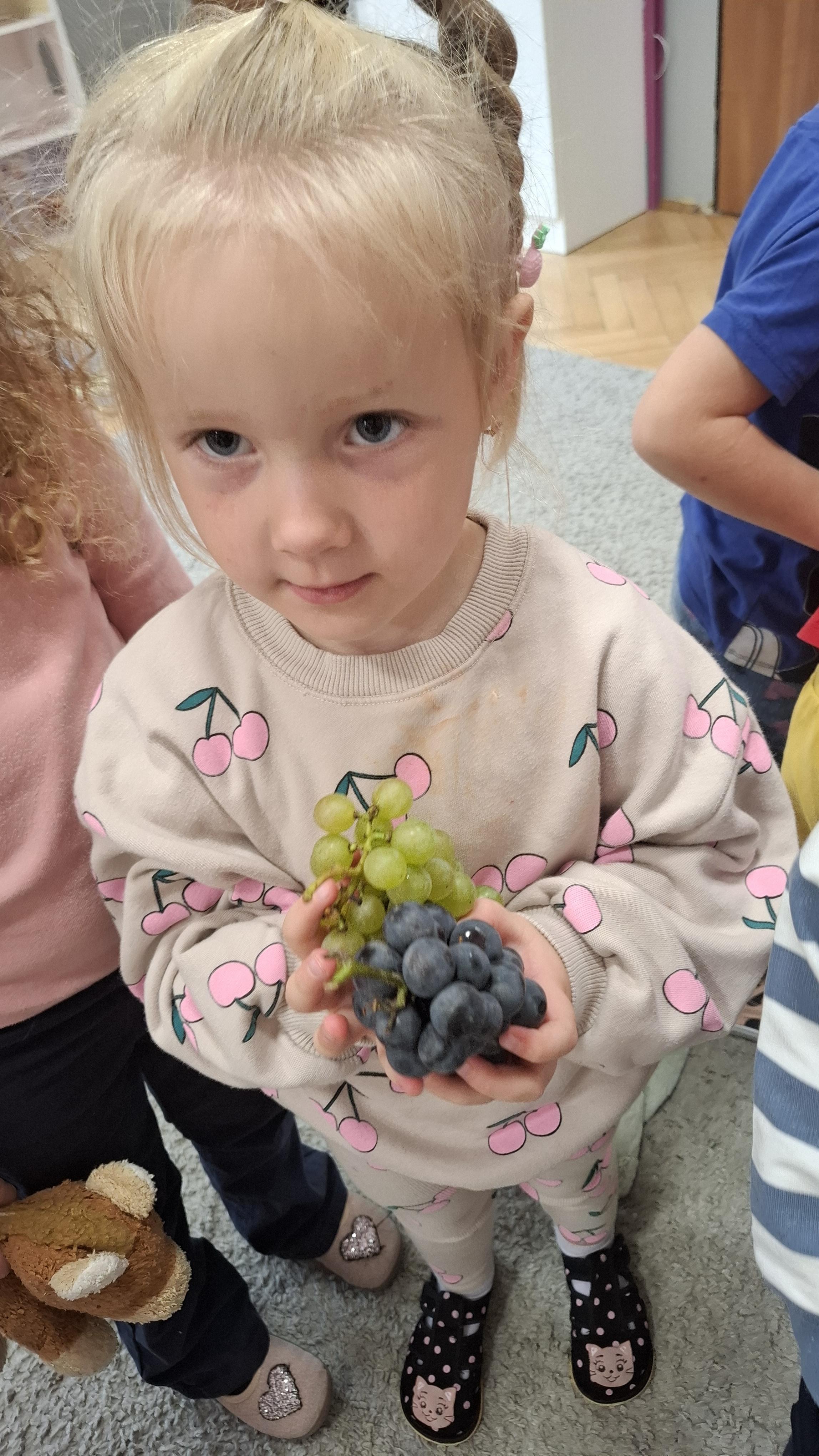 Miniony tydzień był pełen owocowych tematów – dzieci utrwalały nazwy owoców oraz uczyły się dzielić słowa na sylaby. Podczas zabaw „Co rośnie w sadzie i co z tego będzie?” oraz „Owoce i dżem” dowiedziały się, jakie smakołyki i produkty można przygotować z owoców. Poznały również piramidę i talerz żywieniowy, wskazując, gdzie znajdują się owoce i dlaczego są one tak ważne dla zdrowia. Co więcej, dzieci same przygotowały pyszny i zdrowy deser z jogurtu naturalnego, jabłka i miodu – smakował wyśmienicie i dał im wiele radości!