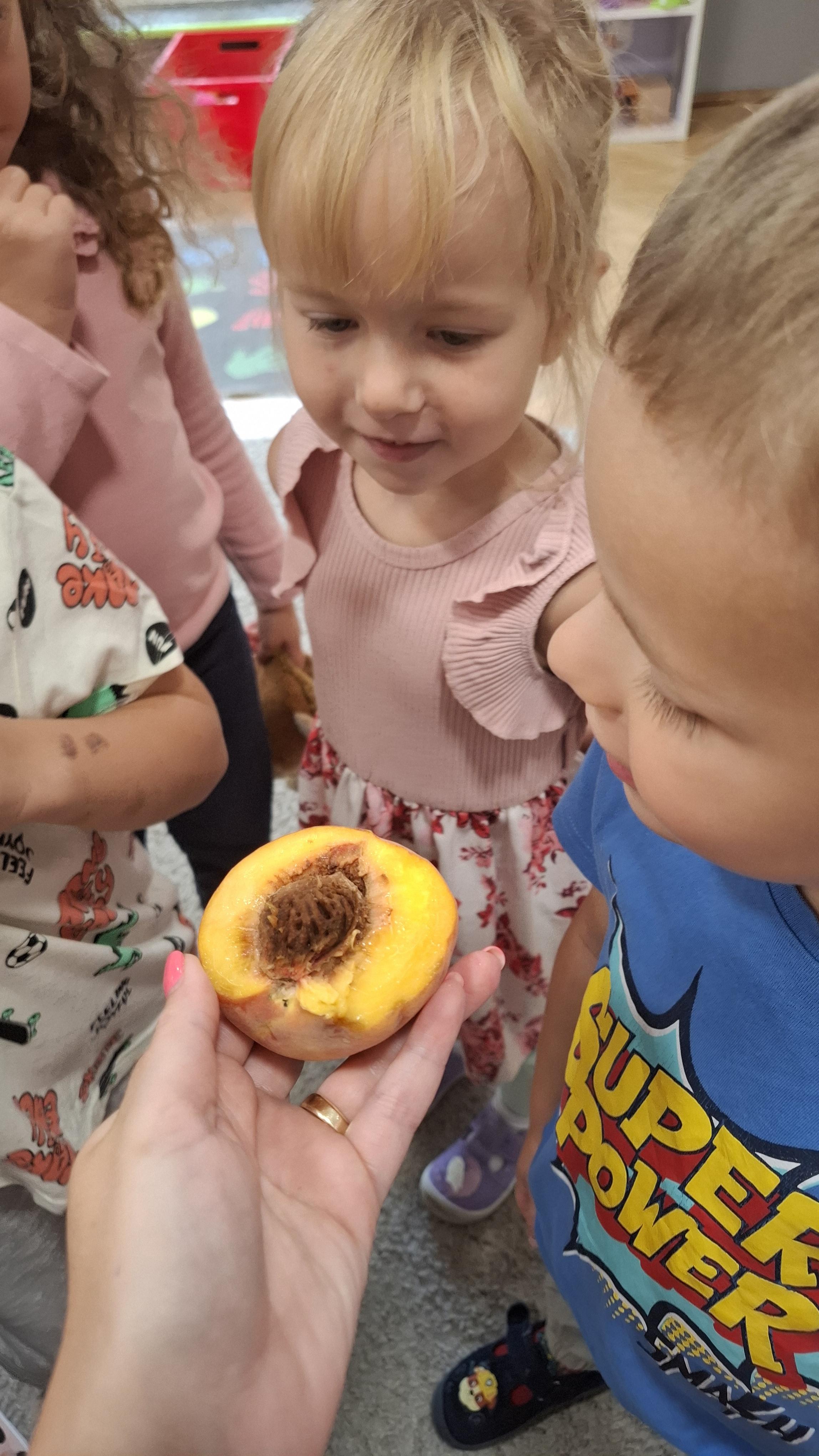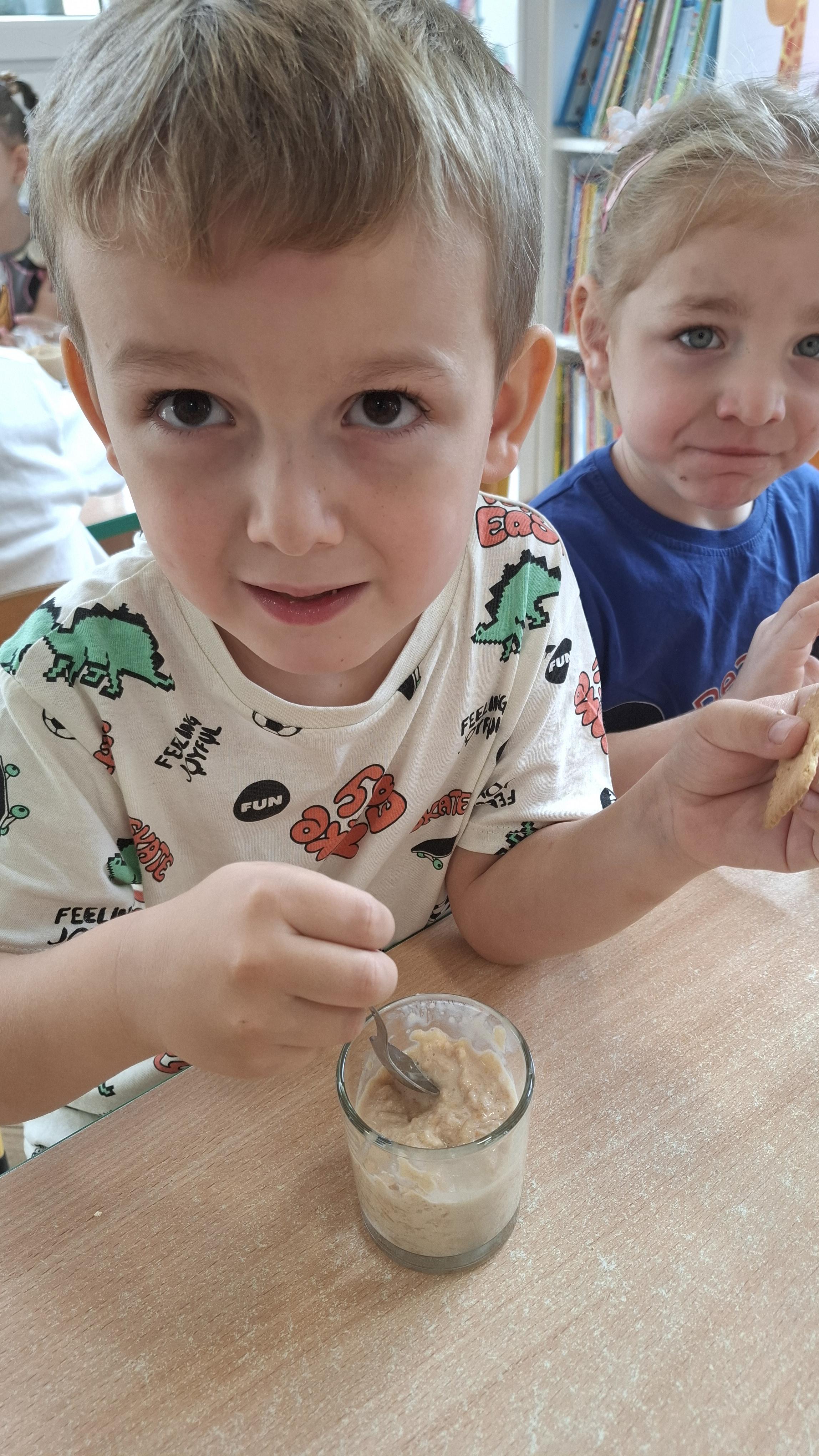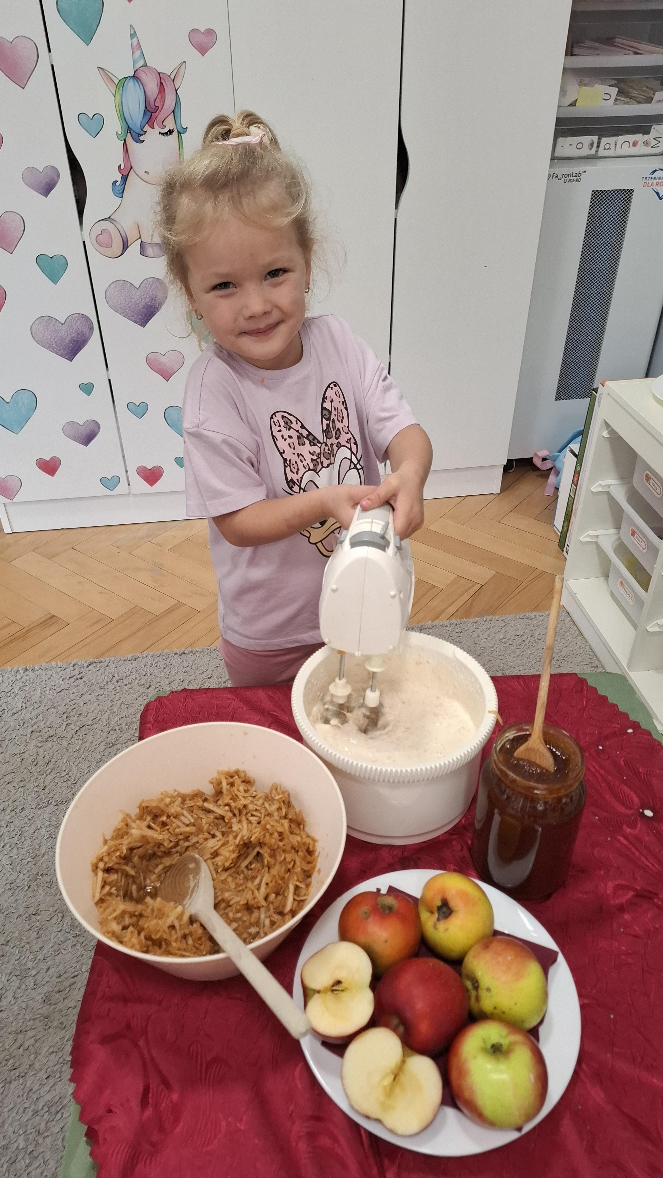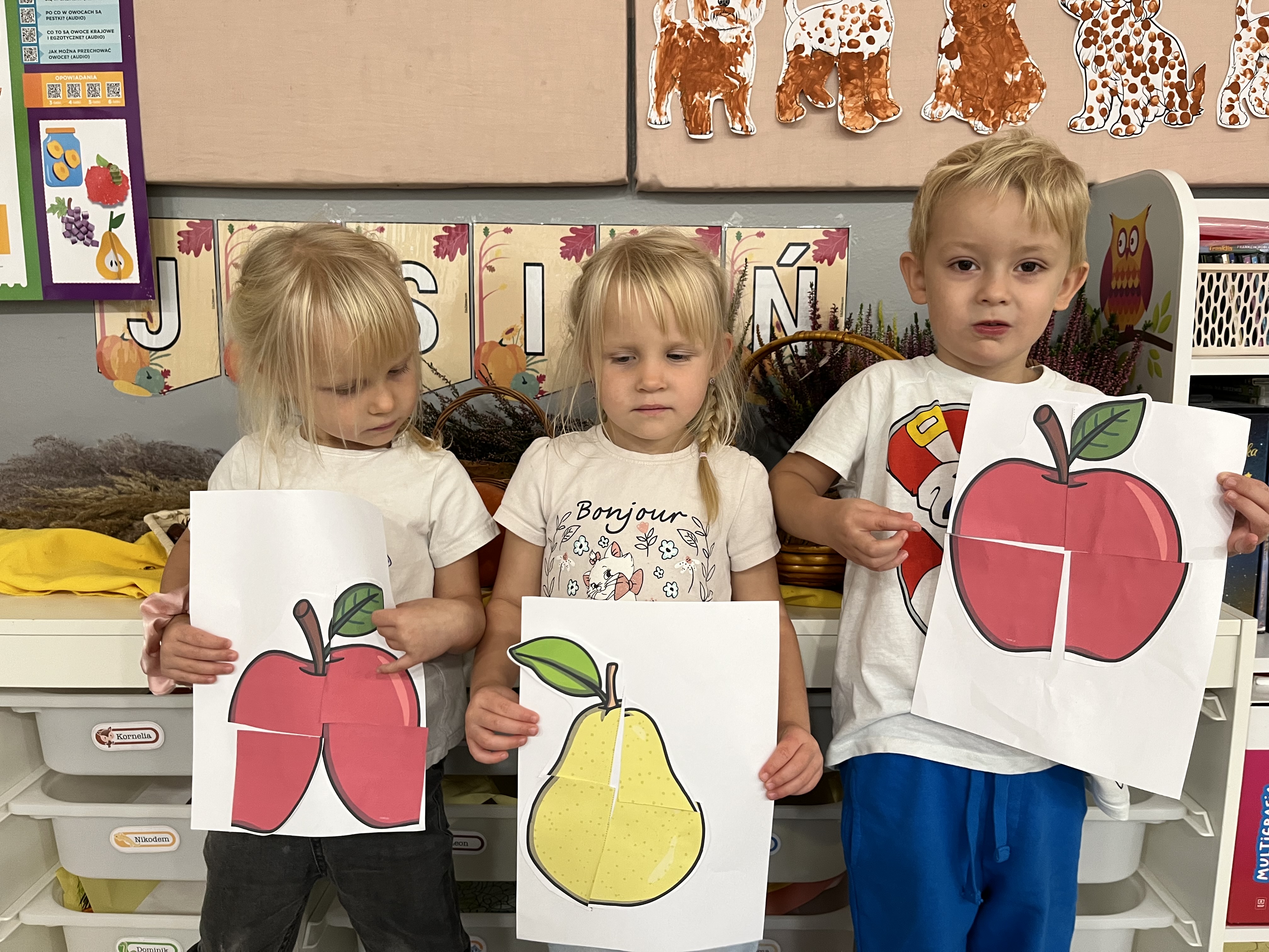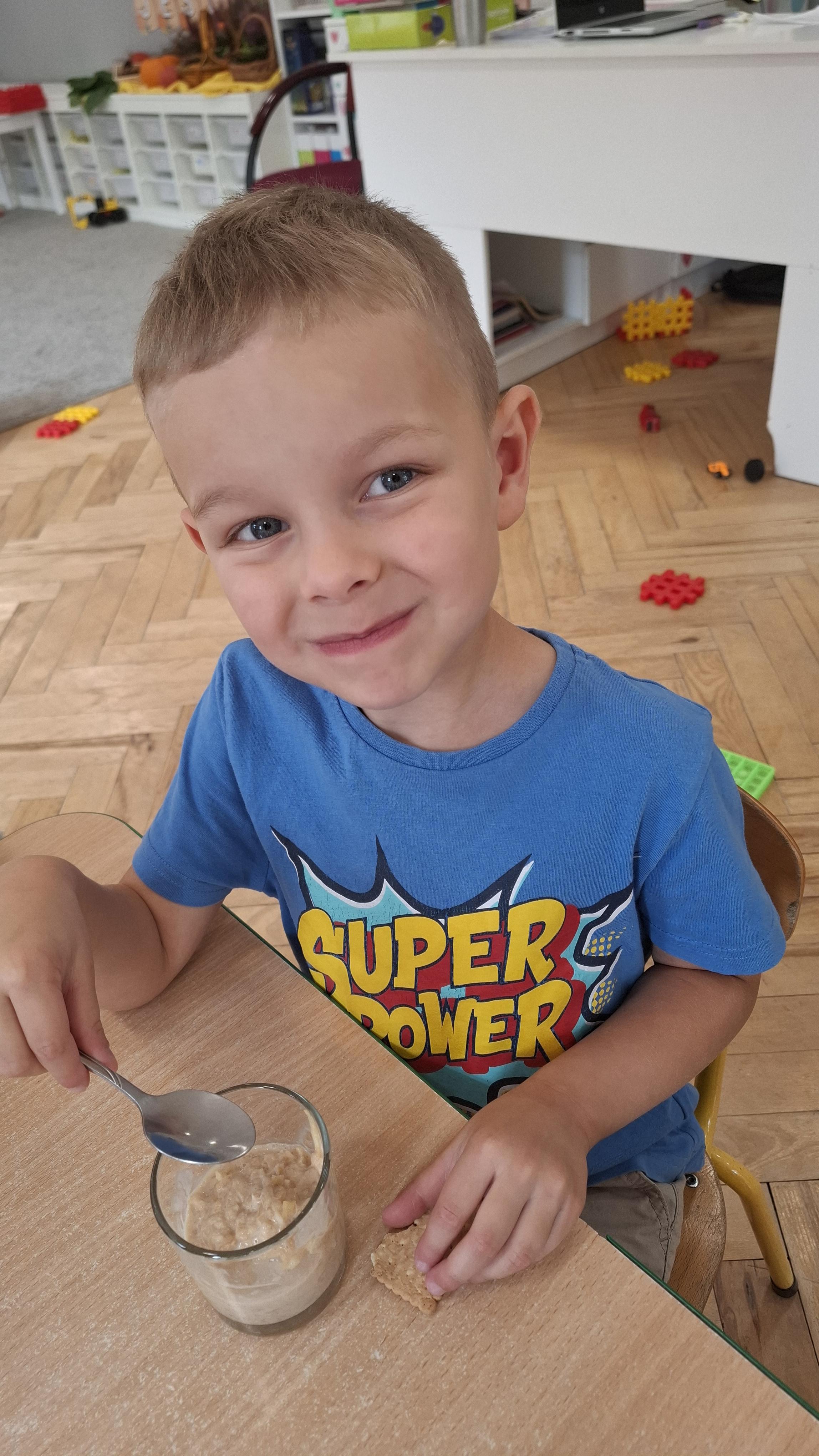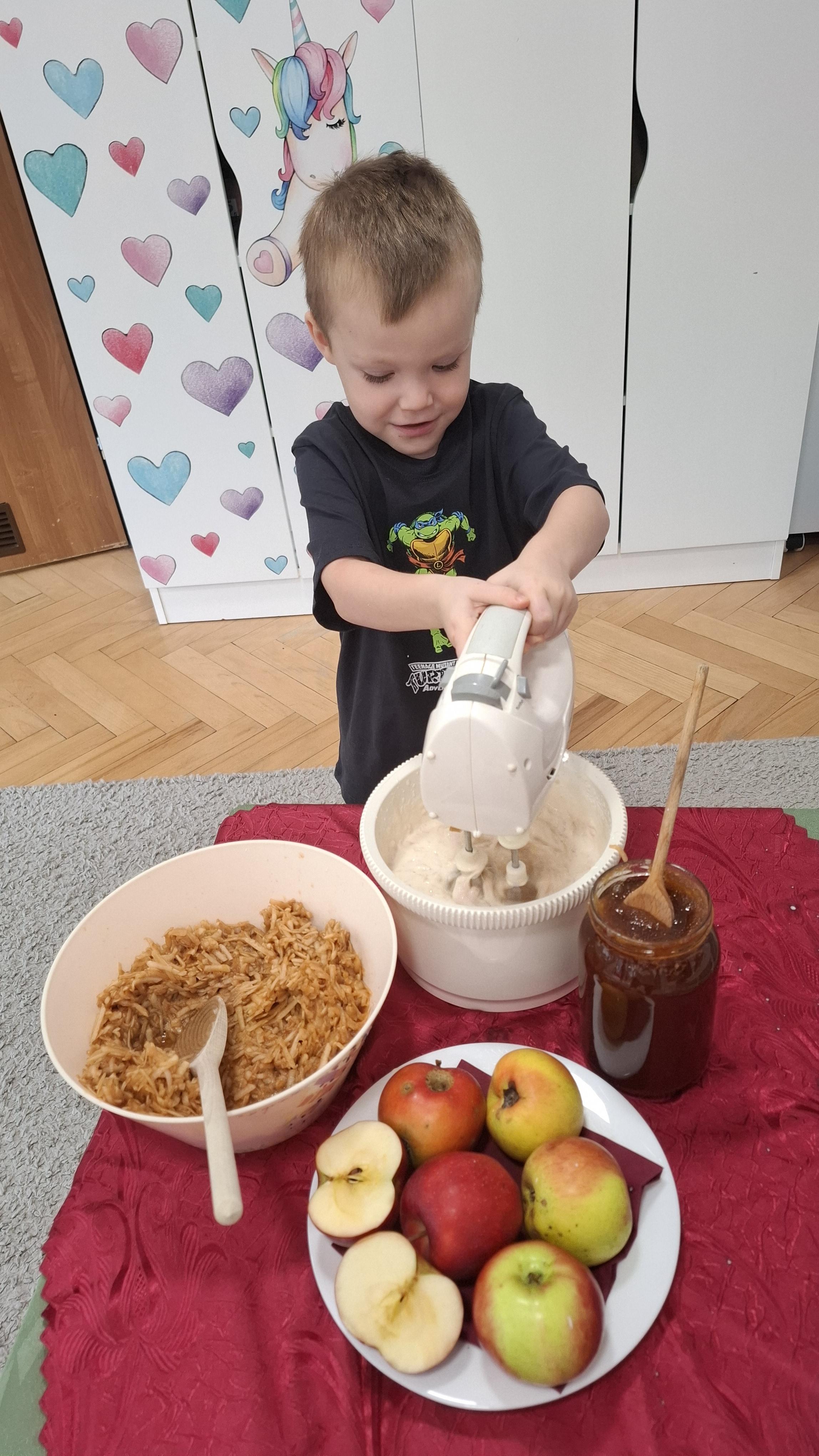 Miniony tydzień był pełen owocowych tematów – dzieci utrwalały nazwy owoców oraz uczyły się dzielić słowa na sylaby. Podczas zabaw „Co rośnie w sadzie i co z tego będzie?” oraz „Owoce i dżem” dowiedziały się, jakie smakołyki i produkty można przygotować z owoców. Poznały również piramidę i talerz żywieniowy, wskazując, gdzie znajdują się owoce i dlaczego są one tak ważne dla zdrowia. Co więcej, dzieci same przygotowały pyszny i zdrowy deser z jogurtu naturalnego, jabłka i miodu – smakował wyśmienicie i dał im wiele radości!
