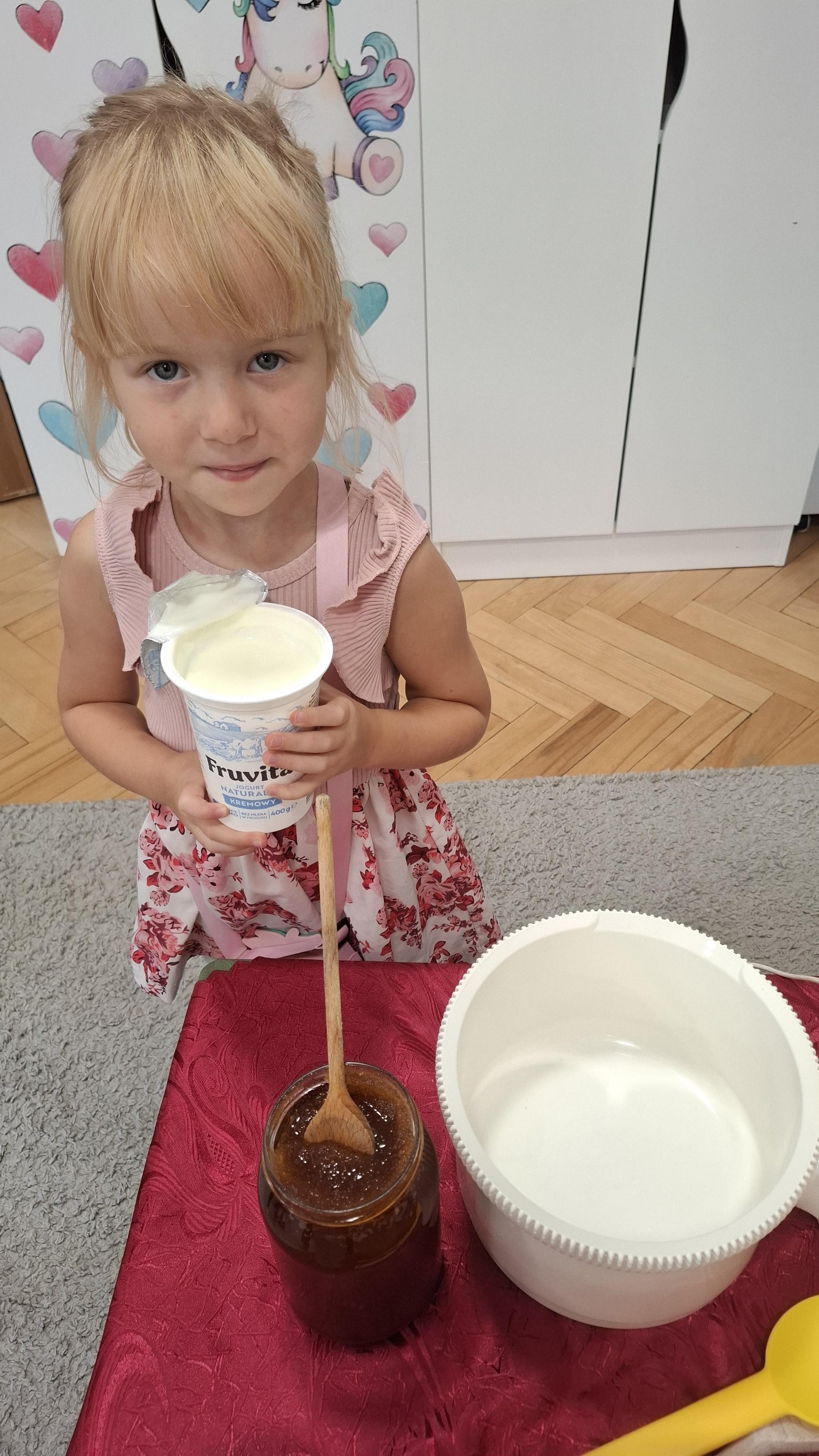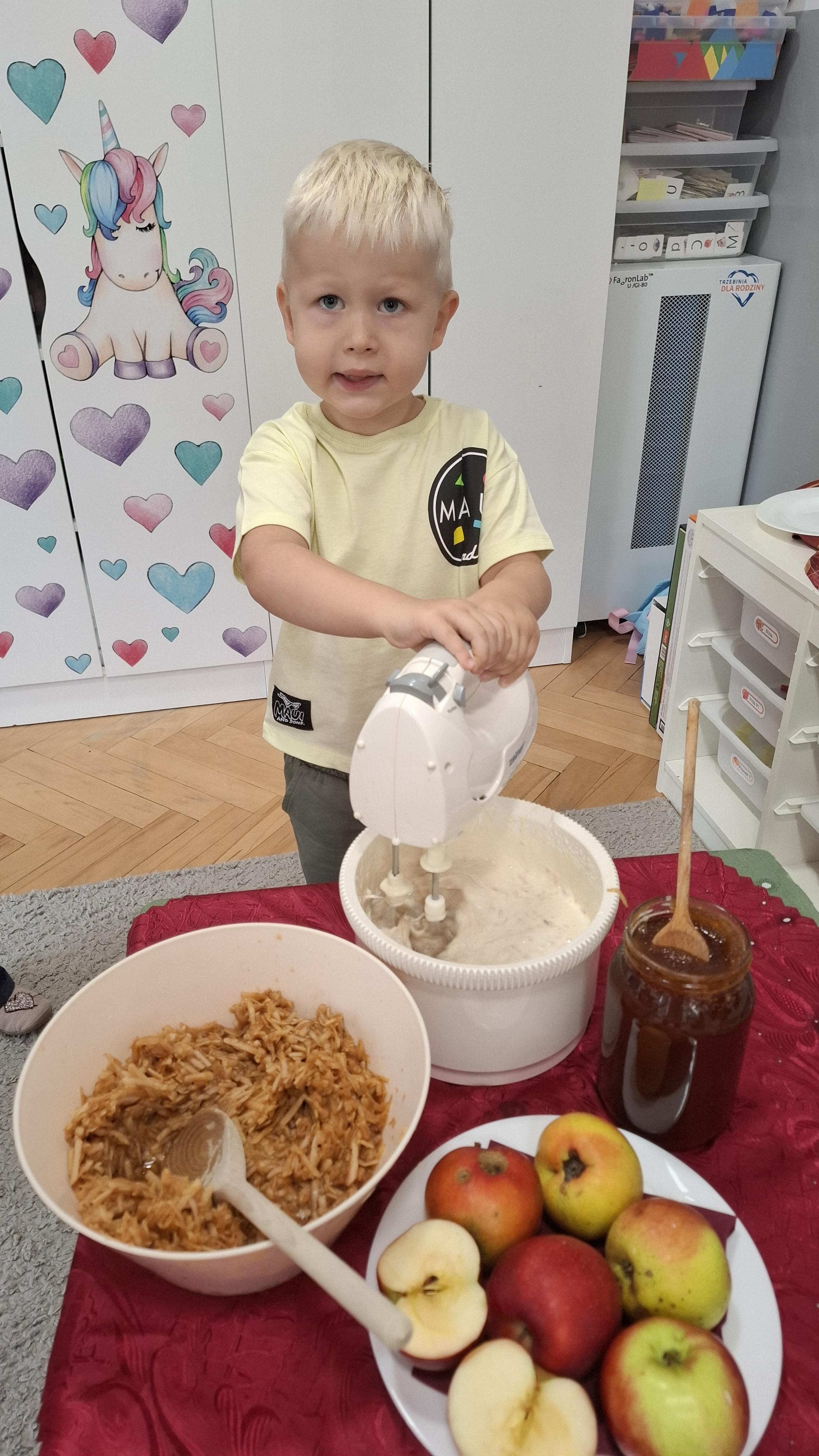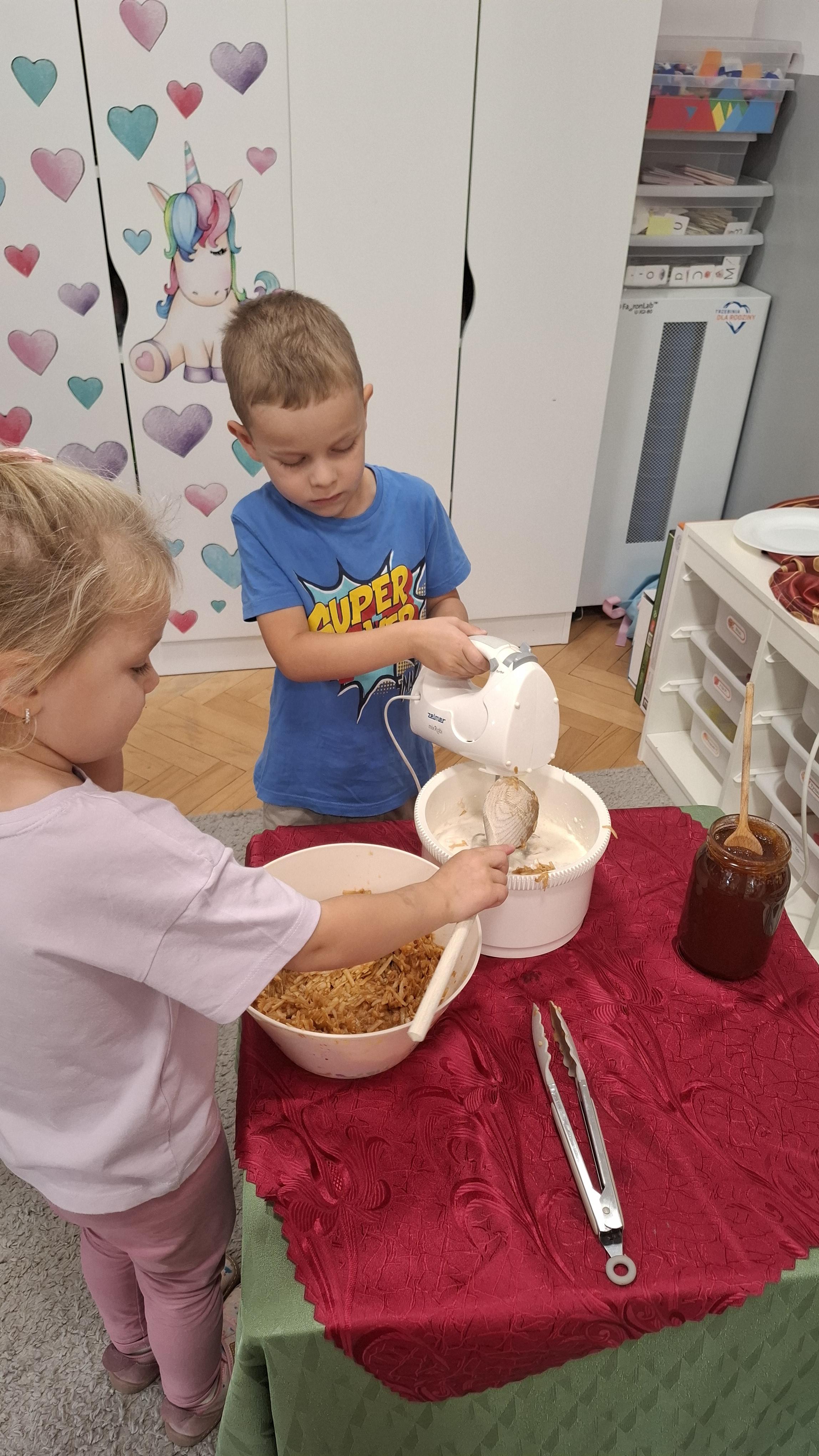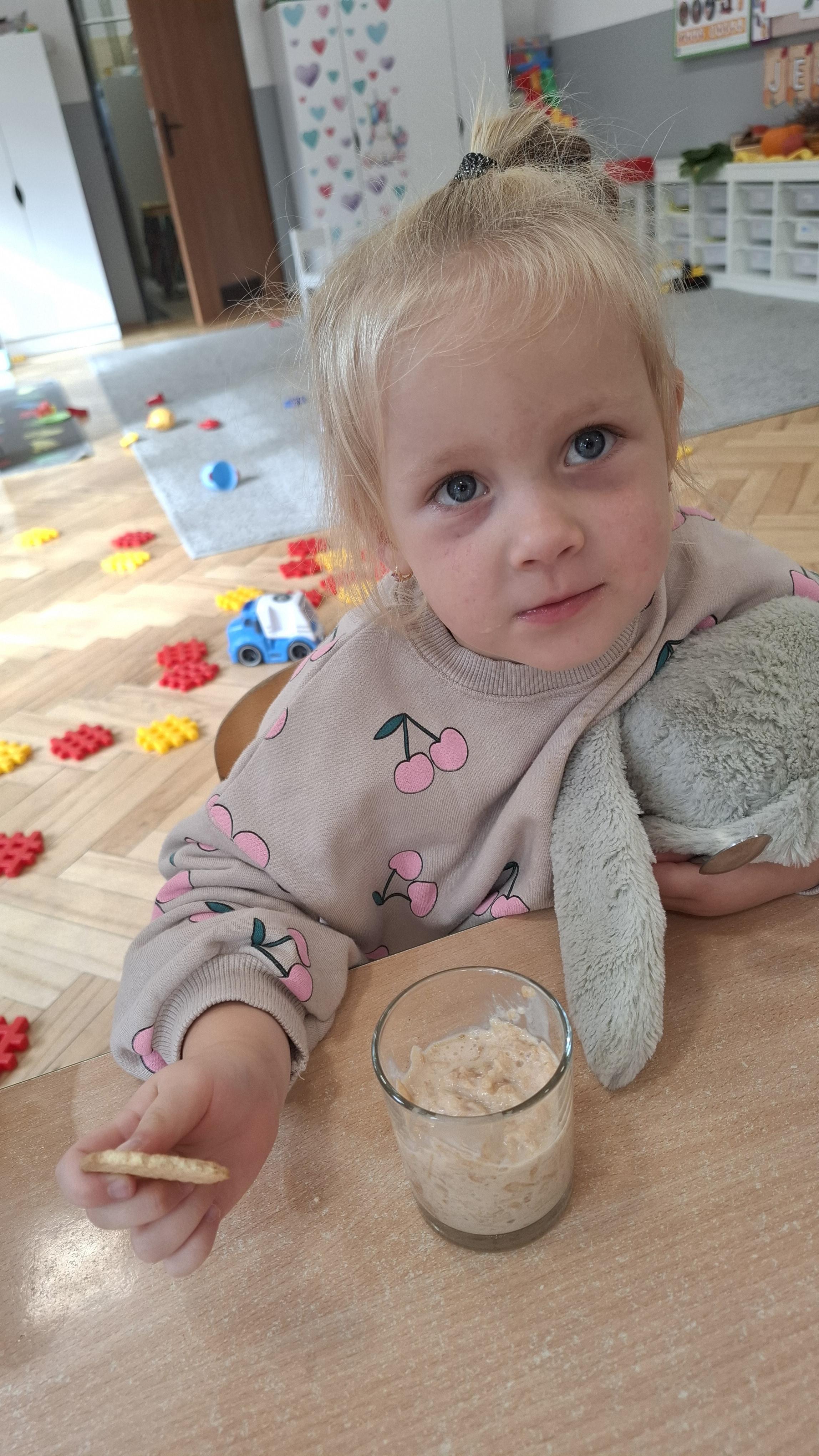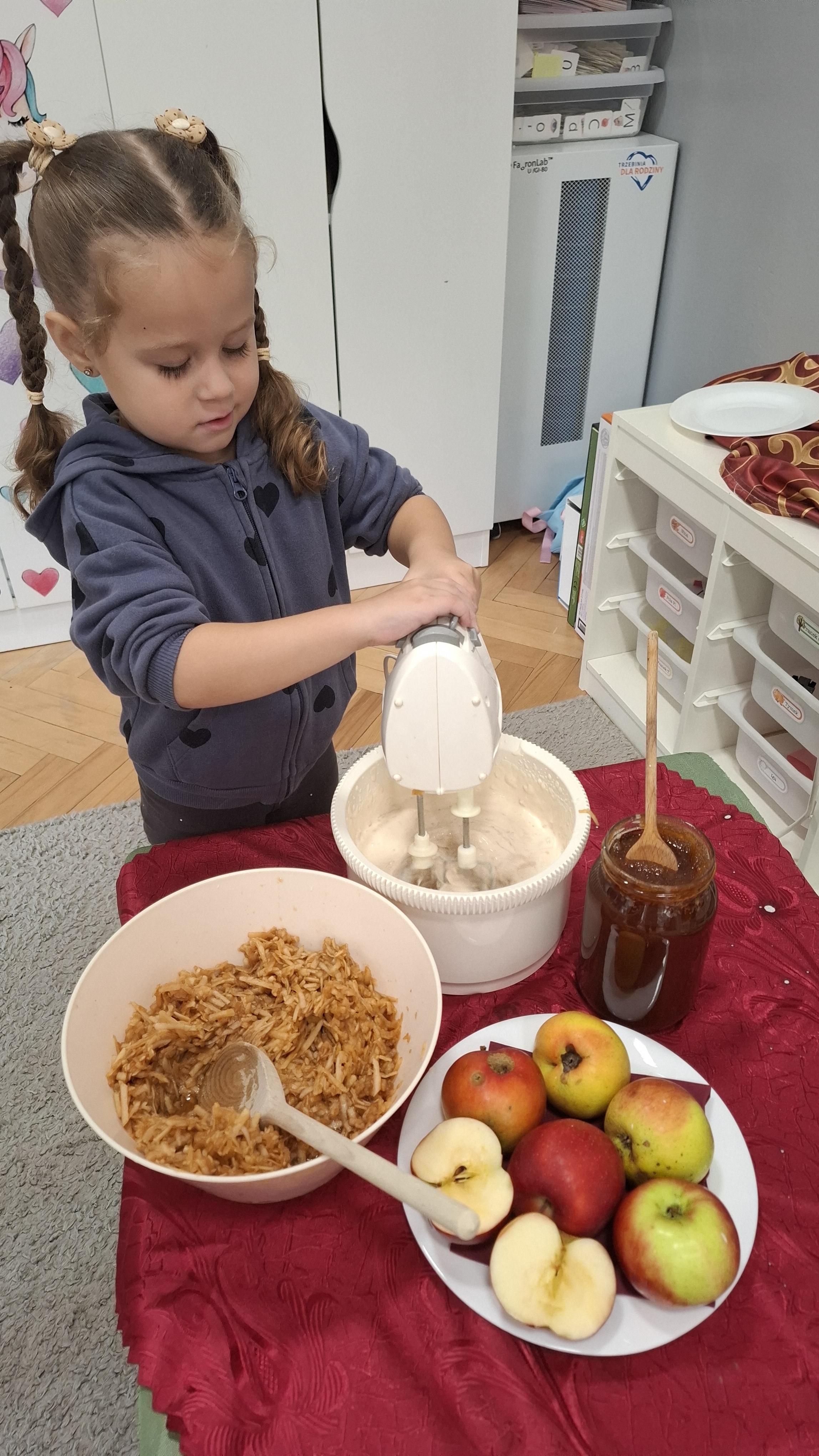 Miniony tydzień był pełen owocowych tematów – dzieci utrwalały nazwy owoców oraz uczyły się dzielić słowa na sylaby. Podczas zabaw „Co rośnie w sadzie i co z tego będzie?” oraz „Owoce i dżem” dowiedziały się, jakie smakołyki i produkty można przygotować z owoców. Poznały również piramidę i talerz żywieniowy, wskazując, gdzie znajdują się owoce i dlaczego są one tak ważne dla zdrowia. Co więcej, dzieci same przygotowały pyszny i zdrowy deser z jogurtu naturalnego, jabłka i miodu – smakował wyśmienicie i dał im wiele radości!