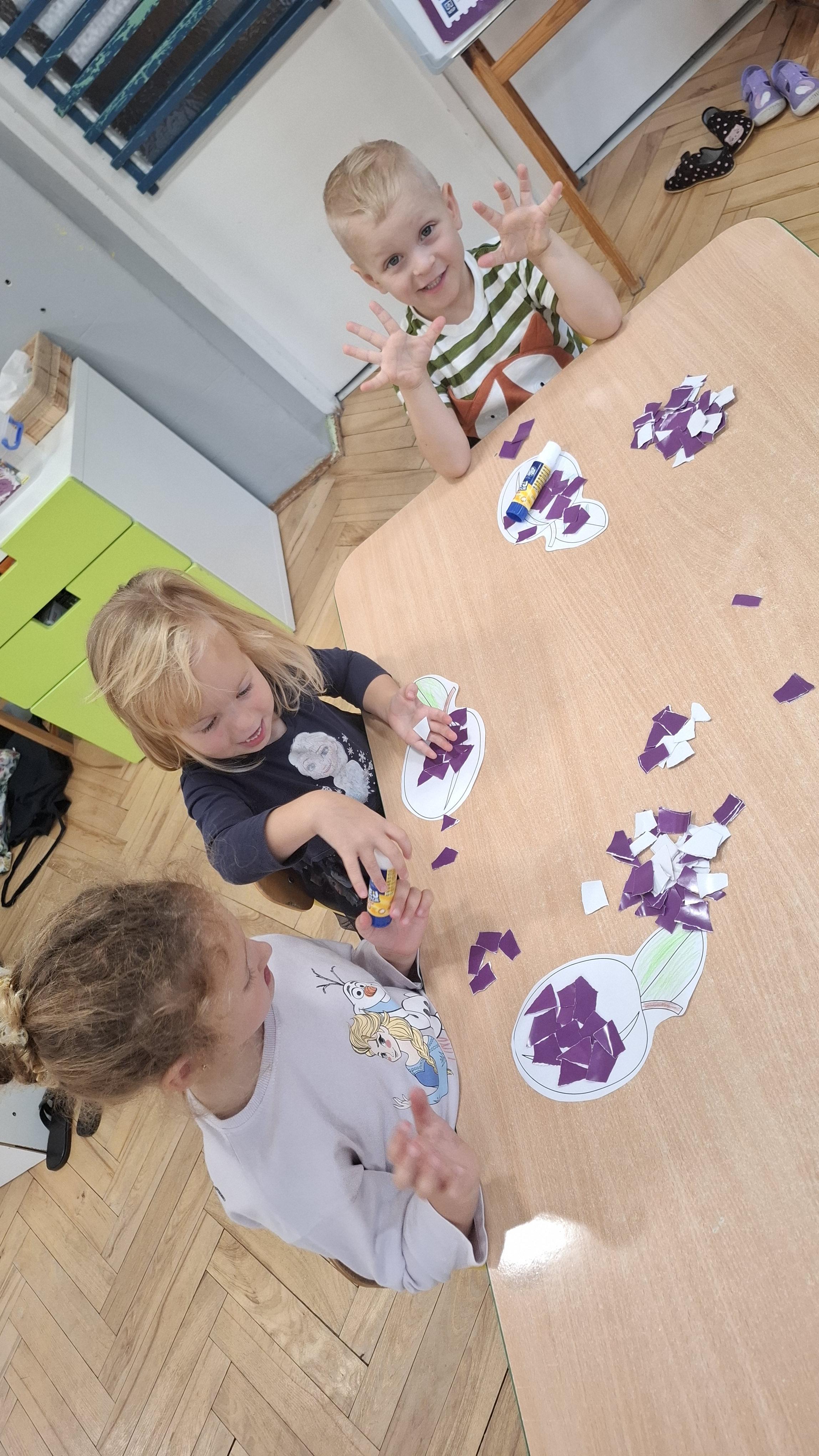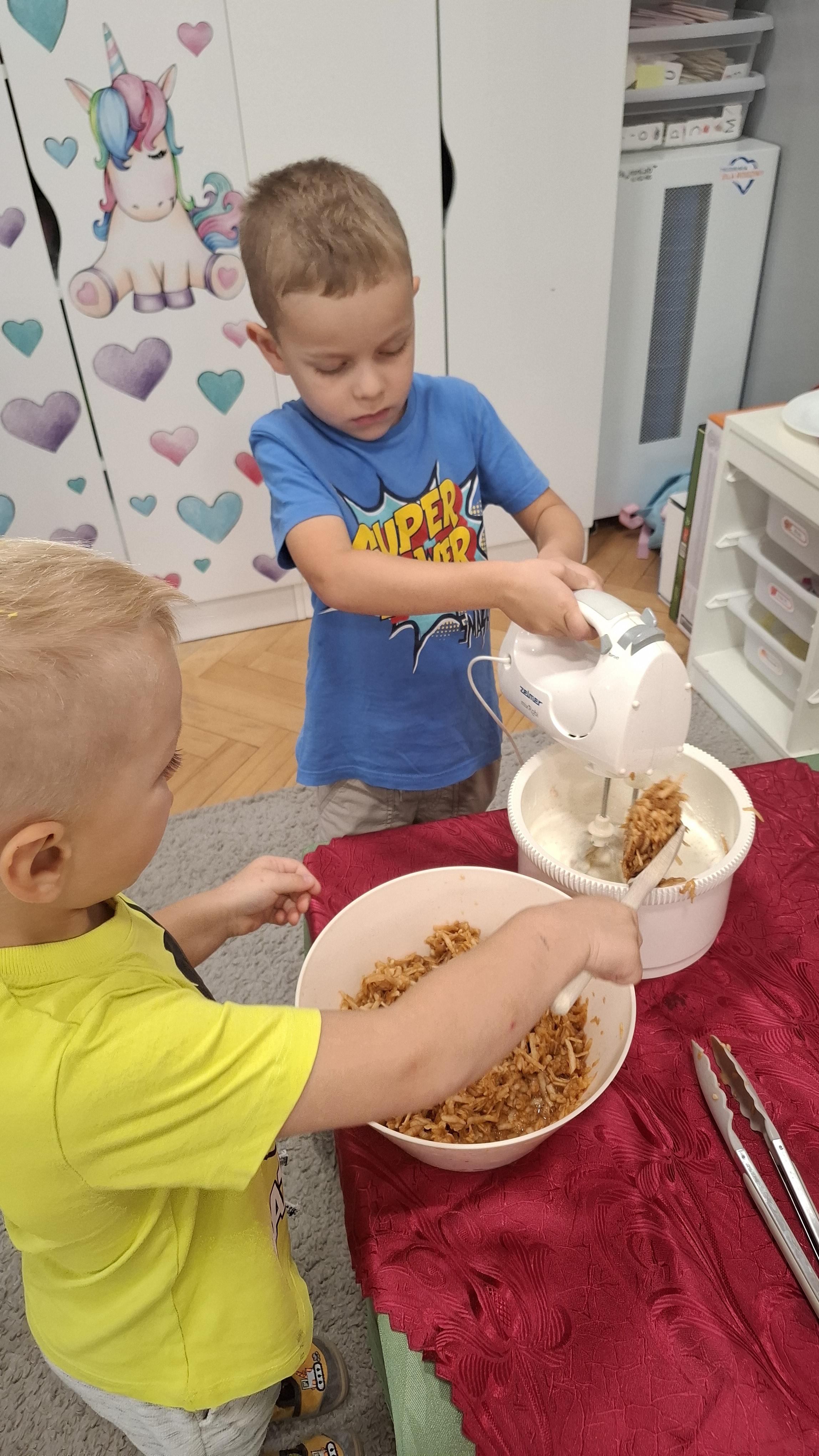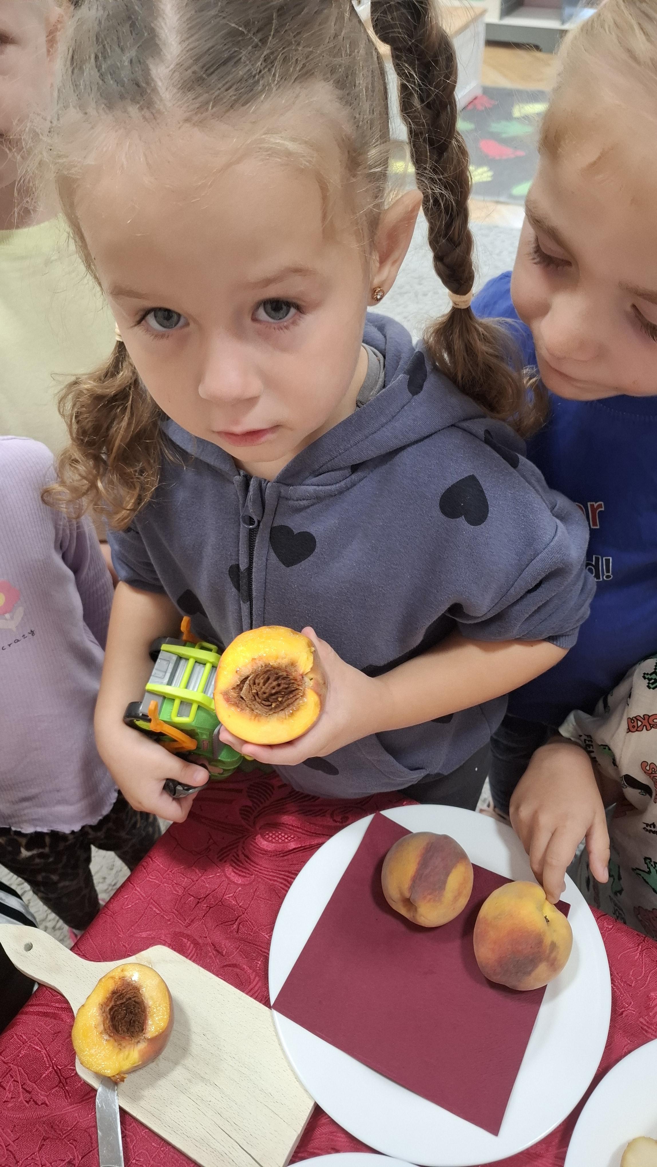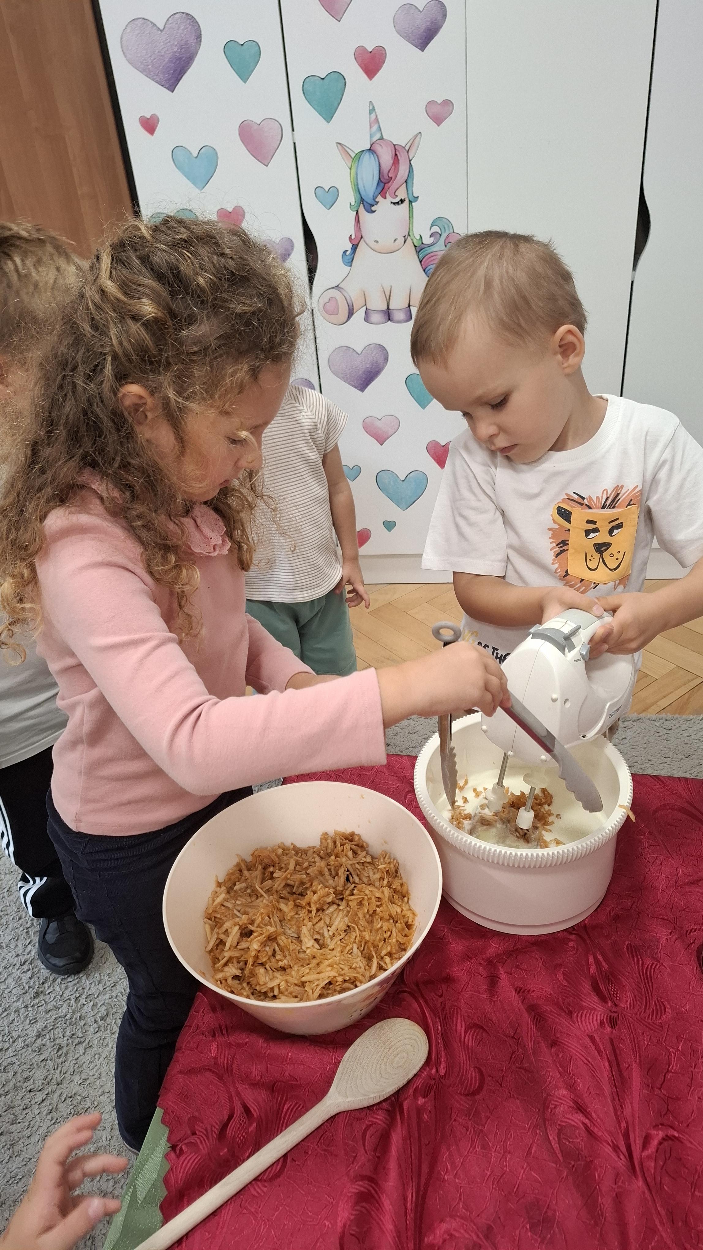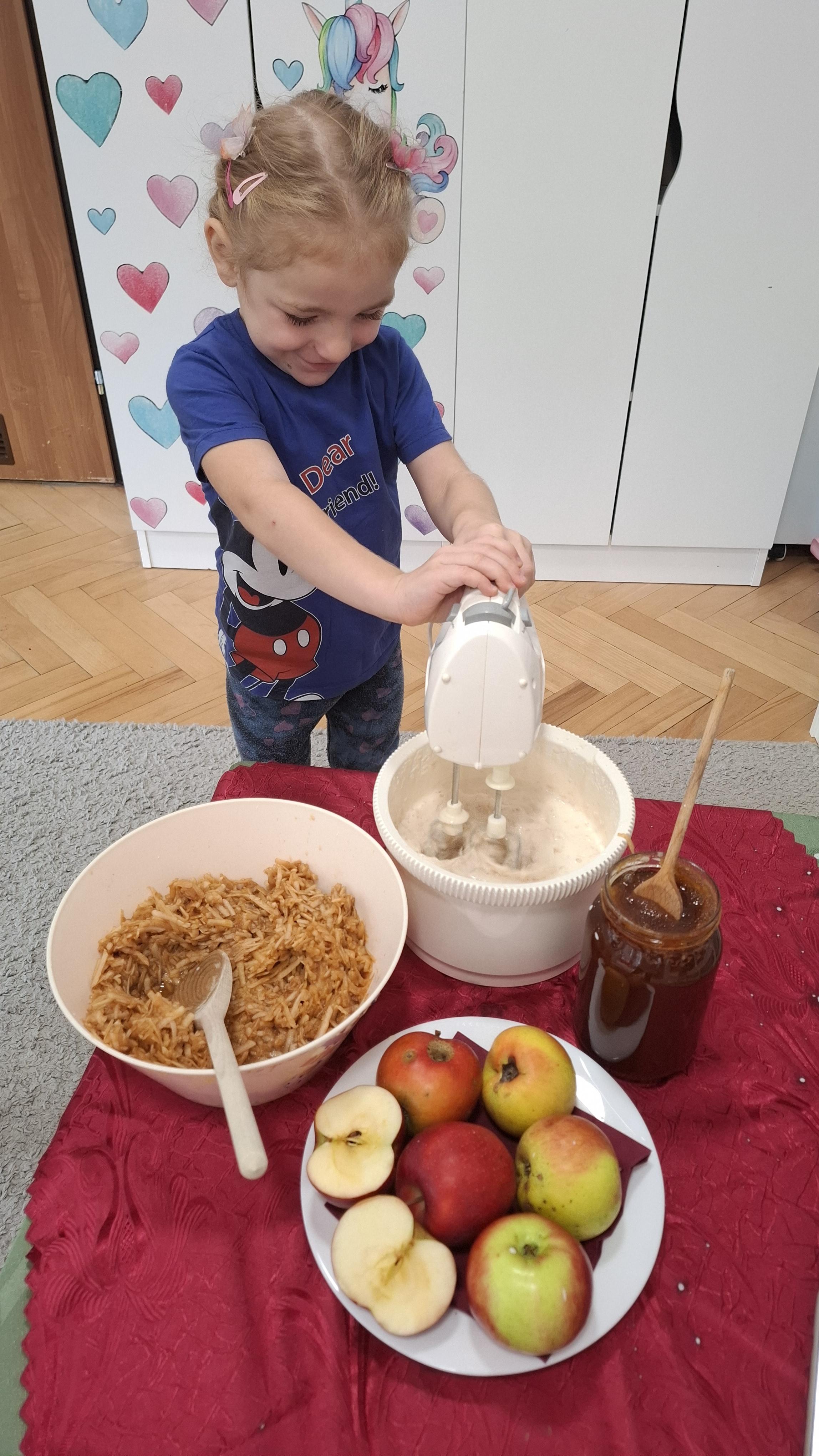 Miniony tydzień był pełen owocowych tematów – dzieci utrwalały nazwy owoców oraz uczyły się dzielić słowa na sylaby. Podczas zabaw „Co rośnie w sadzie i co z tego będzie?” oraz „Owoce i dżem” dowiedziały się, jakie smakołyki i produkty można przygotować z owoców. Poznały również piramidę i talerz żywieniowy, wskazując, gdzie znajdują się owoce i dlaczego są one tak ważne dla zdrowia. Co więcej, dzieci same przygotowały pyszny i zdrowy deser z jogurtu naturalnego, jabłka i miodu – smakował wyśmienicie i dał im wiele radości!